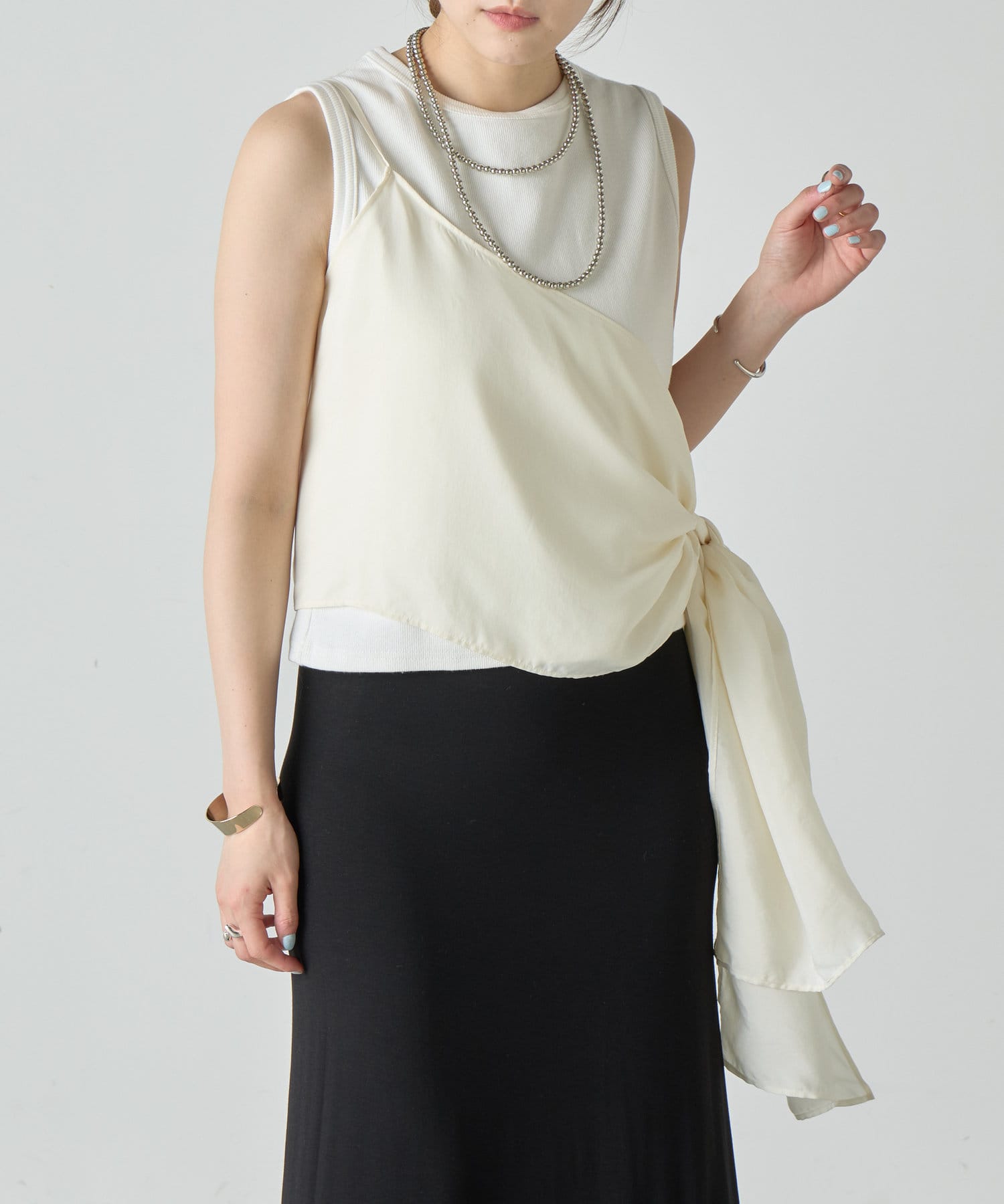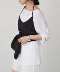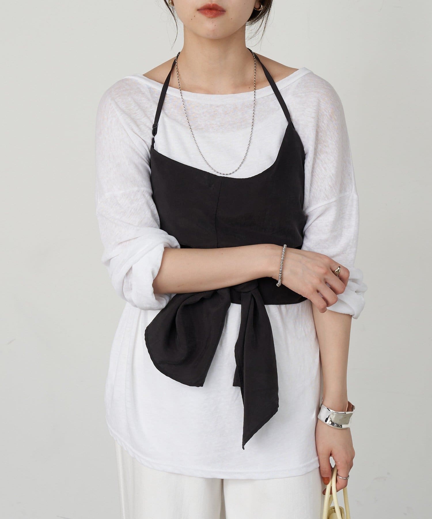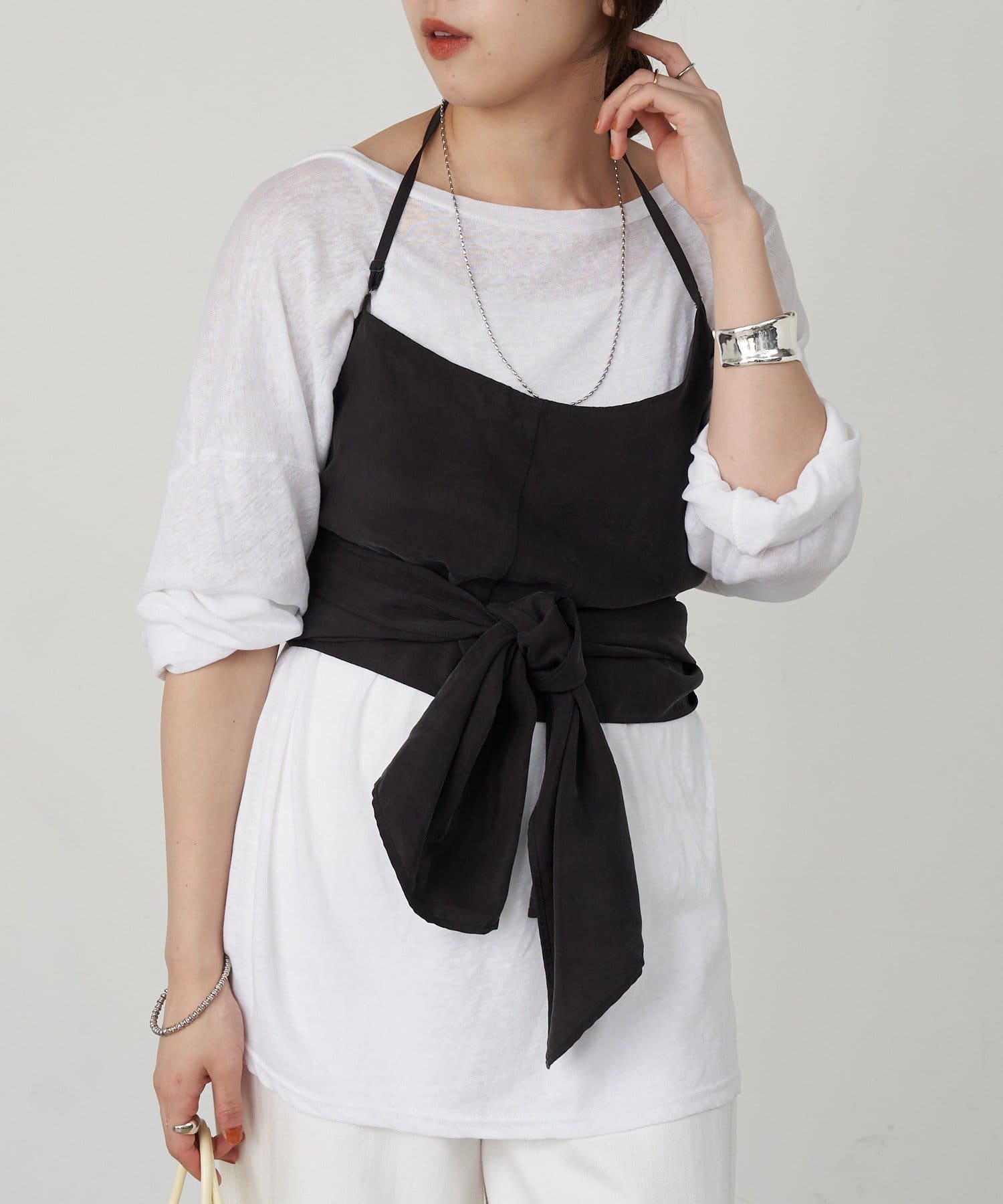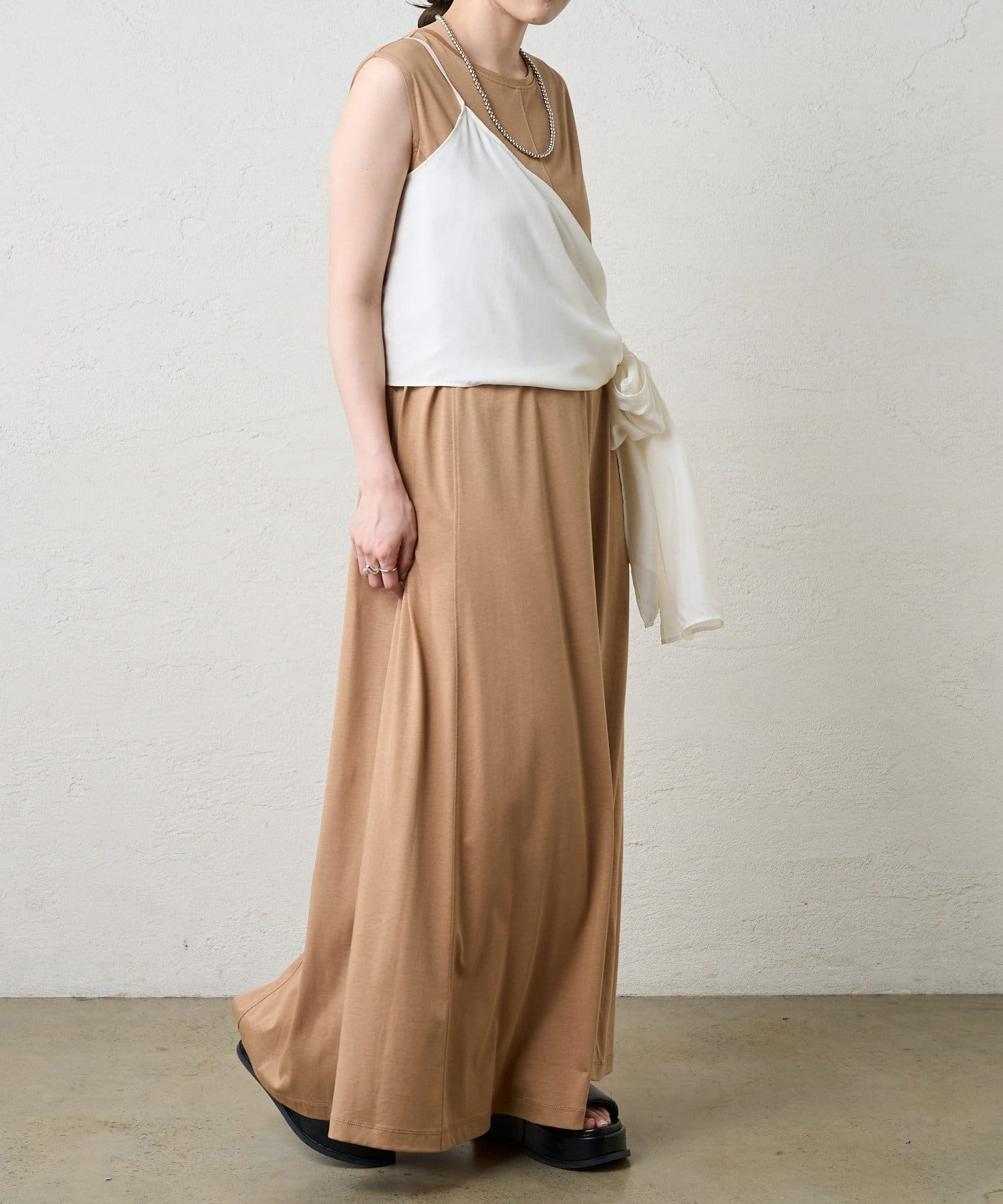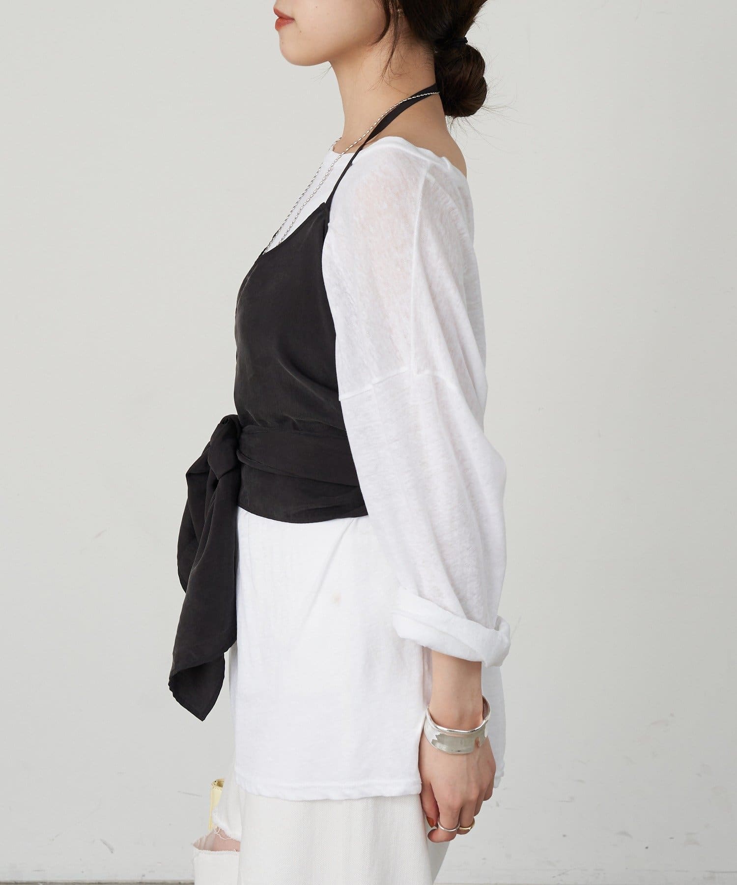 右肩だけストラップをかけて、自然なシワを寄せて後ろで結んだり、サイドで結んだり、ストールタイプのキャミソールです。