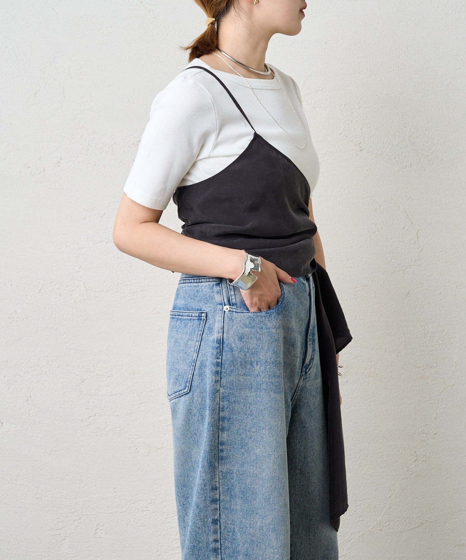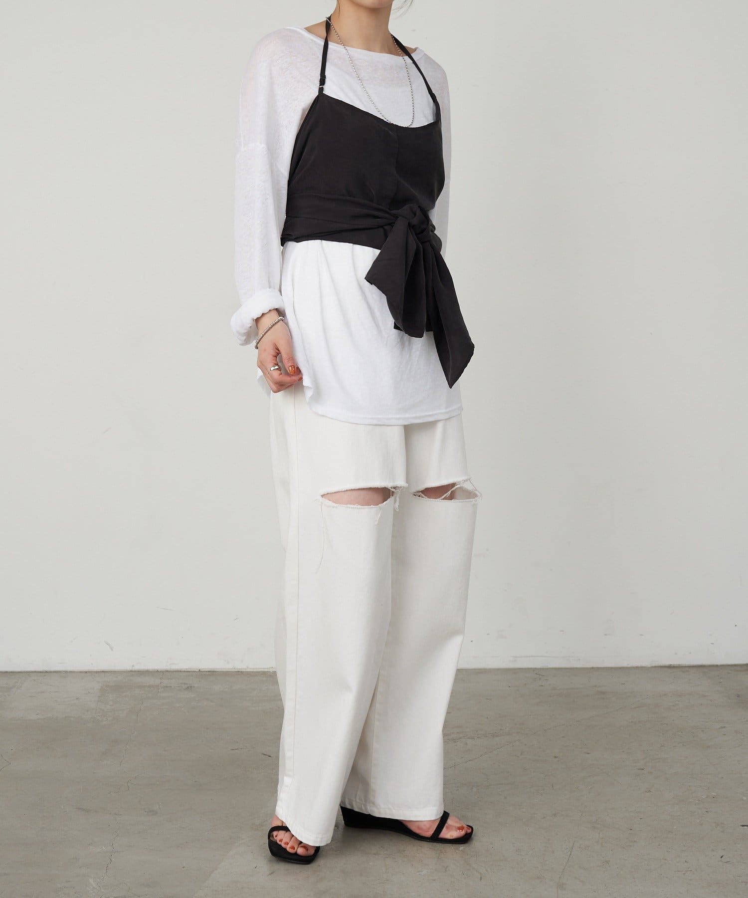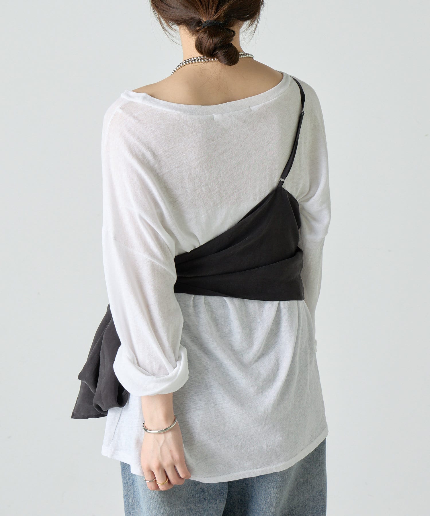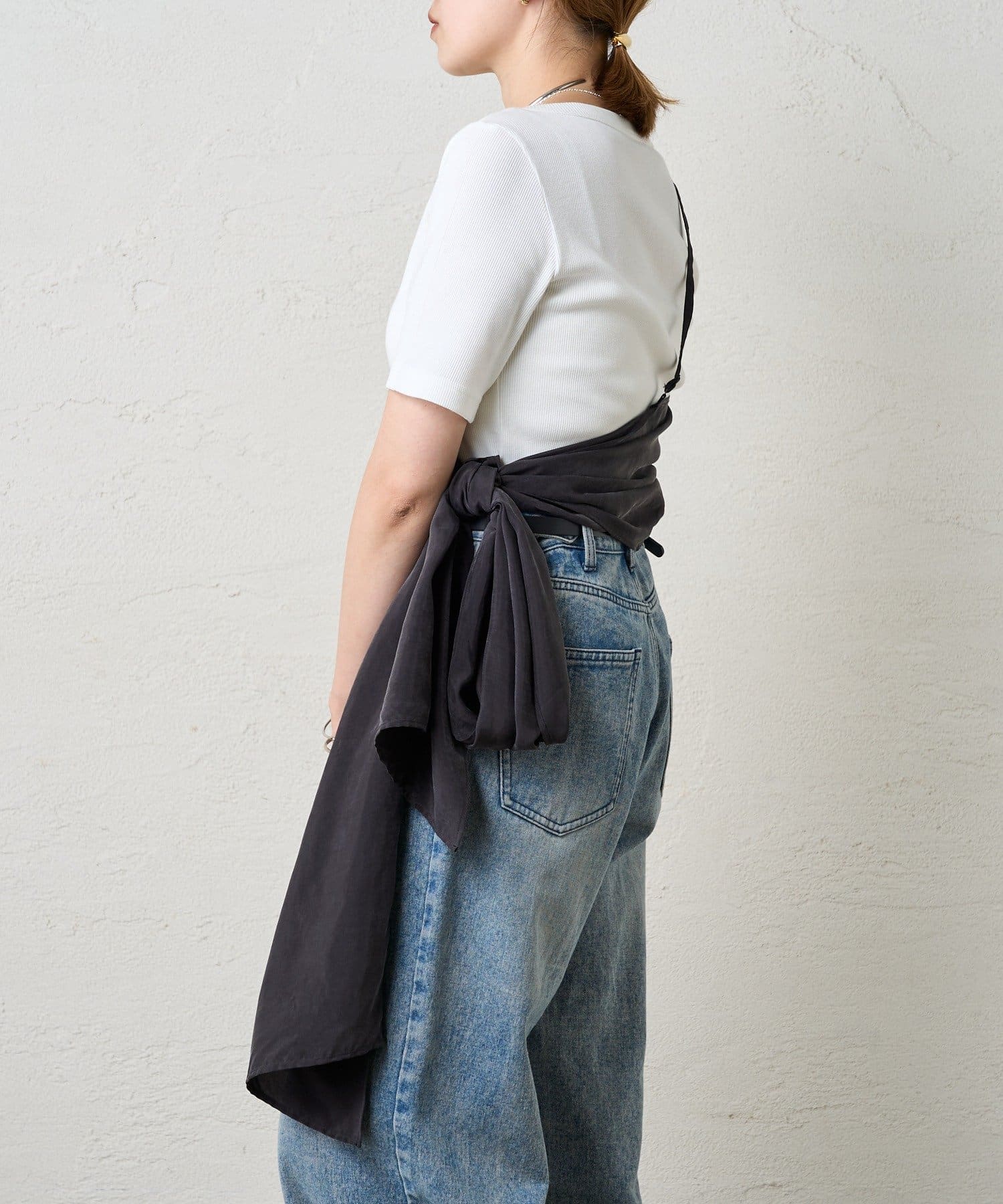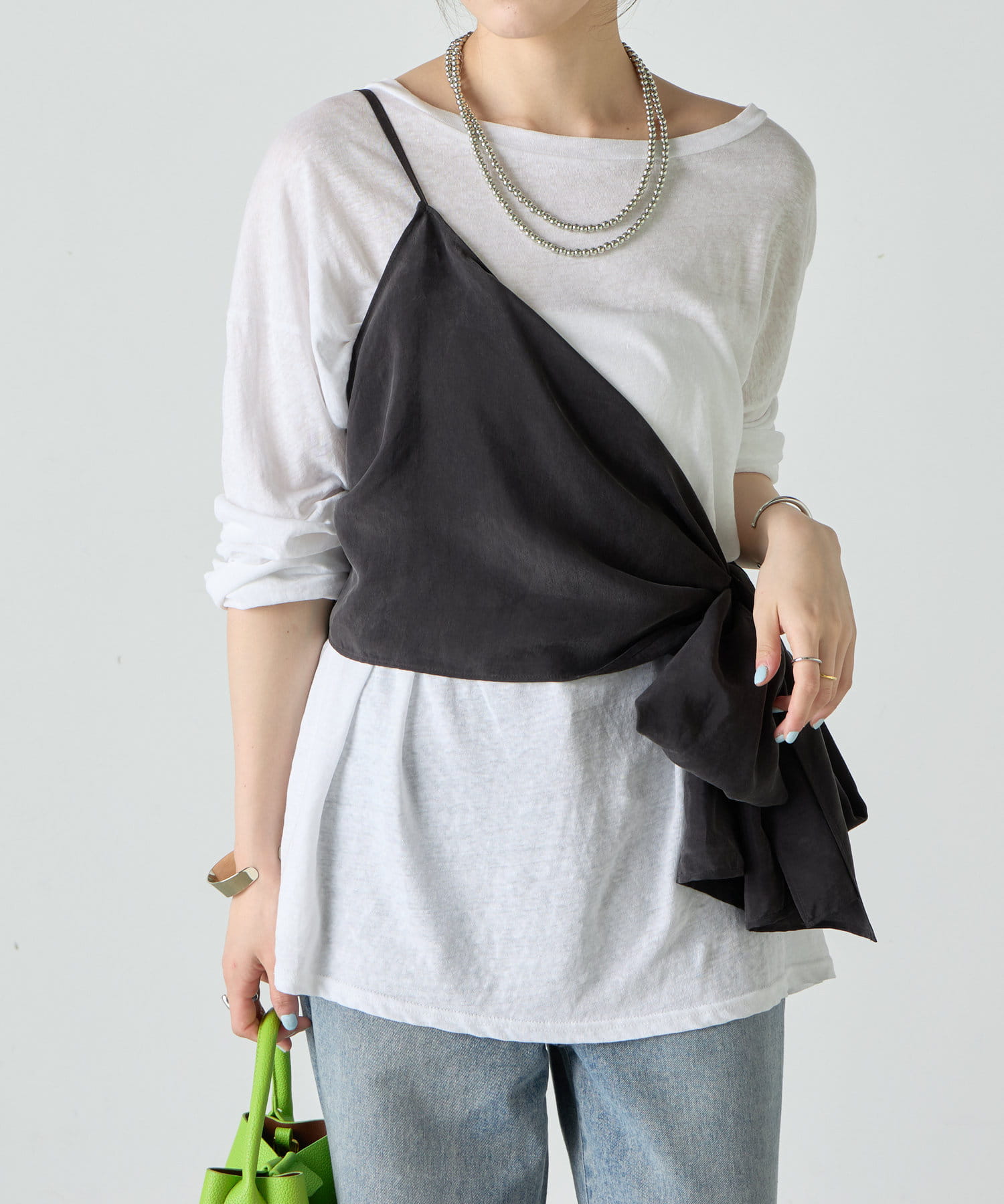右肩だけストラップをかけて、自然なシワを寄せて後ろで結んだり、サイドで結んだり、ストールタイプのキャミソールです。
