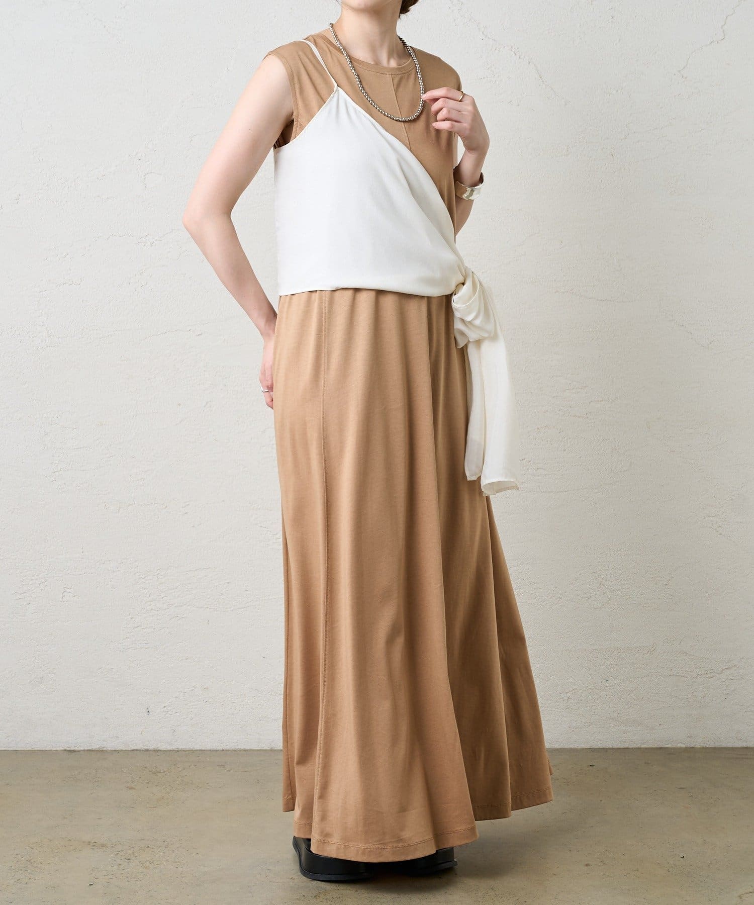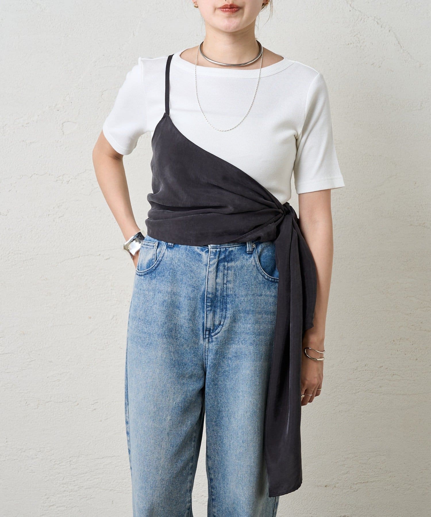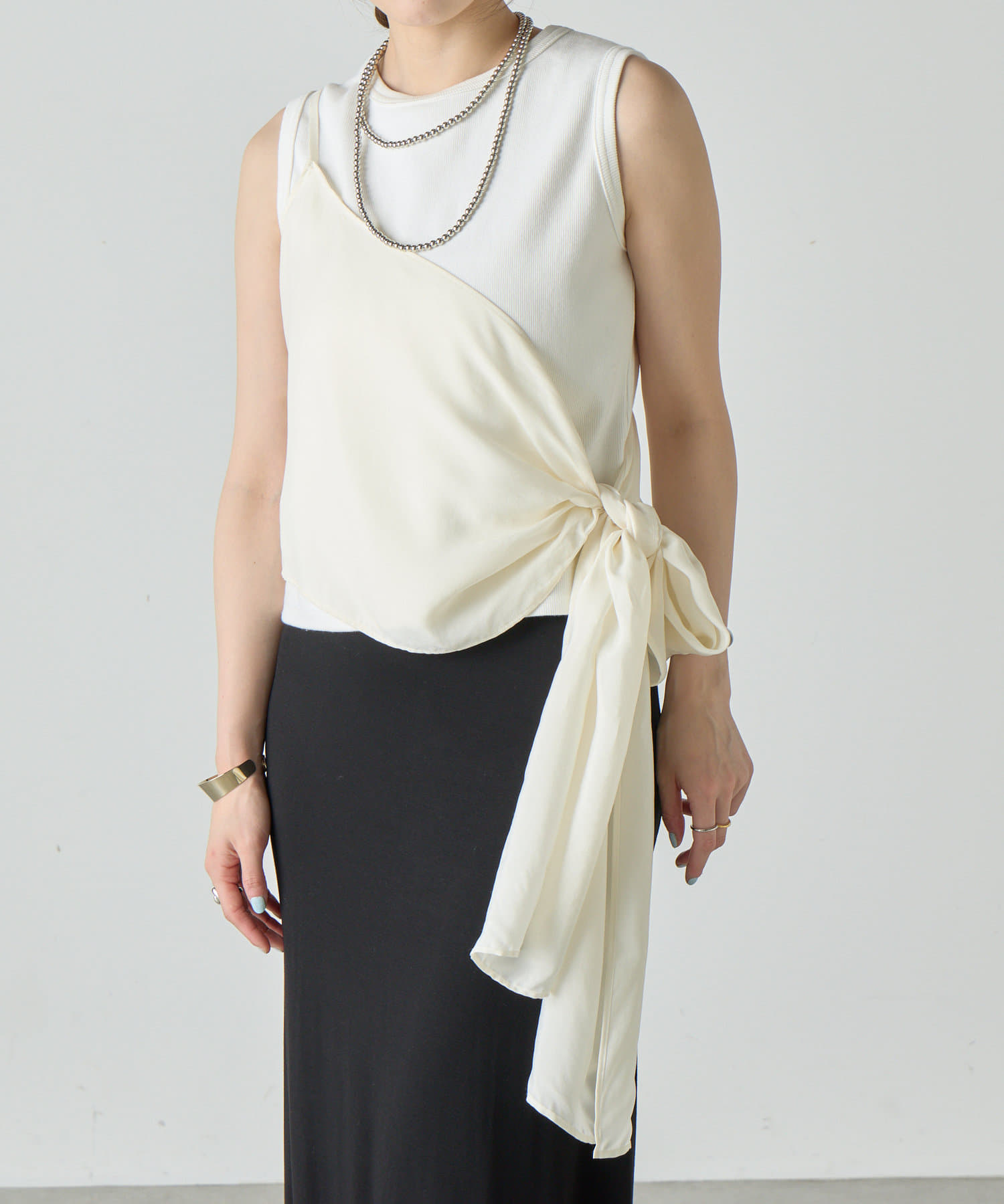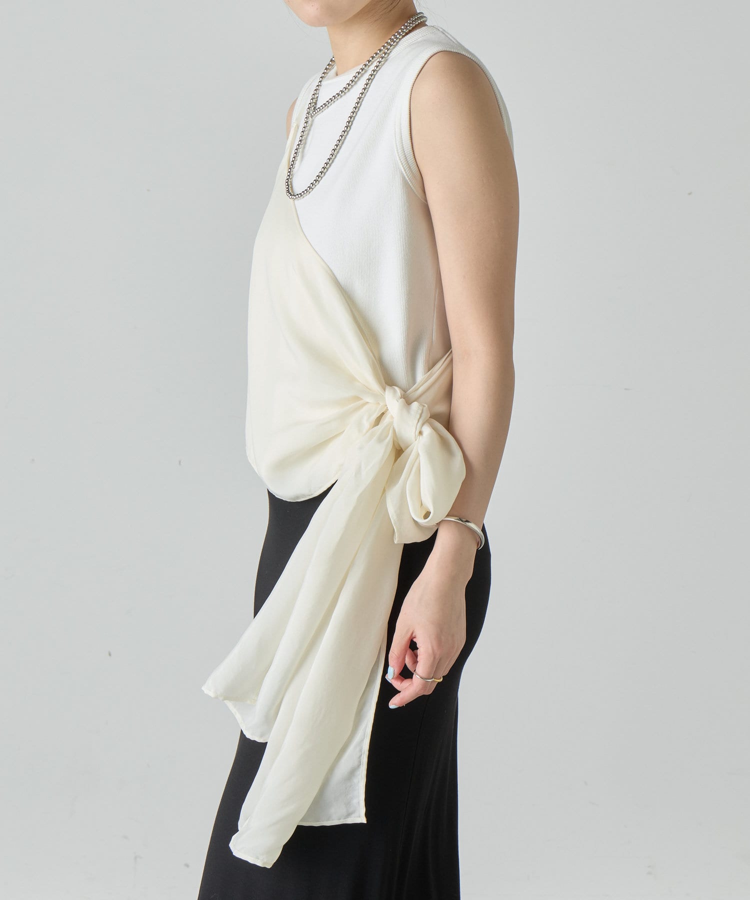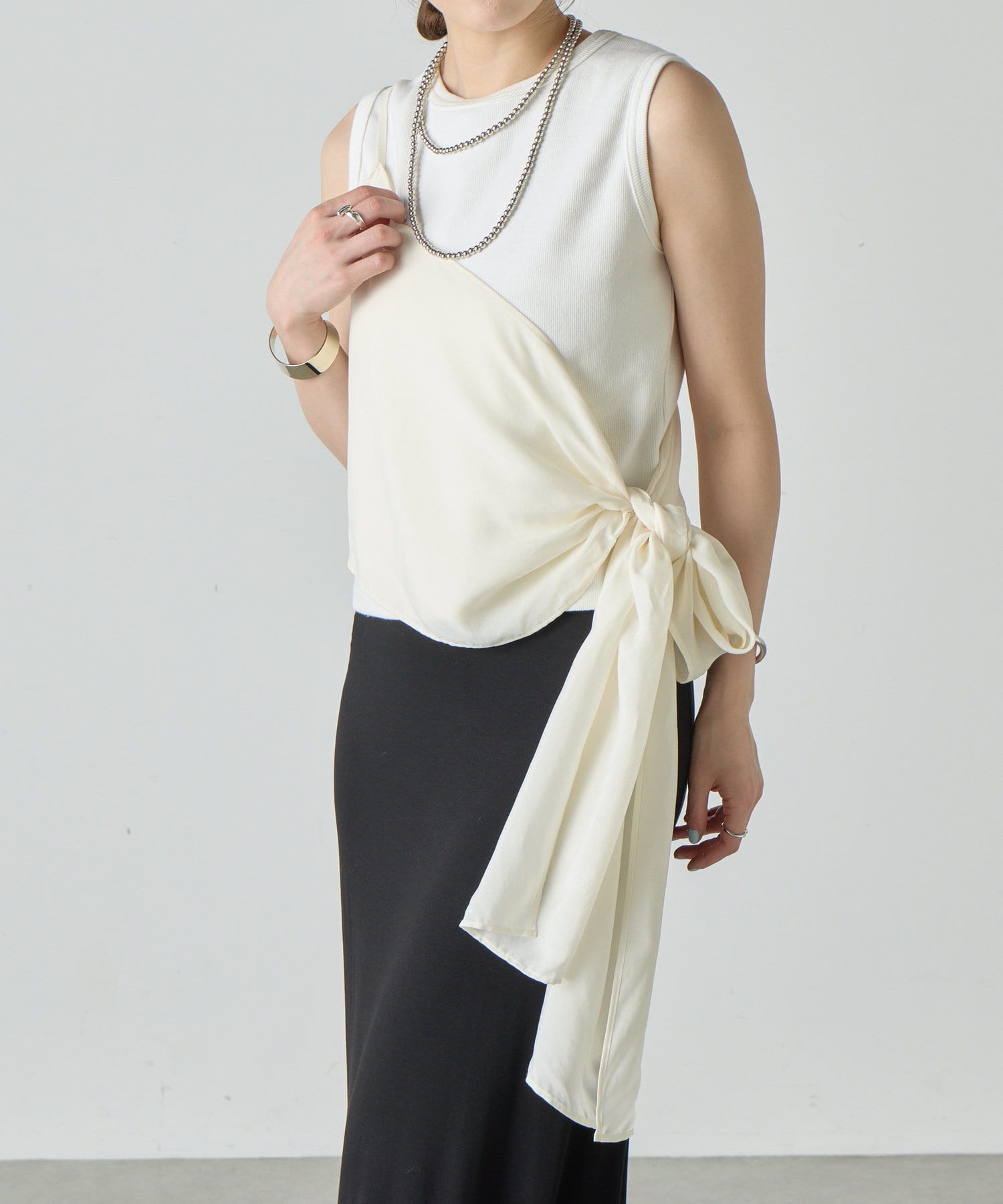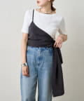 右肩だけストラップをかけて、自然なシワを寄せて後ろで結んだり、サイドで結んだり、ストールタイプのキャミソールです。