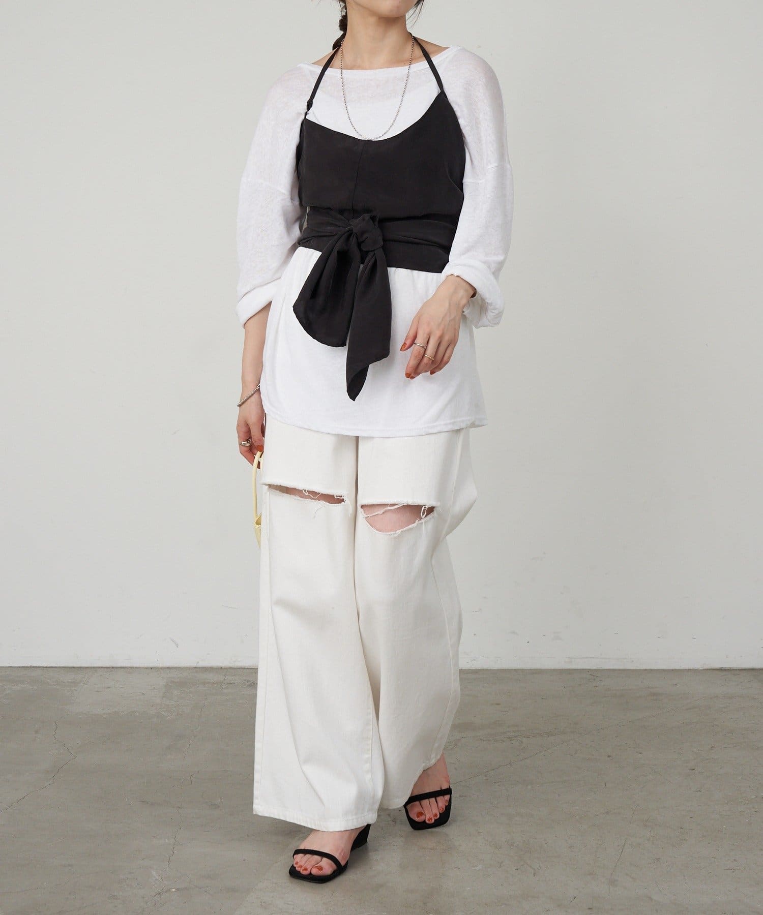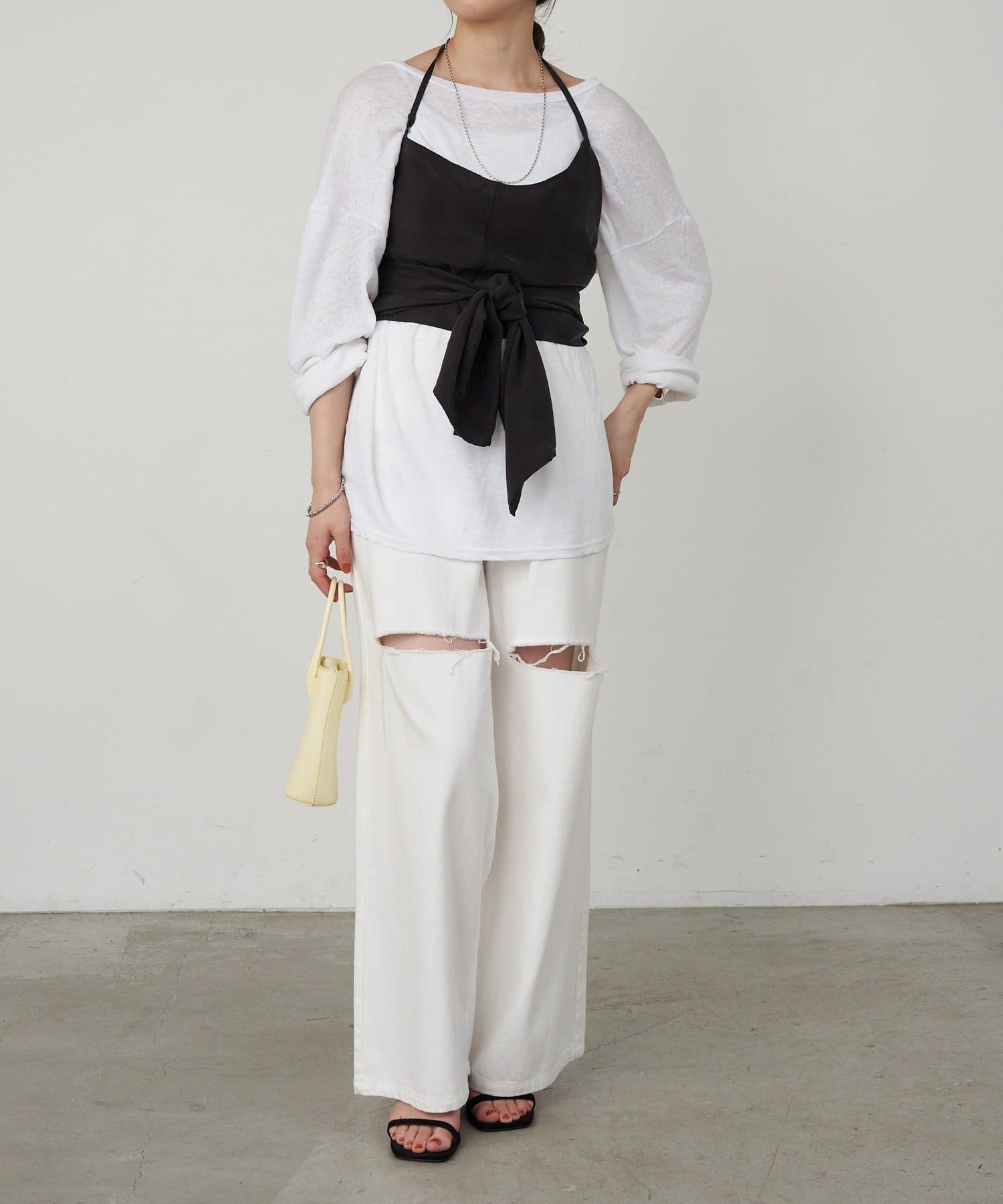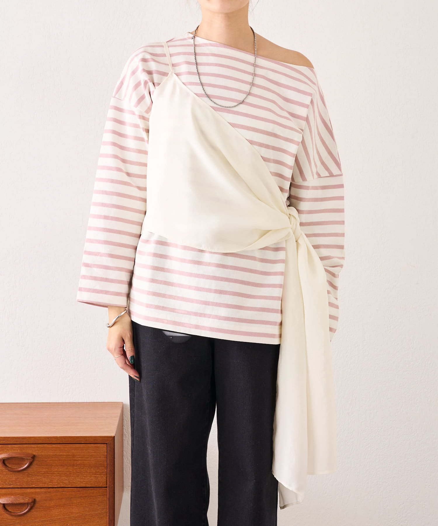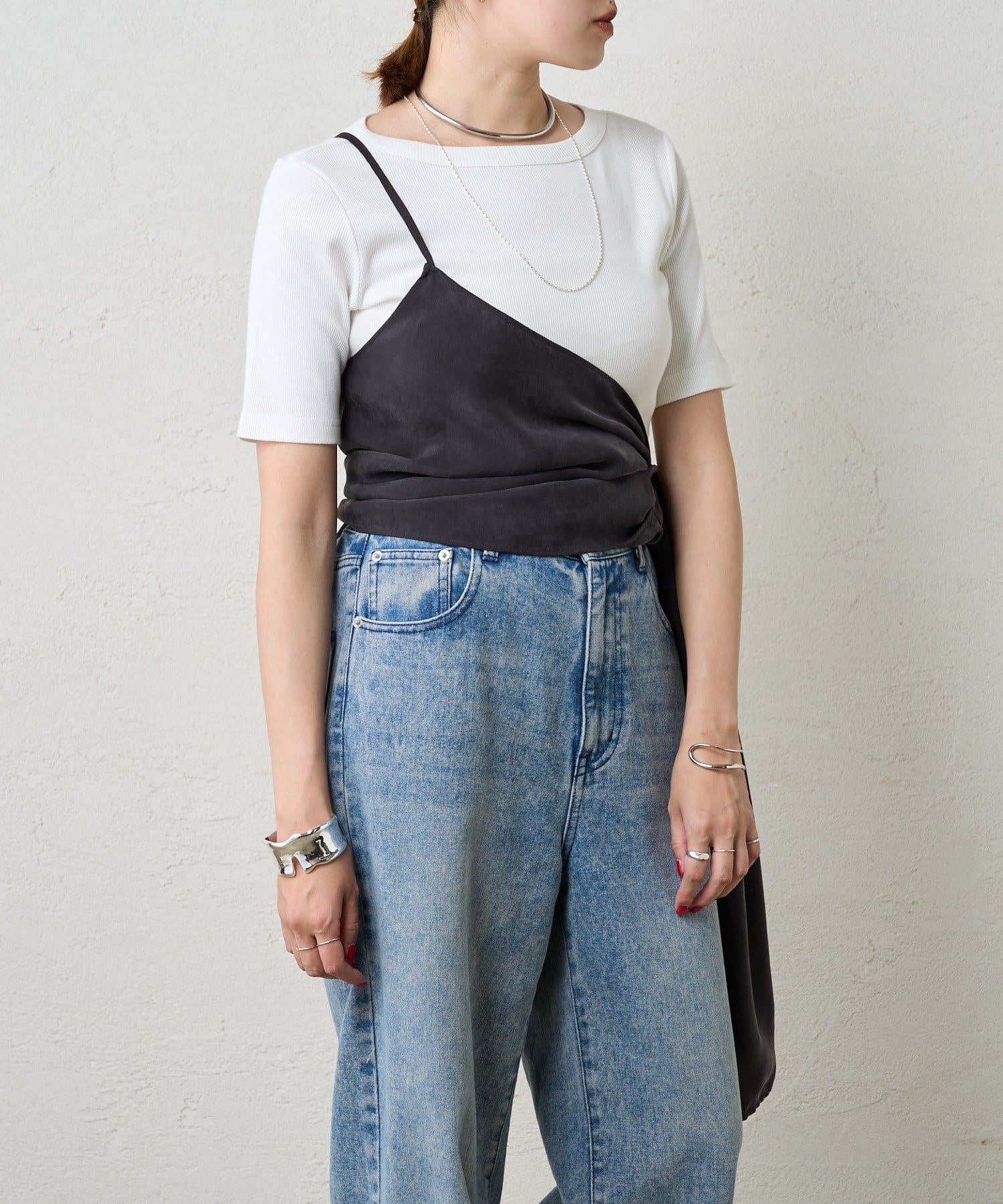 右肩だけストラップをかけて、自然なシワを寄せて後ろで結んだり、サイドで結んだり、ストールタイプのキャミソールです。