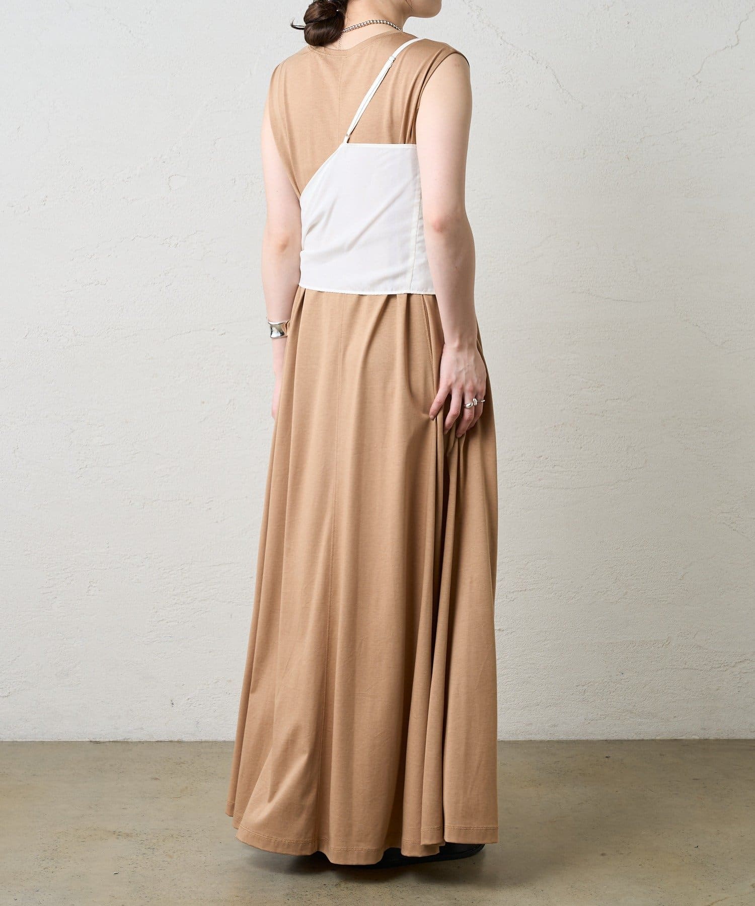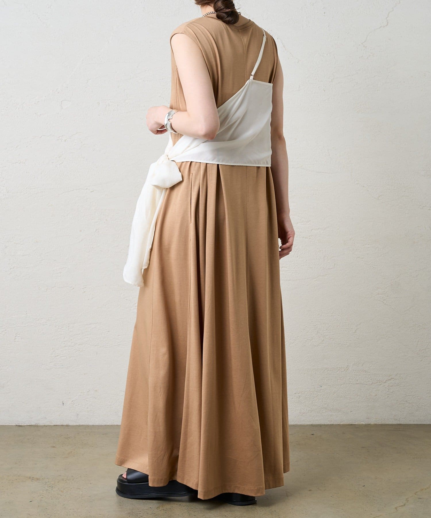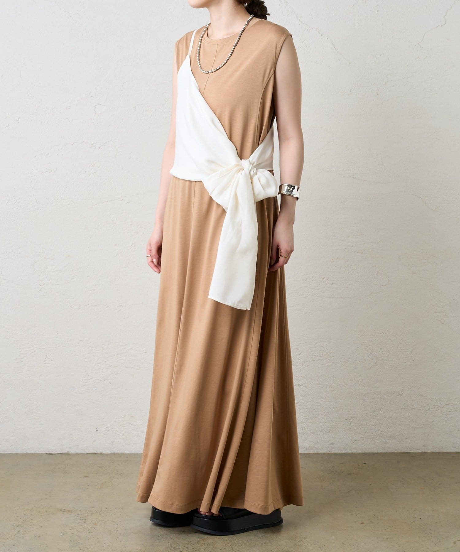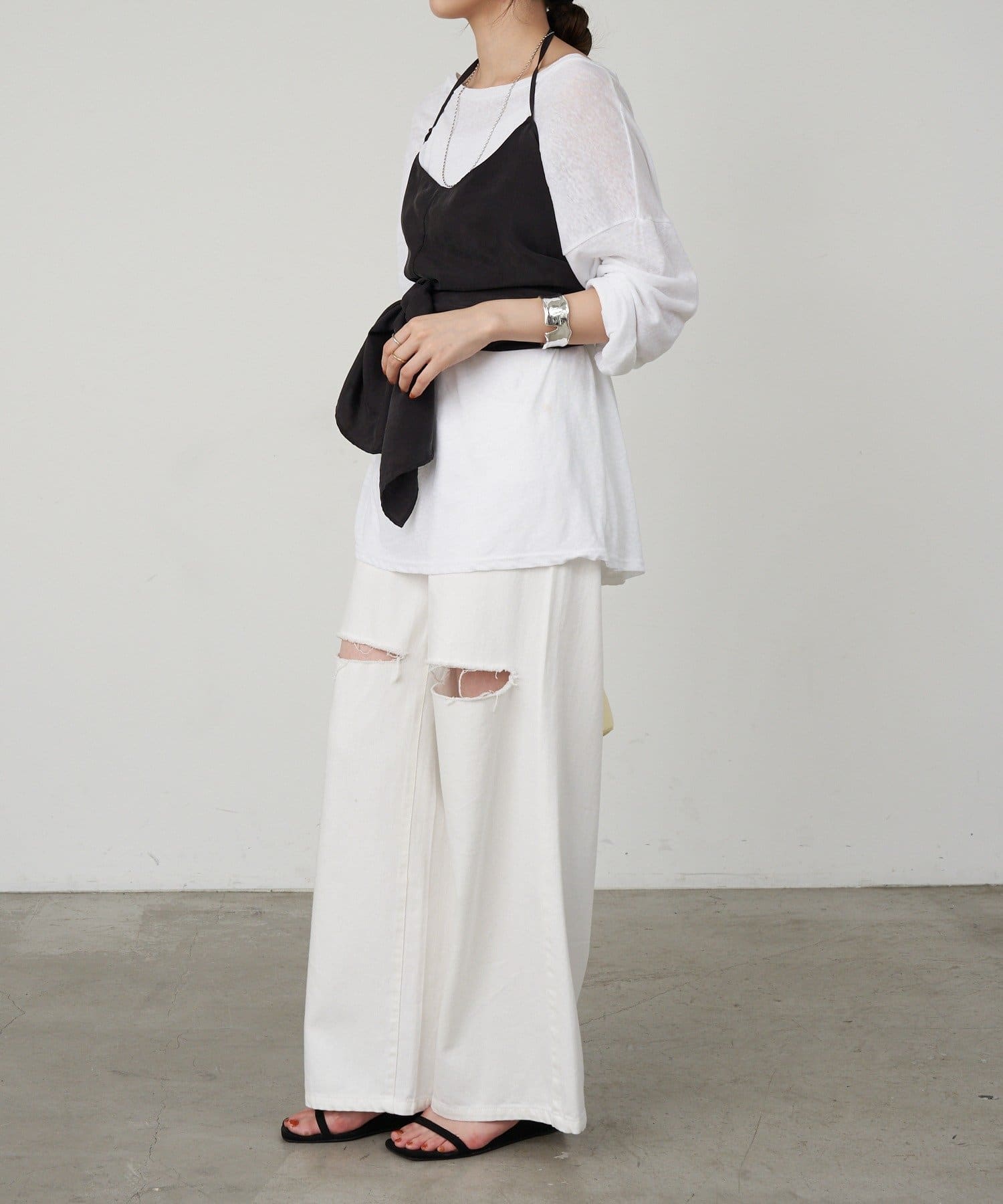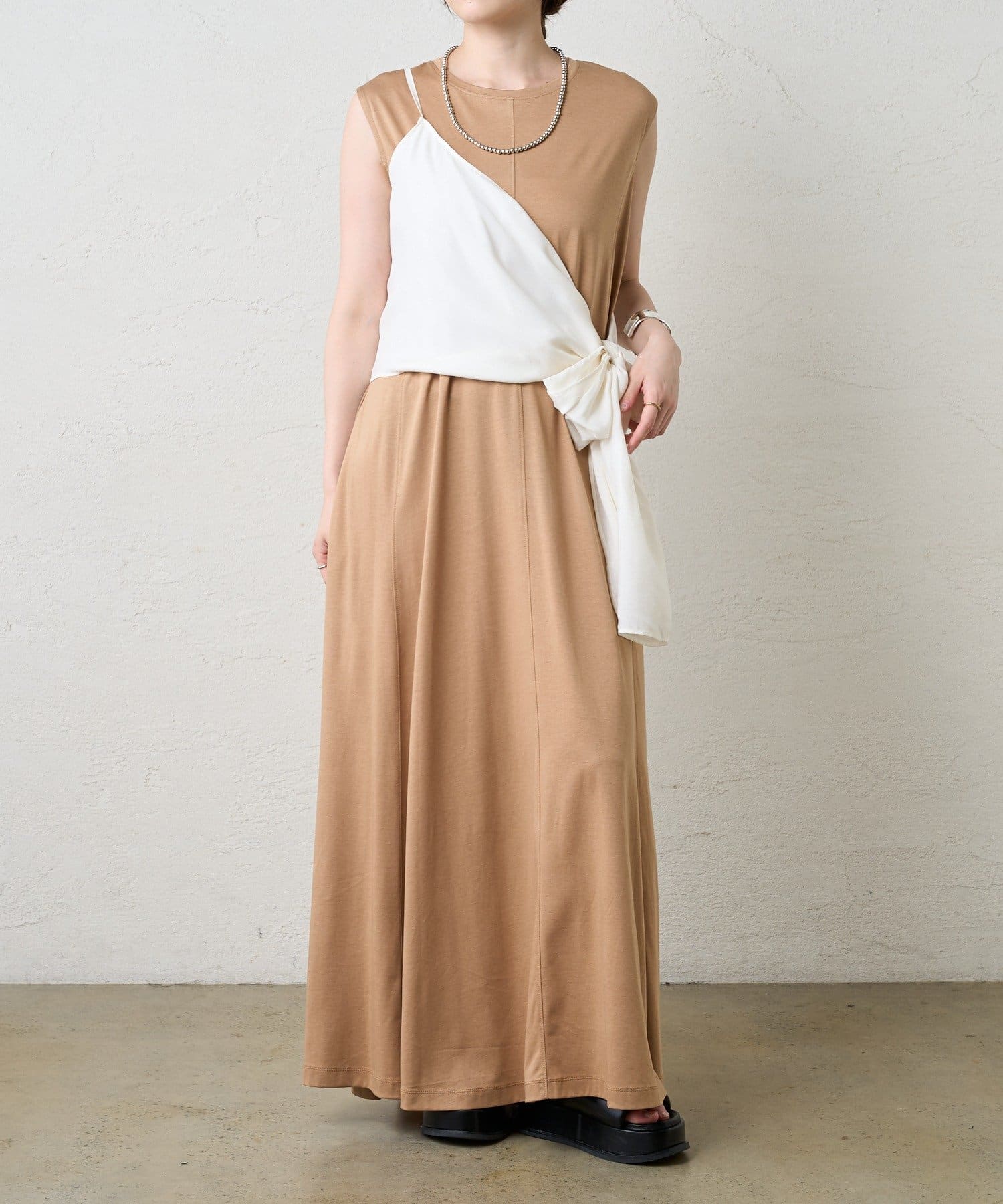 右肩だけストラップをかけて、自然なシワを寄せて後ろで結んだり、サイドで結んだり、ストールタイプのキャミソールです。