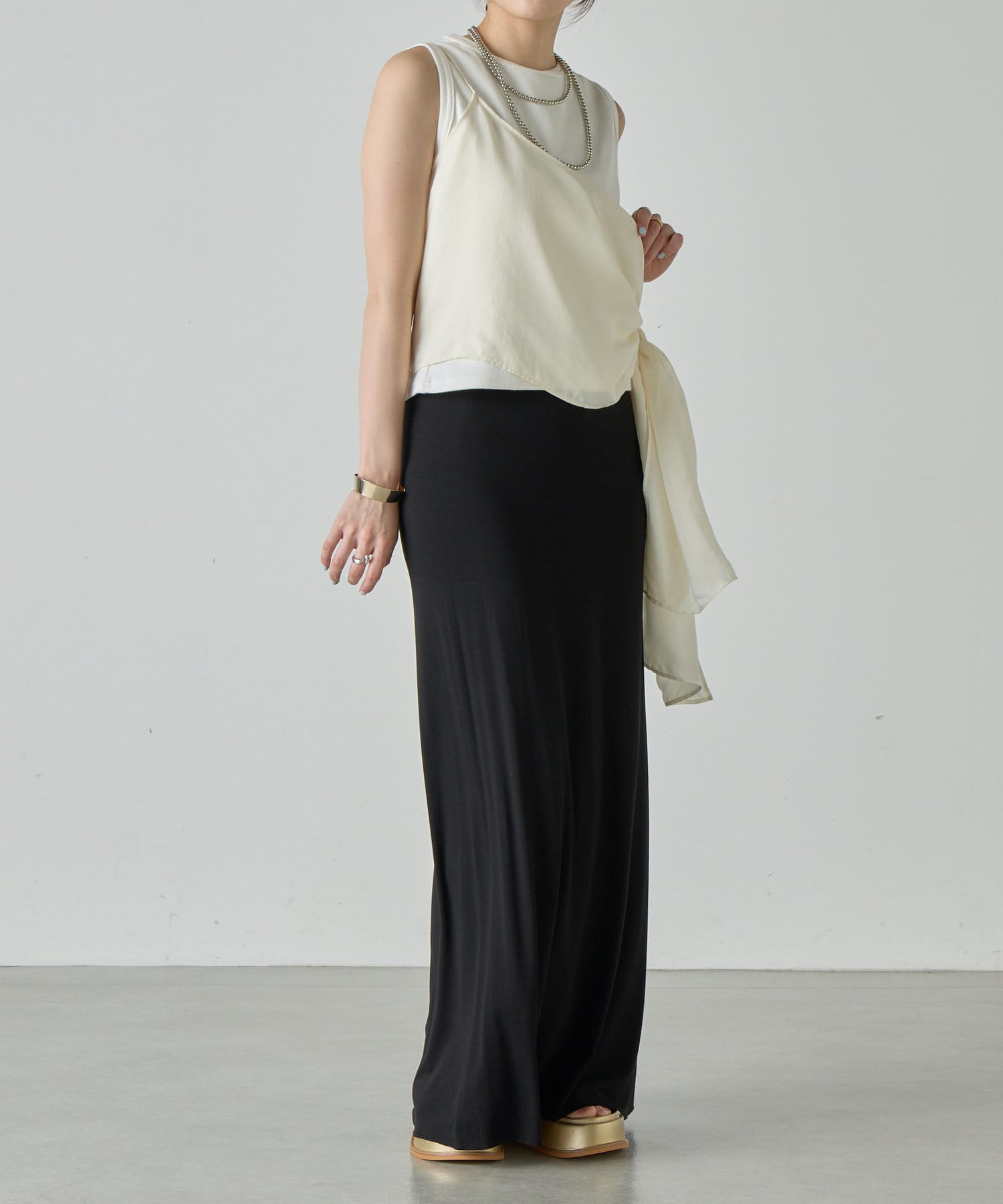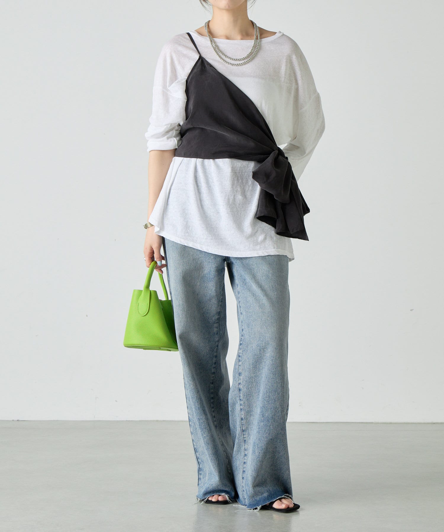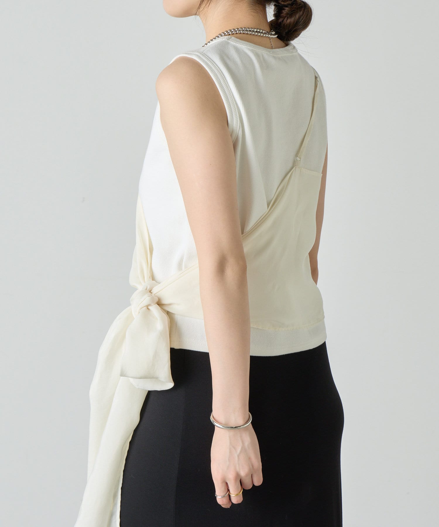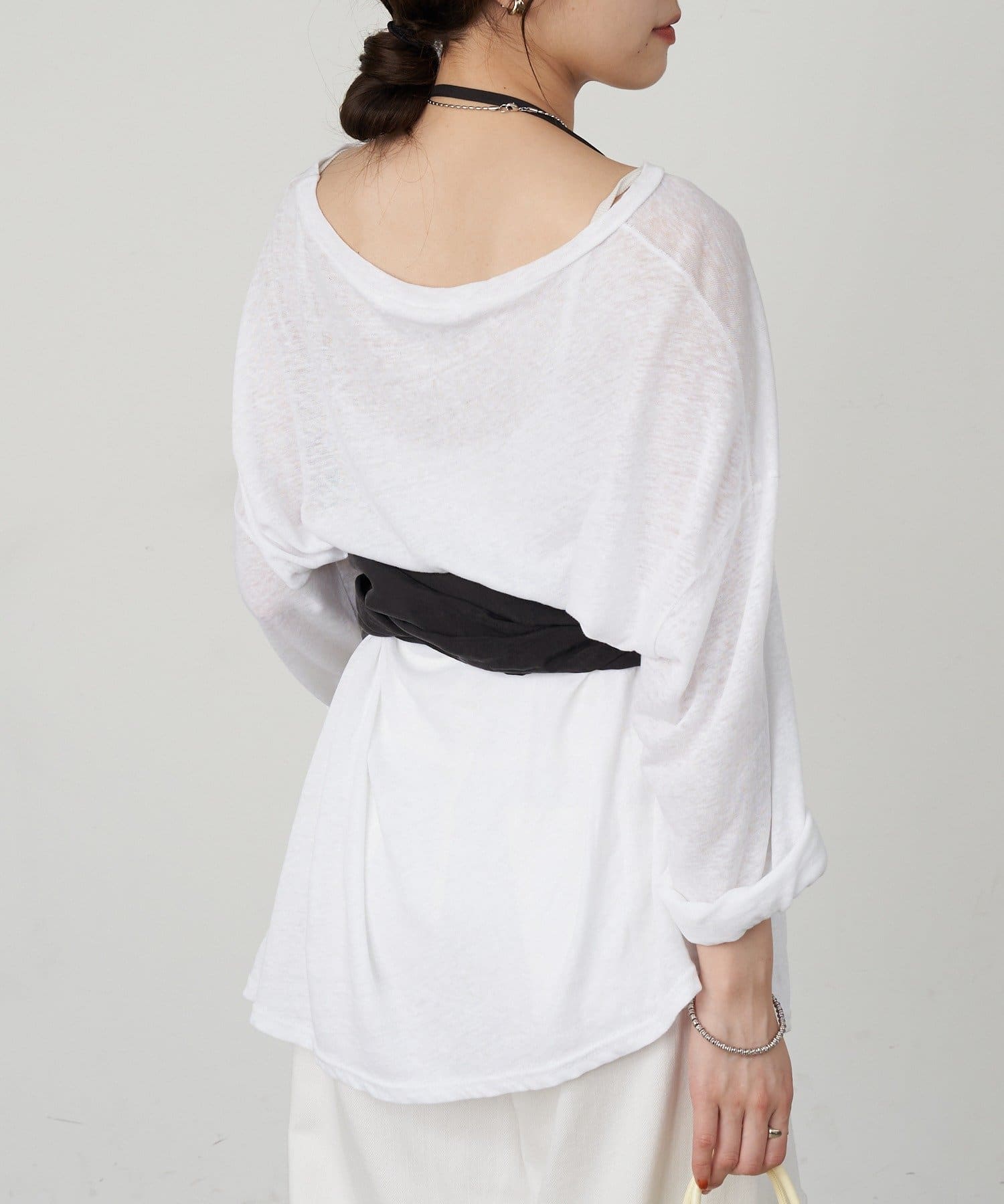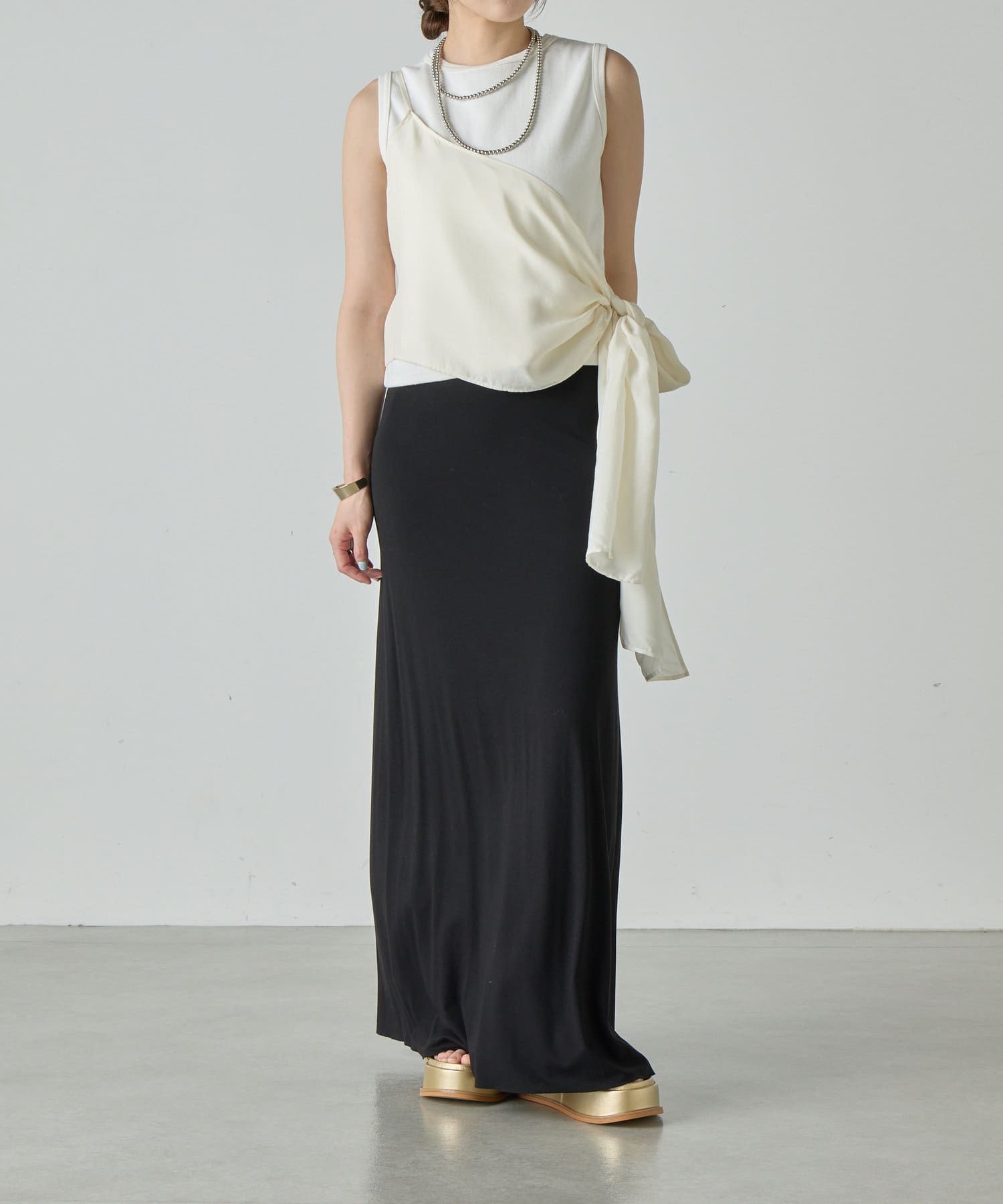 右肩だけストラップをかけて、自然なシワを寄せて後ろで結んだり、サイドで結んだり、ストールタイプのキャミソールです。