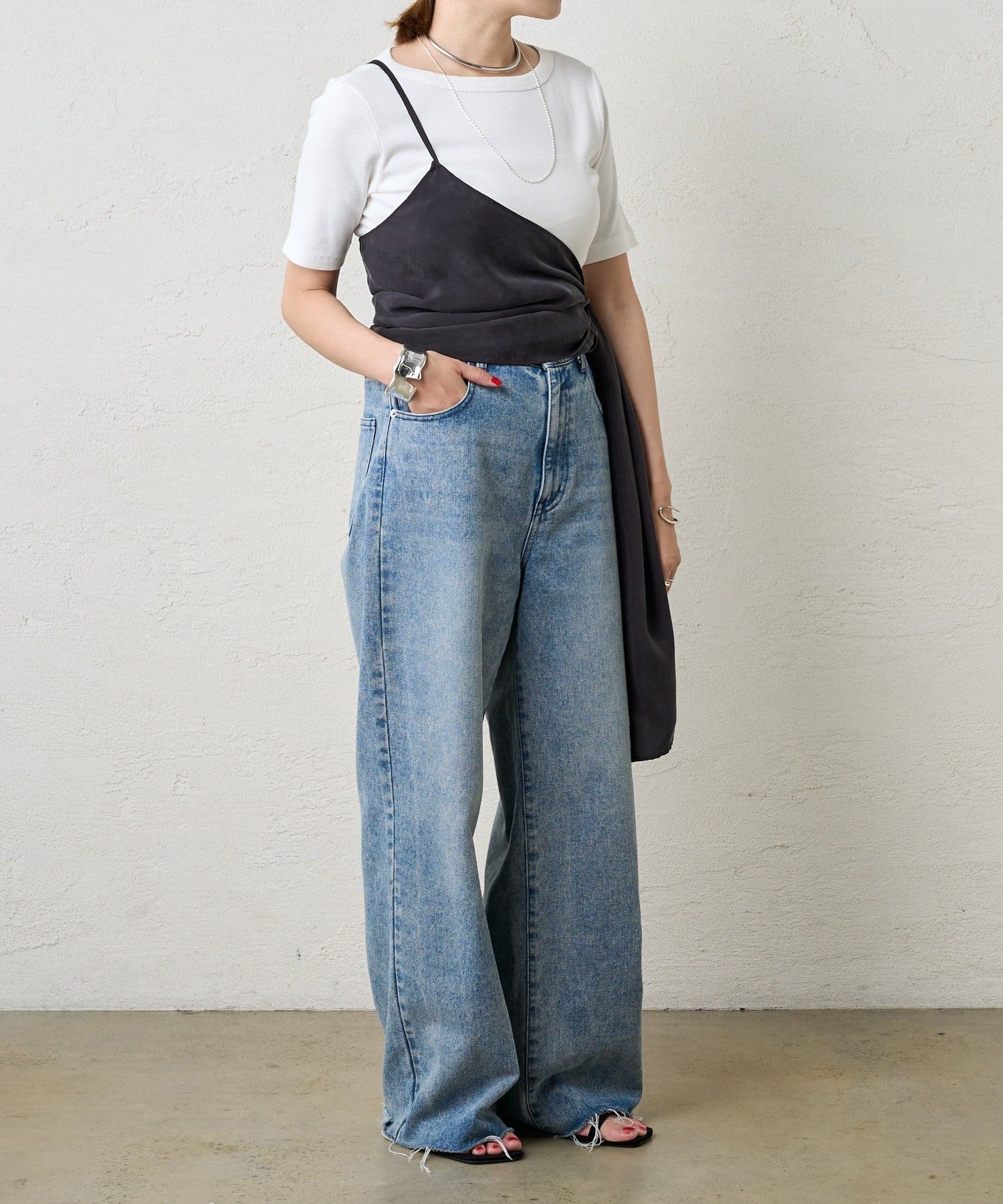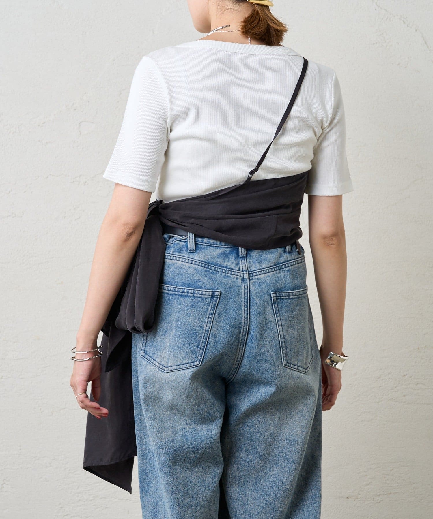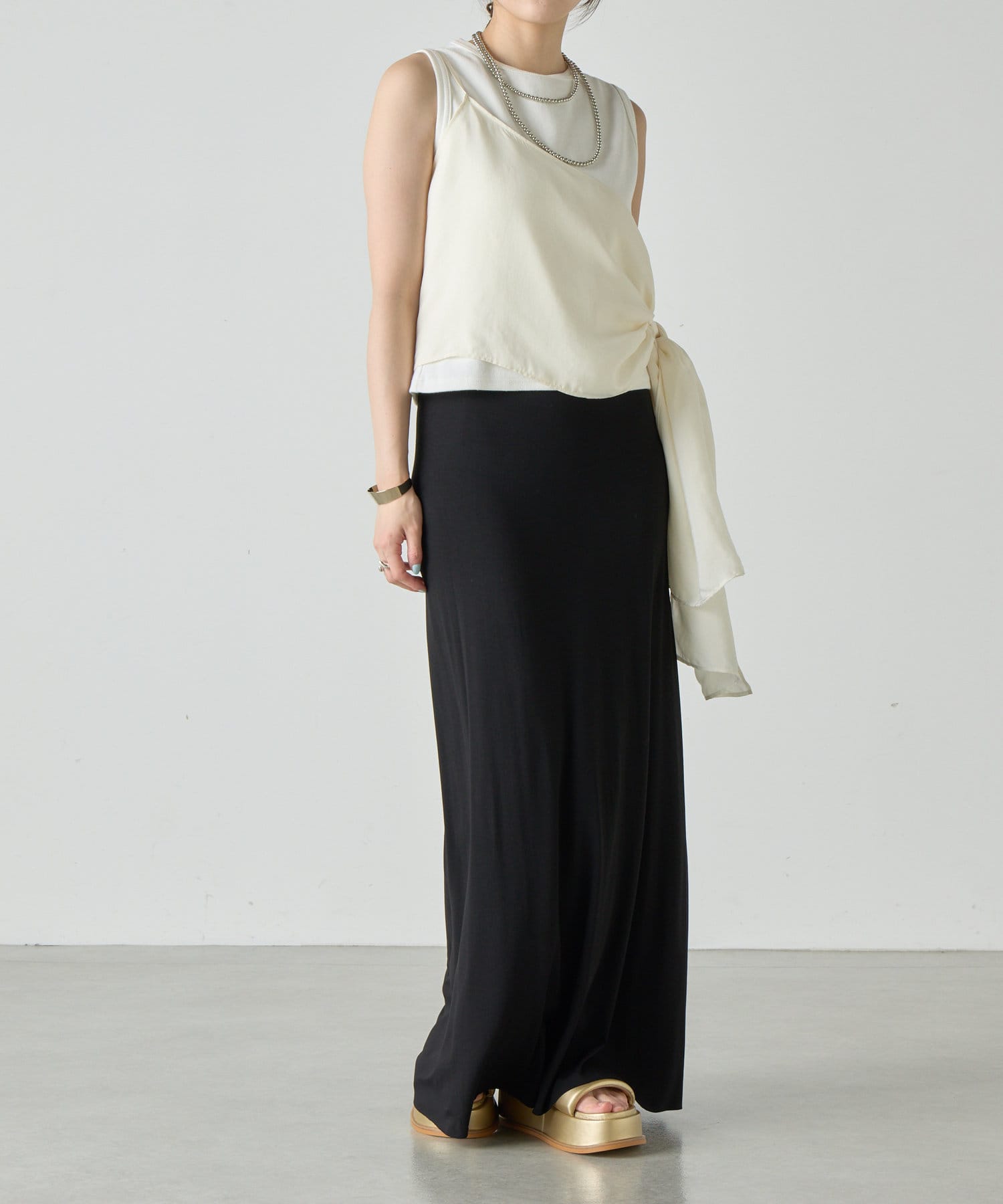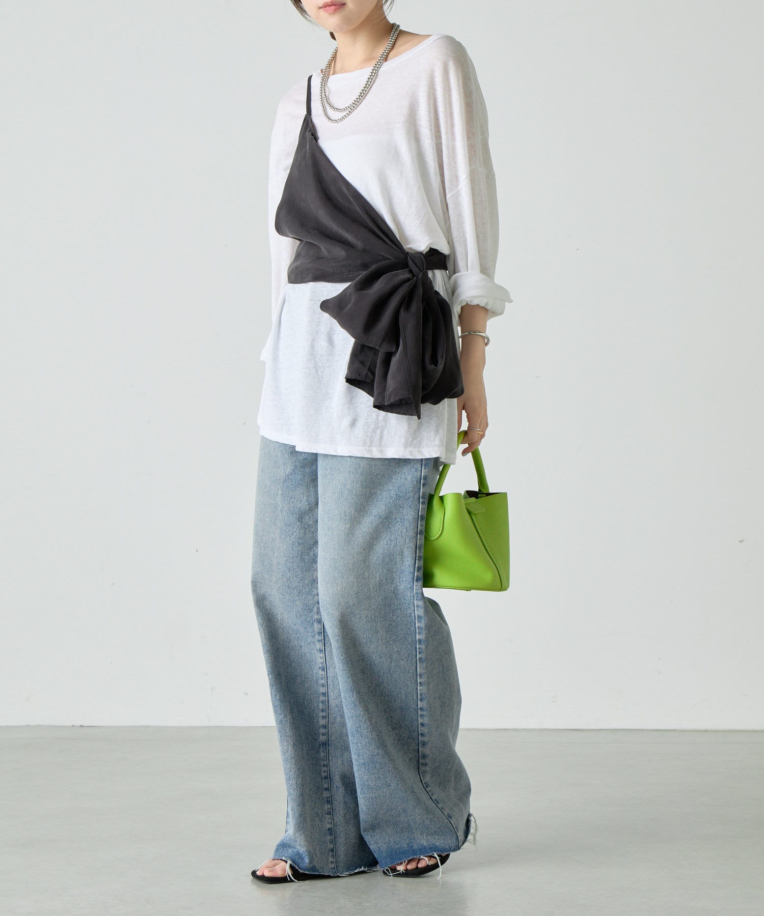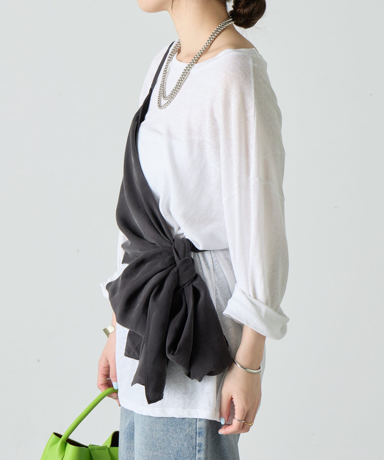 右肩だけストラップをかけて、自然なシワを寄せて後ろで結んだり、サイドで結んだり、ストールタイプのキャミソールです。