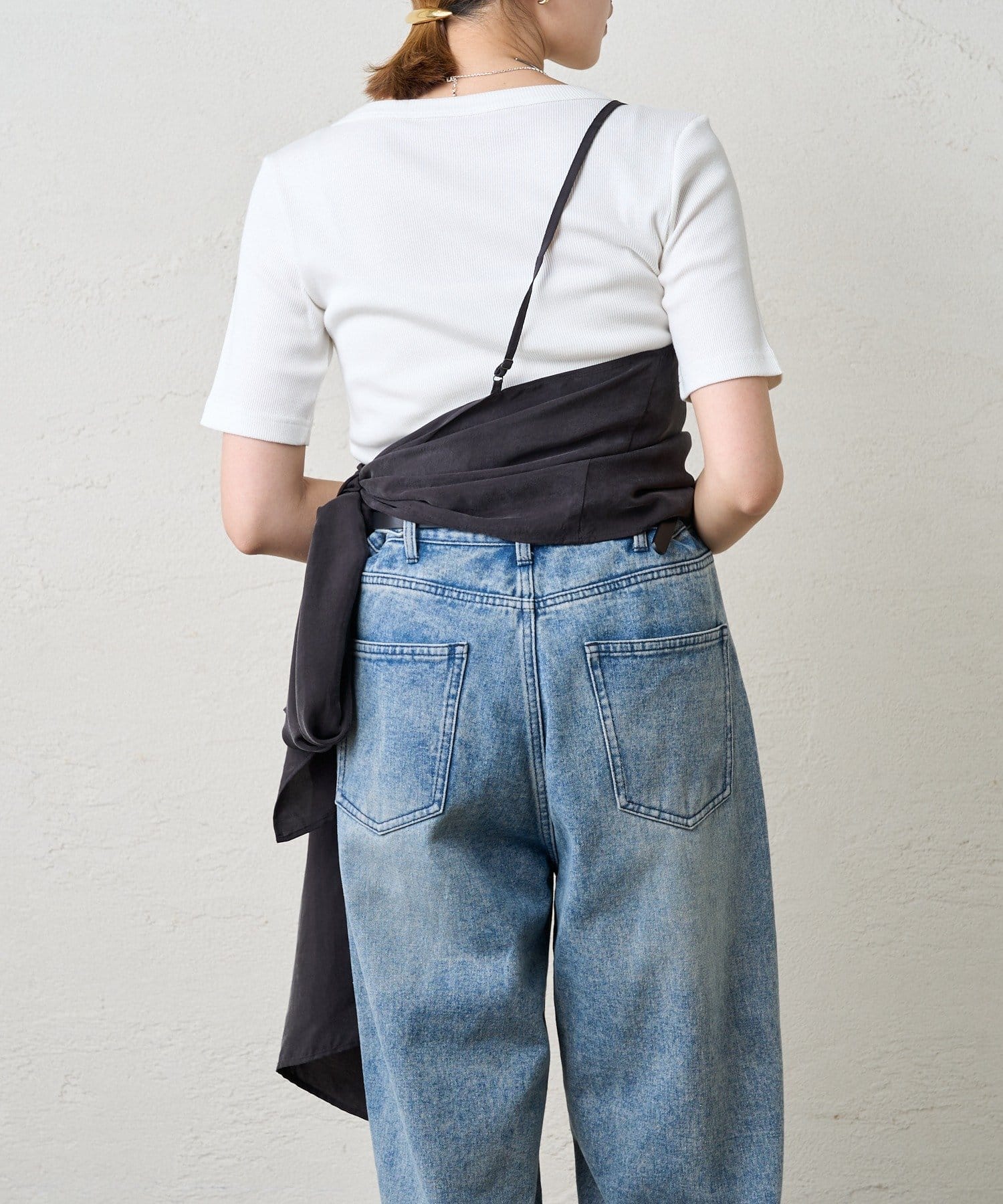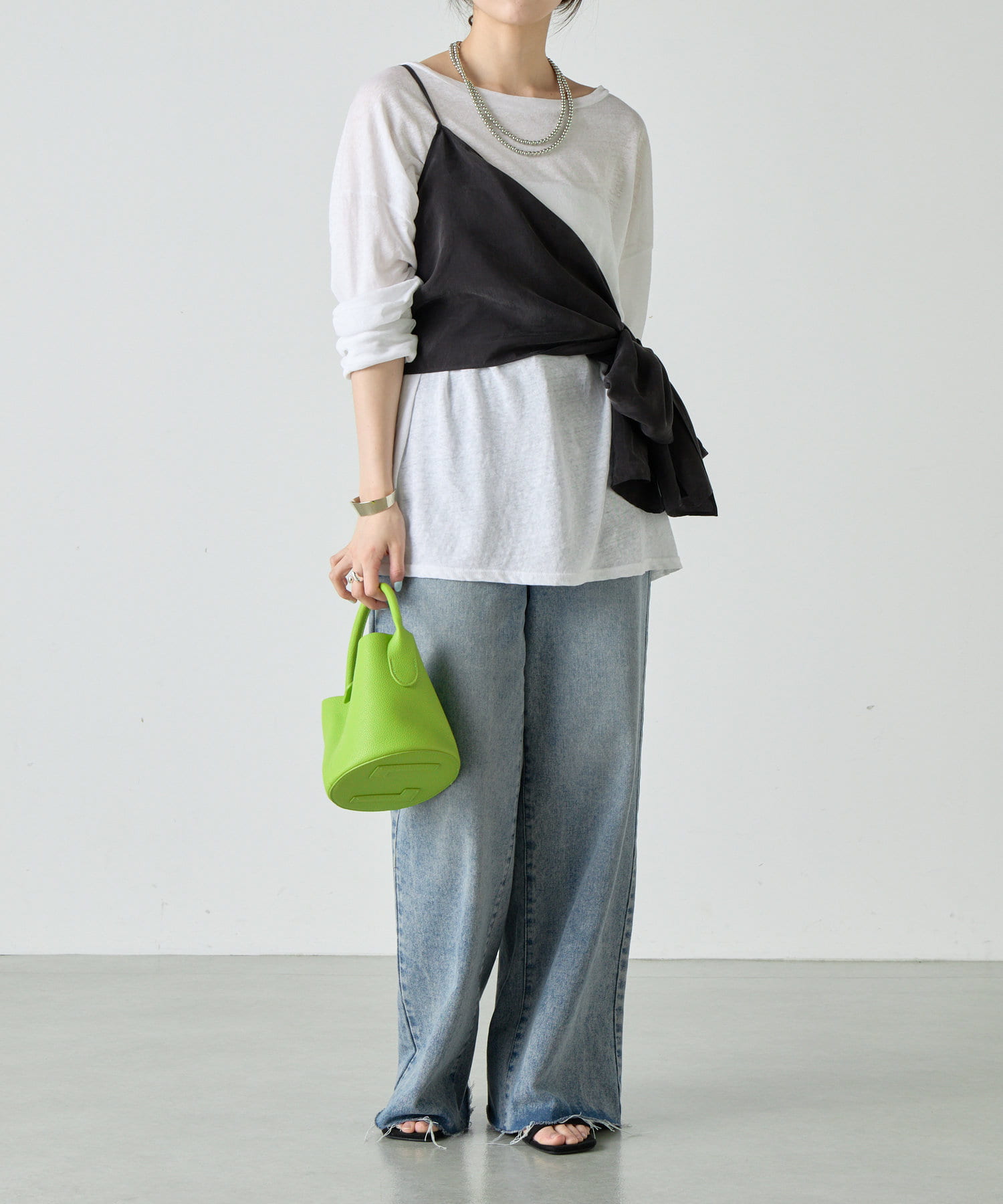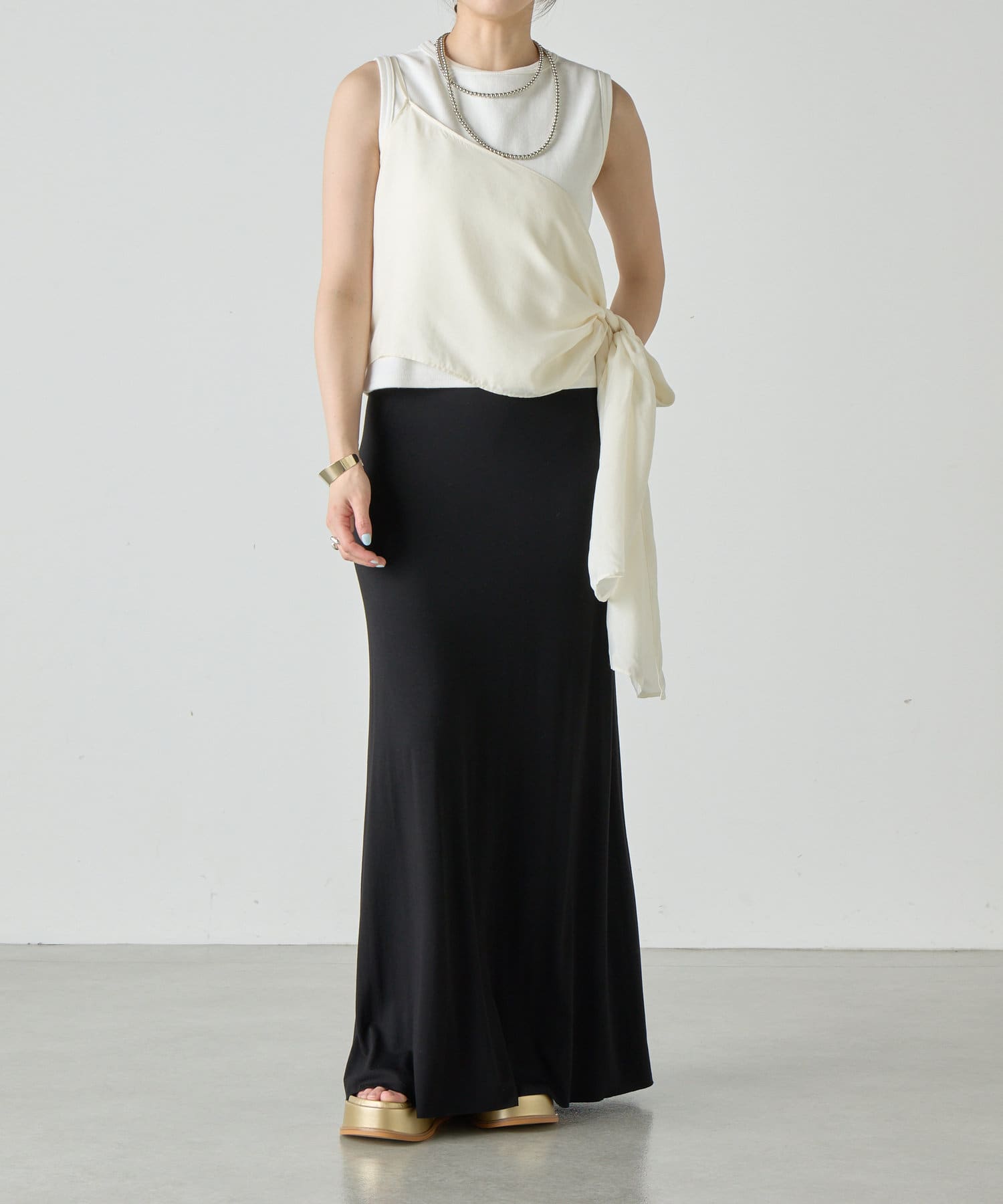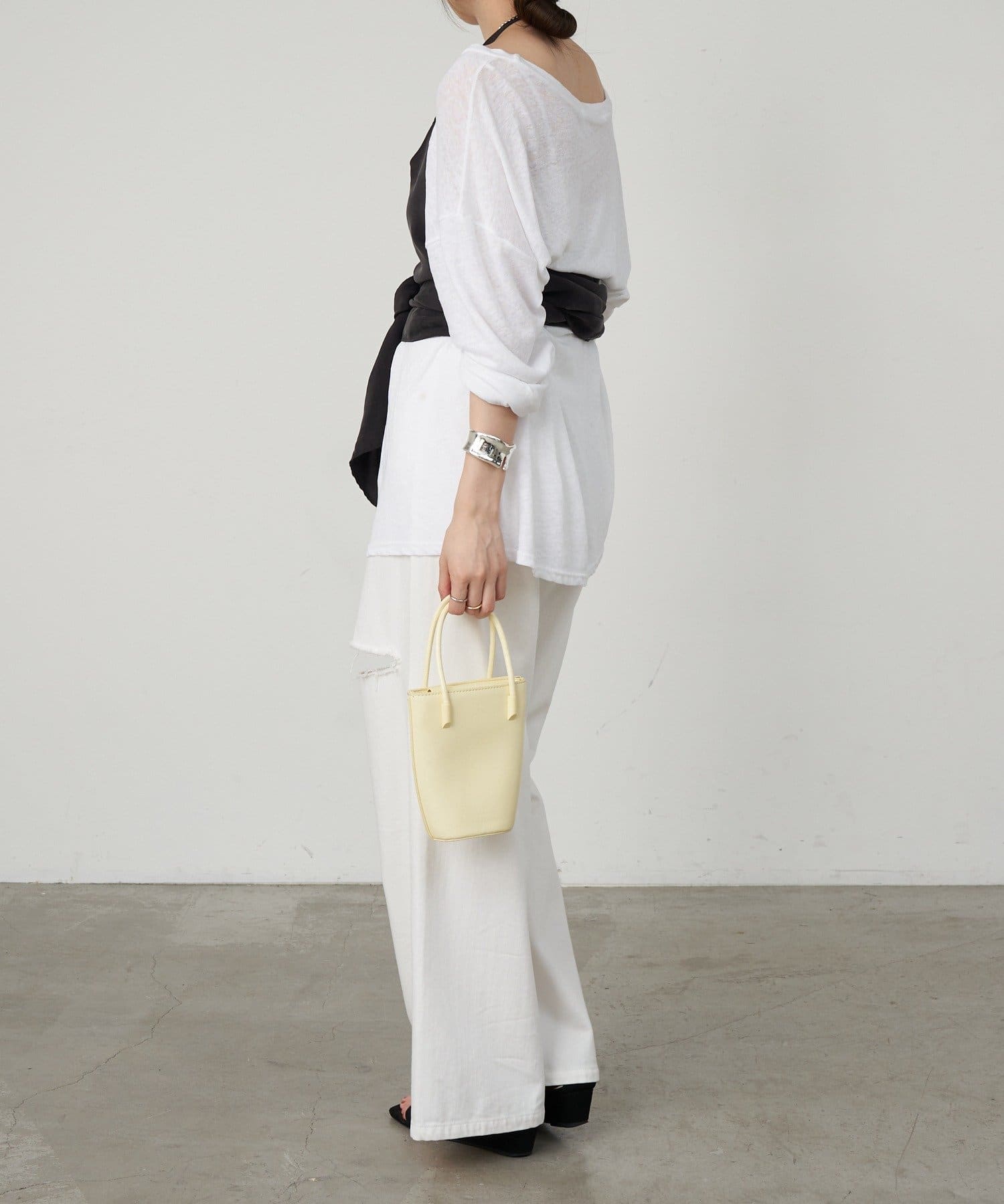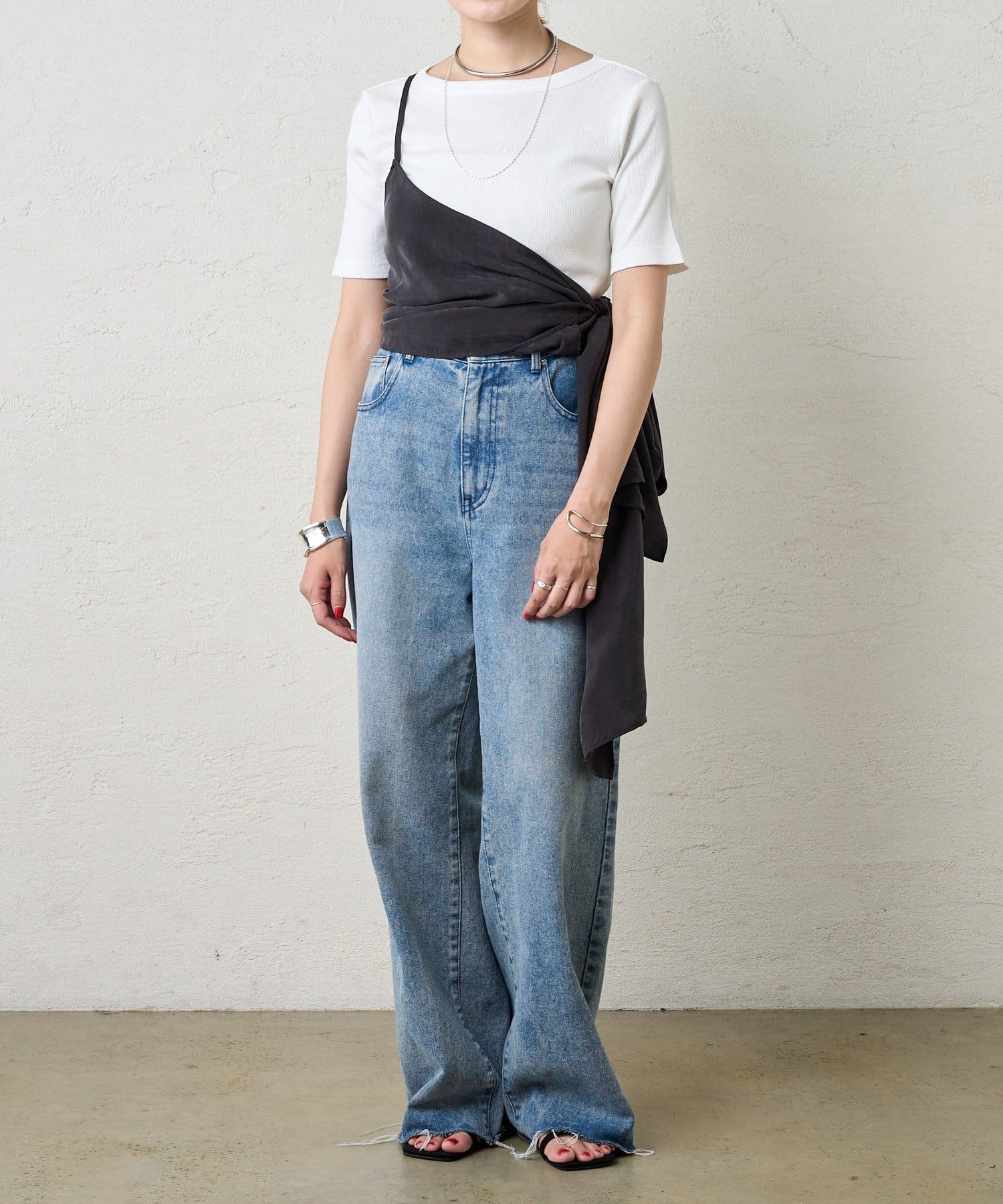 右肩だけストラップをかけて、自然なシワを寄せて後ろで結んだり、サイドで結んだり、ストールタイプのキャミソールです。