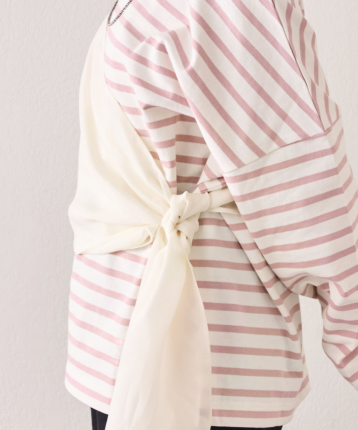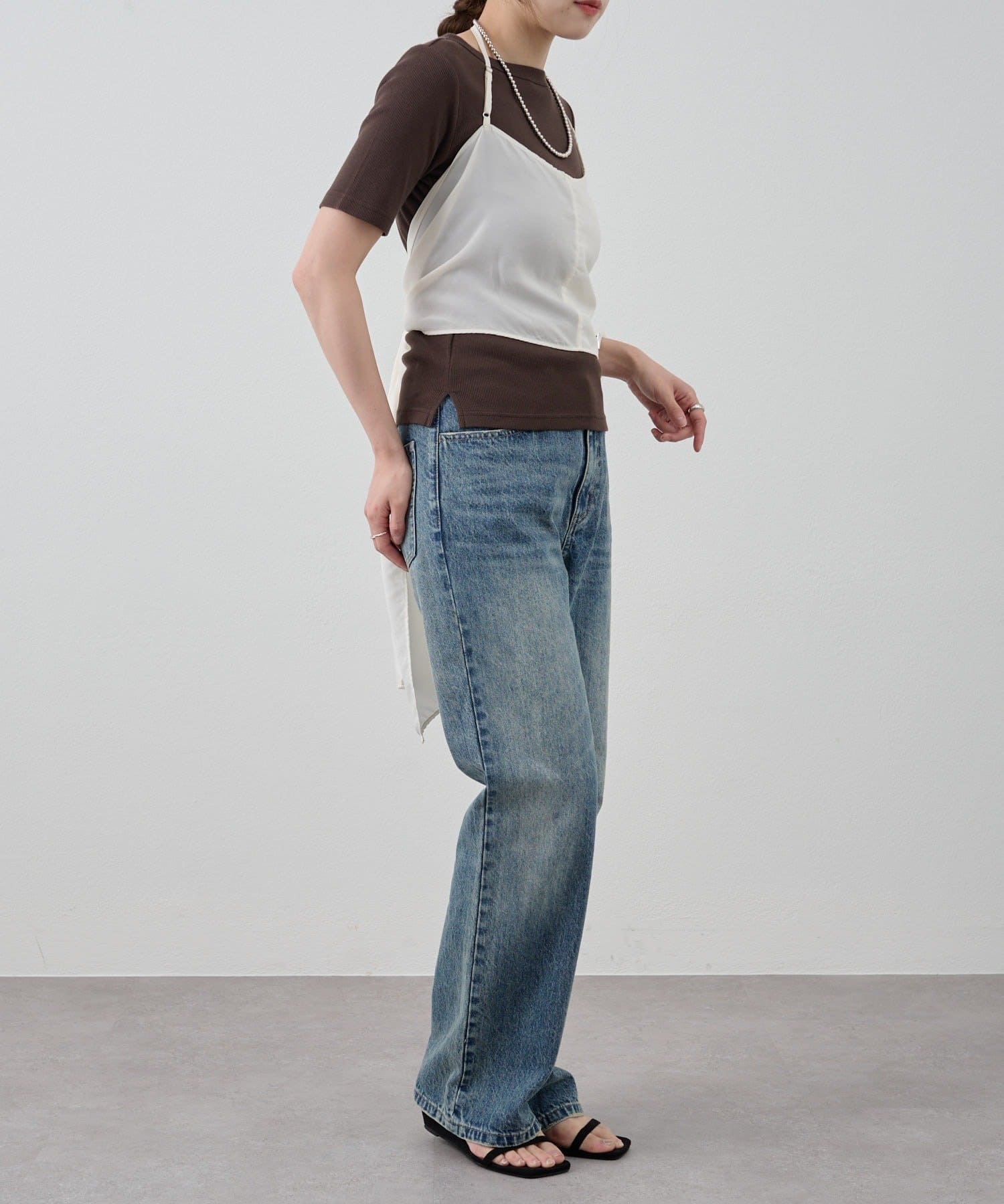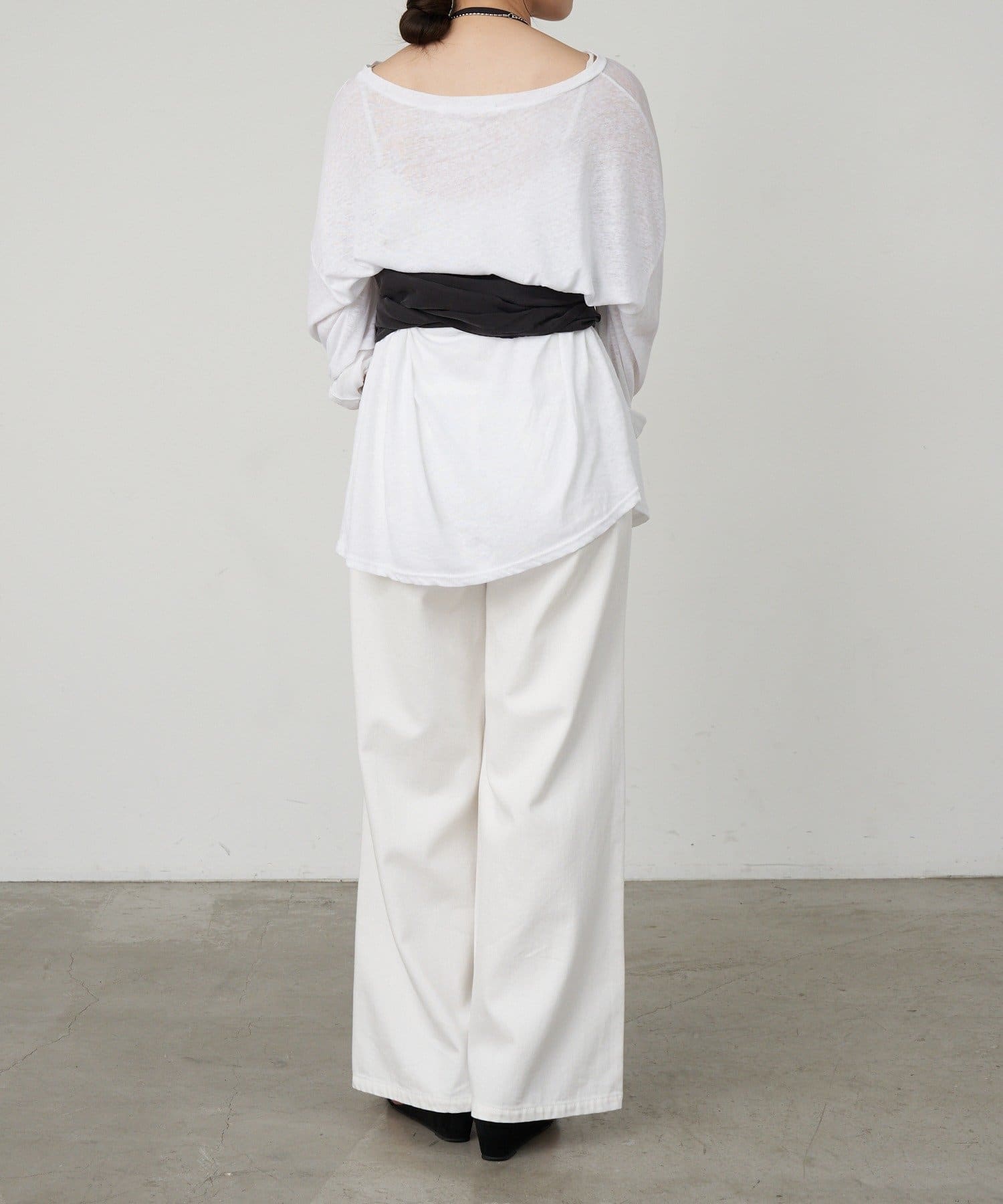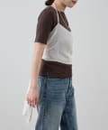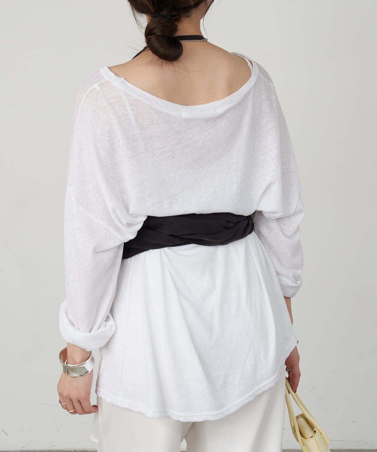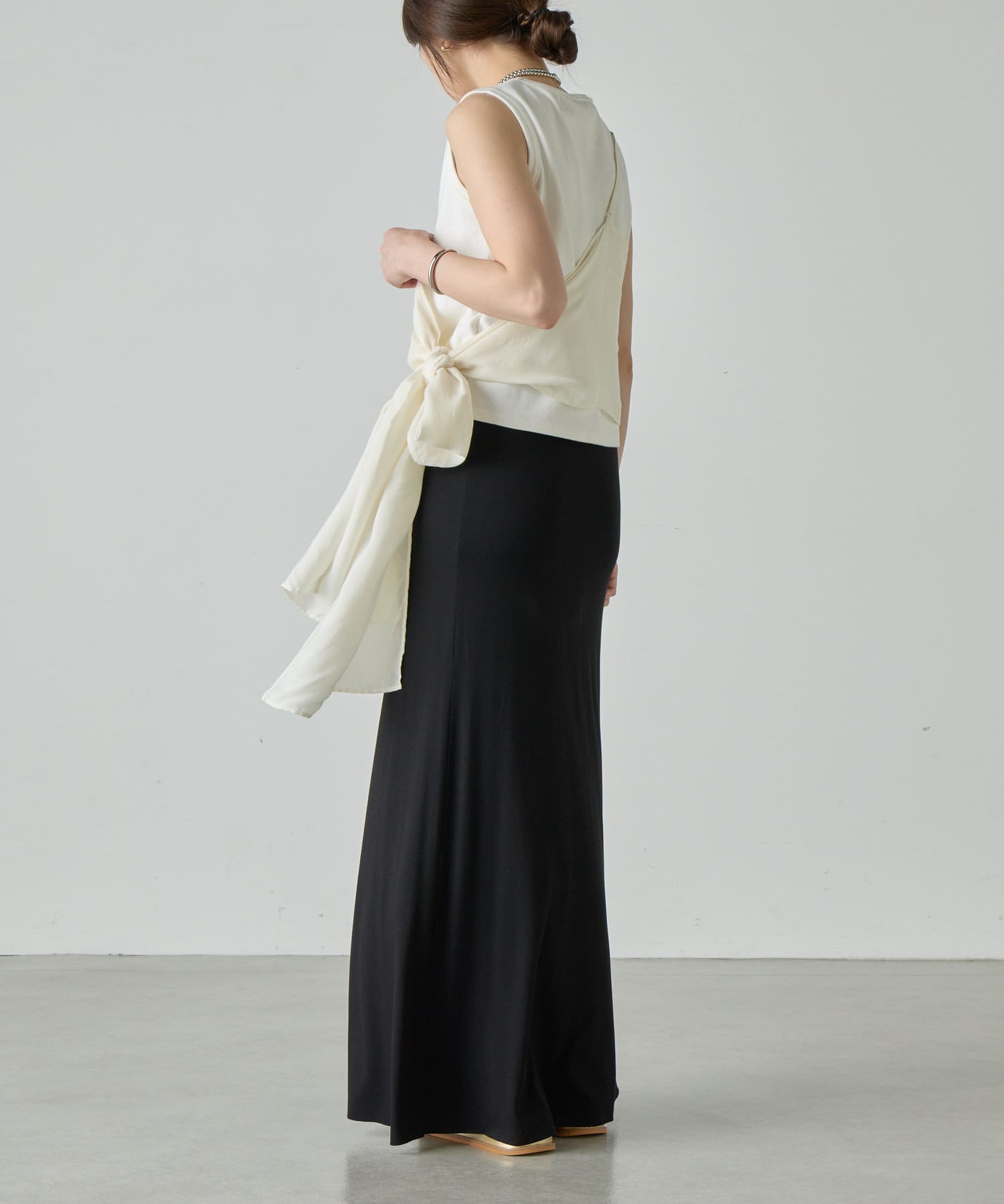 右肩だけストラップをかけて、自然なシワを寄せて後ろで結んだり、サイドで結んだり、ストールタイプのキャミソールです。