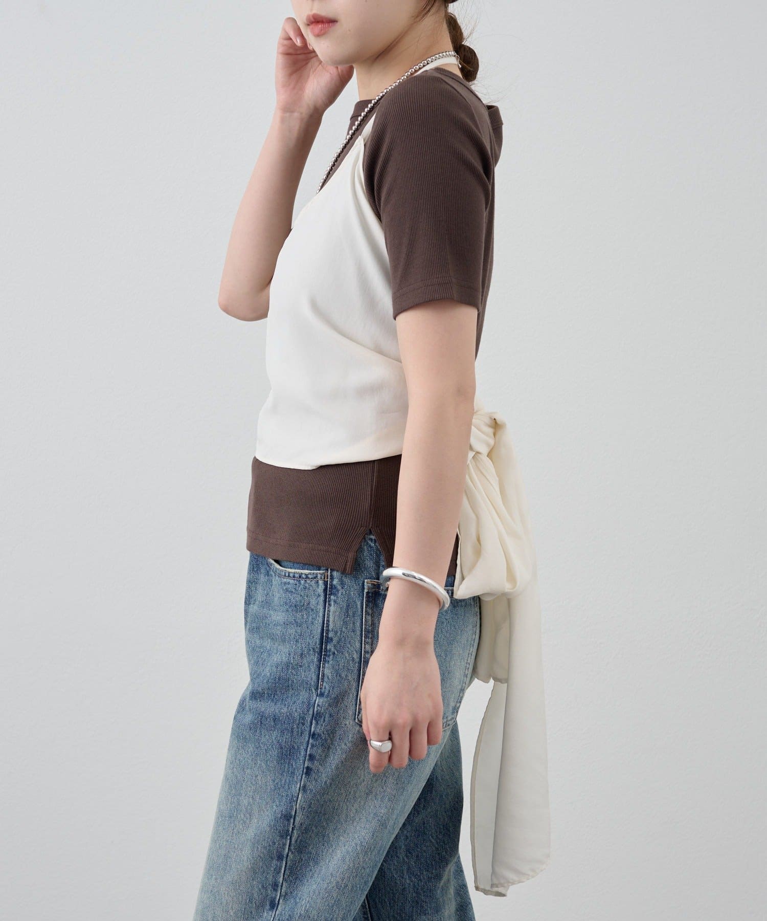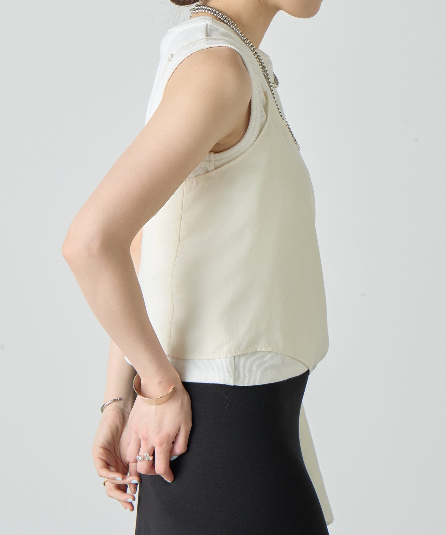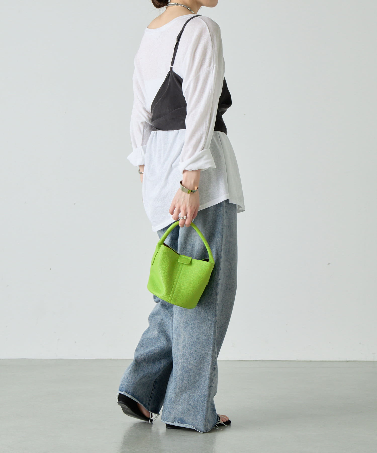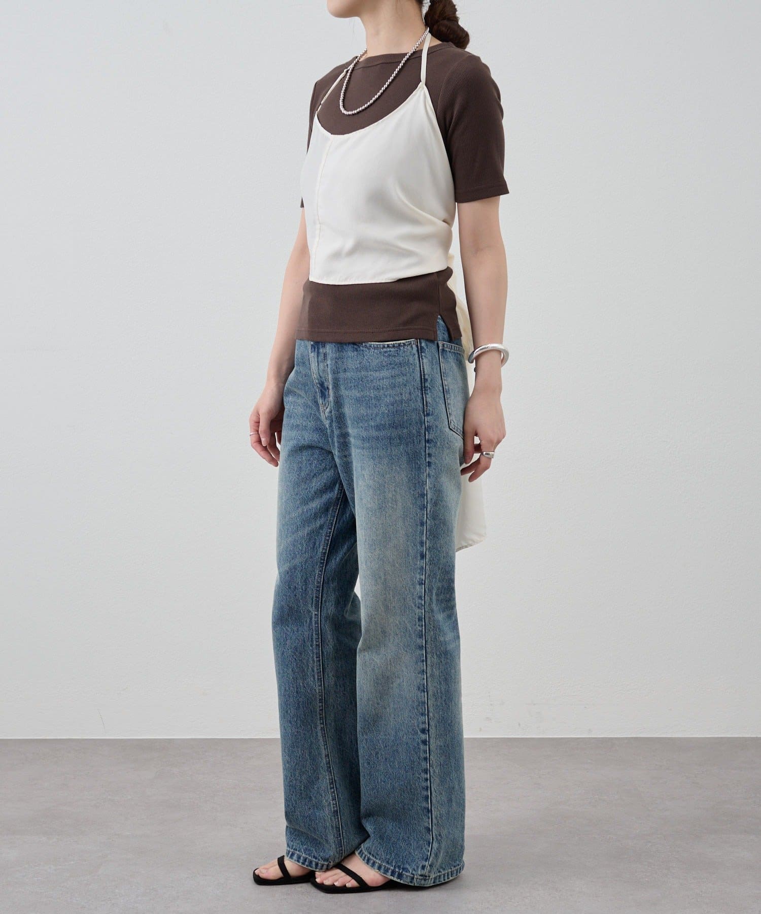 右肩だけストラップをかけて、自然なシワを寄せて後ろで結んだり、サイドで結んだり、ストールタイプのキャミソールです。