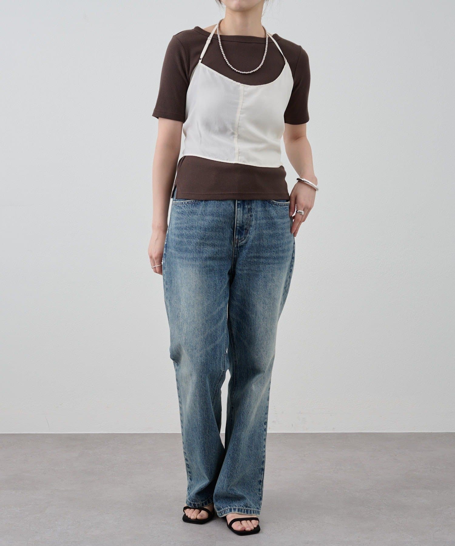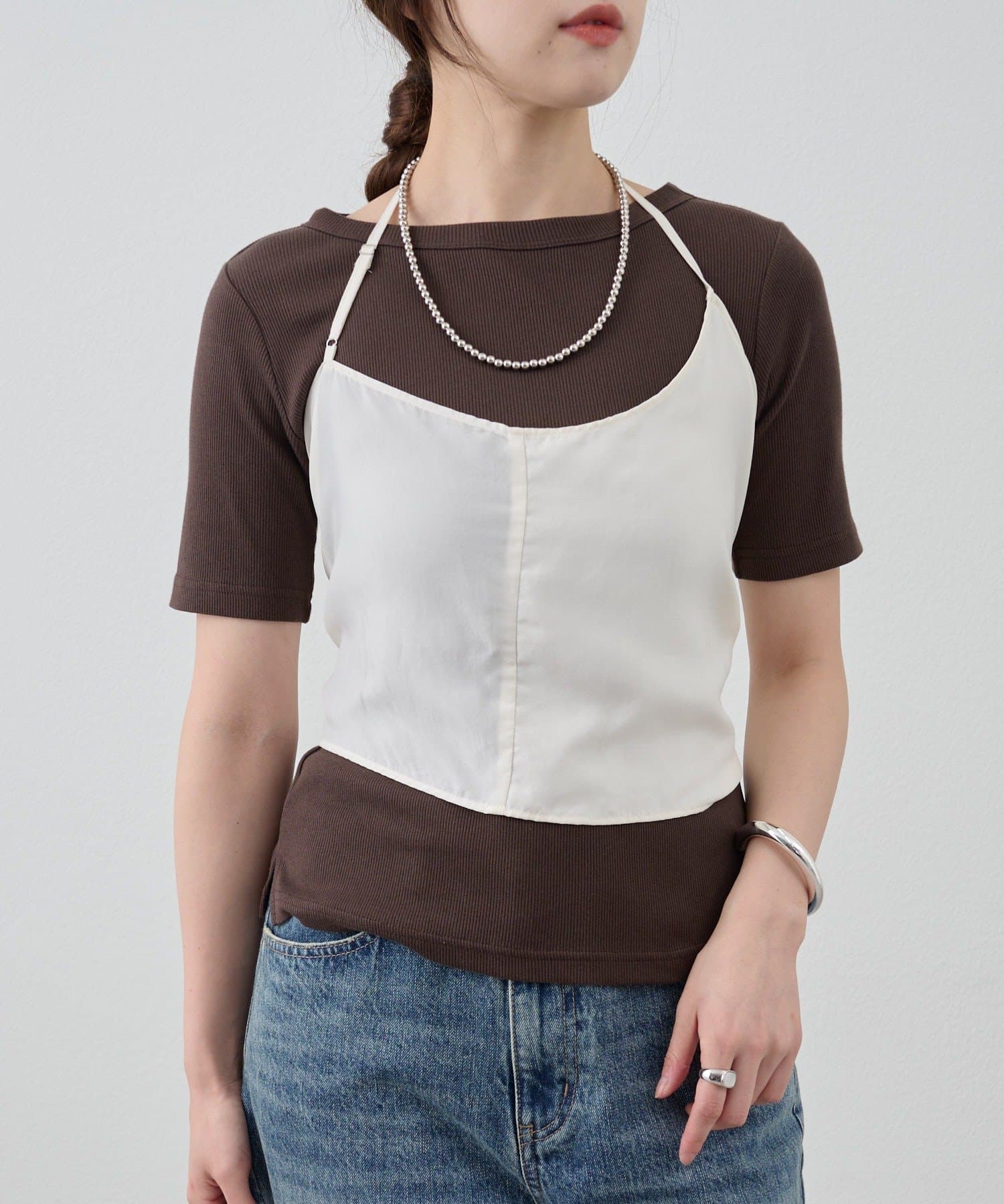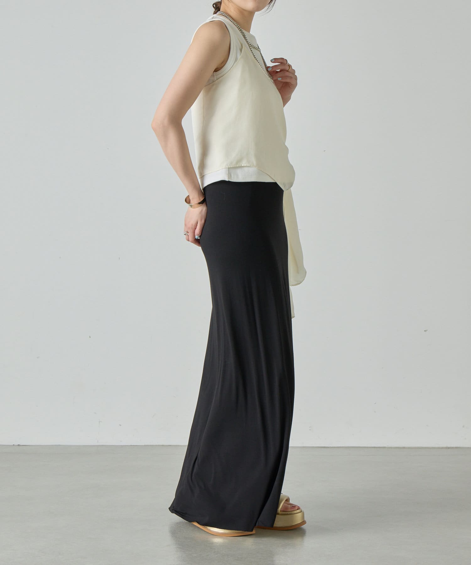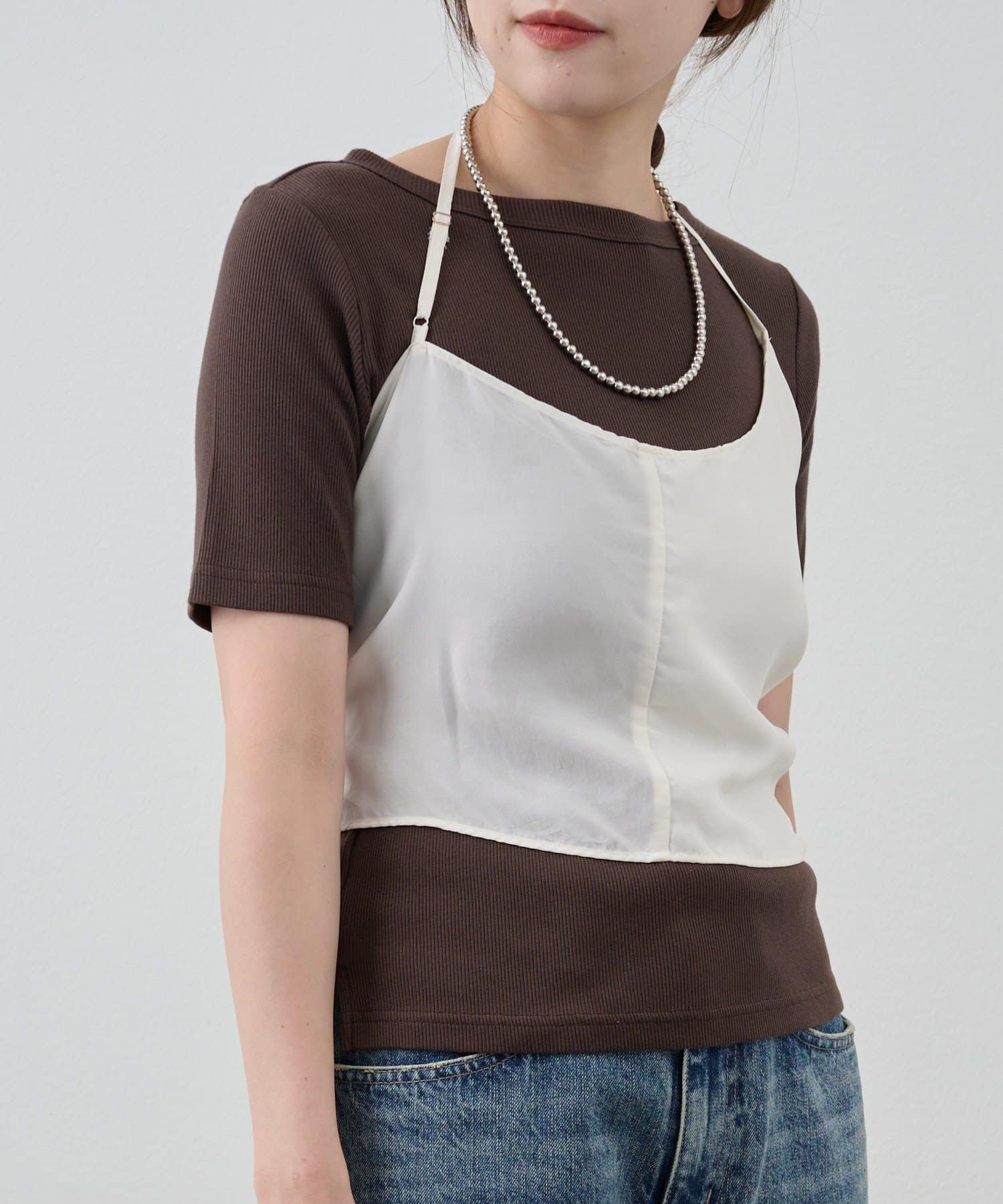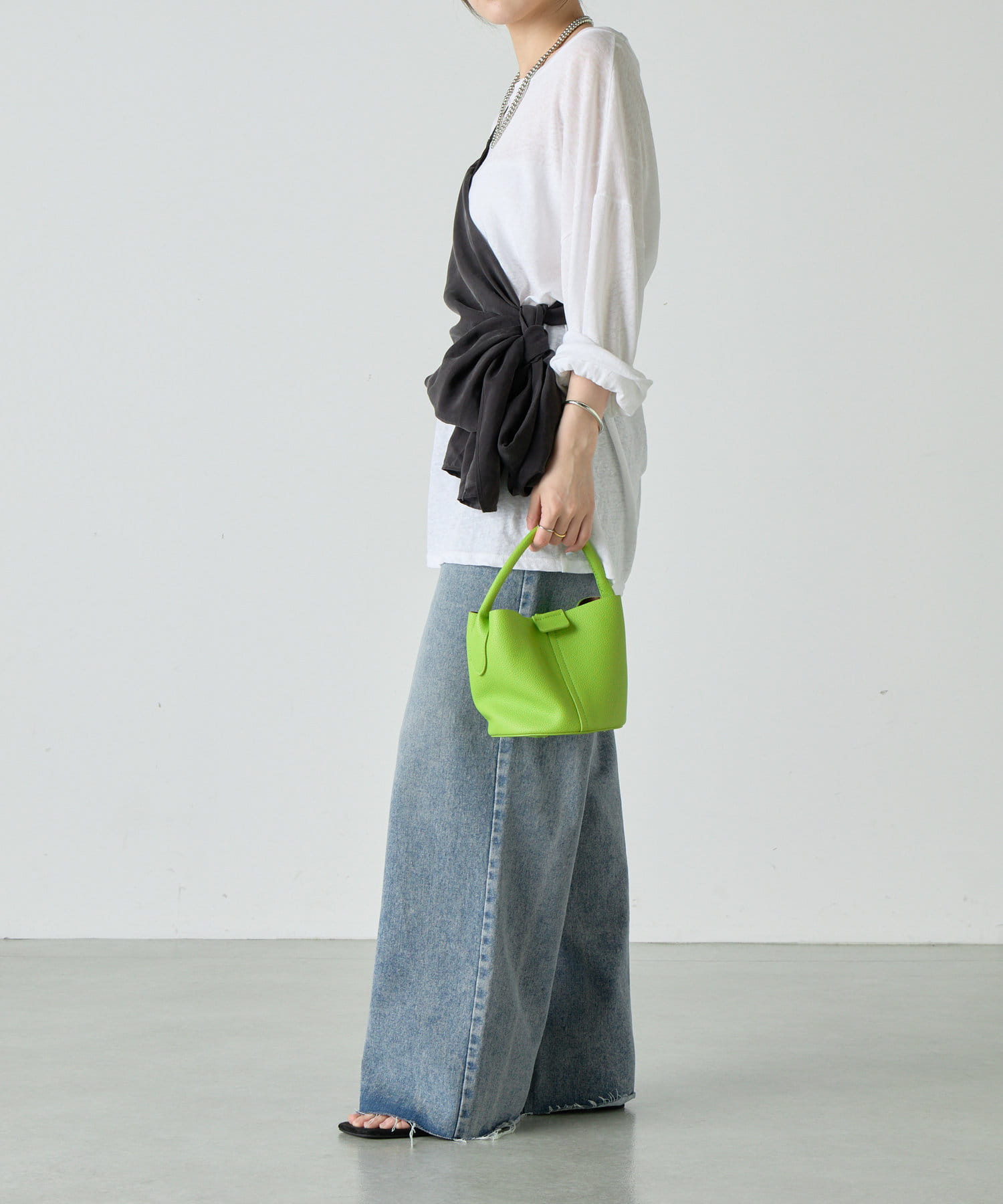 右肩だけストラップをかけて、自然なシワを寄せて後ろで結んだり、サイドで結んだり、ストールタイプのキャミソールです。