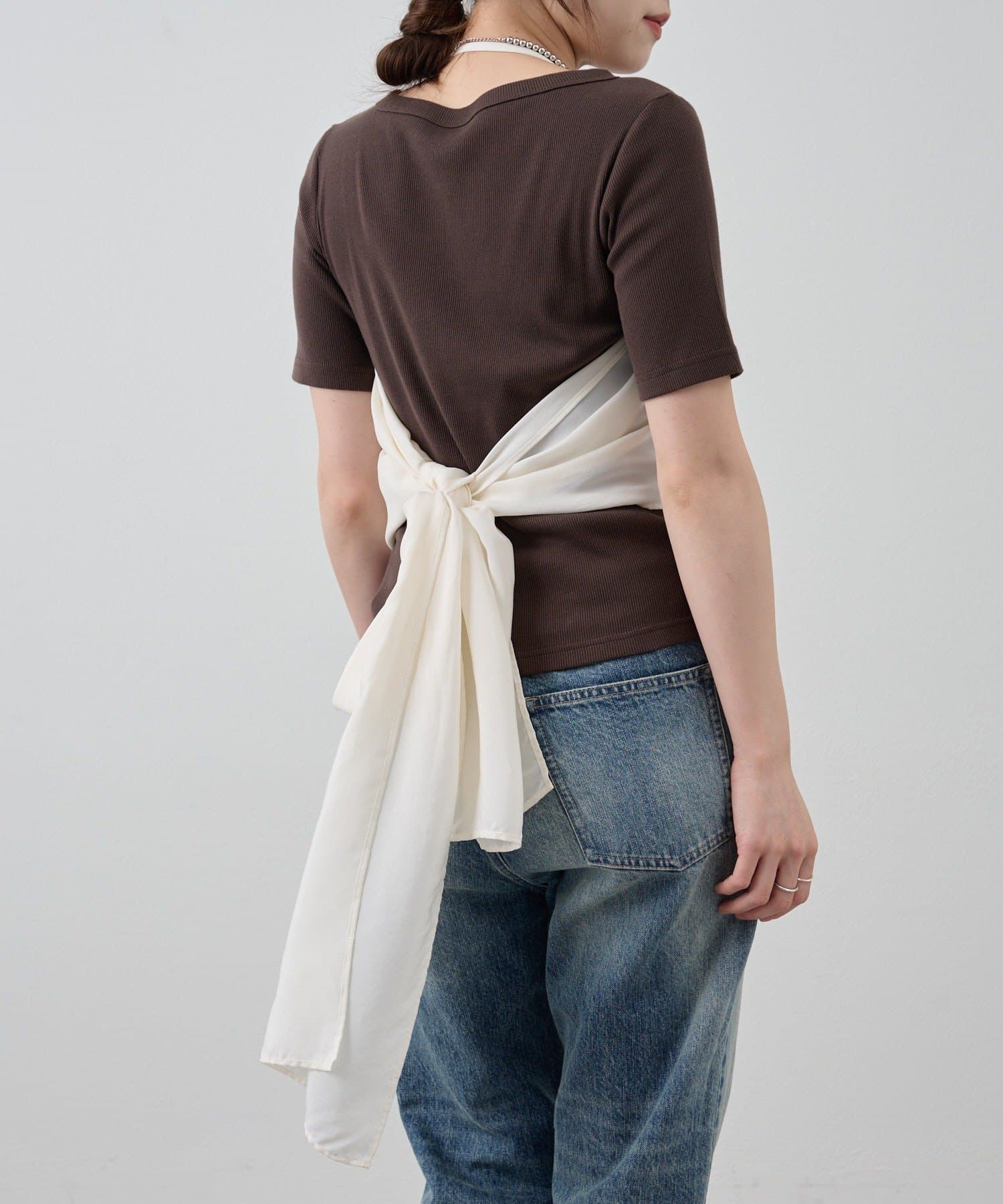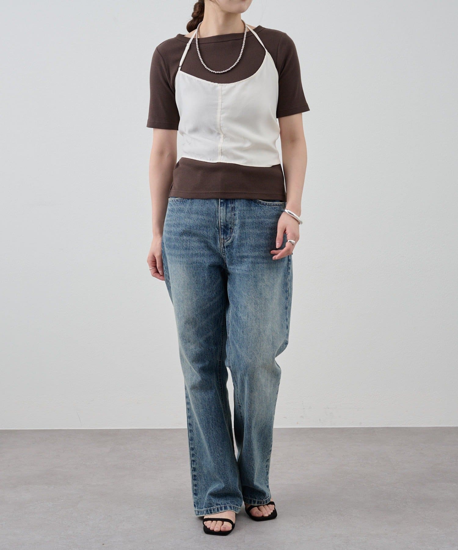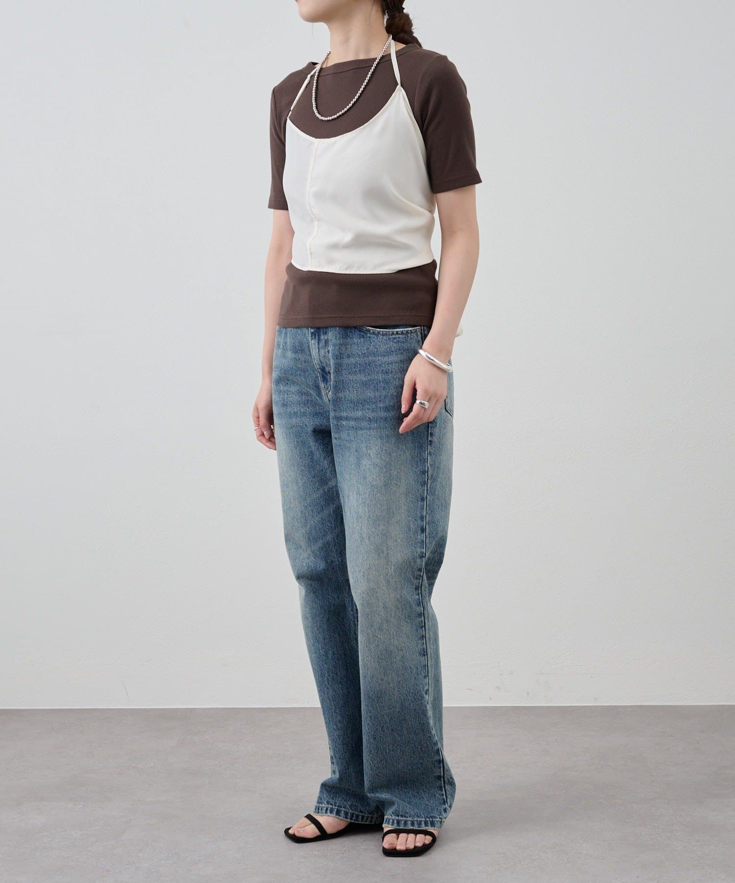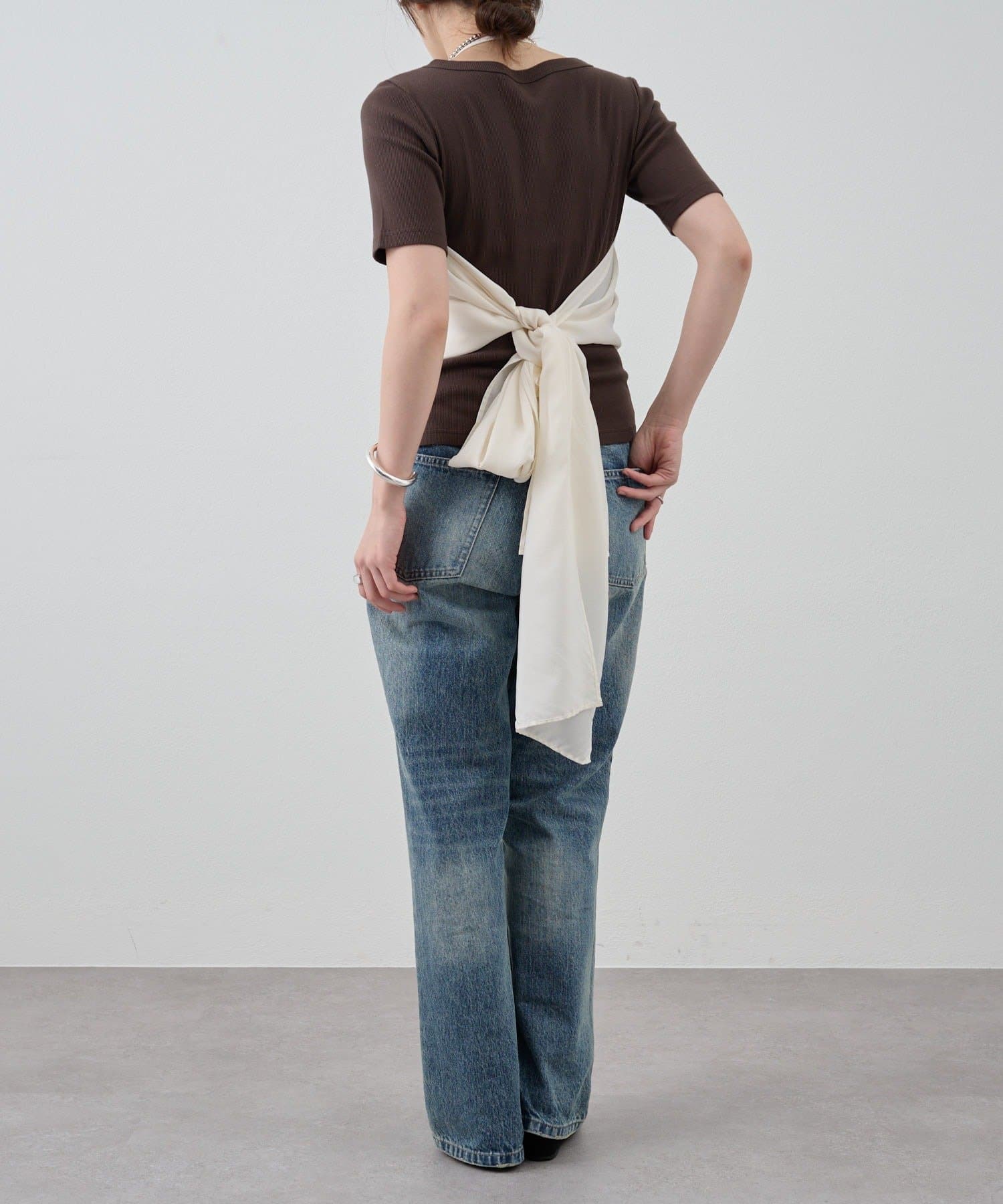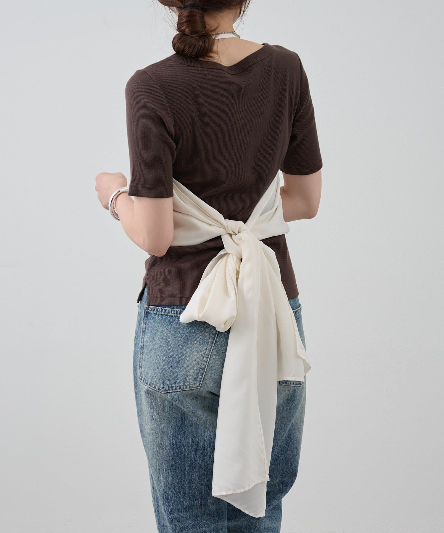 右肩だけストラップをかけて、自然なシワを寄せて後ろで結んだり、サイドで結んだり、ストールタイプのキャミソールです。