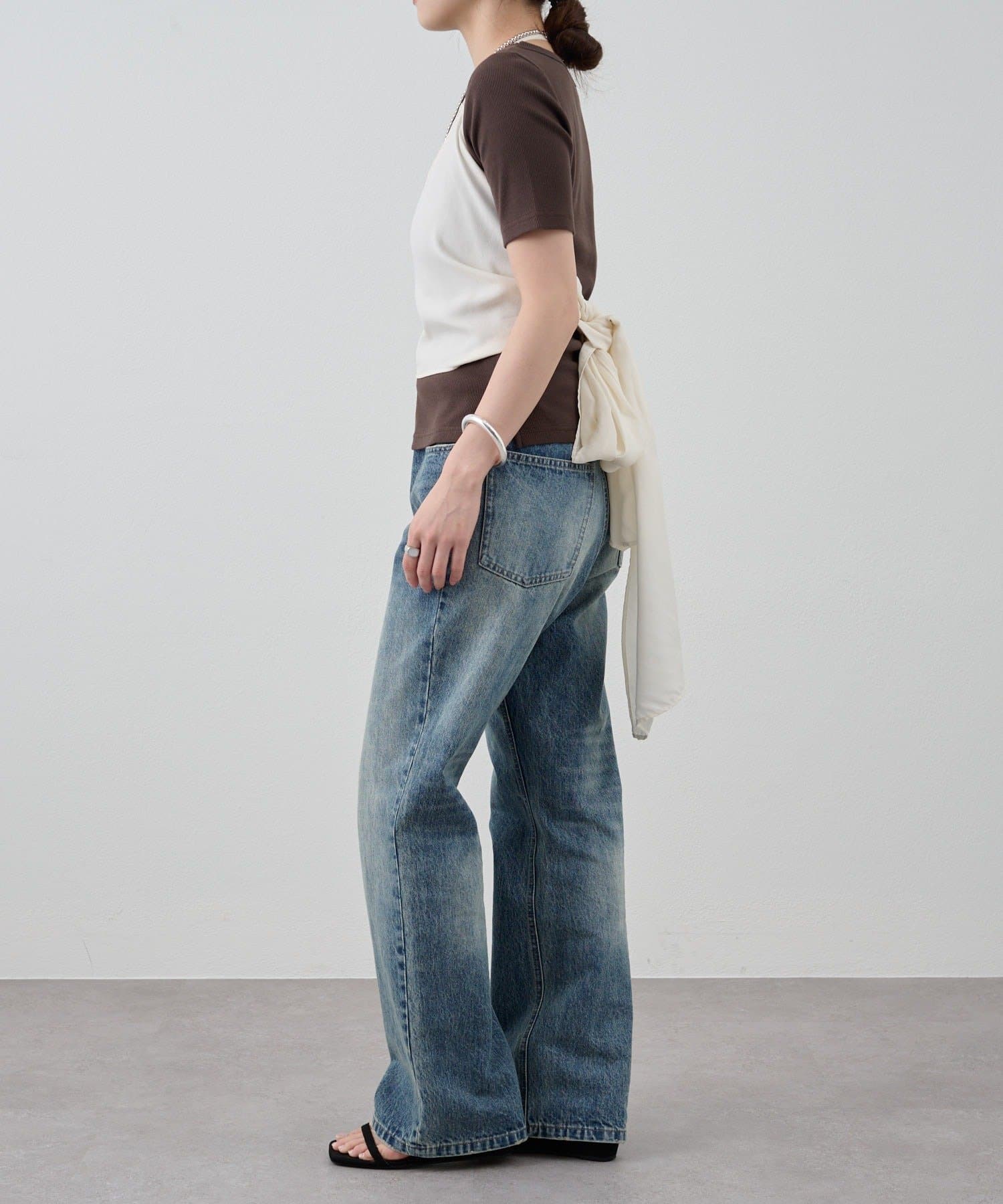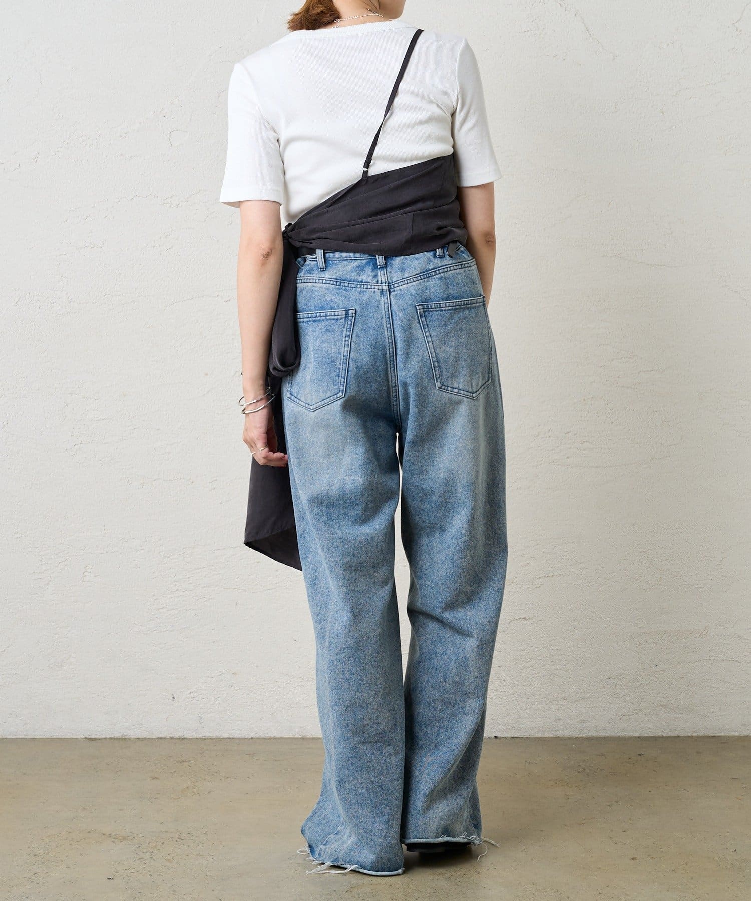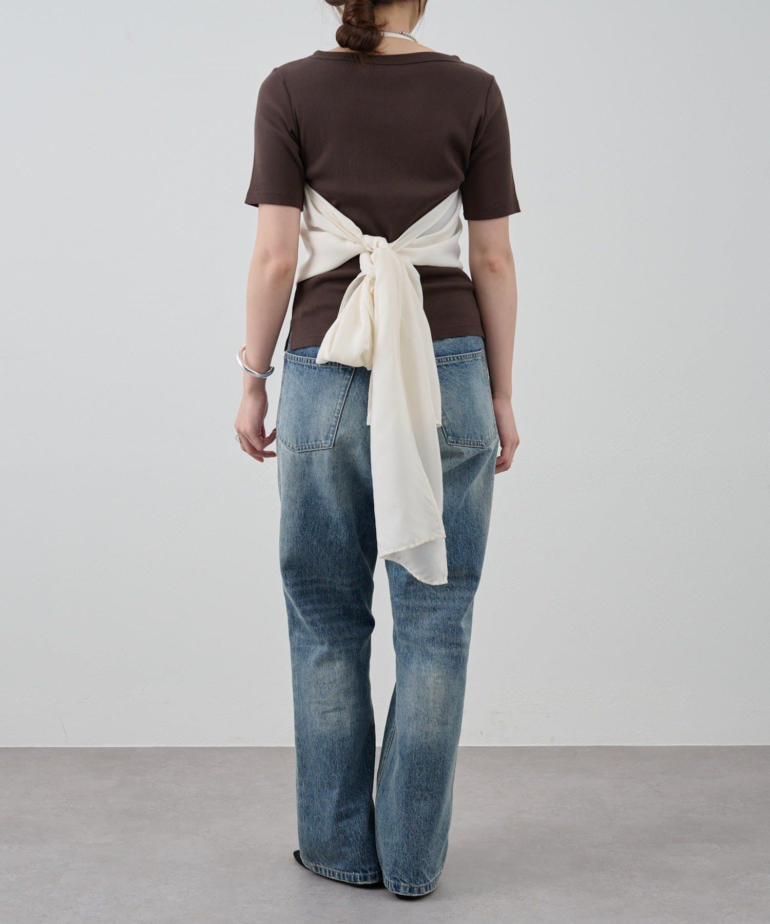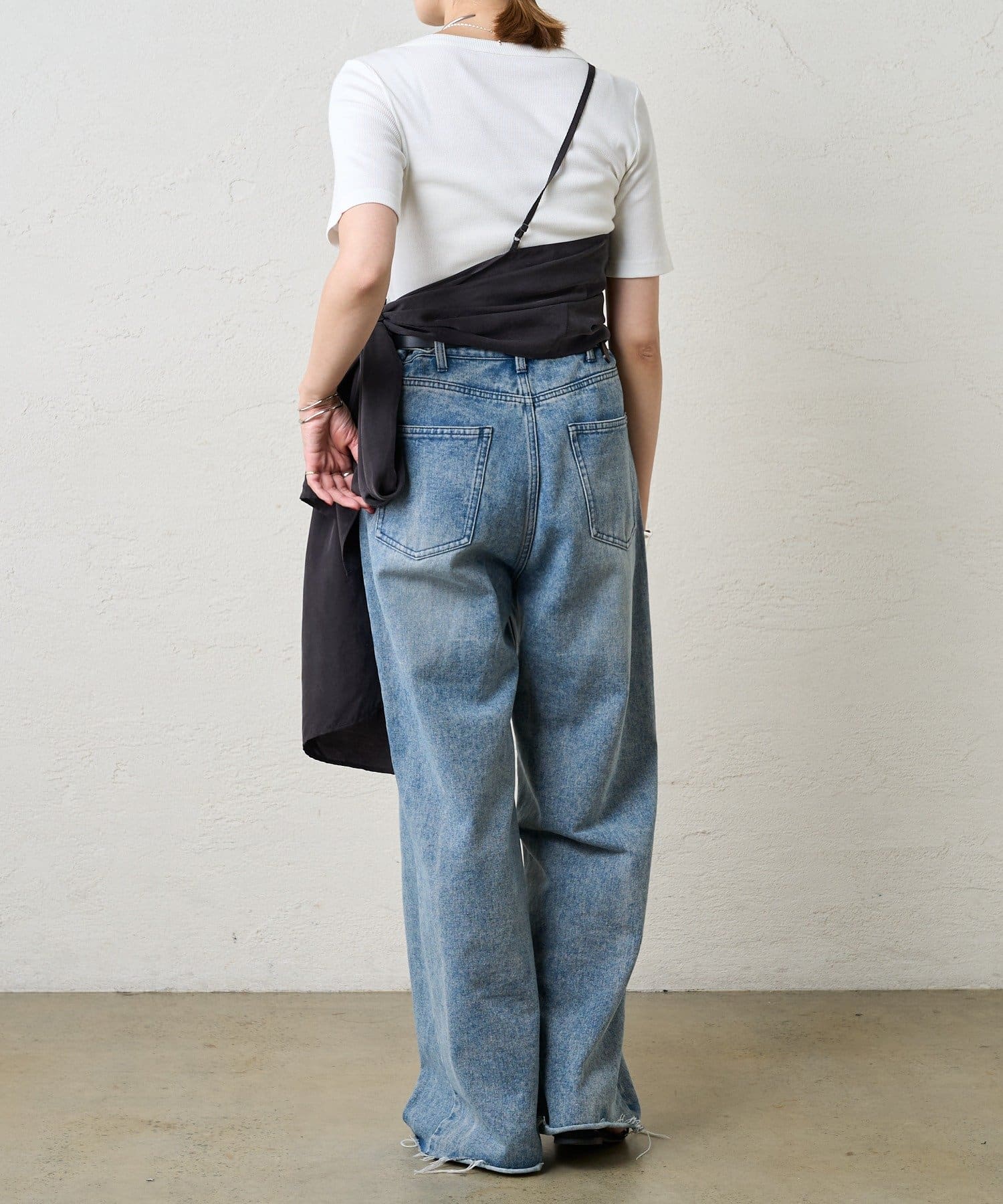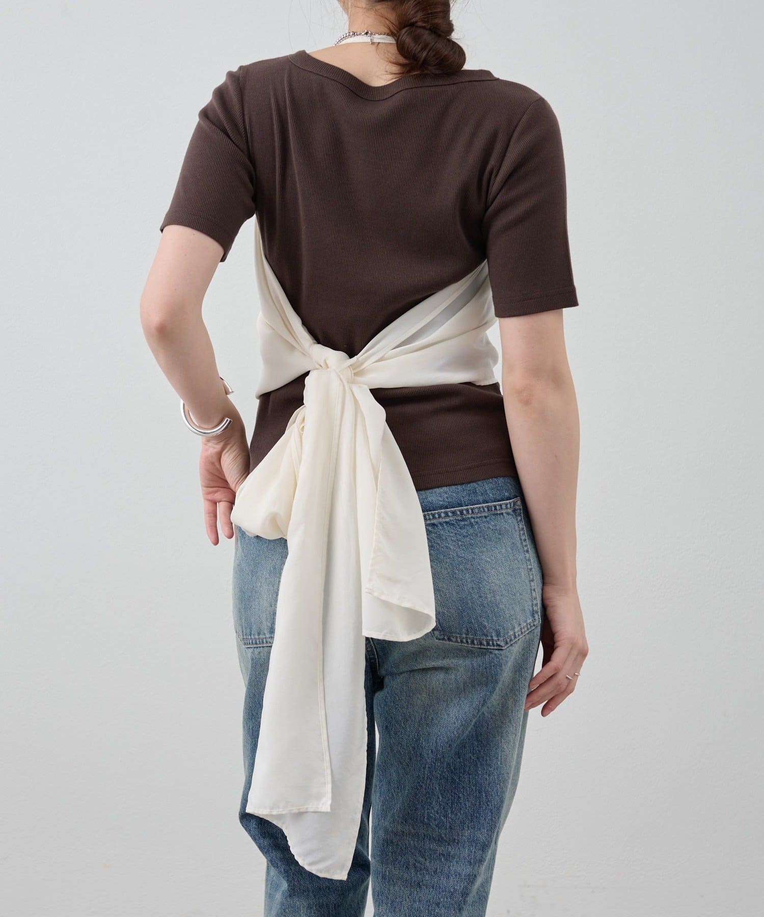 右肩だけストラップをかけて、自然なシワを寄せて後ろで結んだり、サイドで結んだり、ストールタイプのキャミソールです。