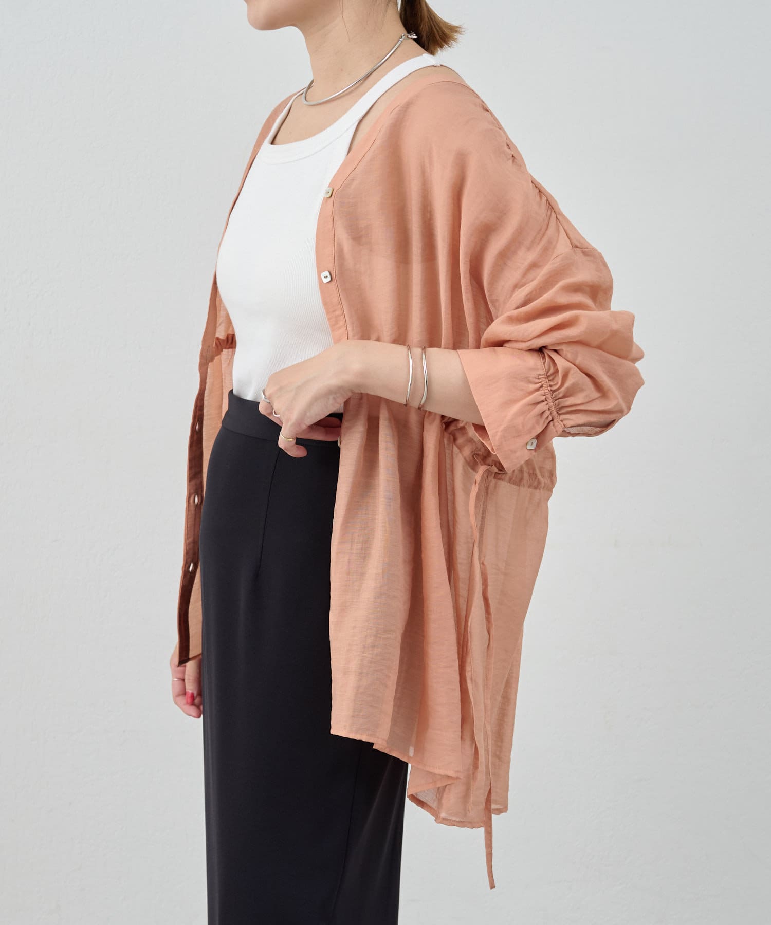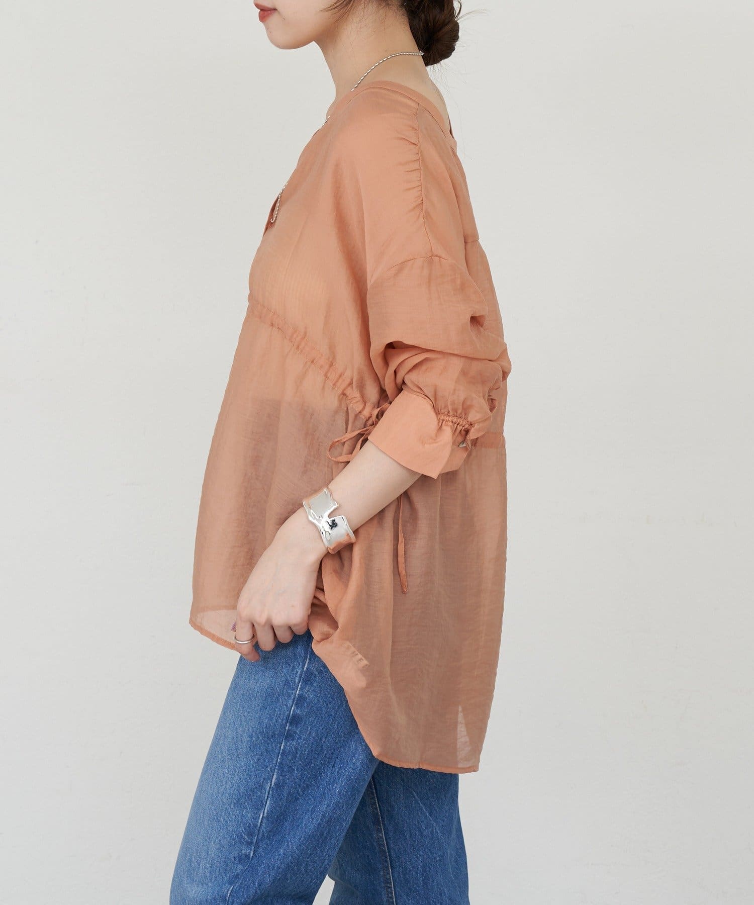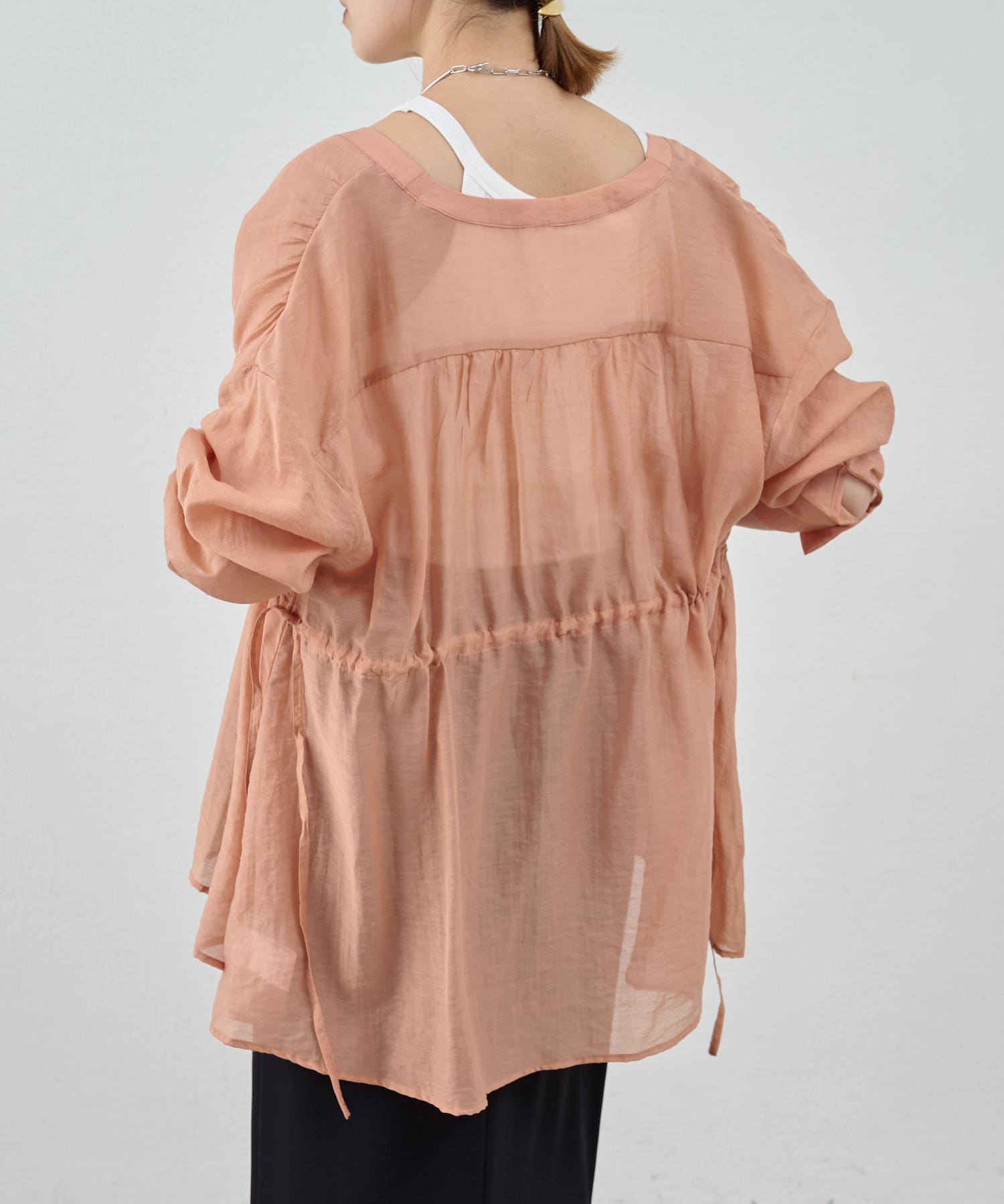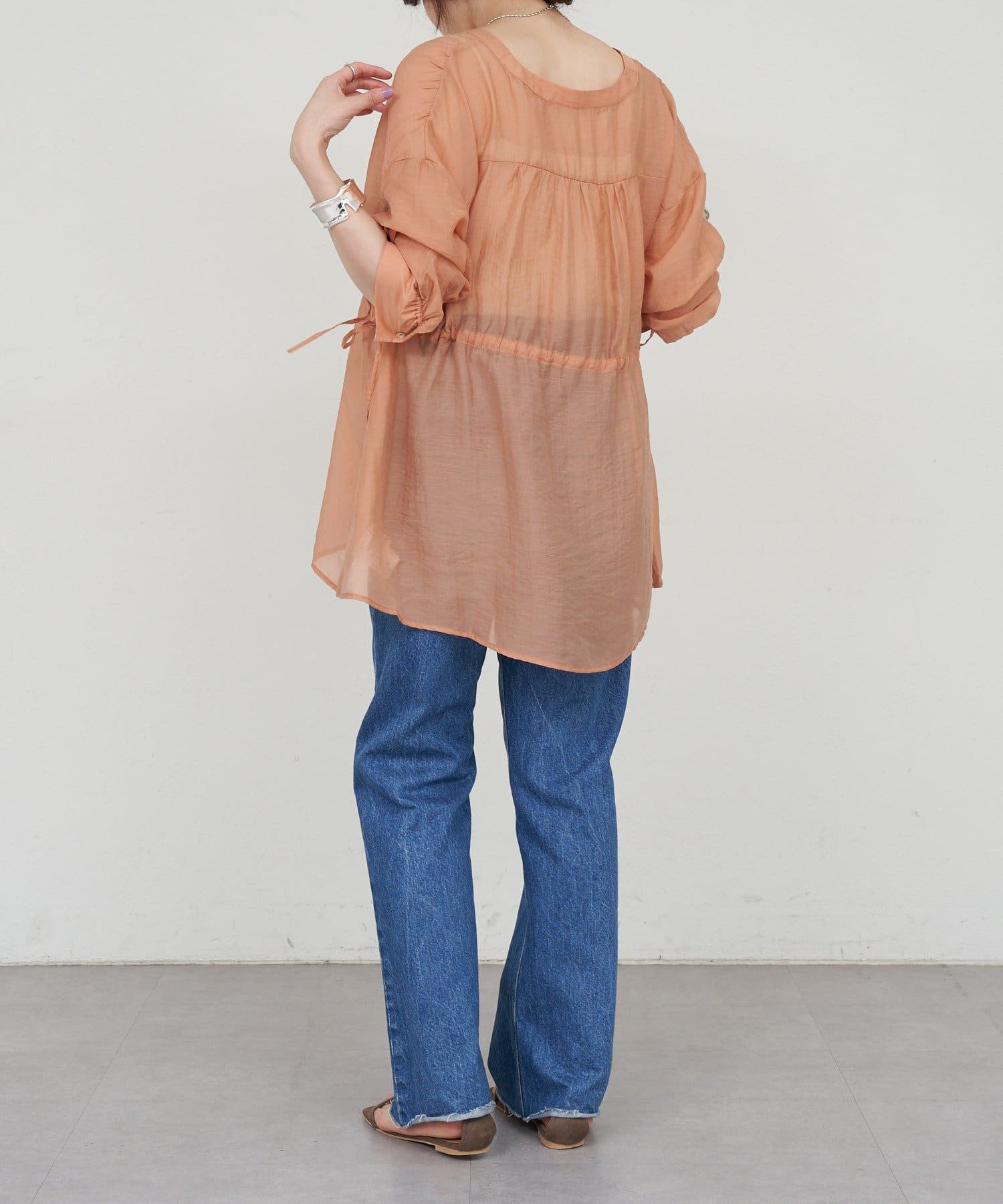 ・軽やかな印象のシアー素材が特徴的なトップス。