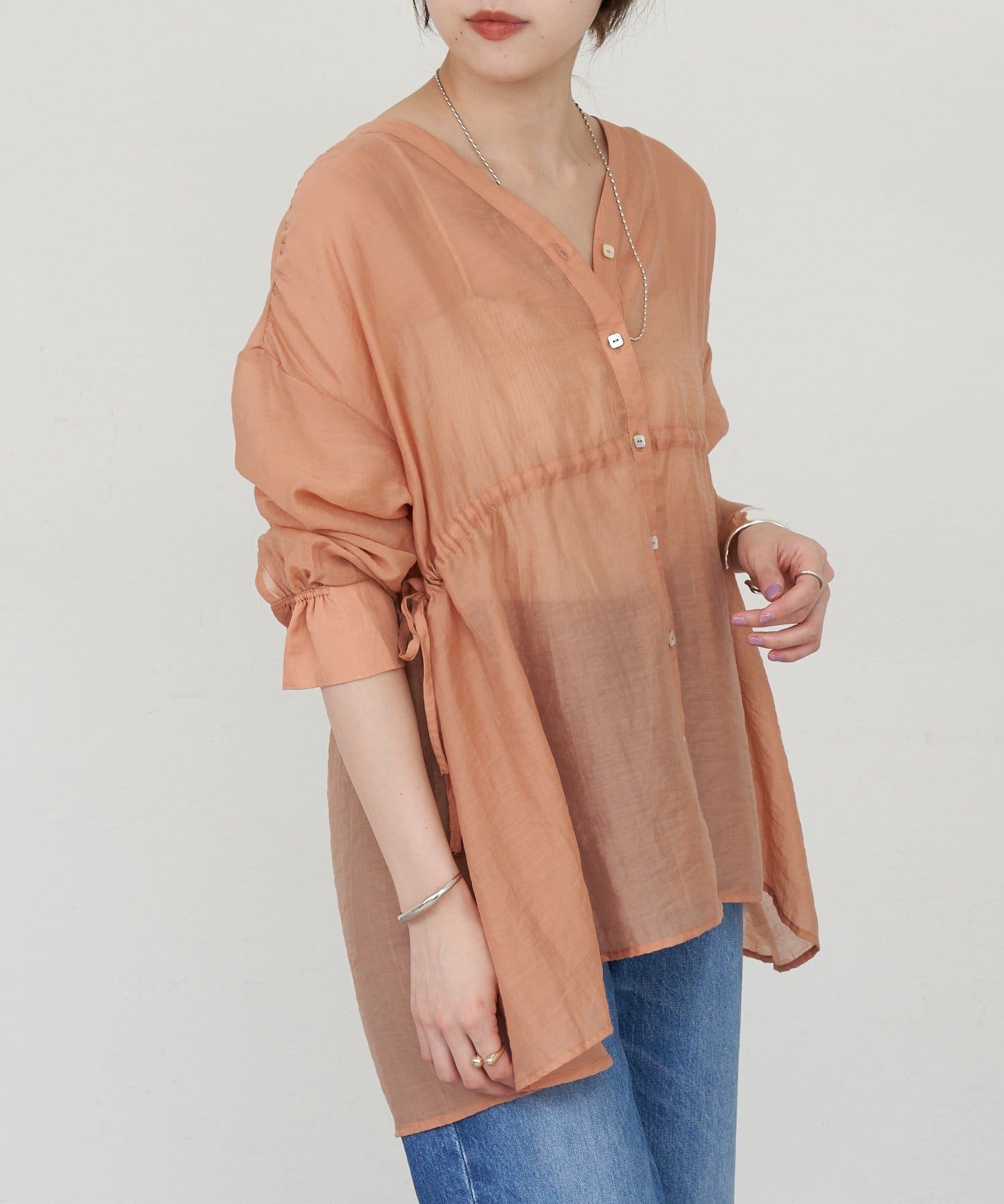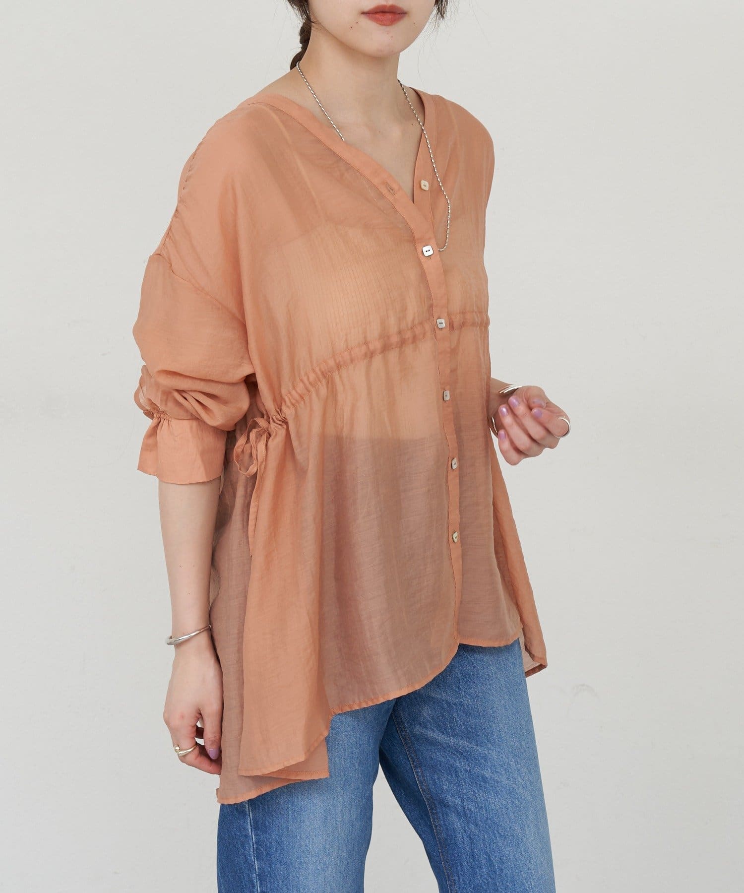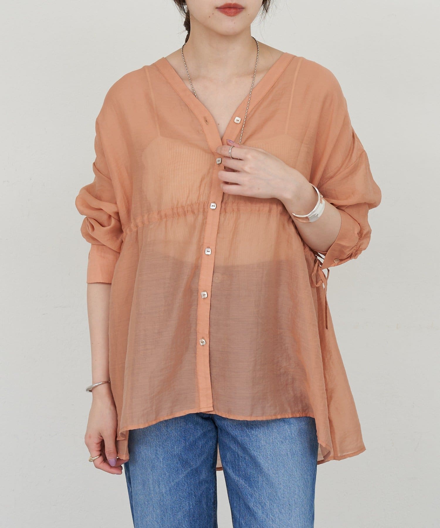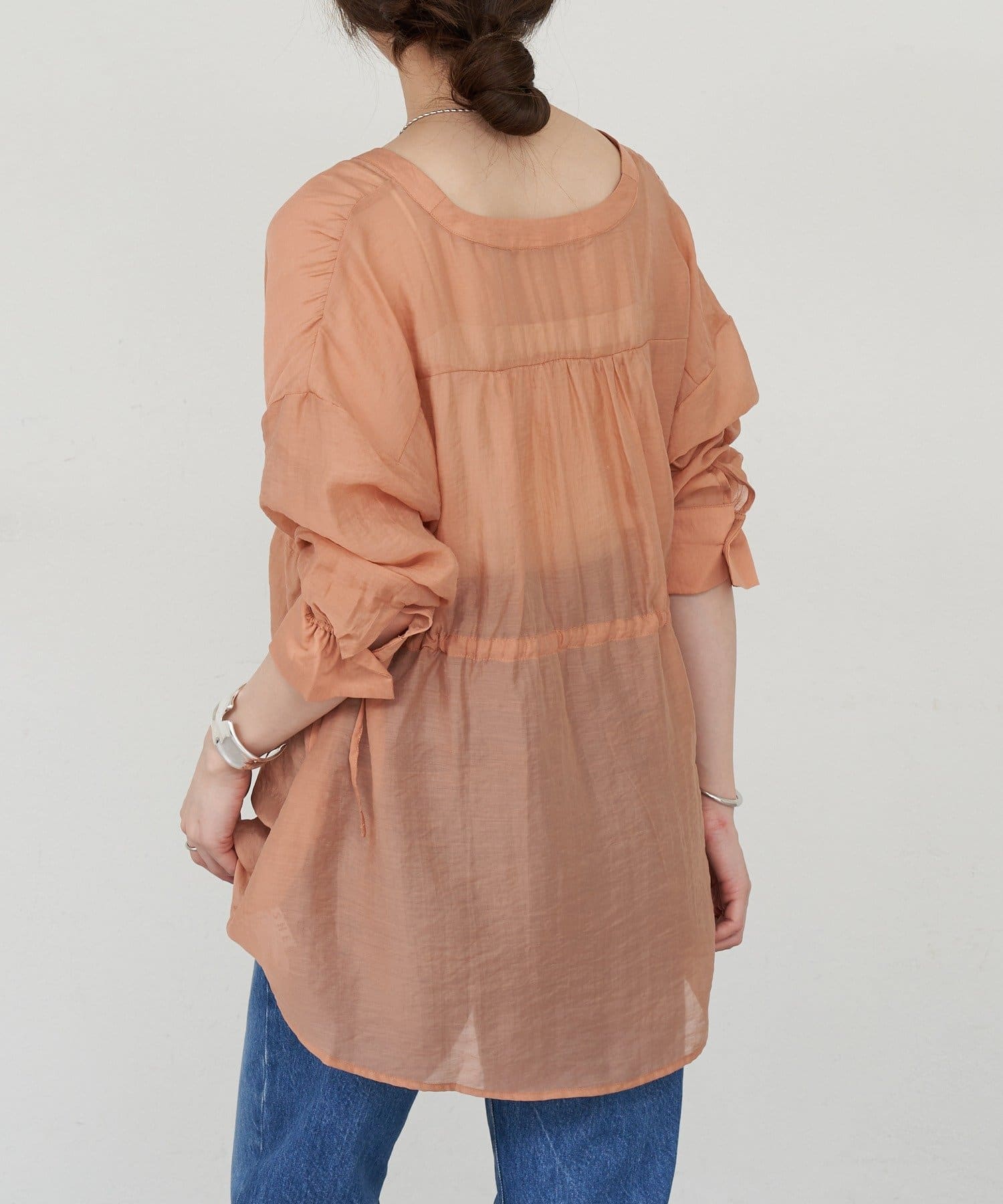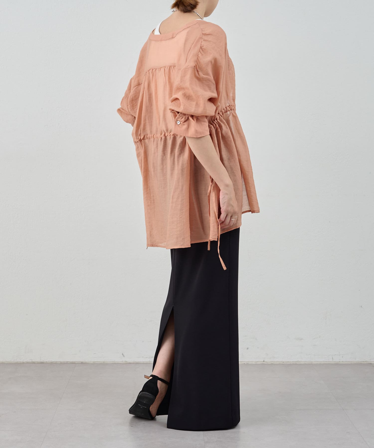 ・軽やかな印象のシアー素材が特徴的なトップス。