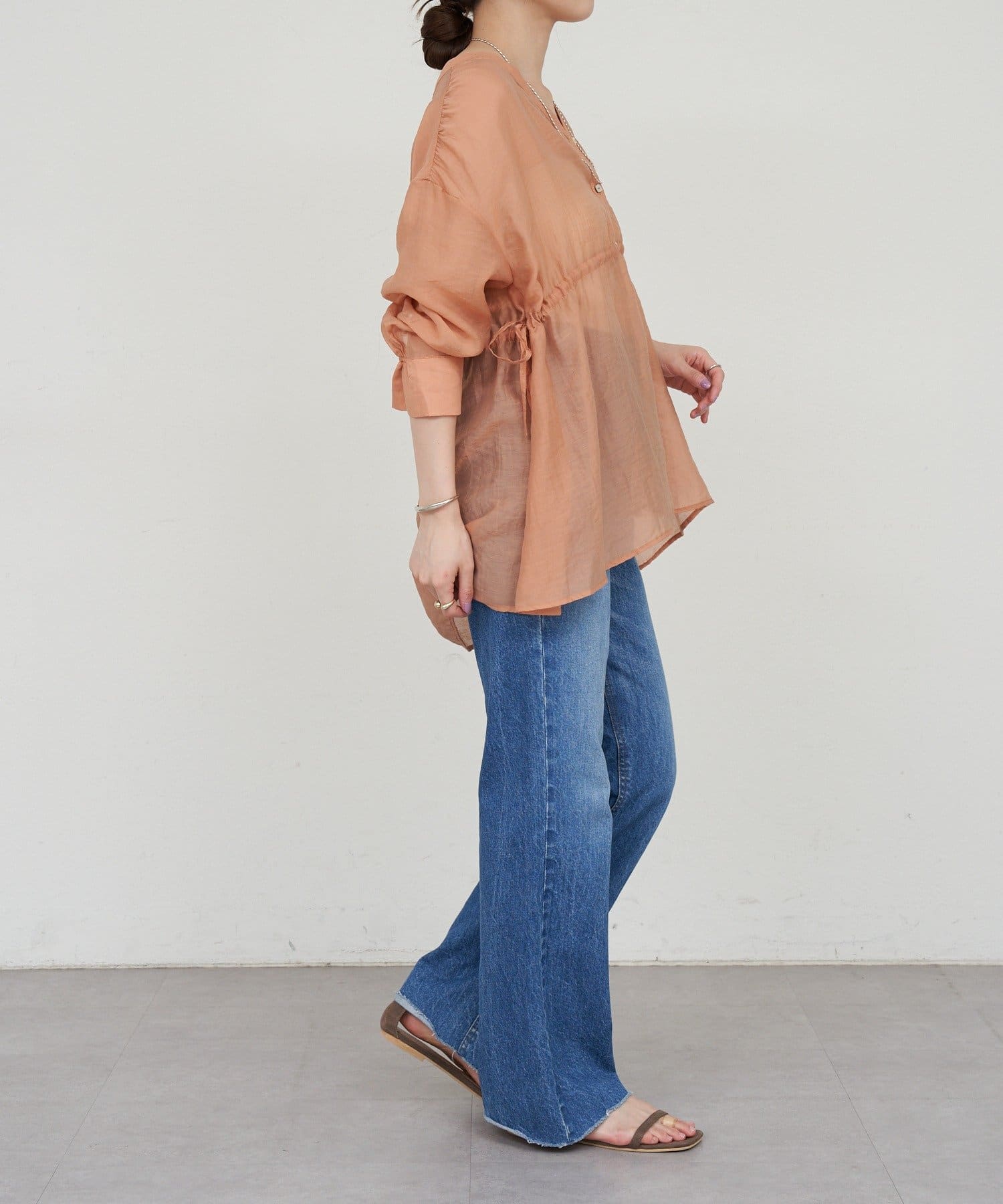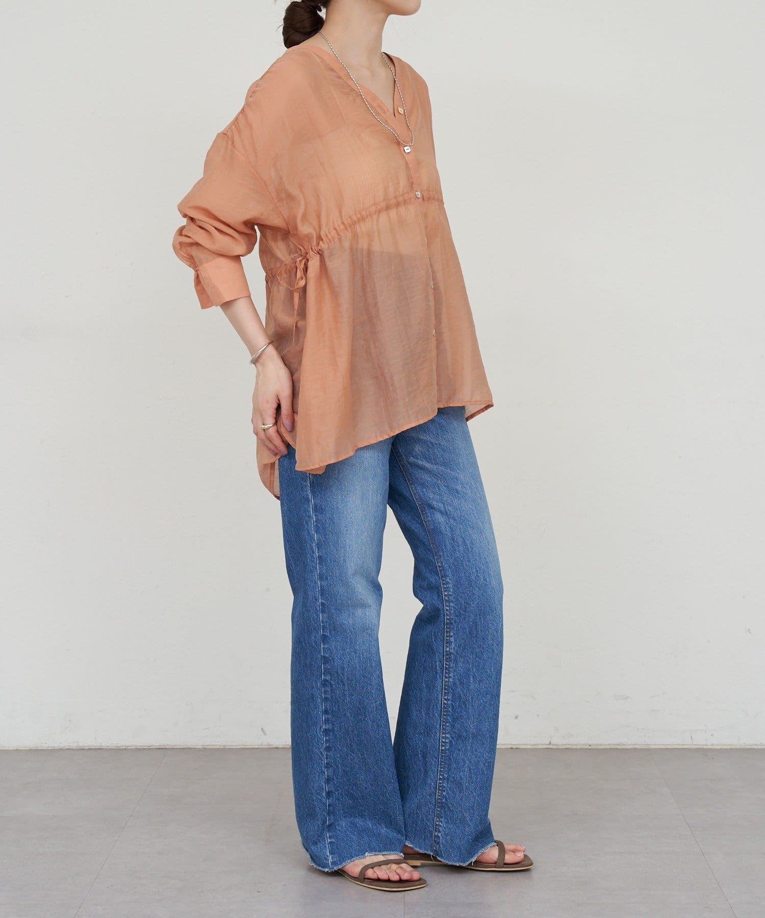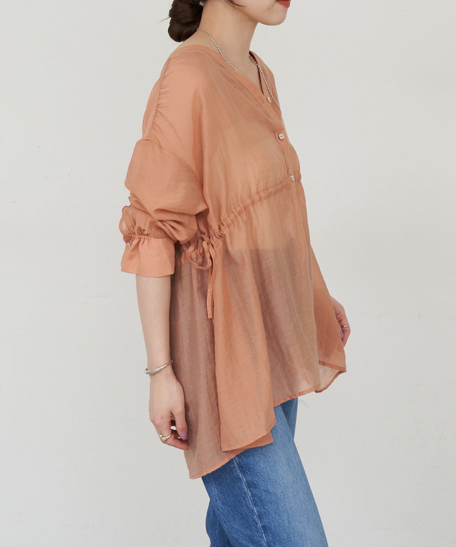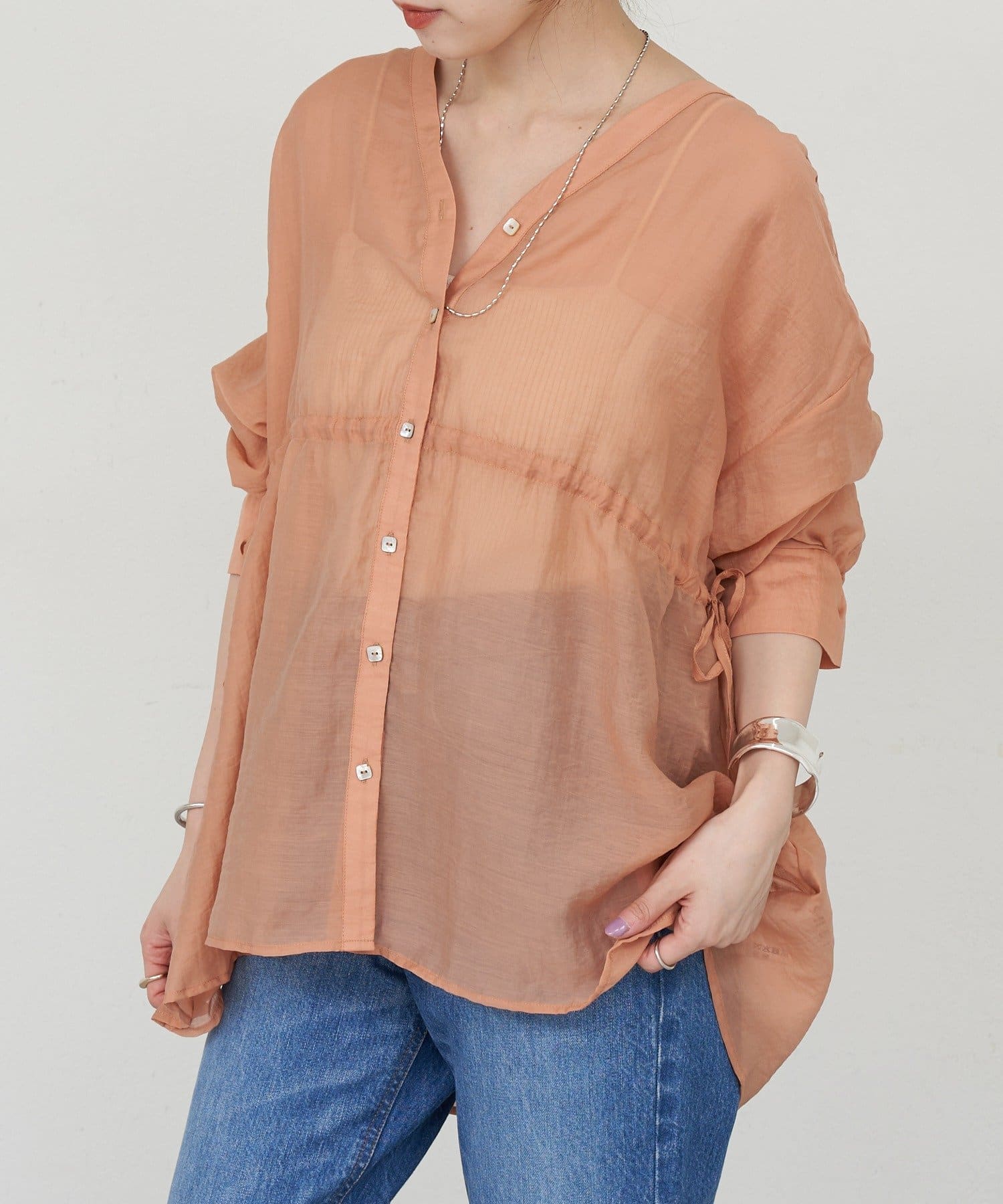 ・軽やかな印象のシアー素材が特徴的なトップス。