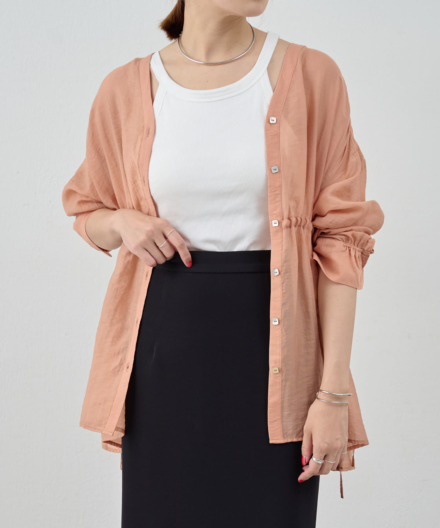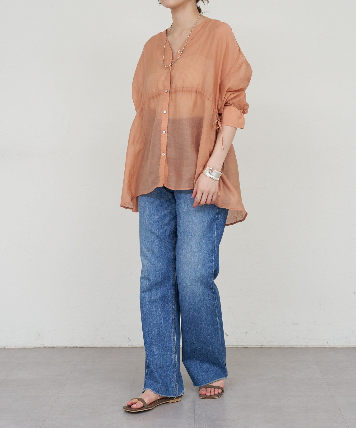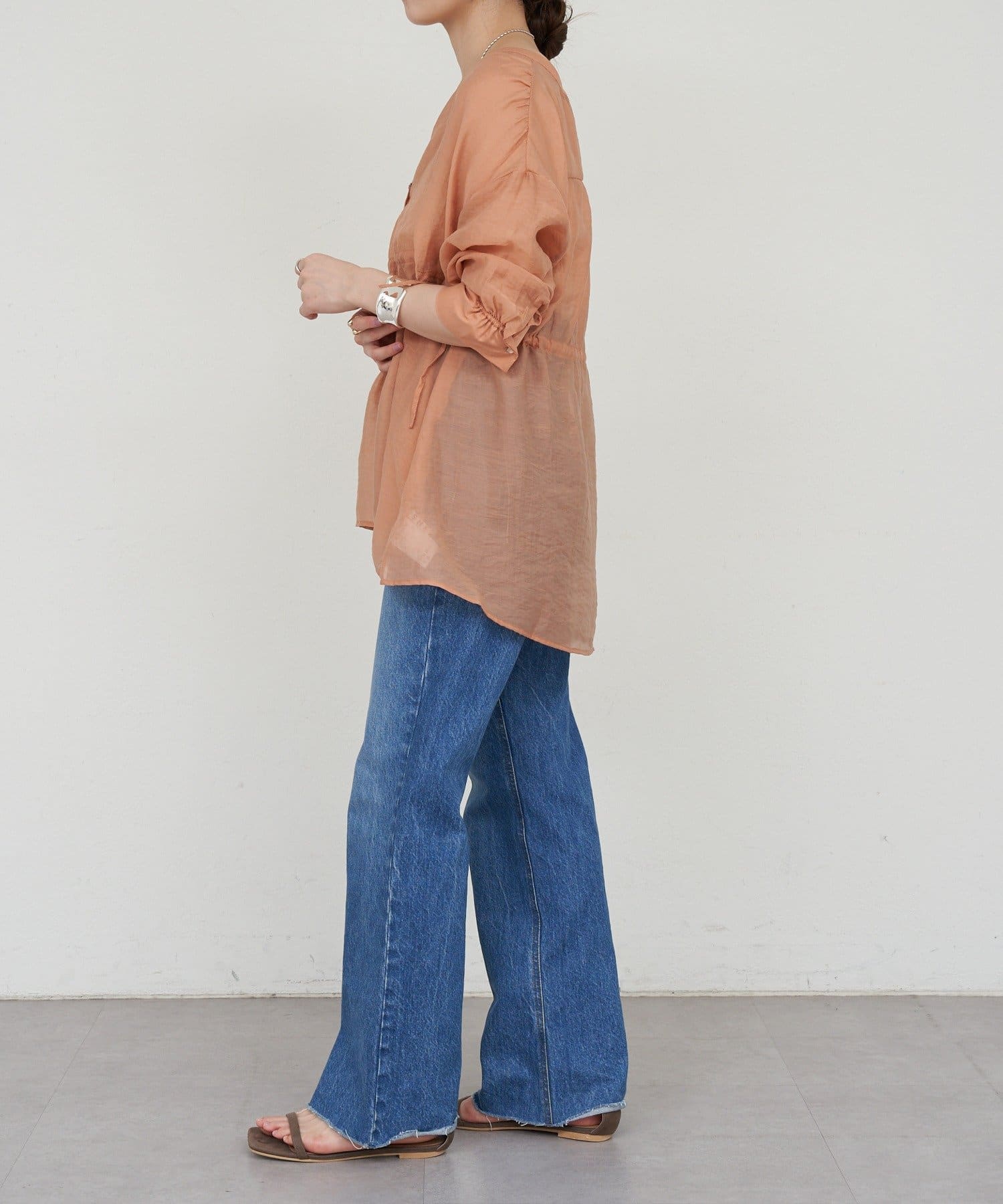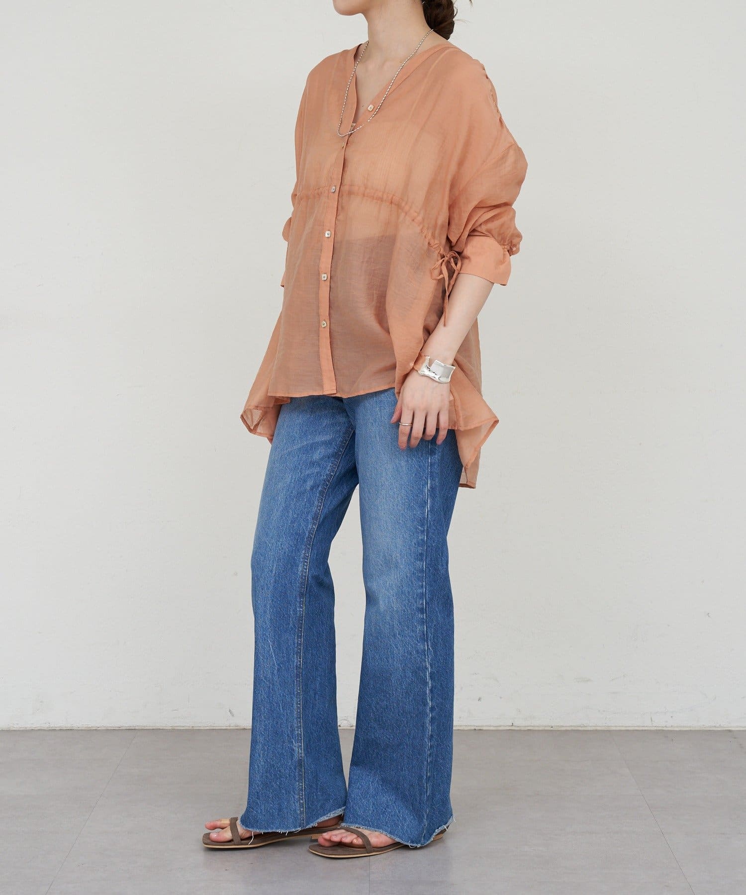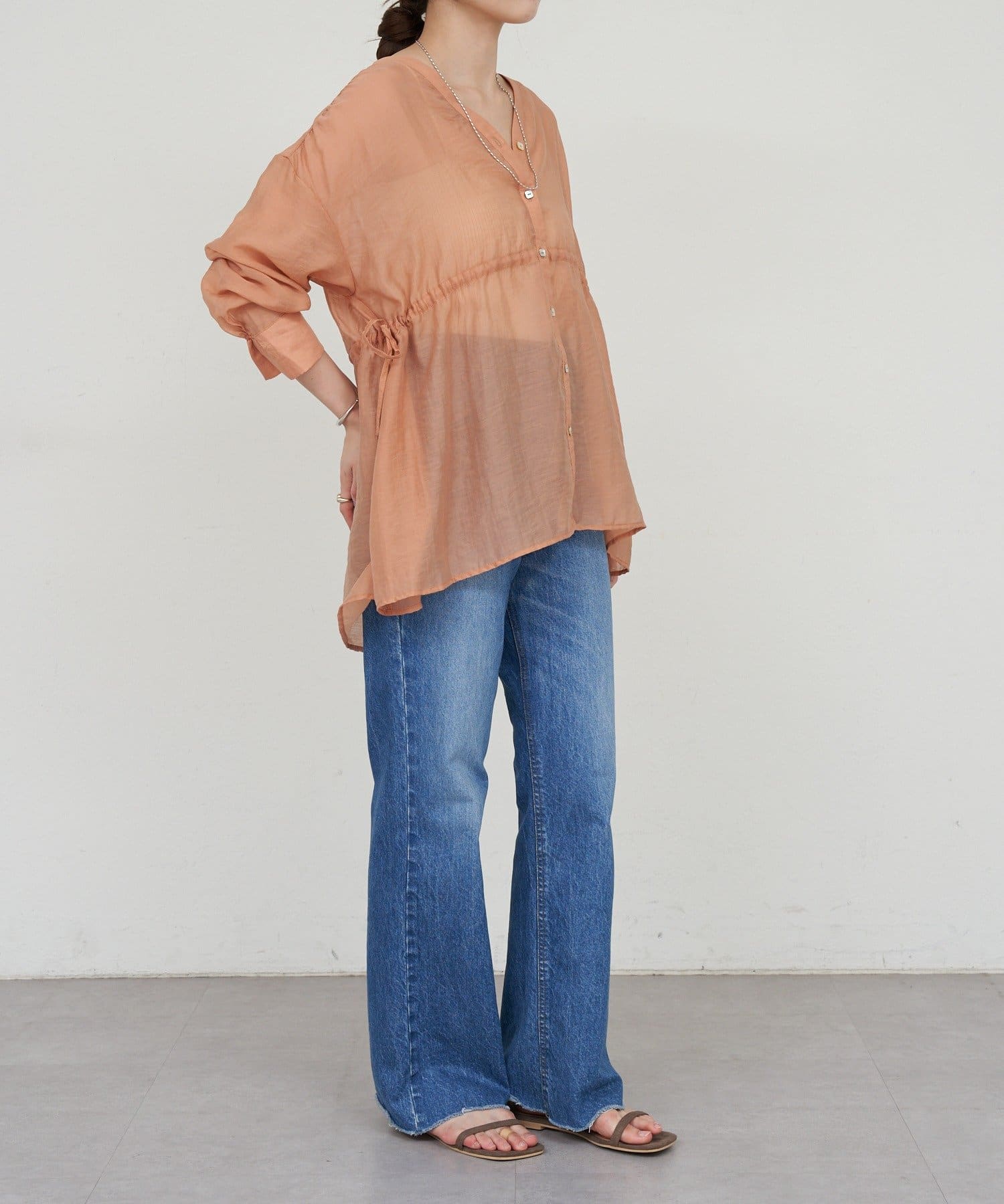 ・軽やかな印象のシアー素材が特徴的なトップス。