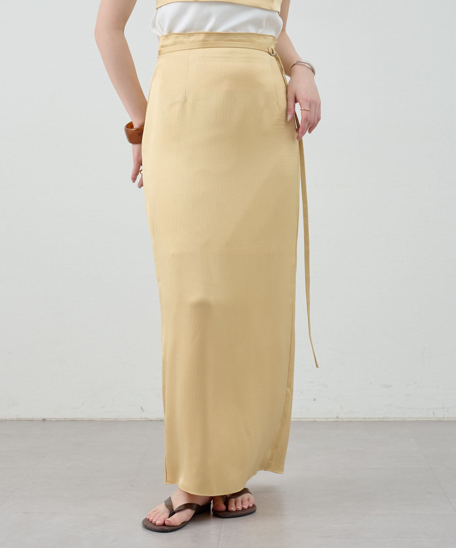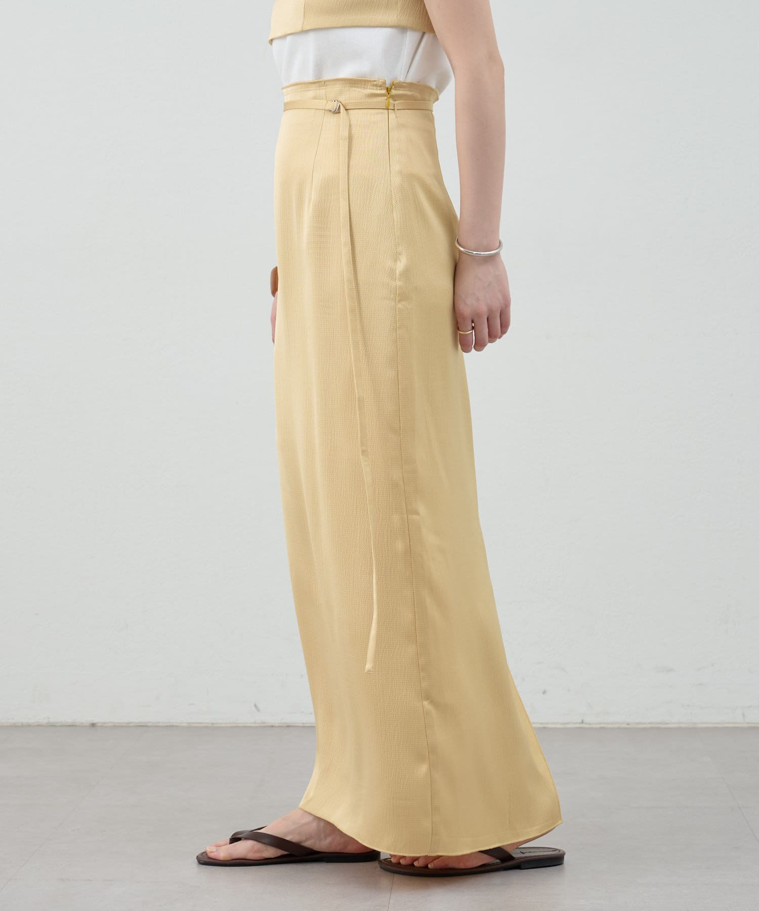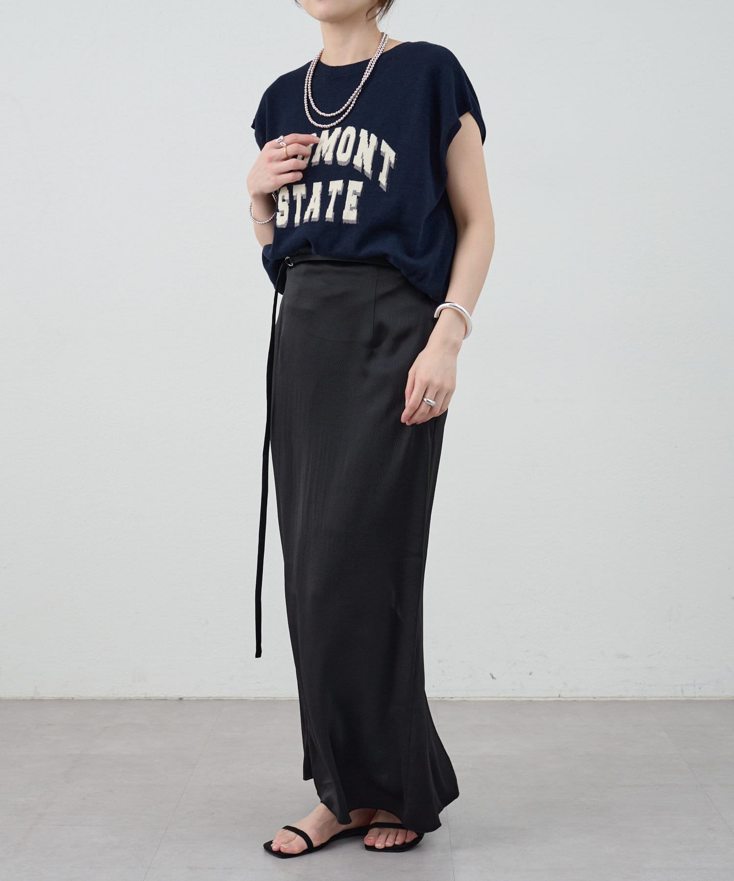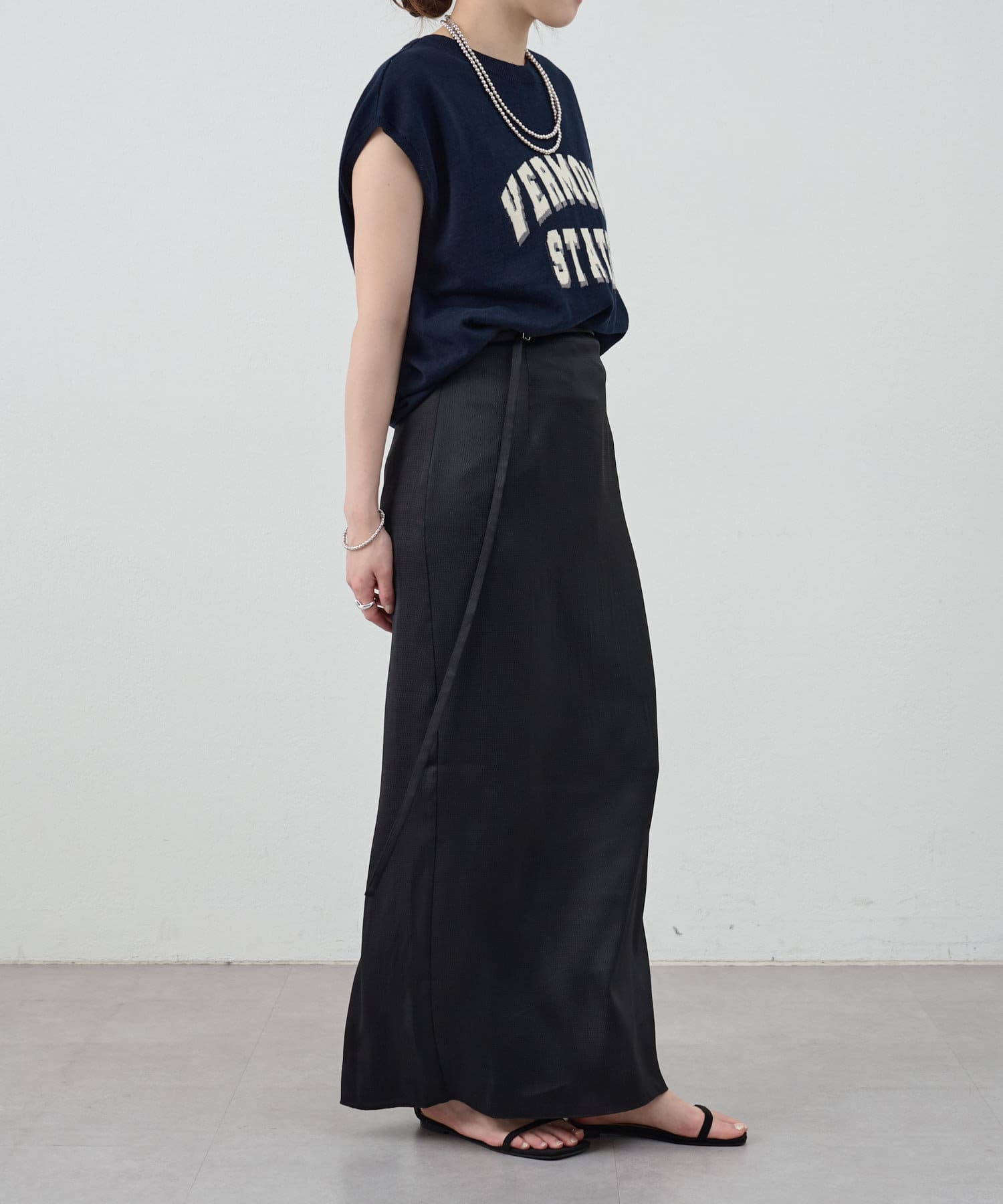 一年中、スタイリングが楽しめるサテンスカート。