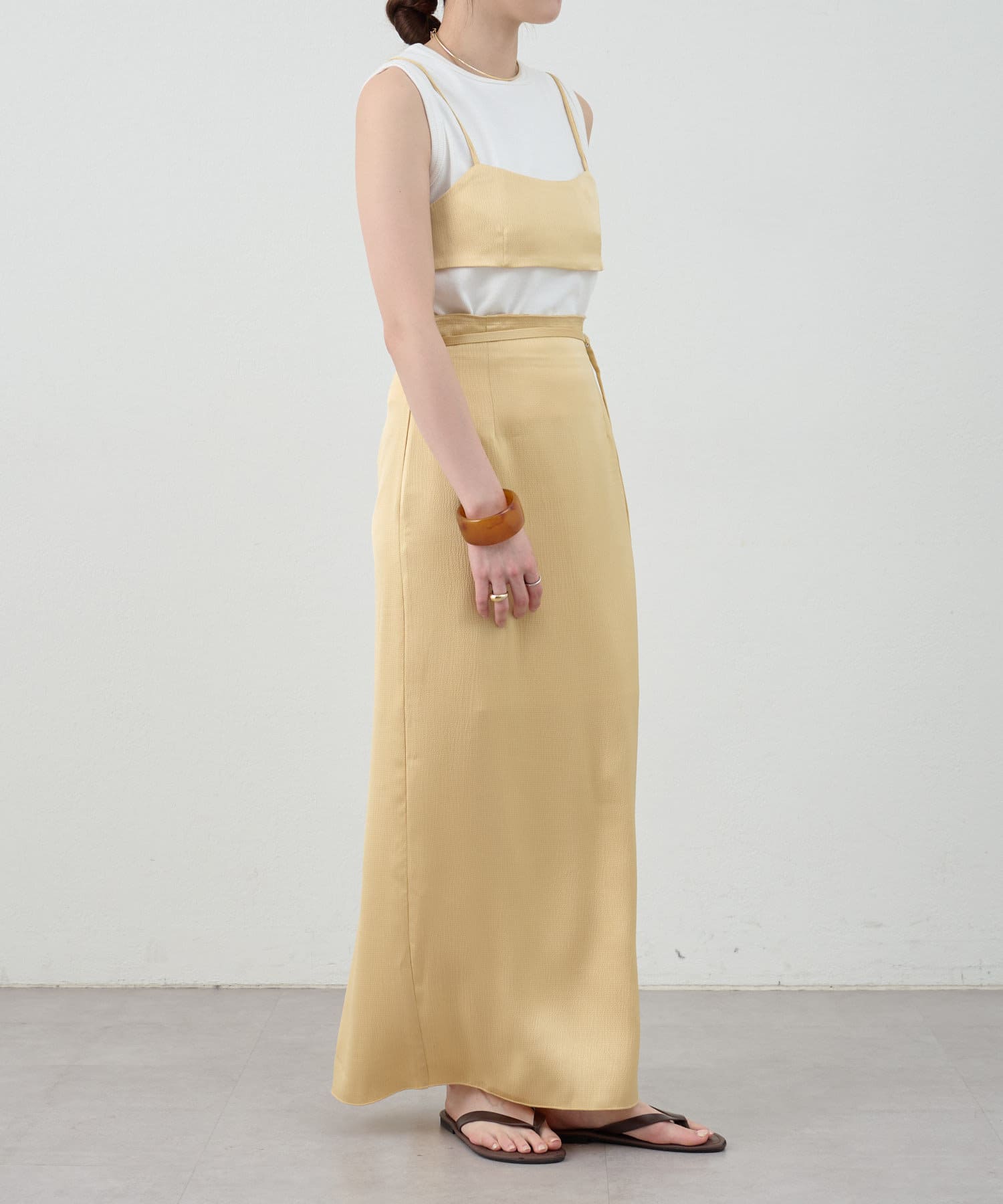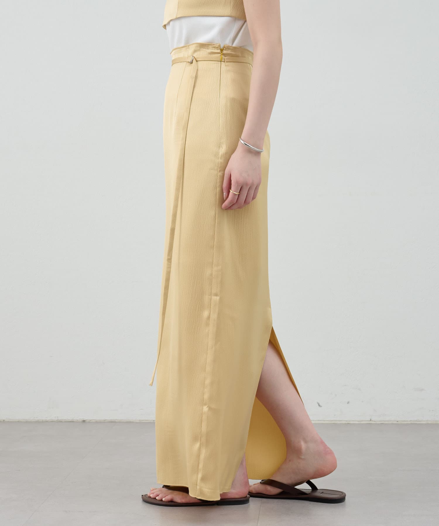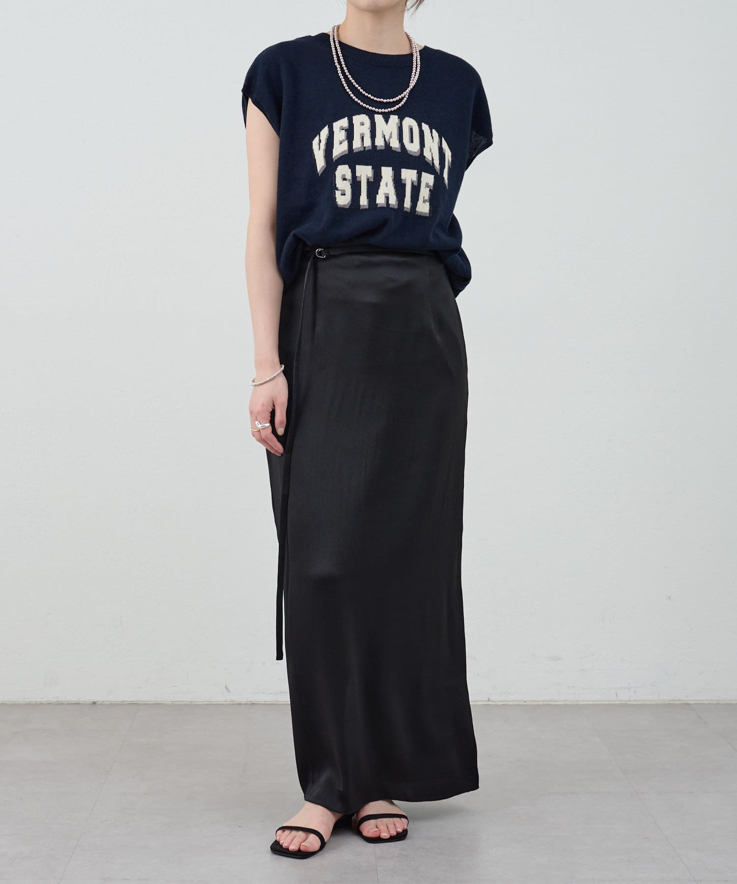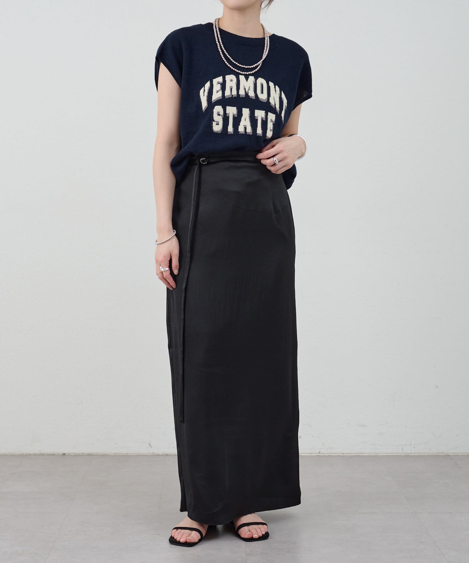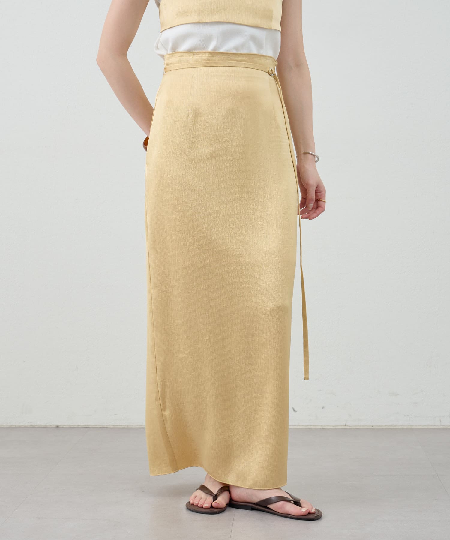一年中、スタイリングが楽しめるサテンスカート。