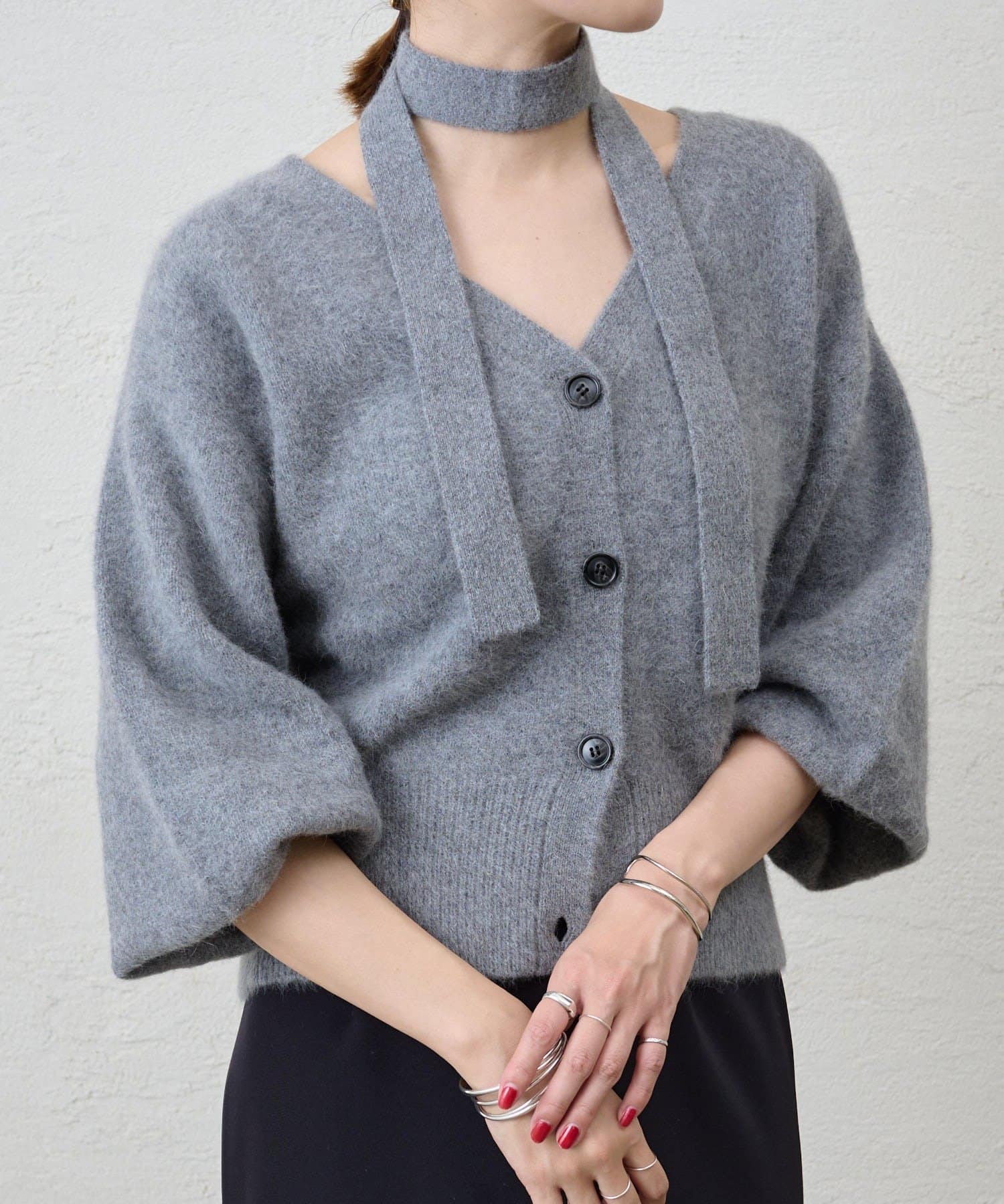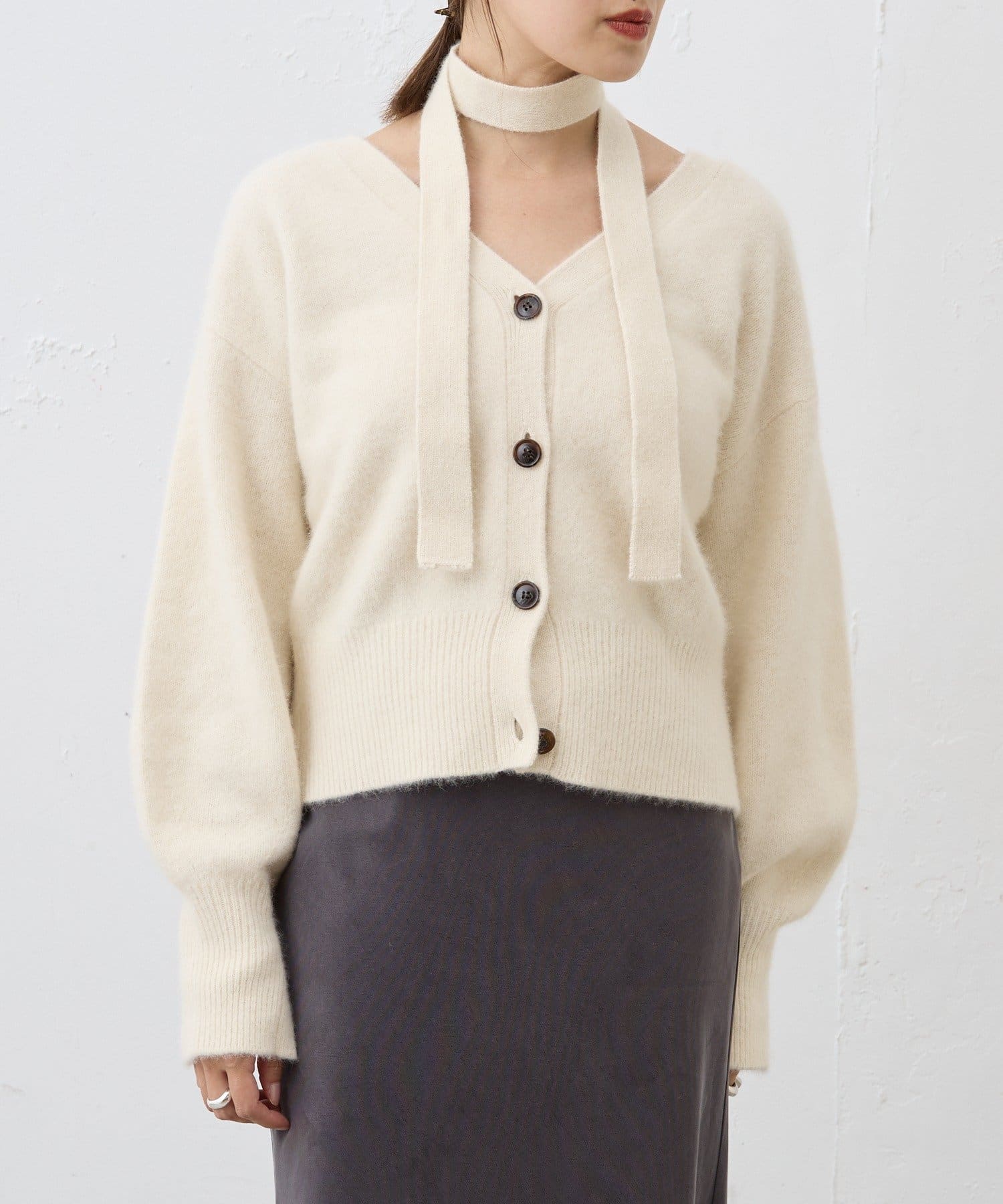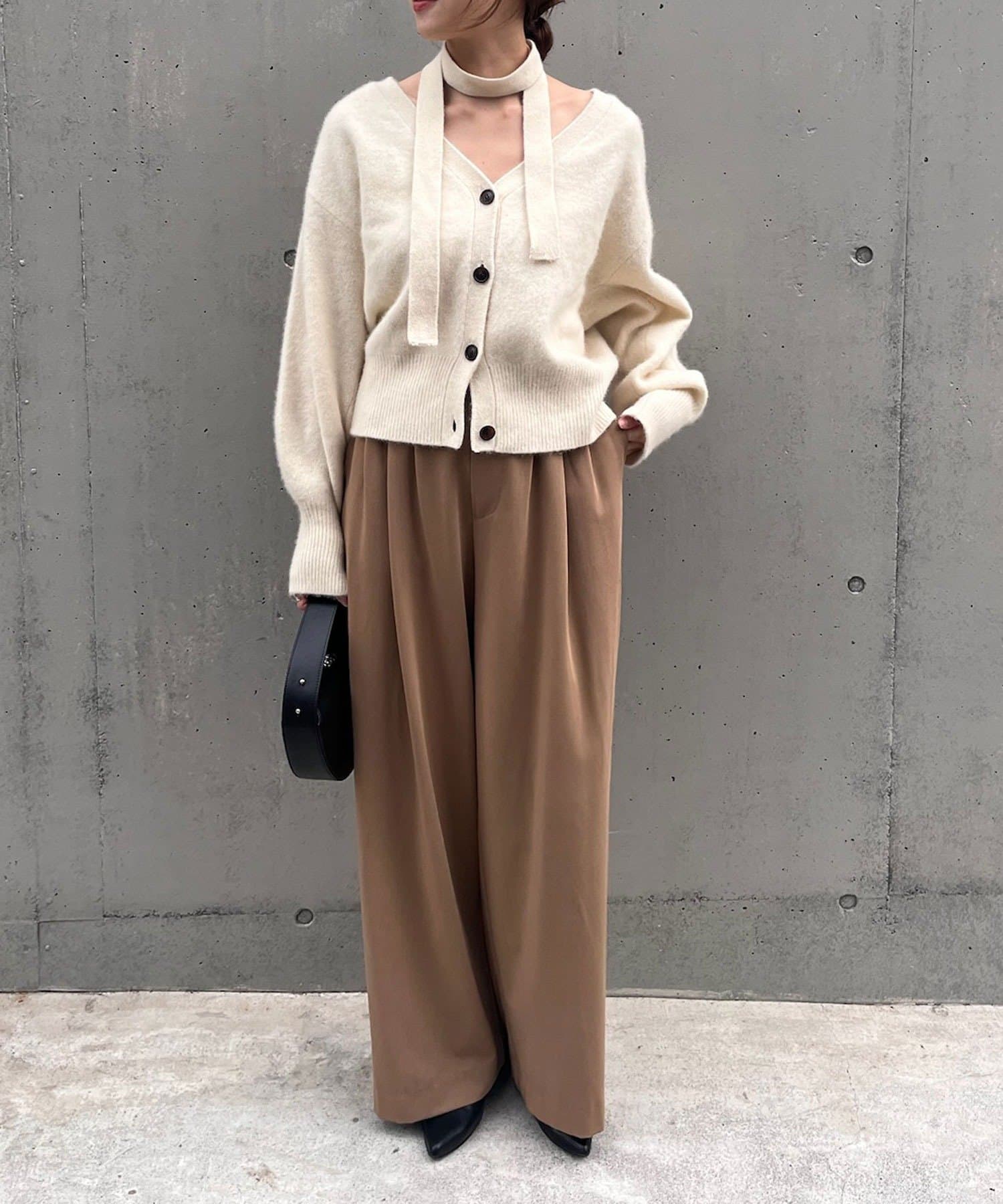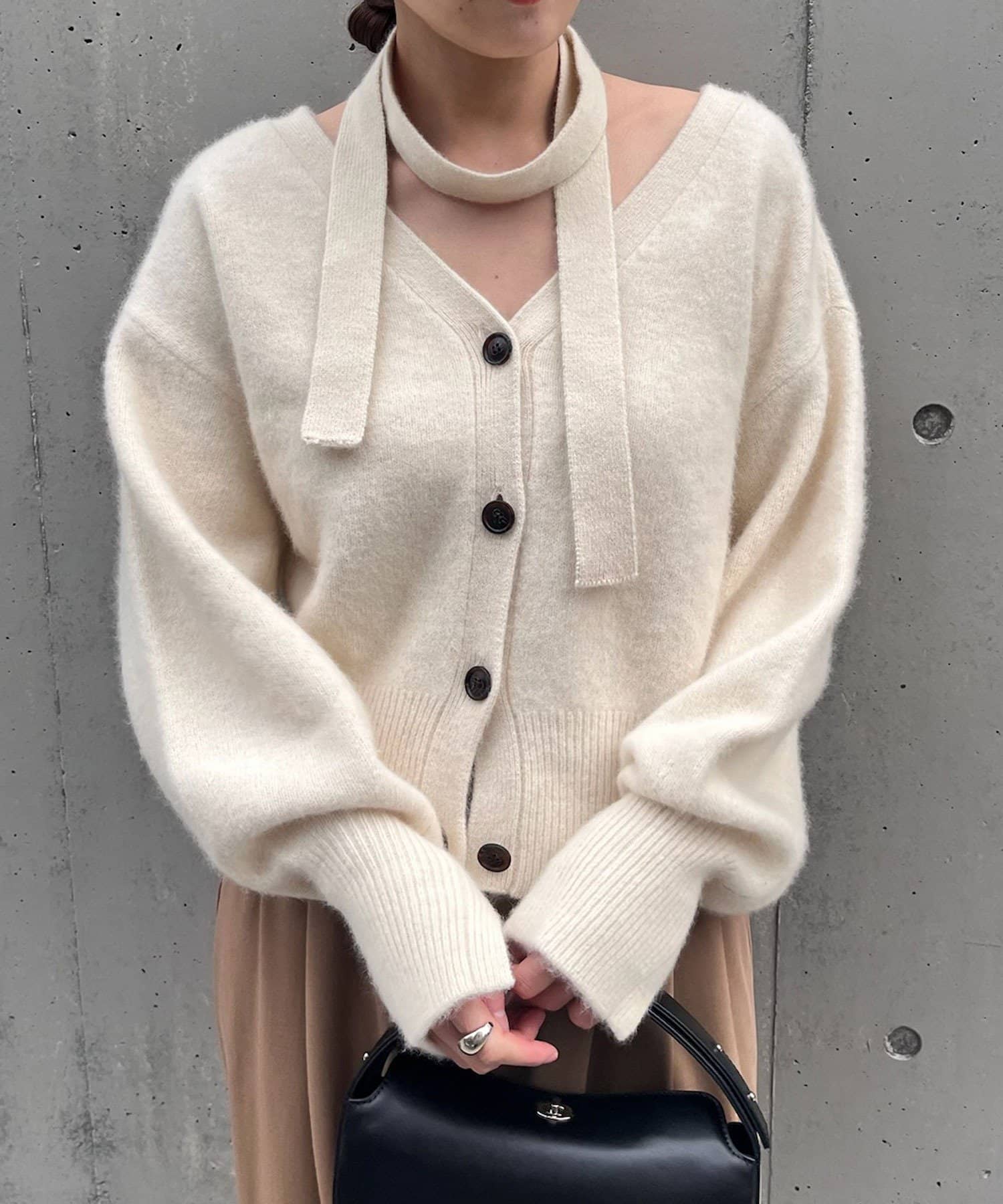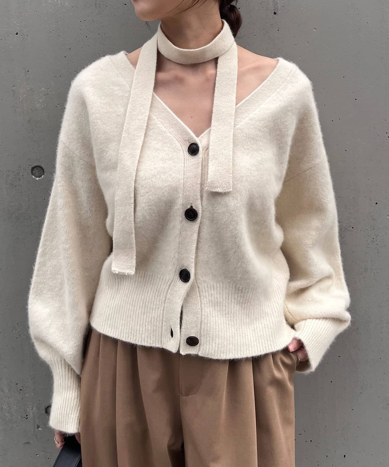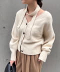 毎年人気のカーディガンは今年はトレンド感を出すためにタイ付きにしています。