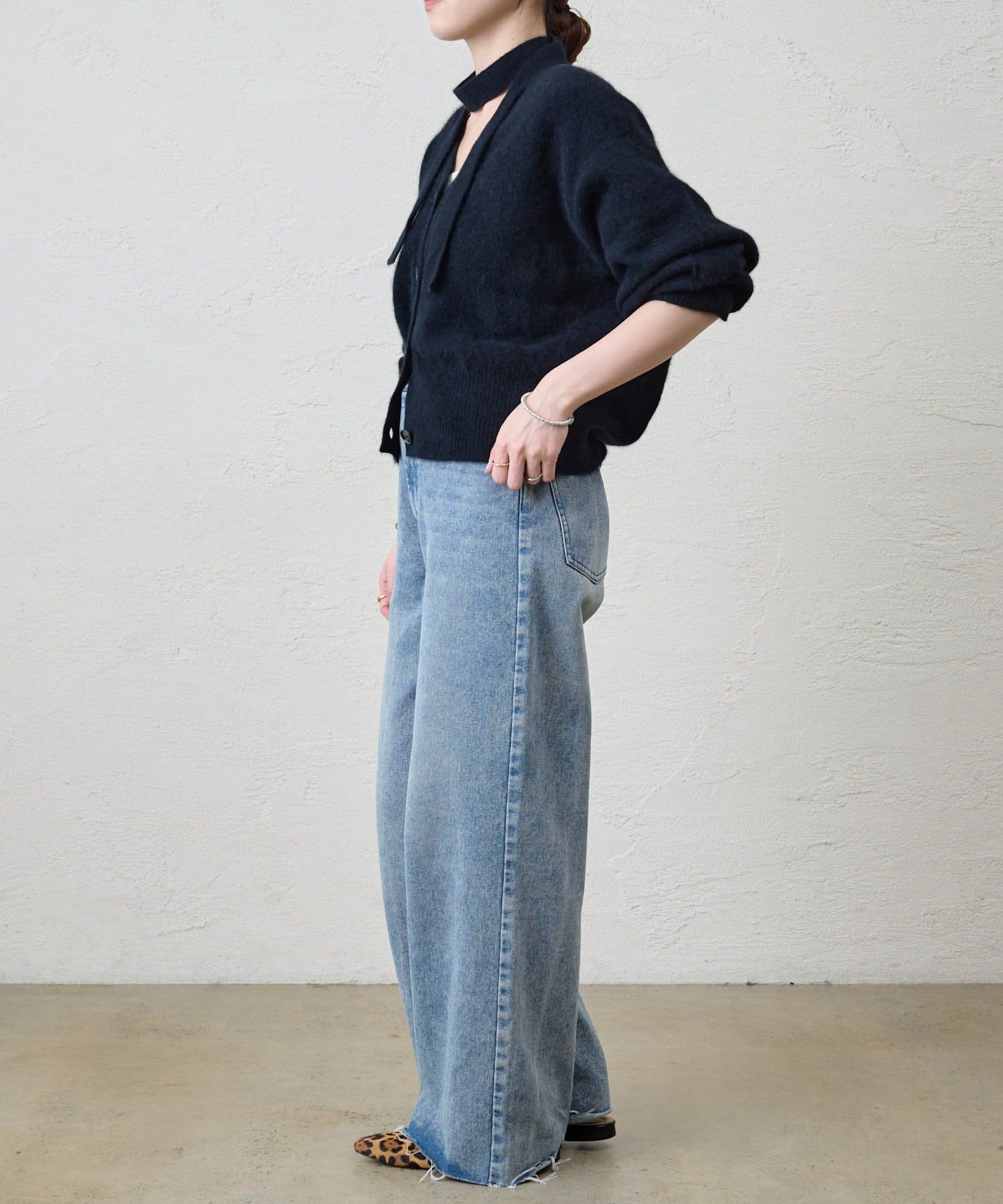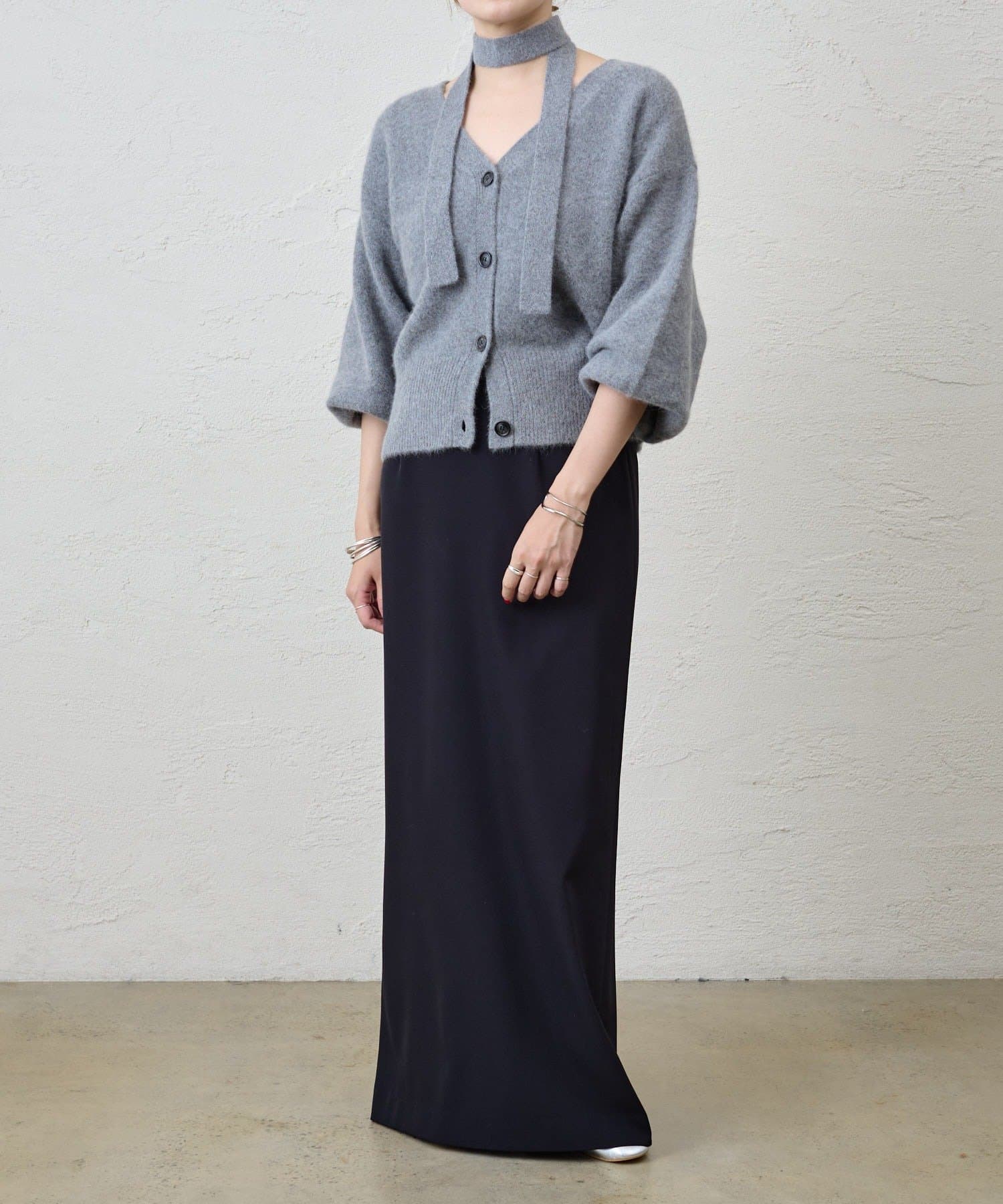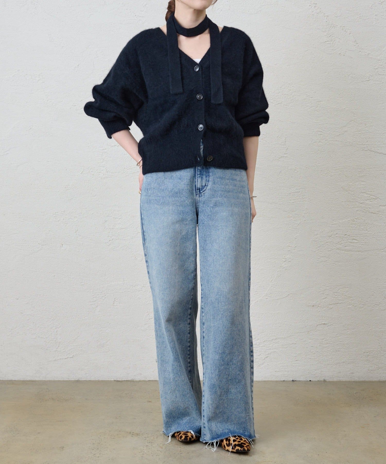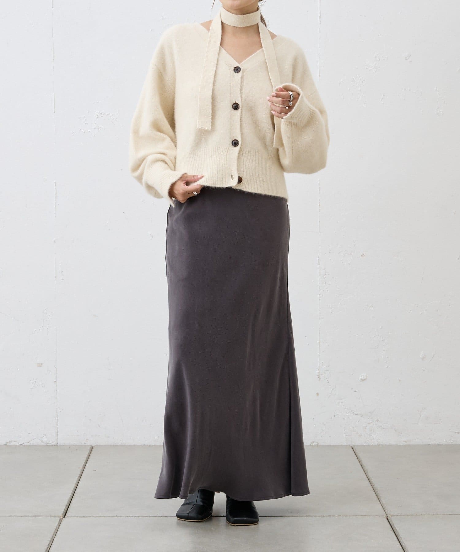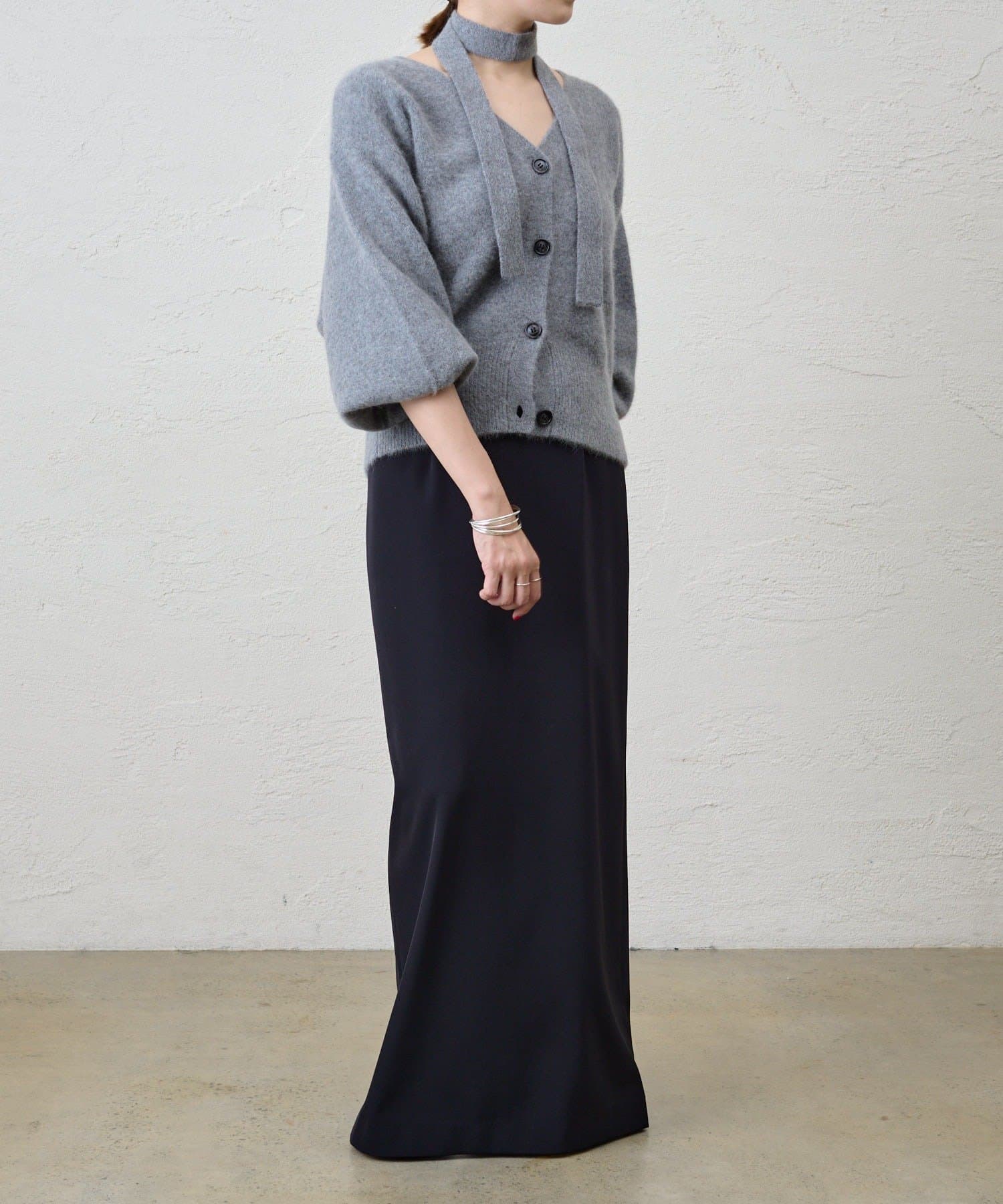毎年人気のカーディガンは今年はトレンド感を出すためにタイ付きにしています。