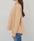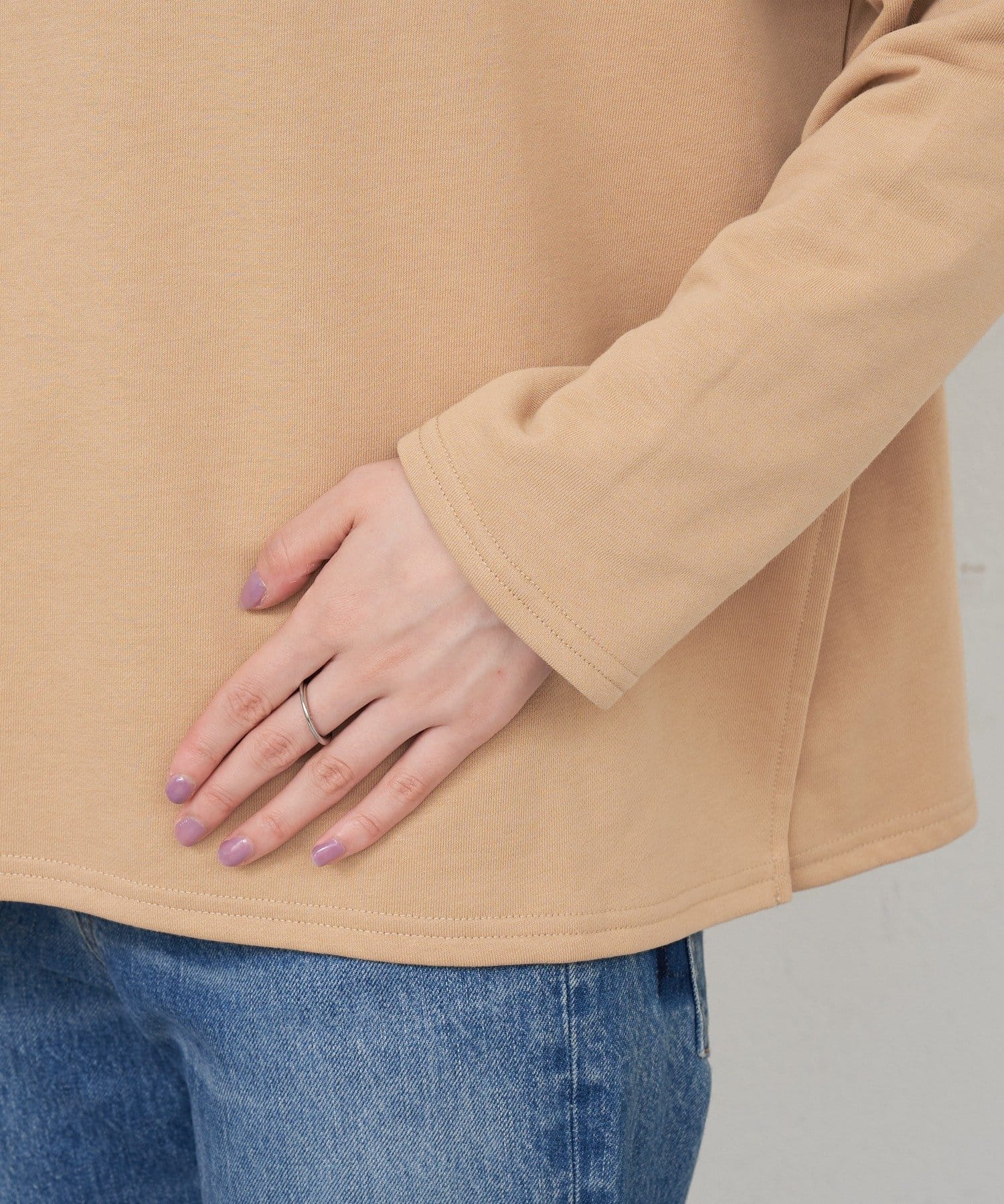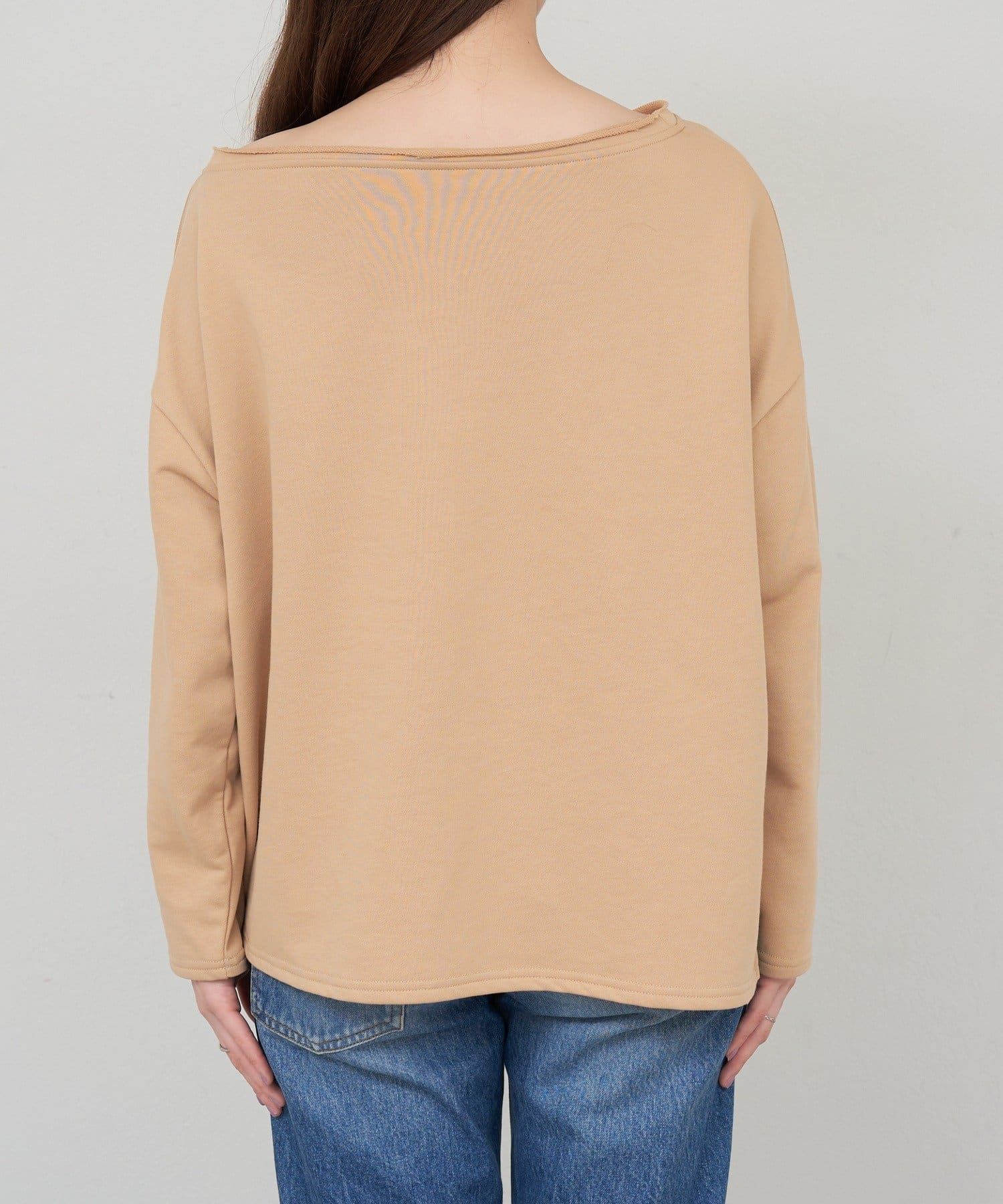 秋の初めにちょうどよい薄手の生地のスウェットで、オフショルにしても、しなくても着れるし、スリットがあるのでインもしやすい。