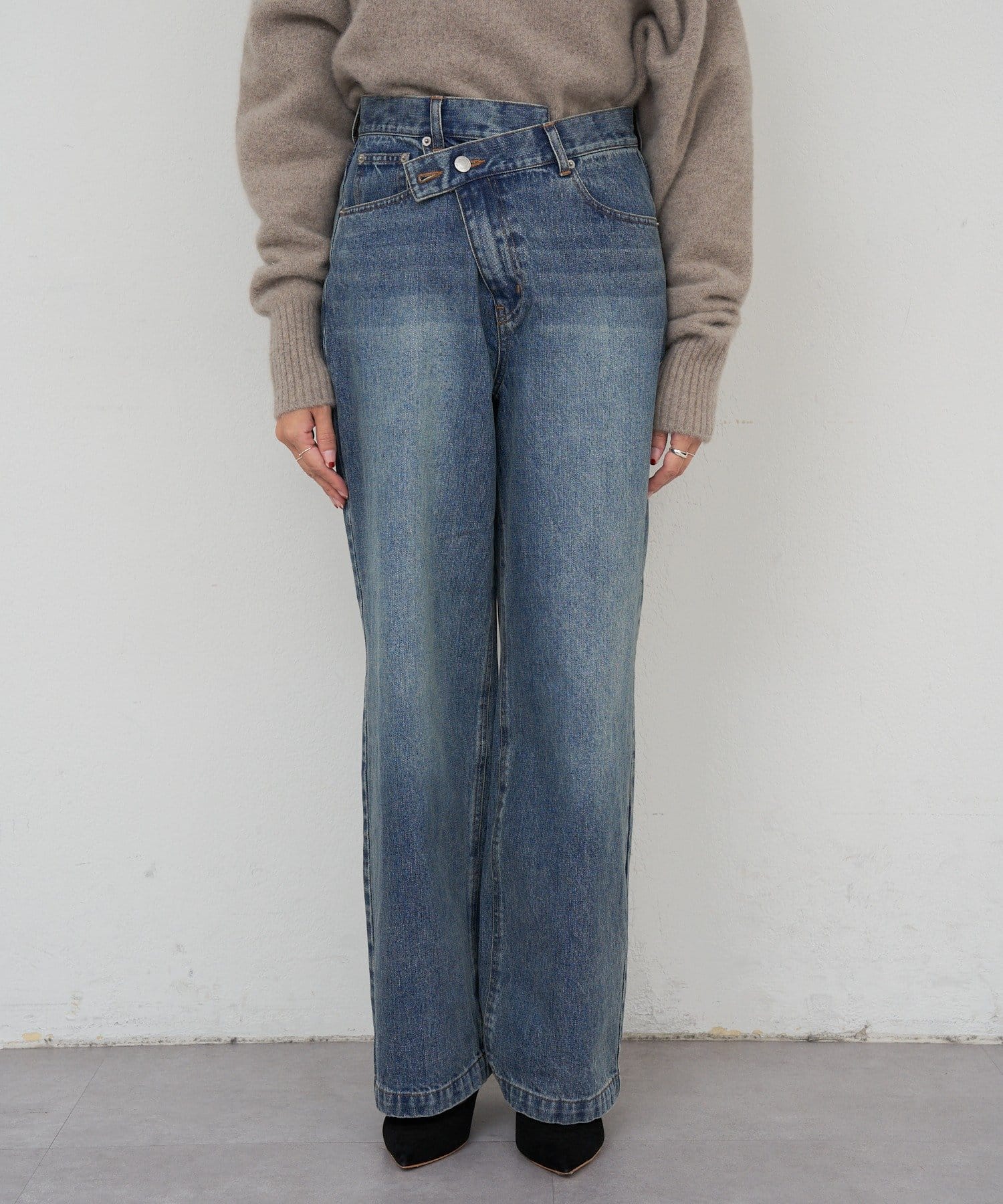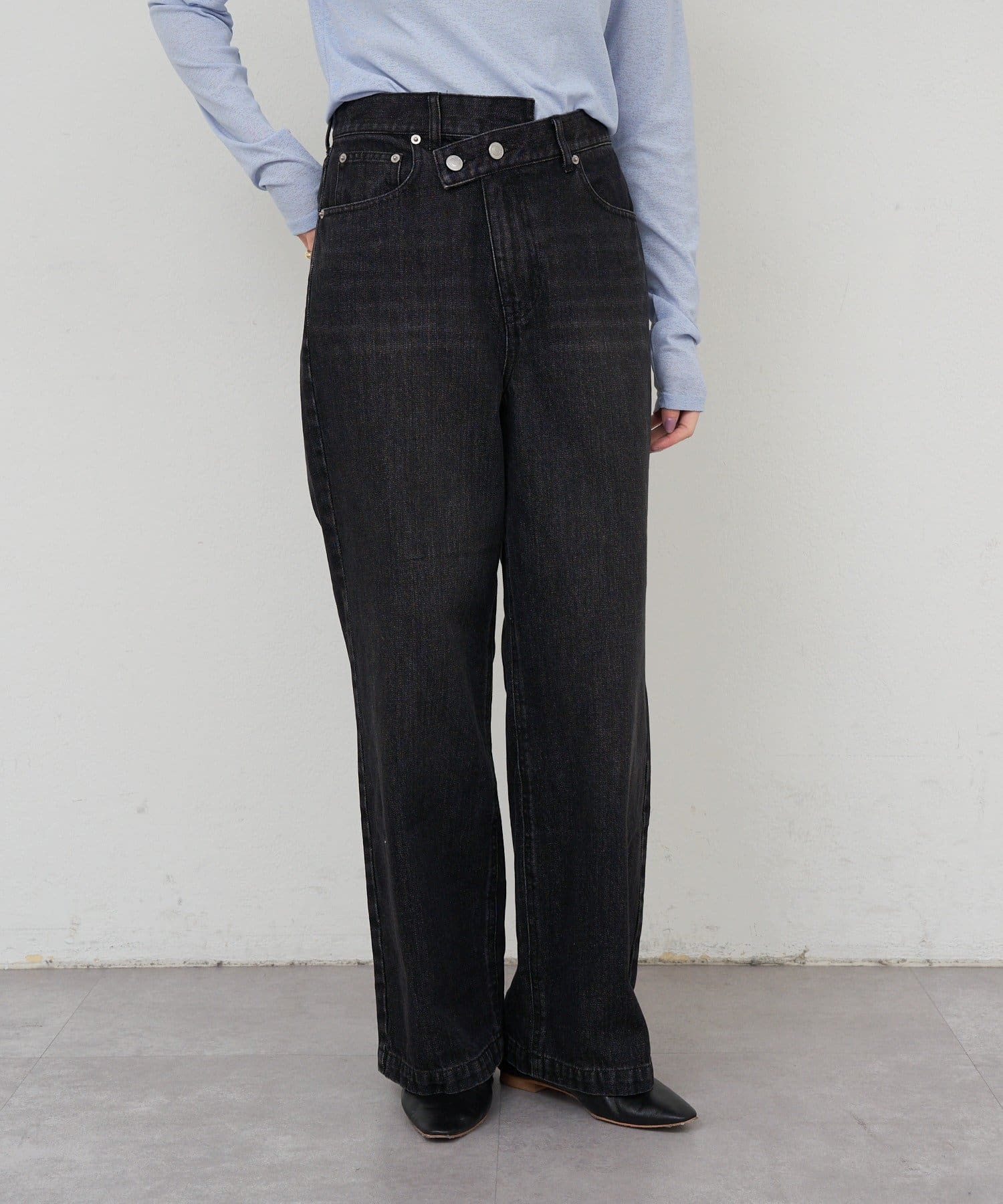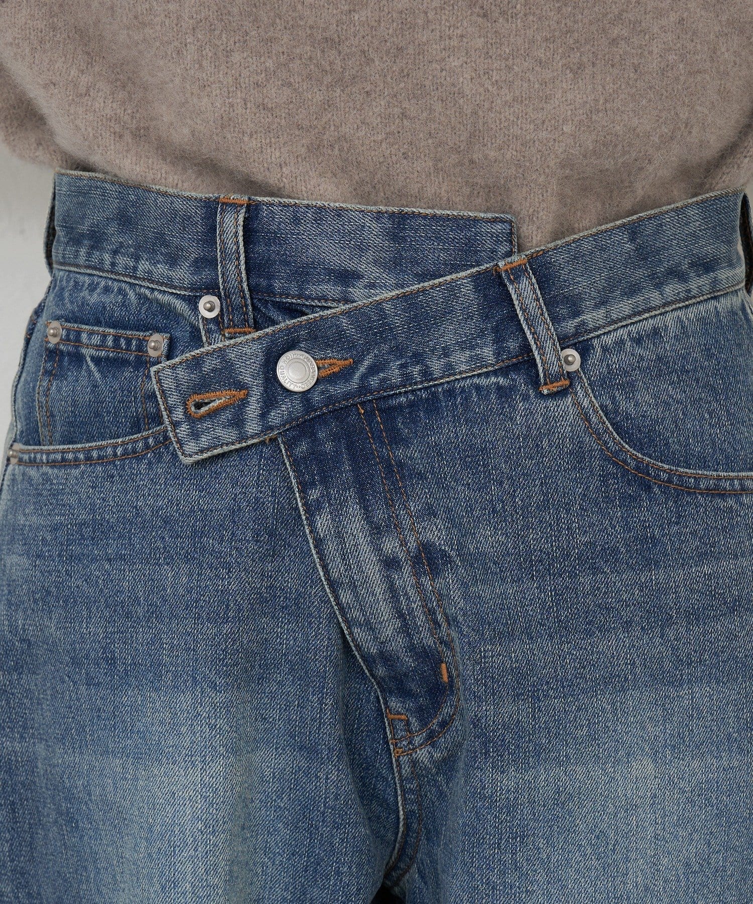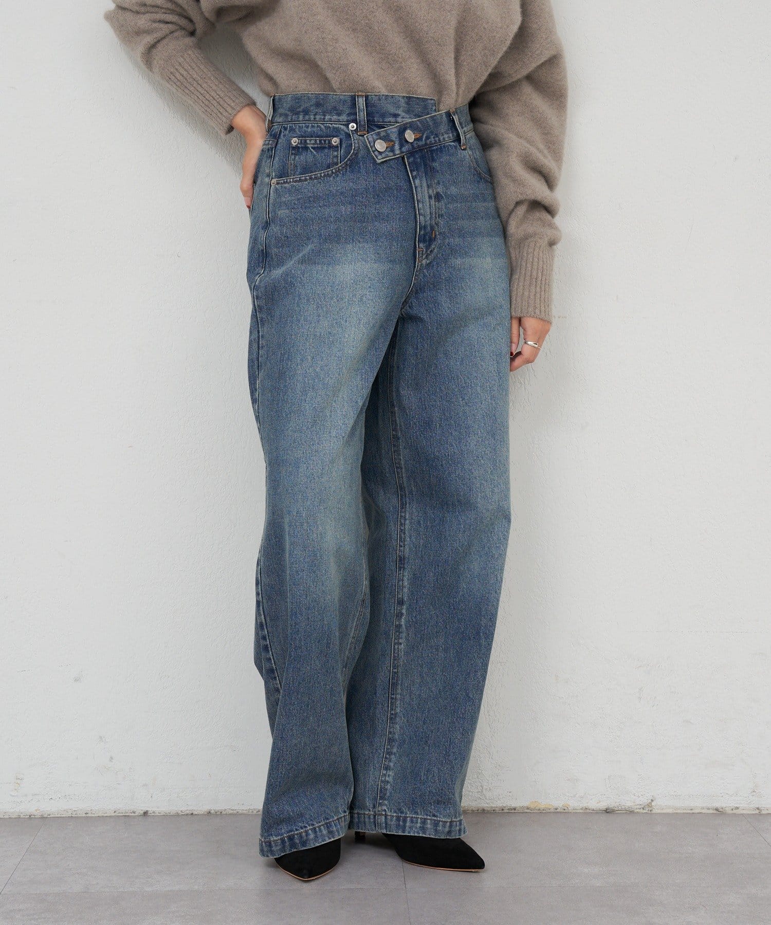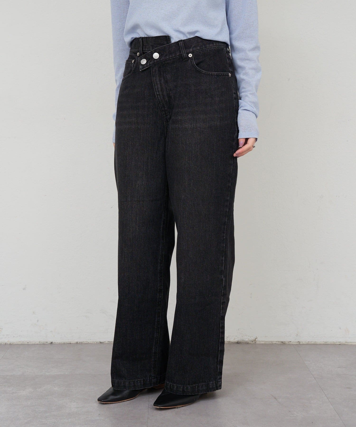 ウエストのアシンメトリーデザインが特徴のデニムパンツ。