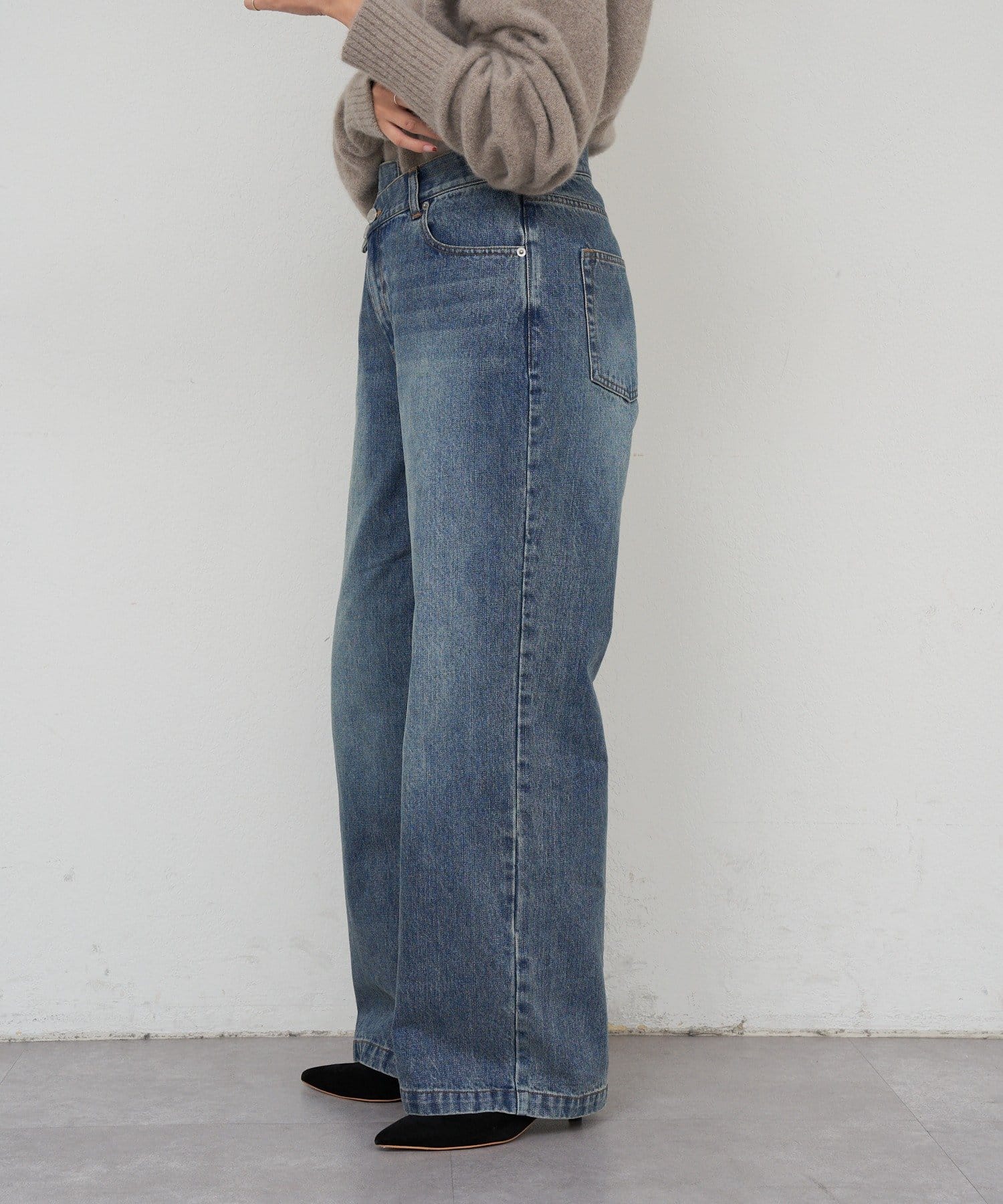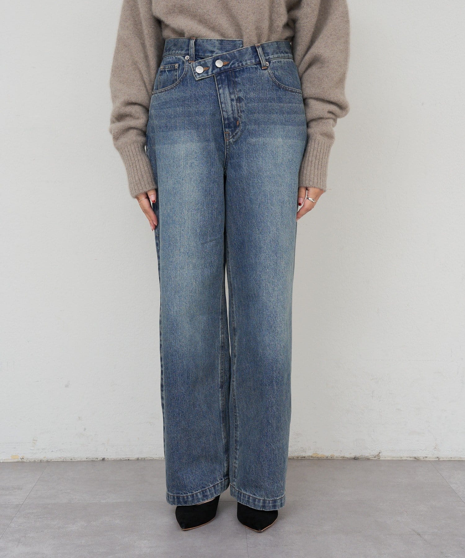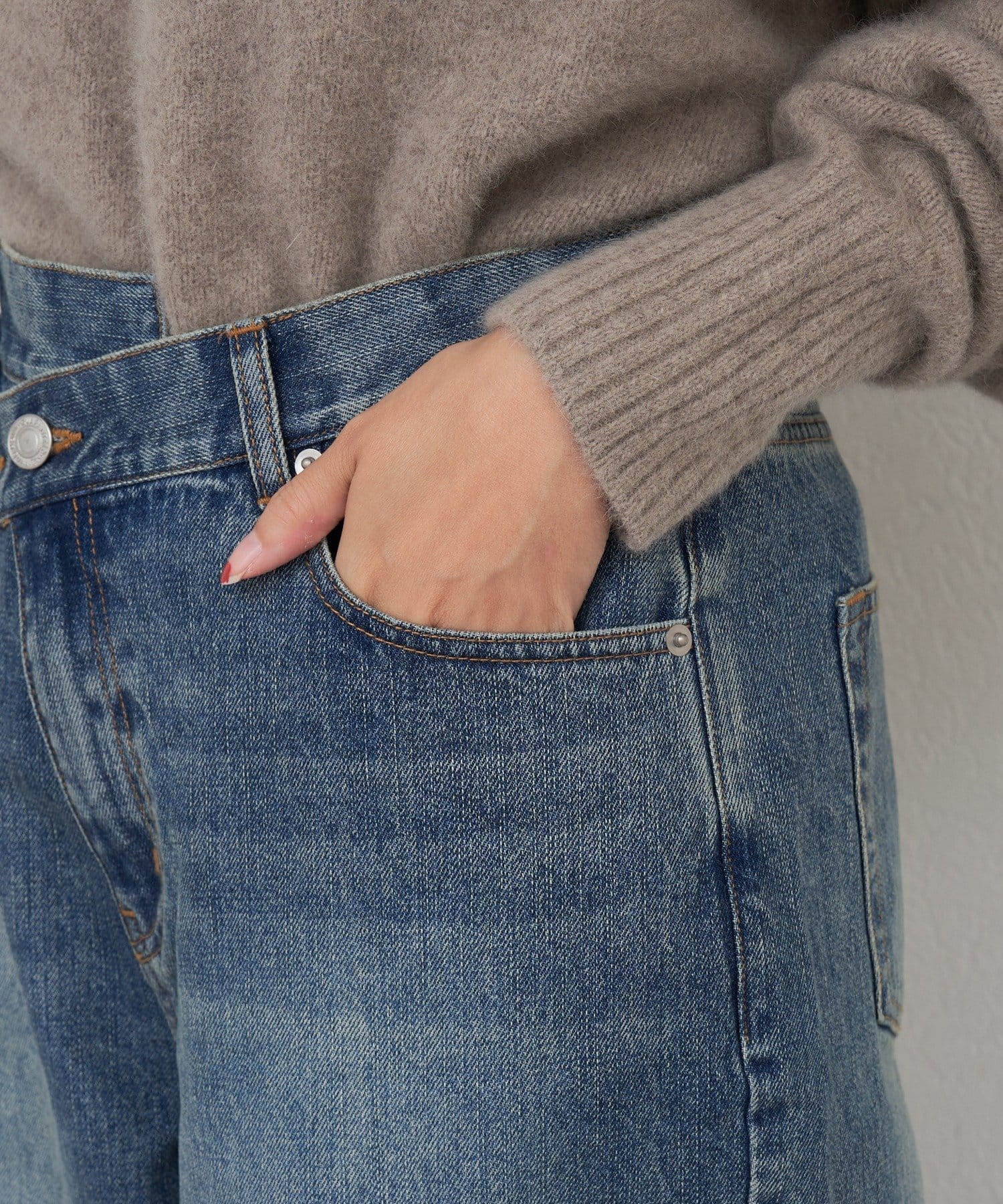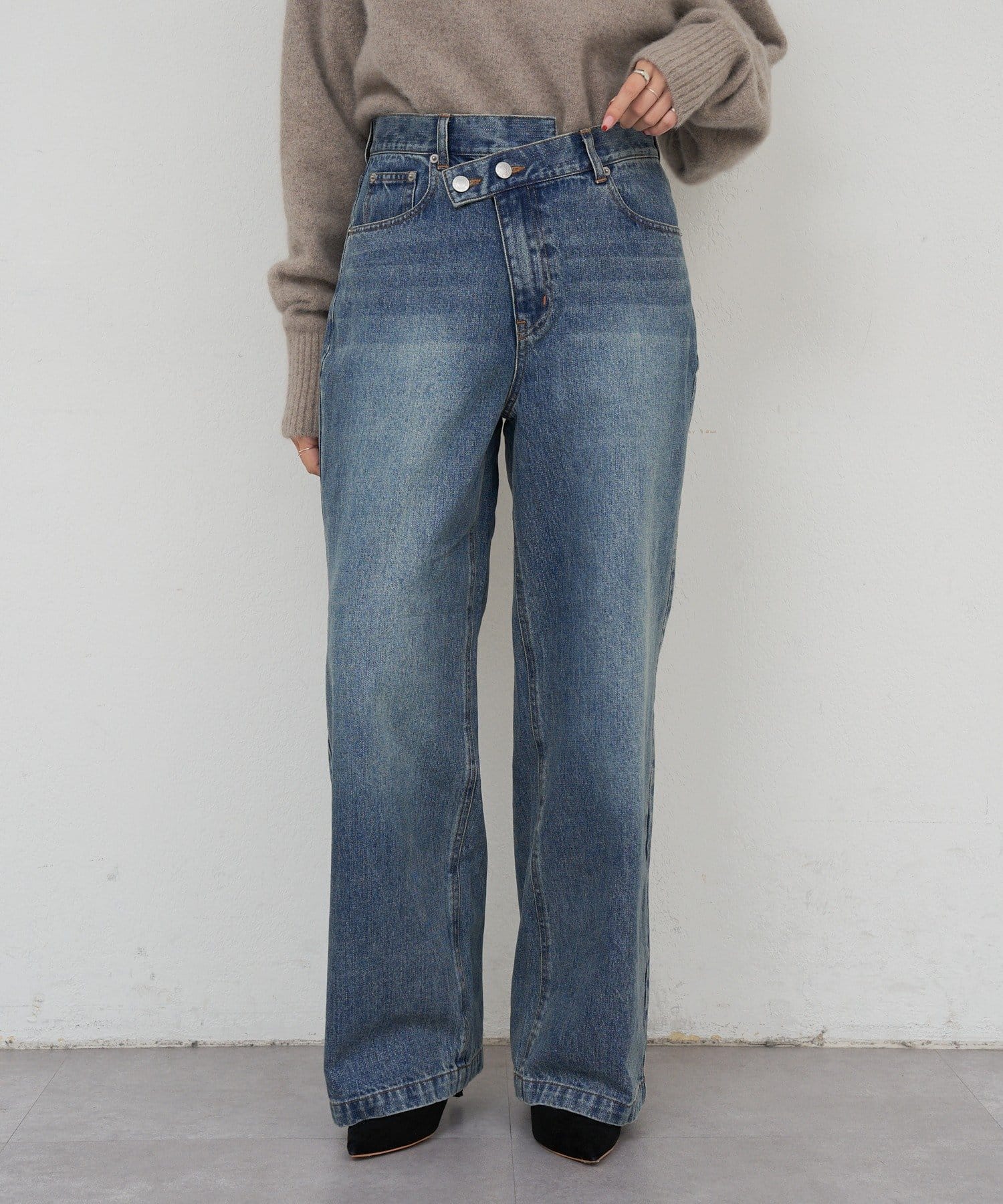 ウエストのアシンメトリーデザインが特徴のデニムパンツ。