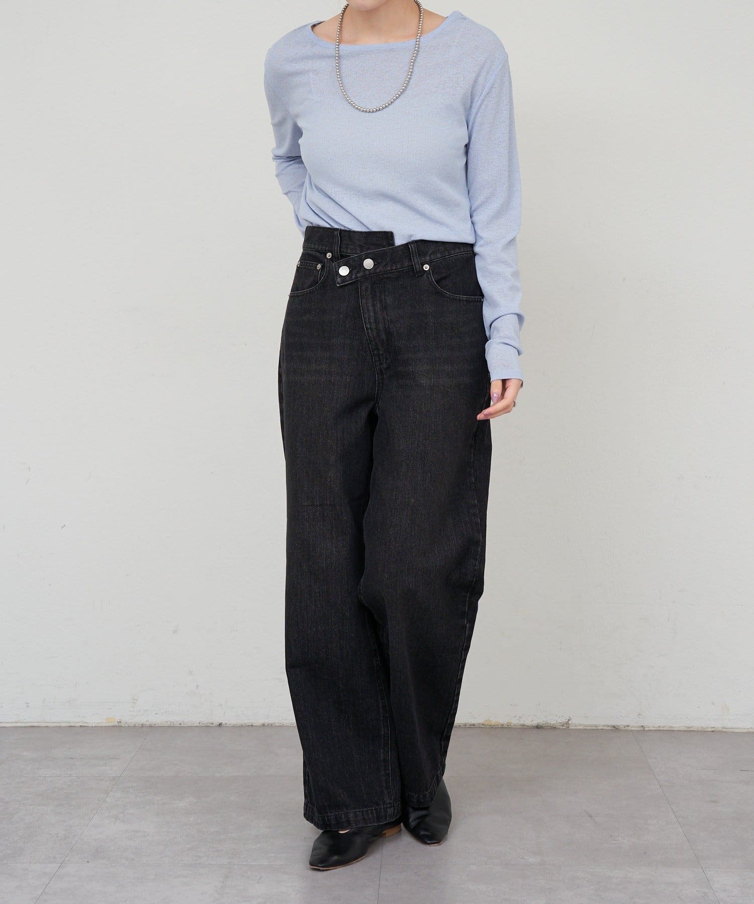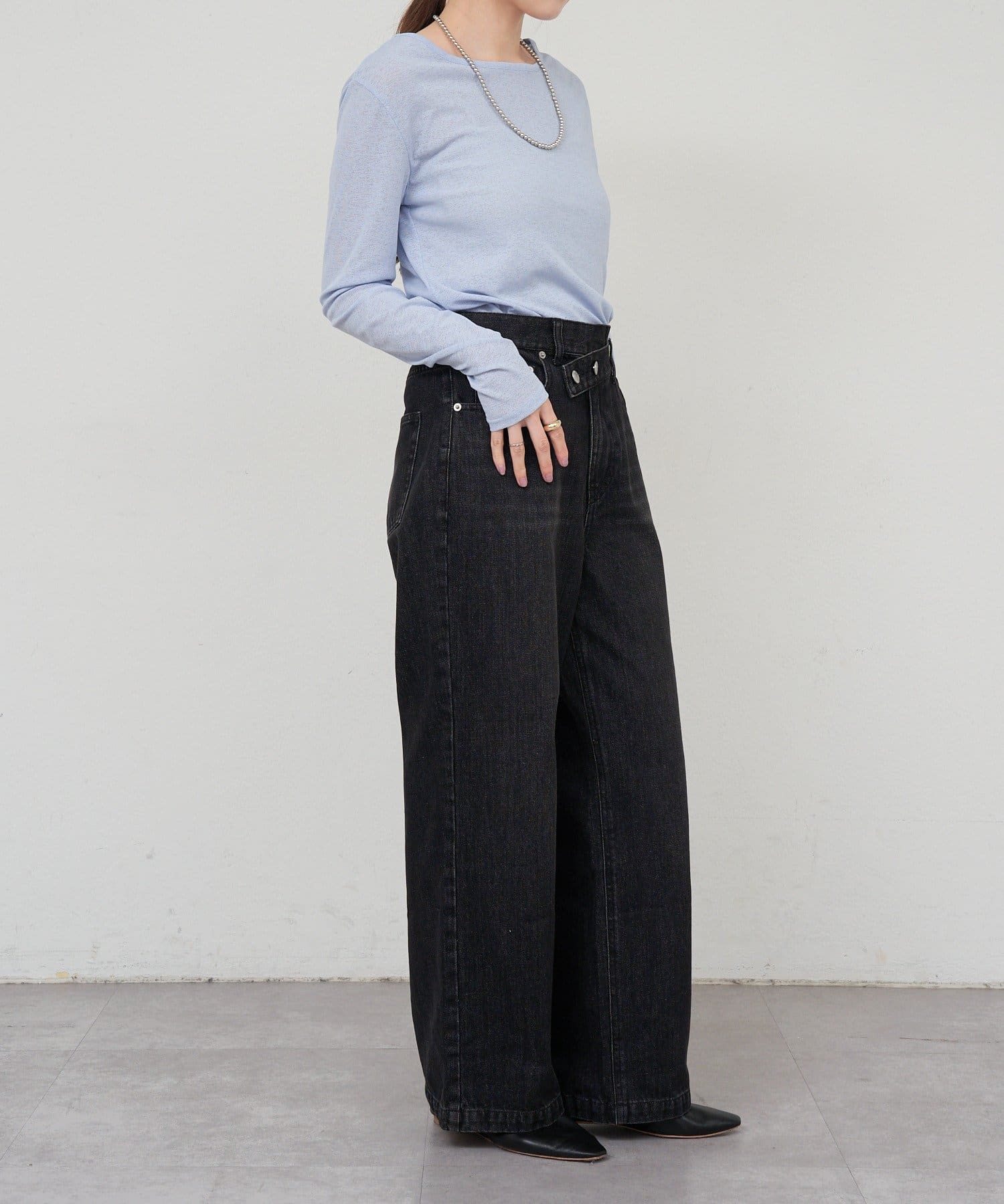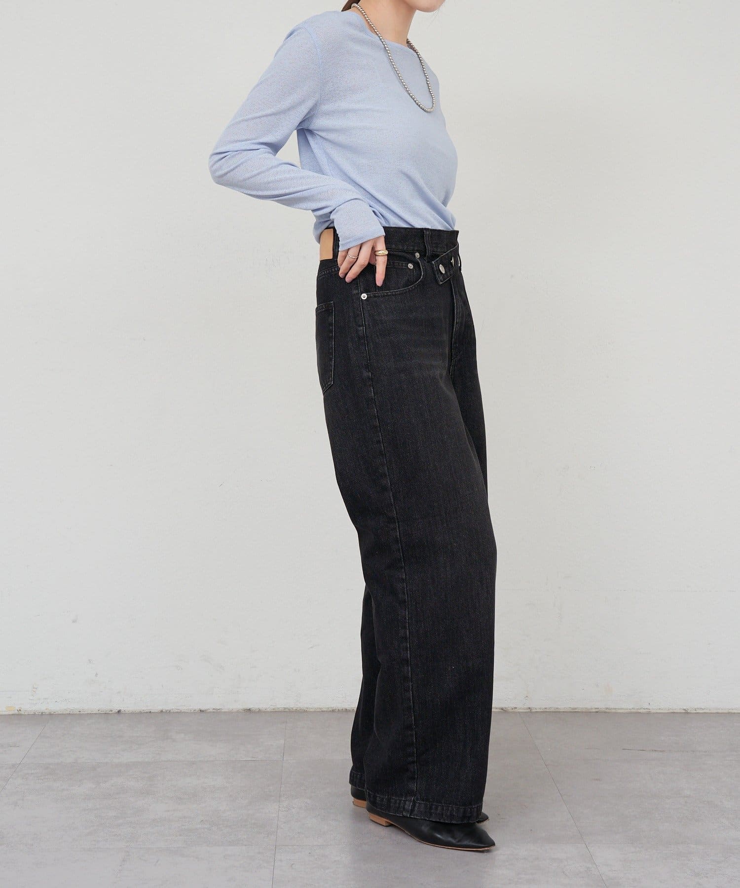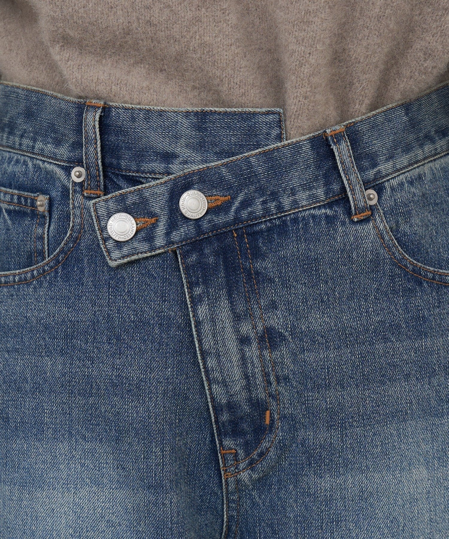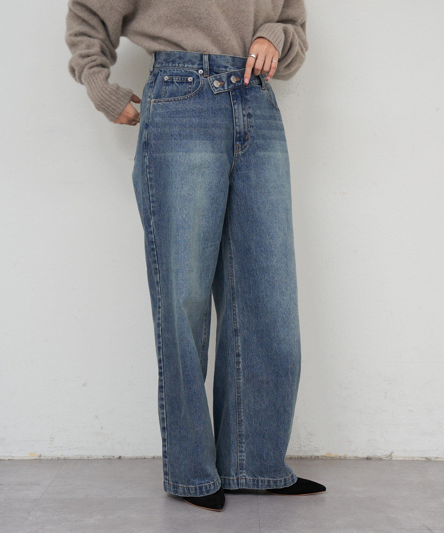 ウエストのアシンメトリーデザインが特徴のデニムパンツ。