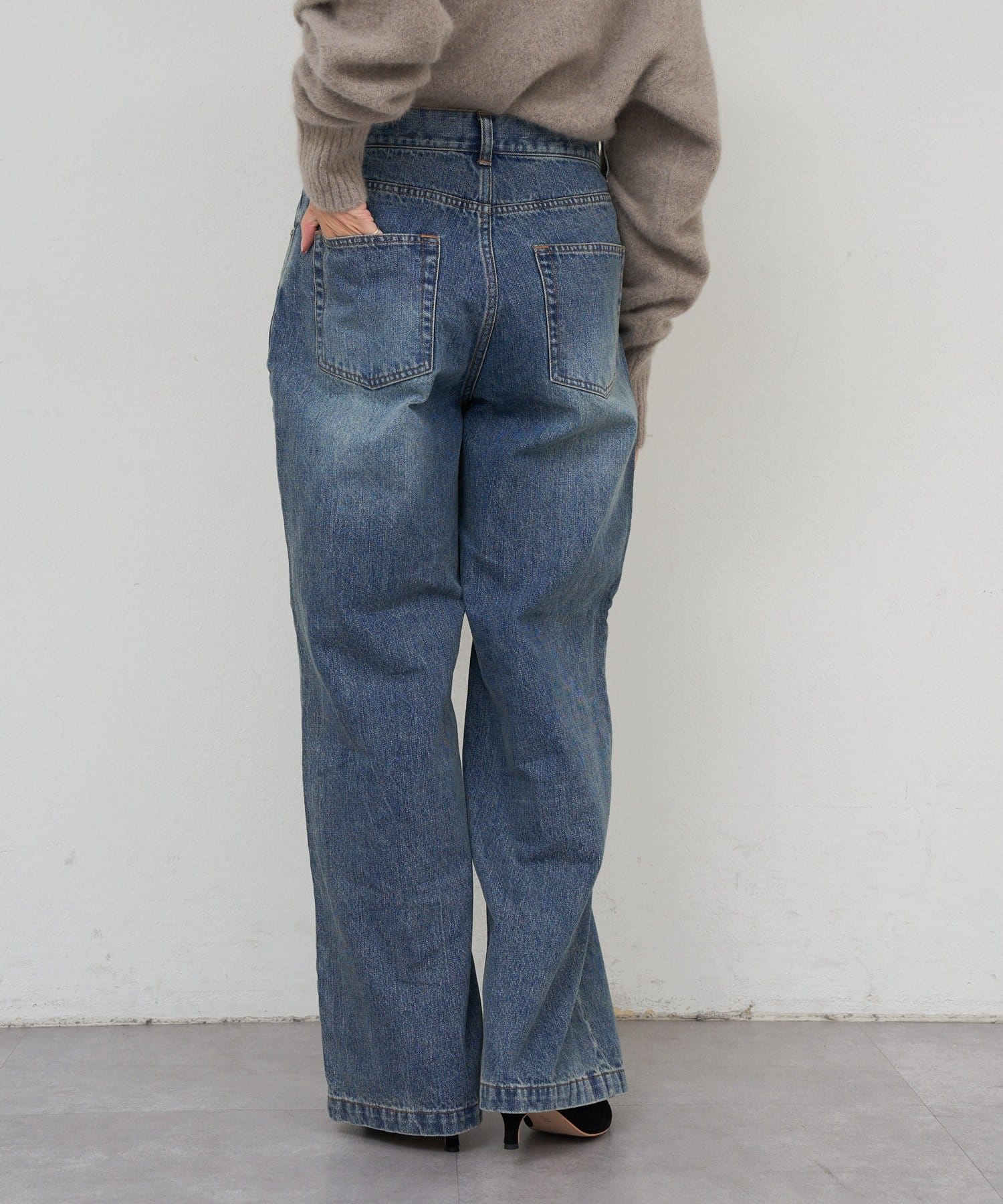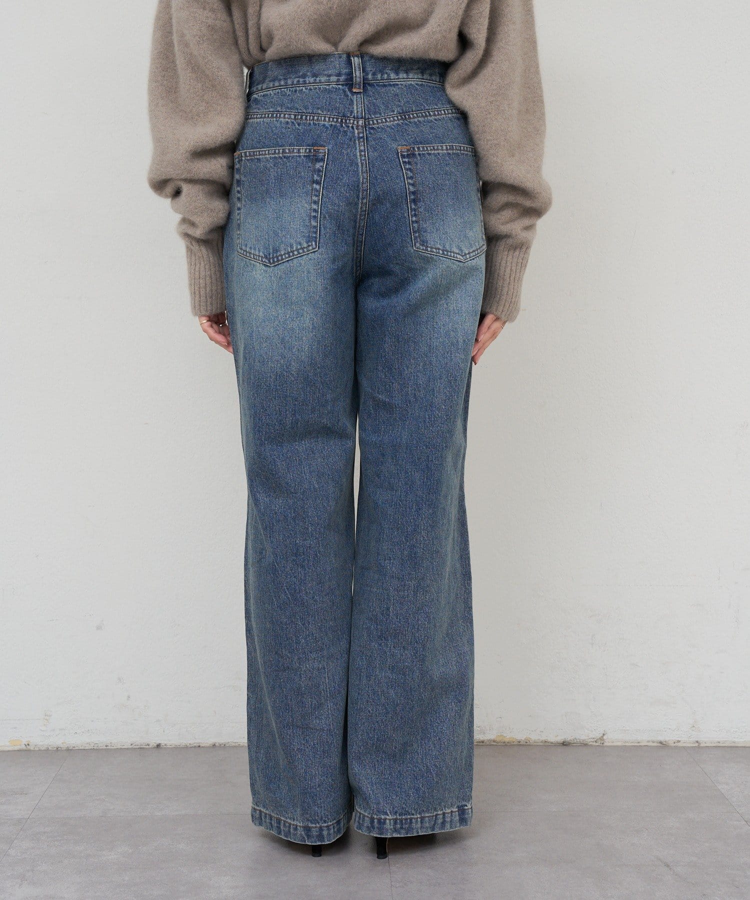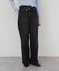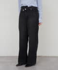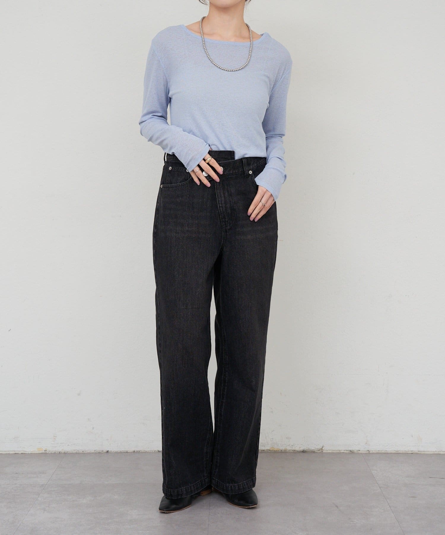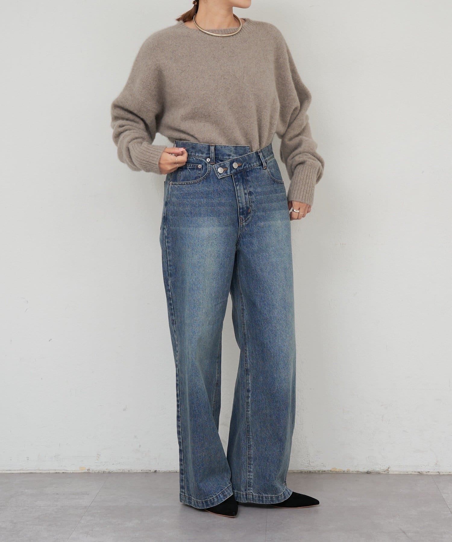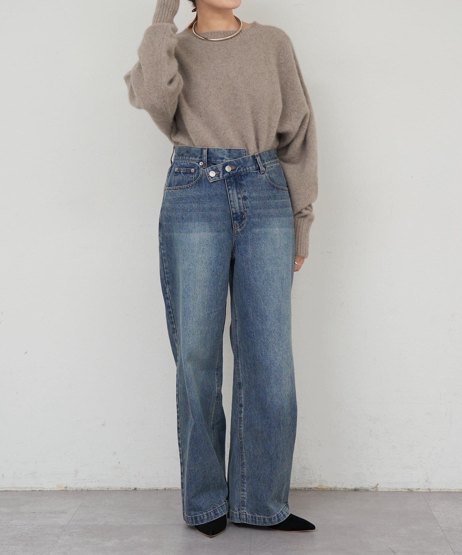 ウエストのアシンメトリーデザインが特徴のデニムパンツ。
