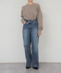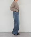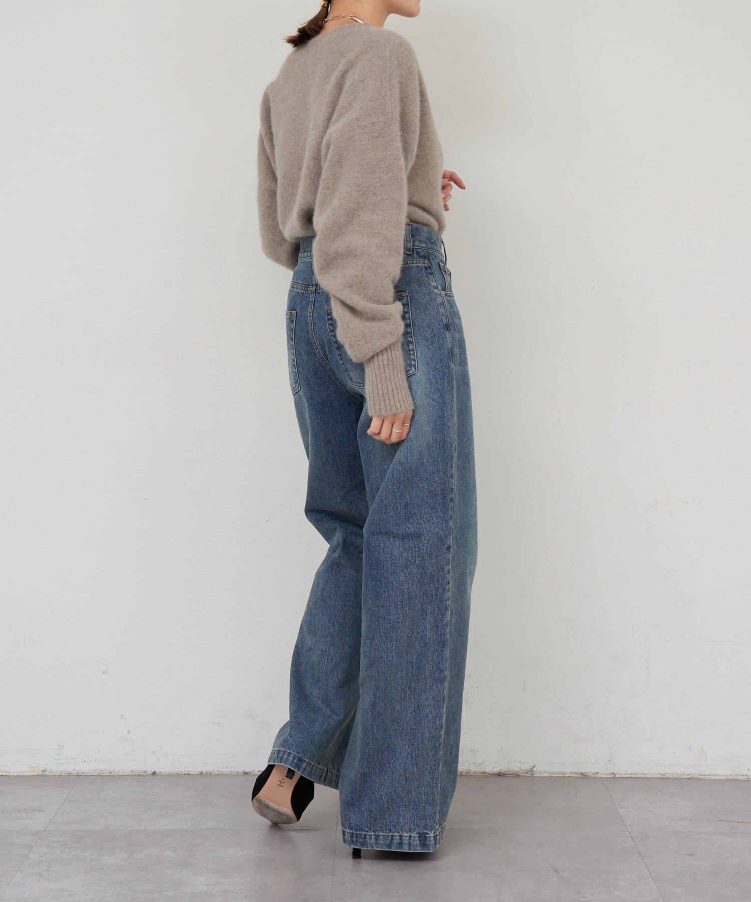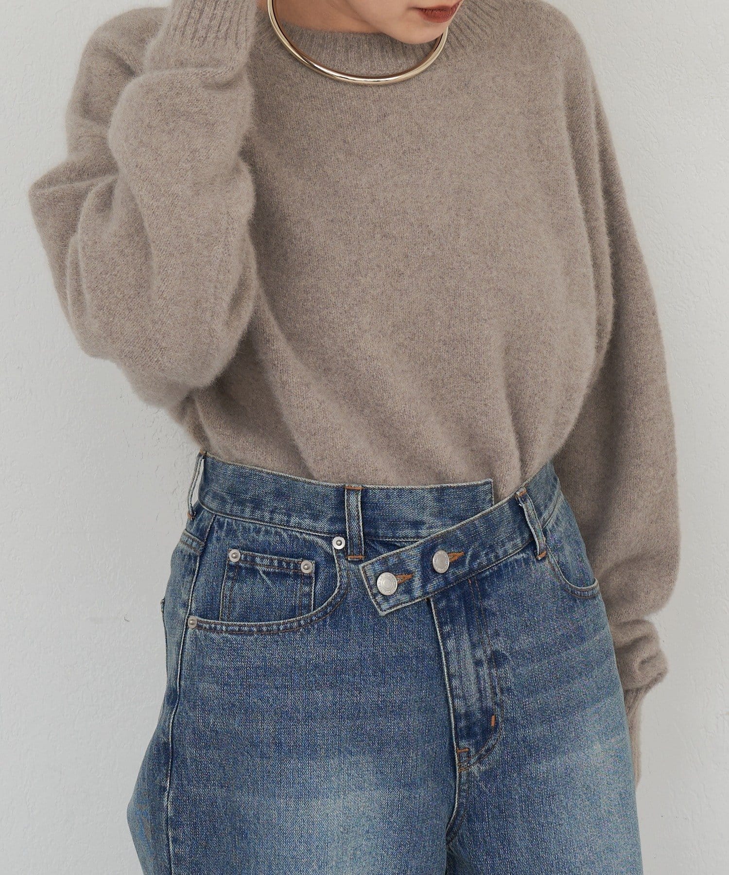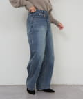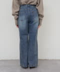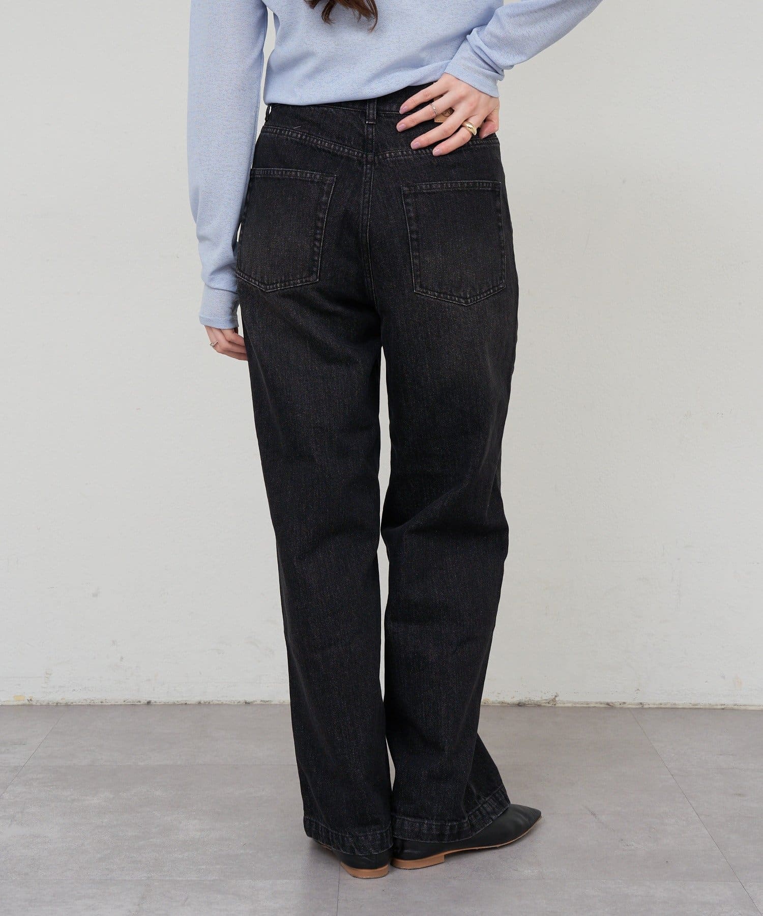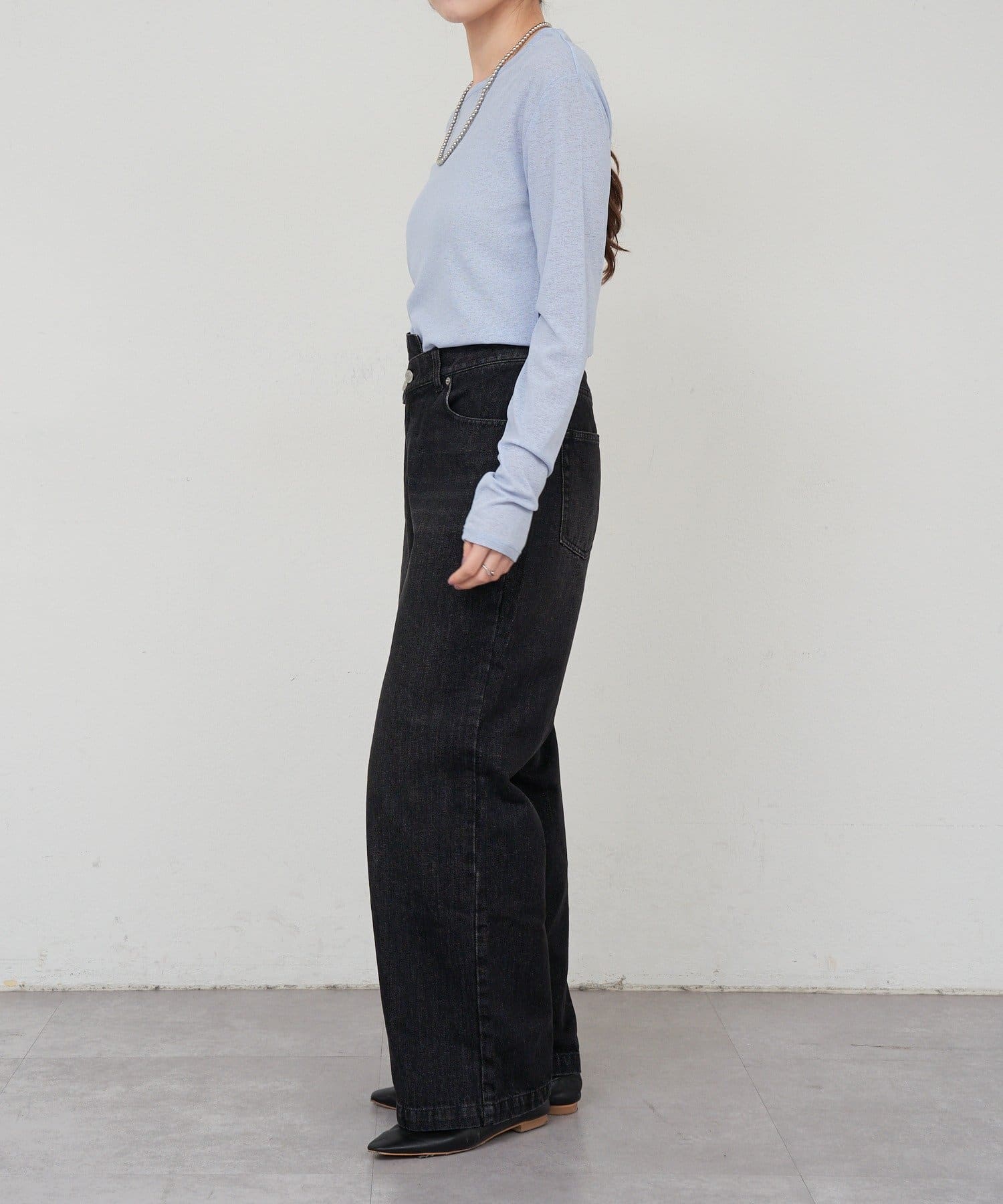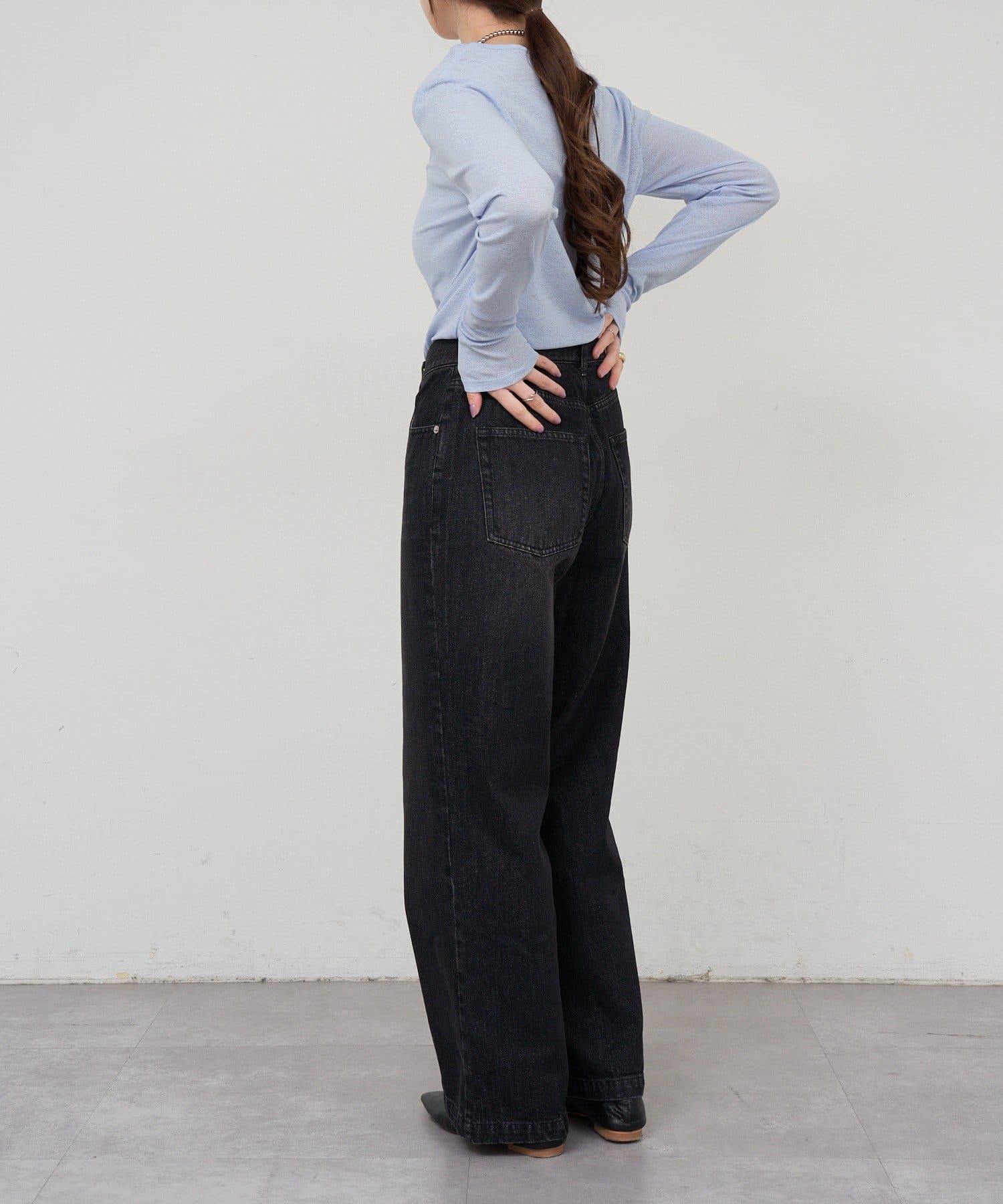 ウエストのアシンメトリーデザインが特徴のデニムパンツ。