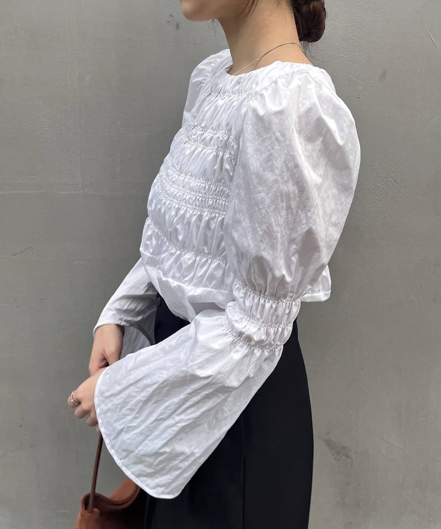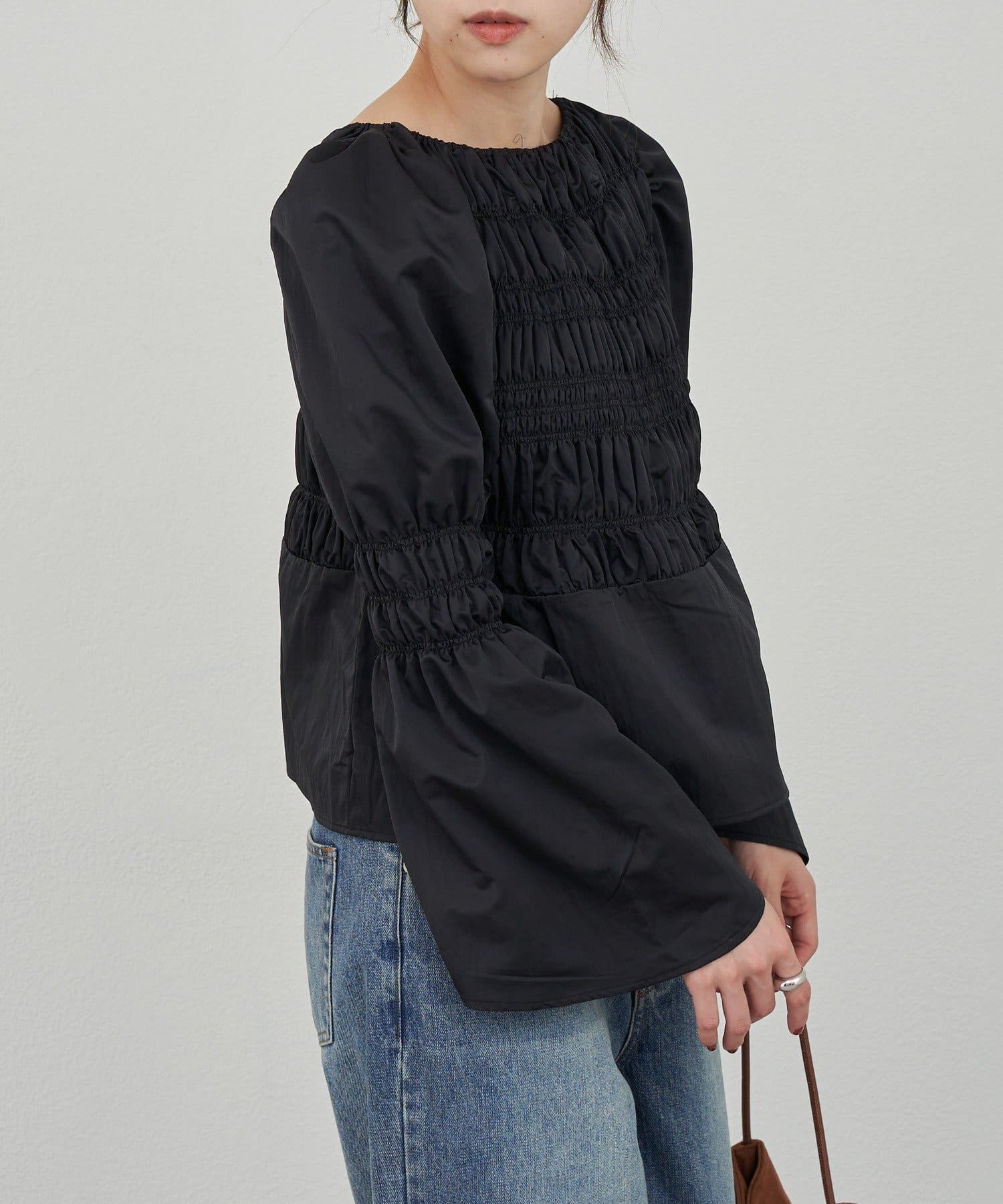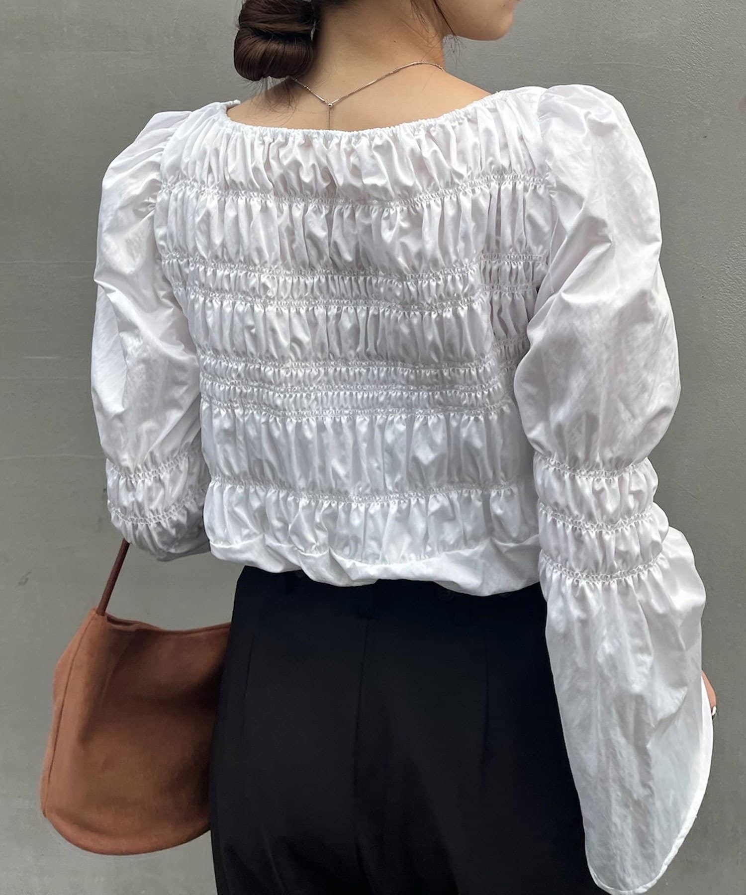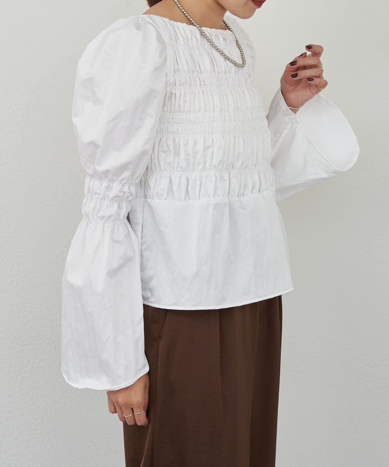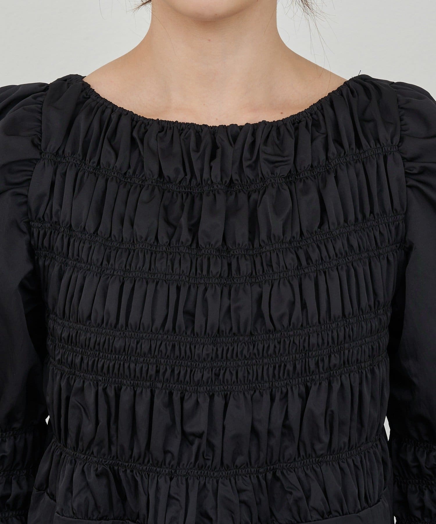 ・1枚でコーデが決まり、胸元に施されたシャーリングがトレンド感のあるデザインのアイテム。
