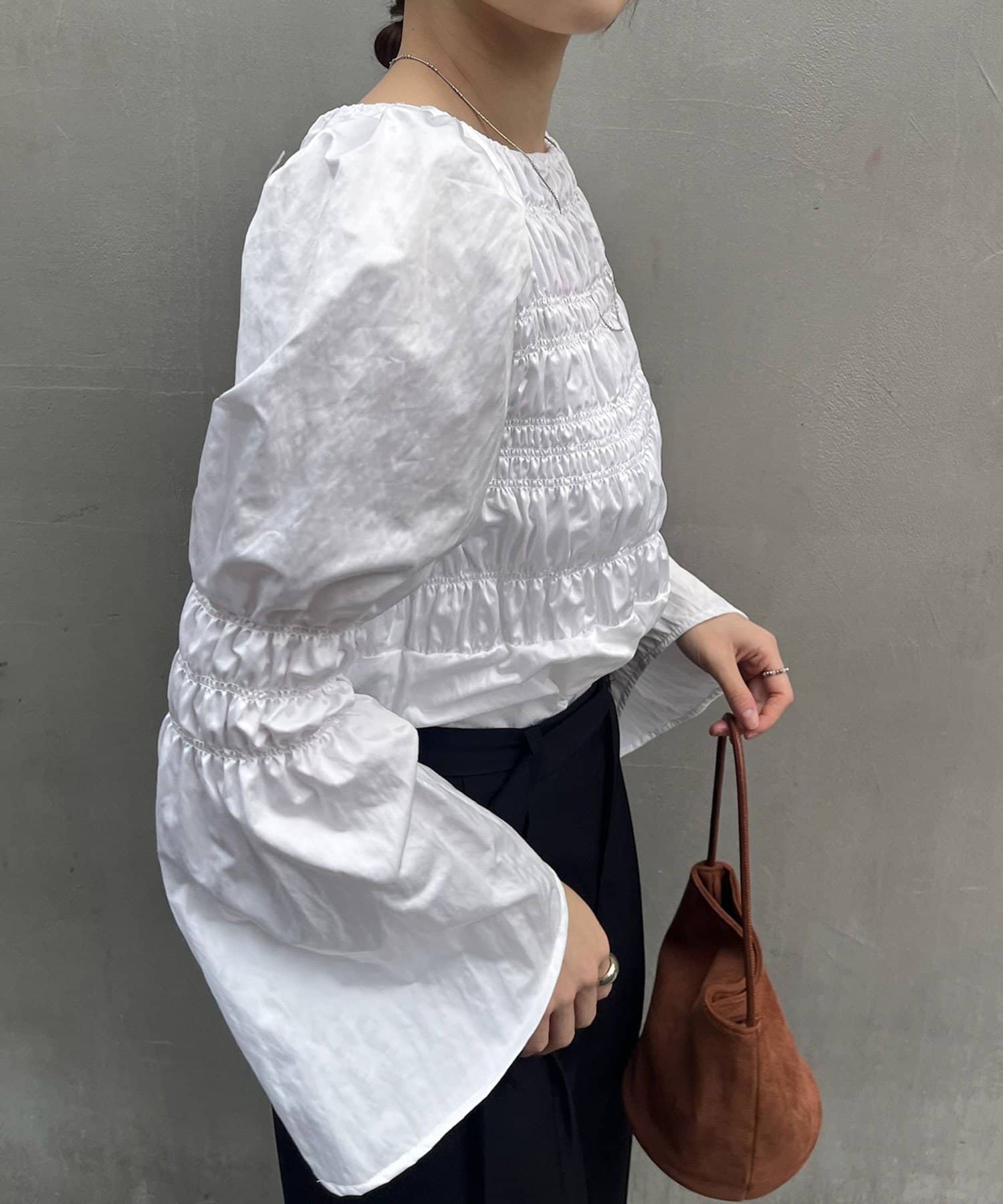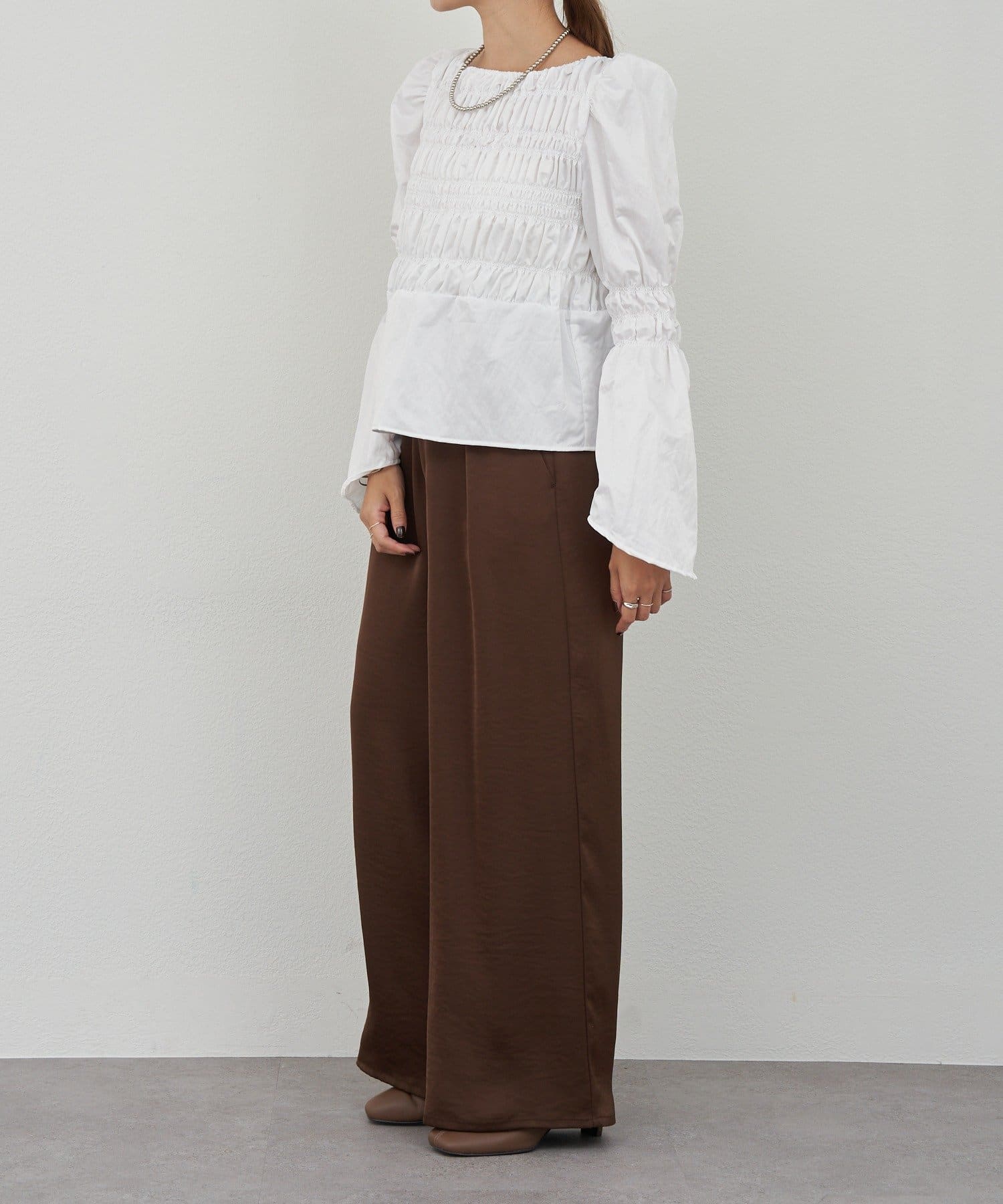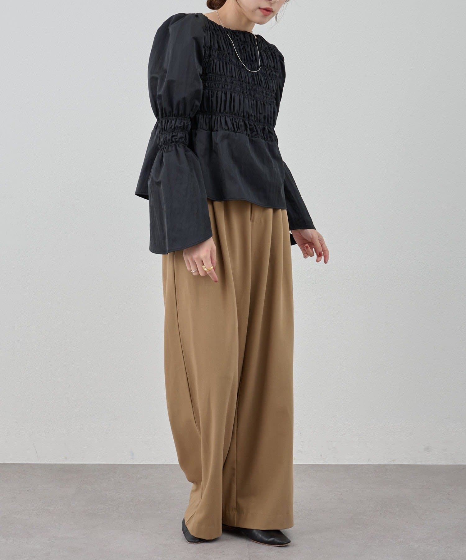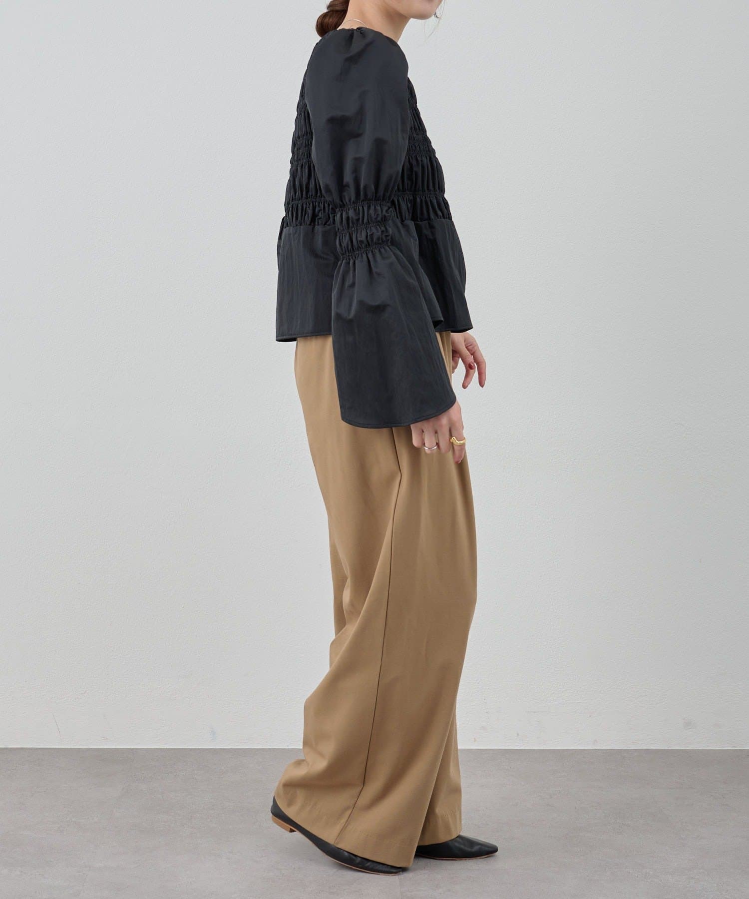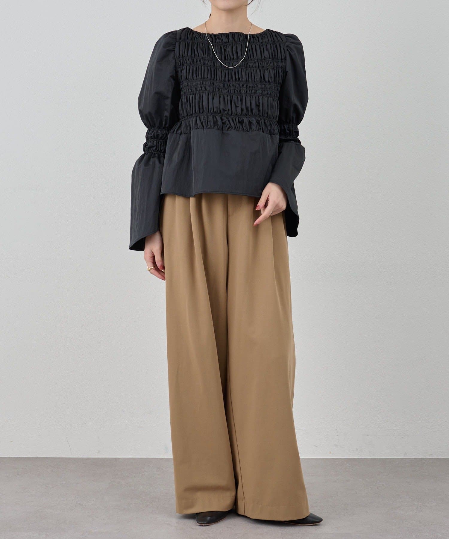 ・1枚でコーデが決まり、胸元に施されたシャーリングがトレンド感のあるデザインのアイテム。
