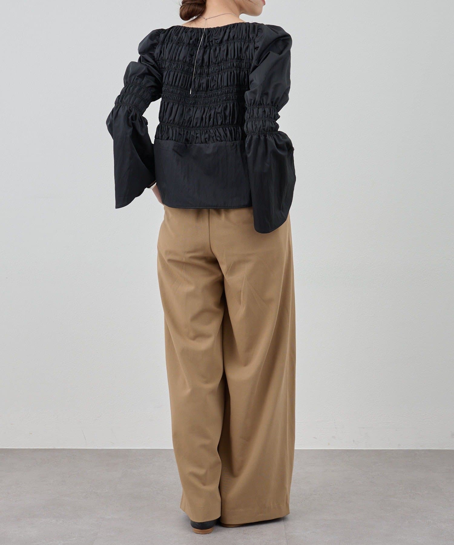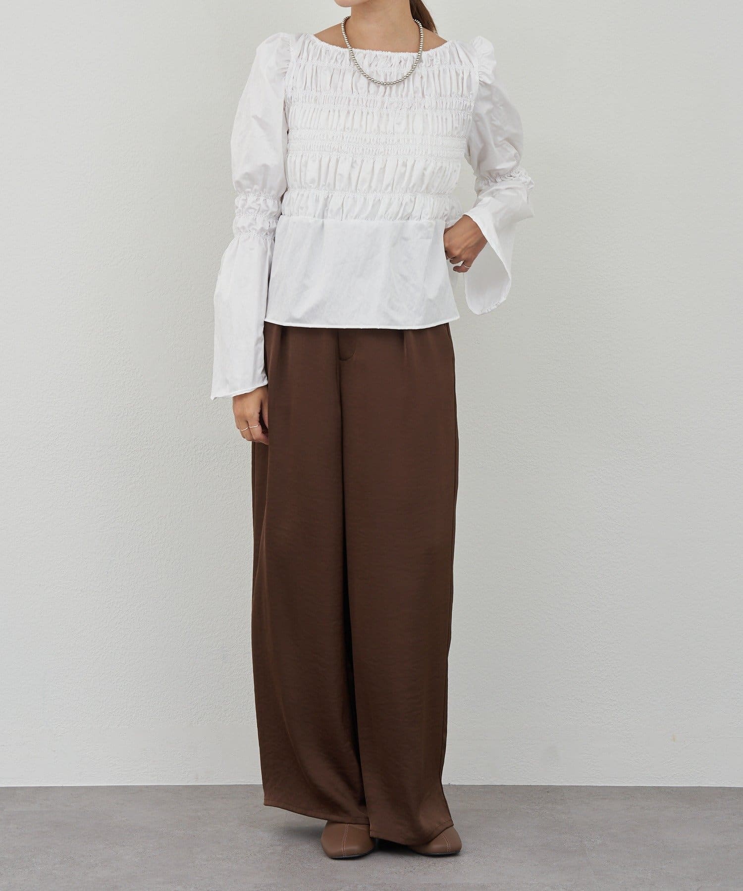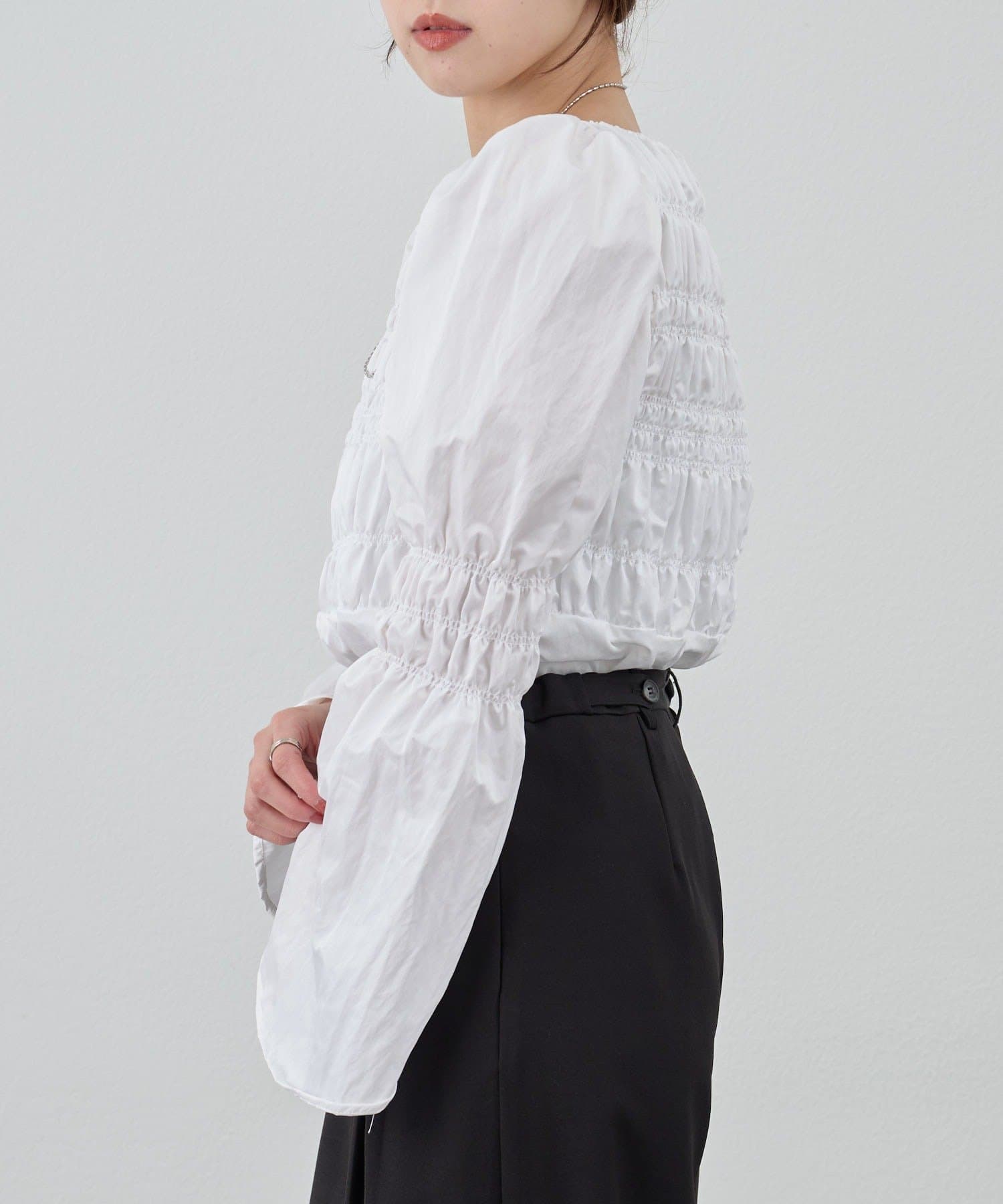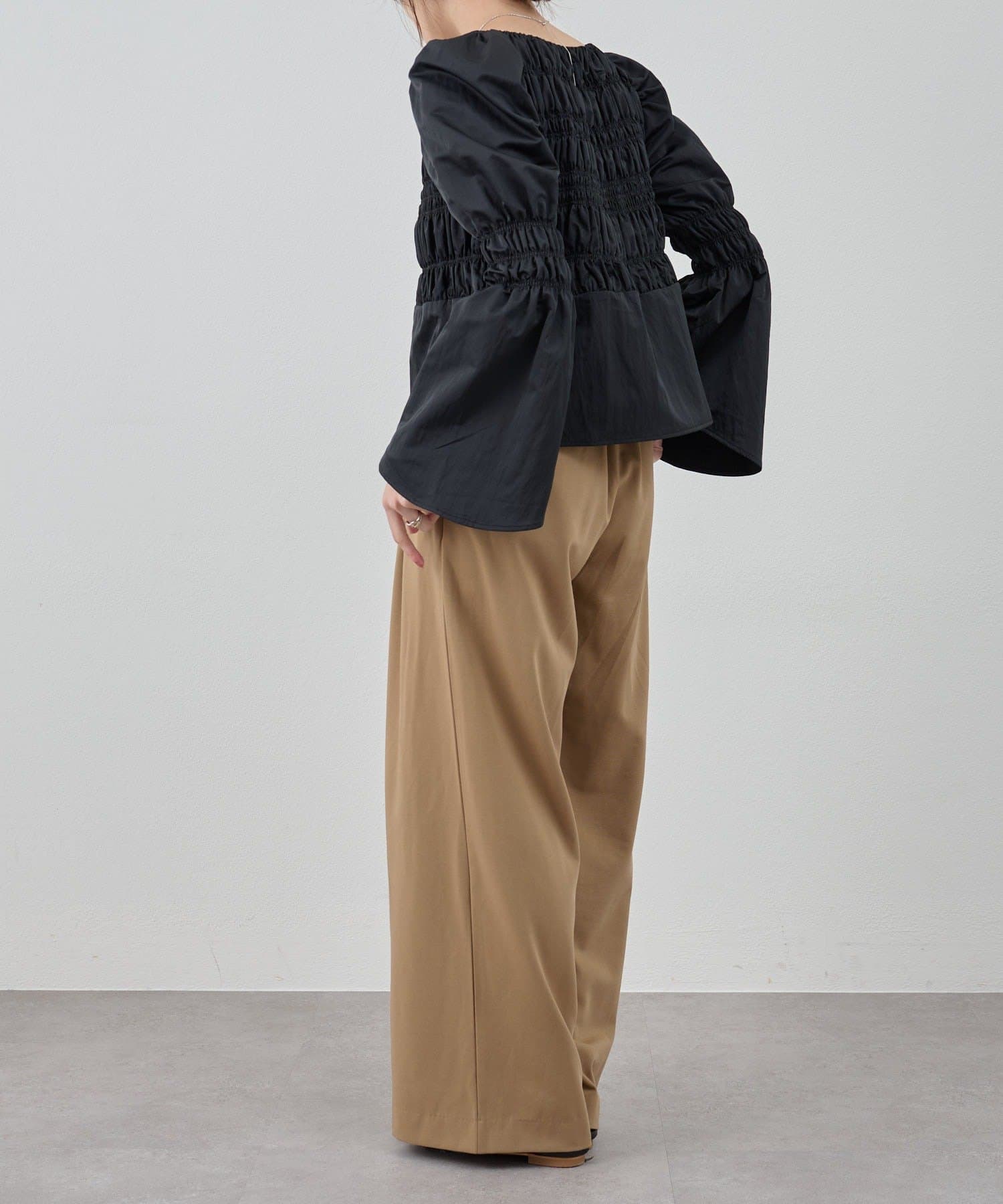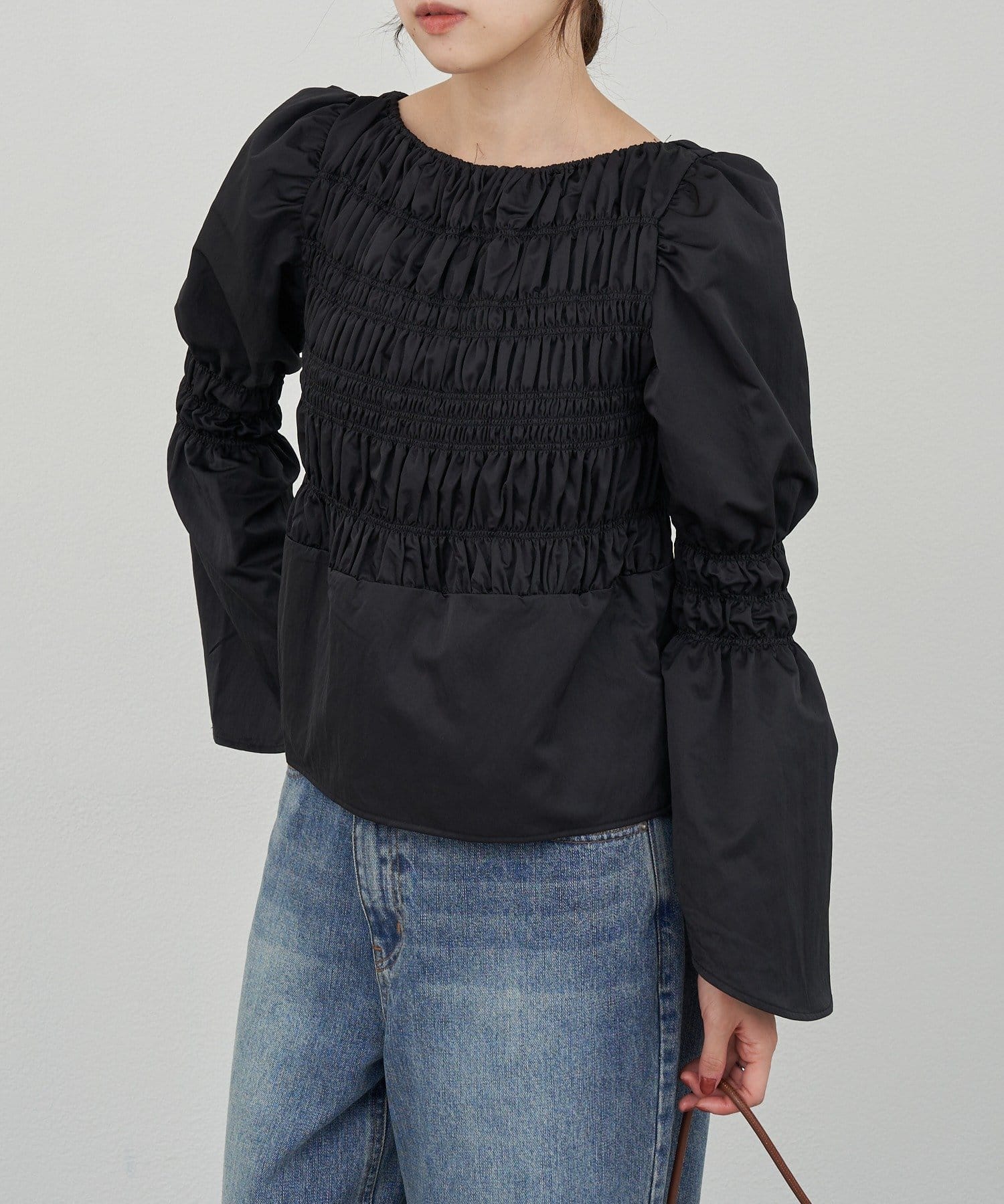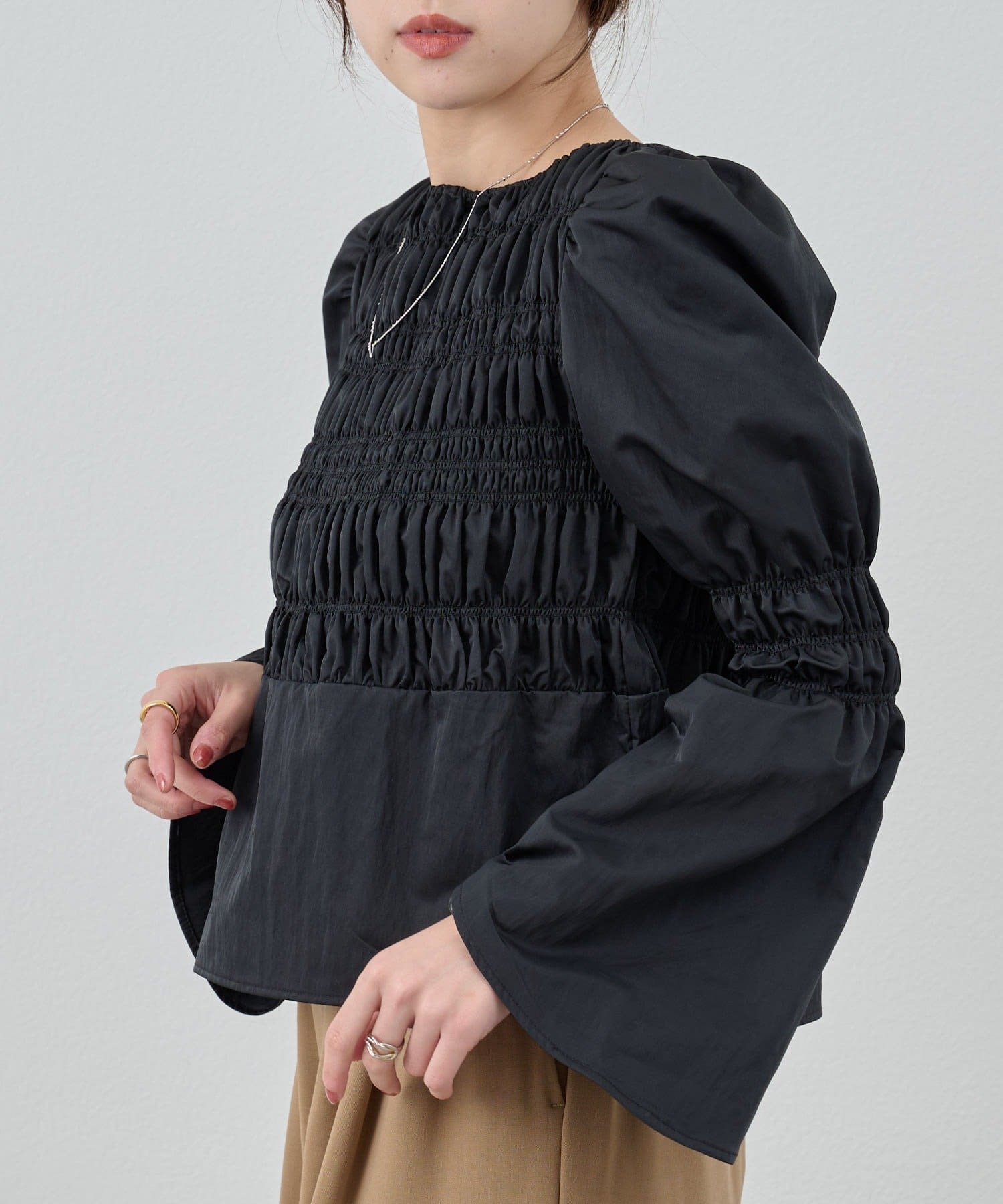 ・1枚でコーデが決まり、胸元に施されたシャーリングがトレンド感のあるデザインのアイテム。