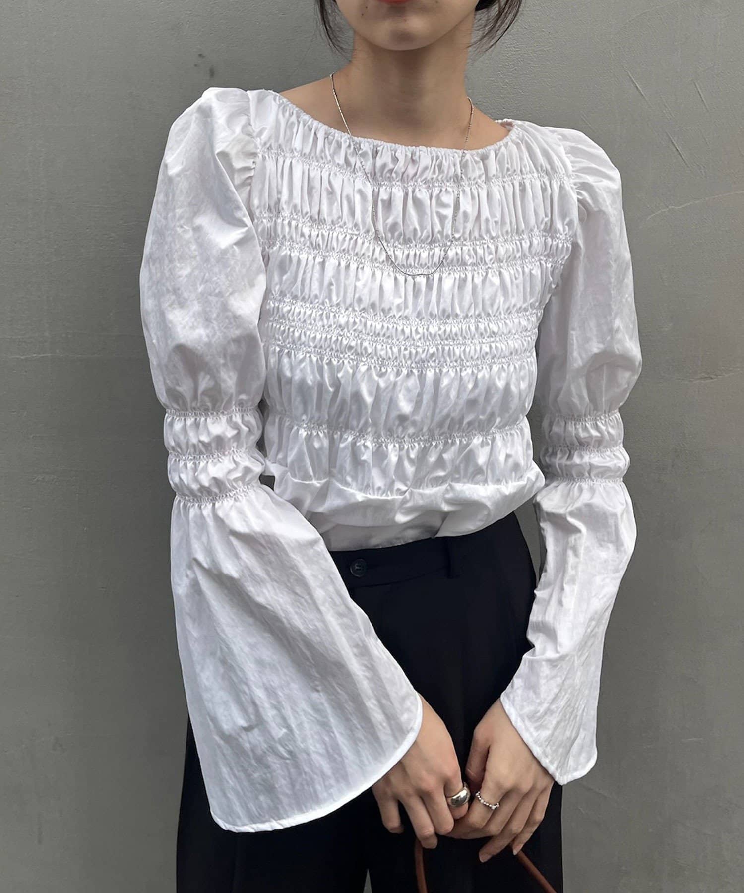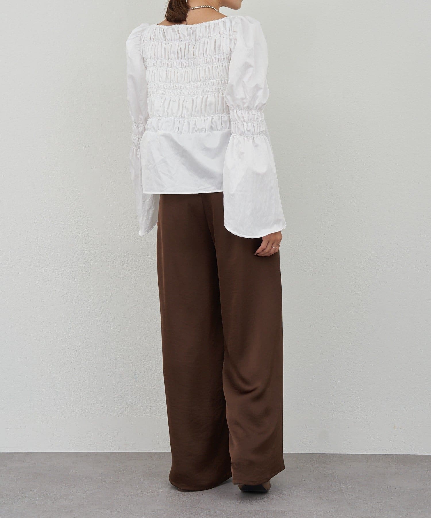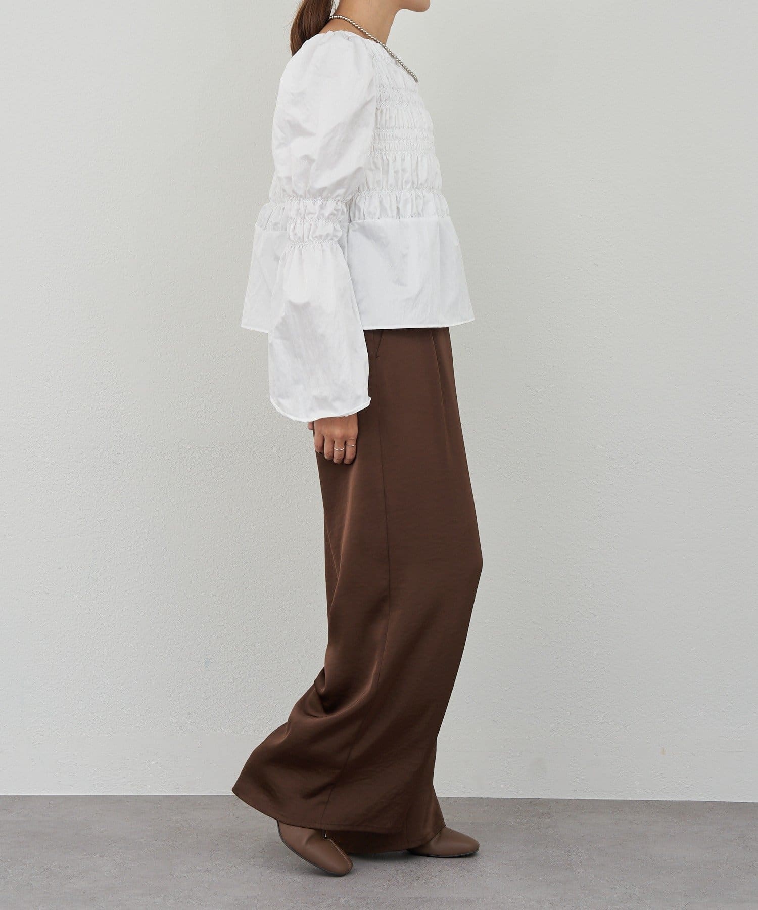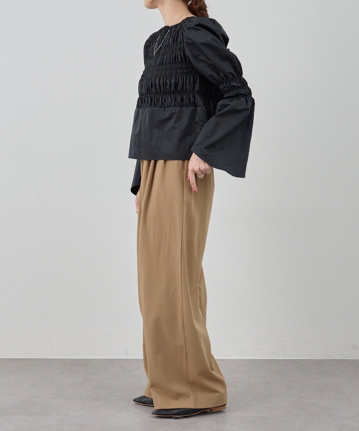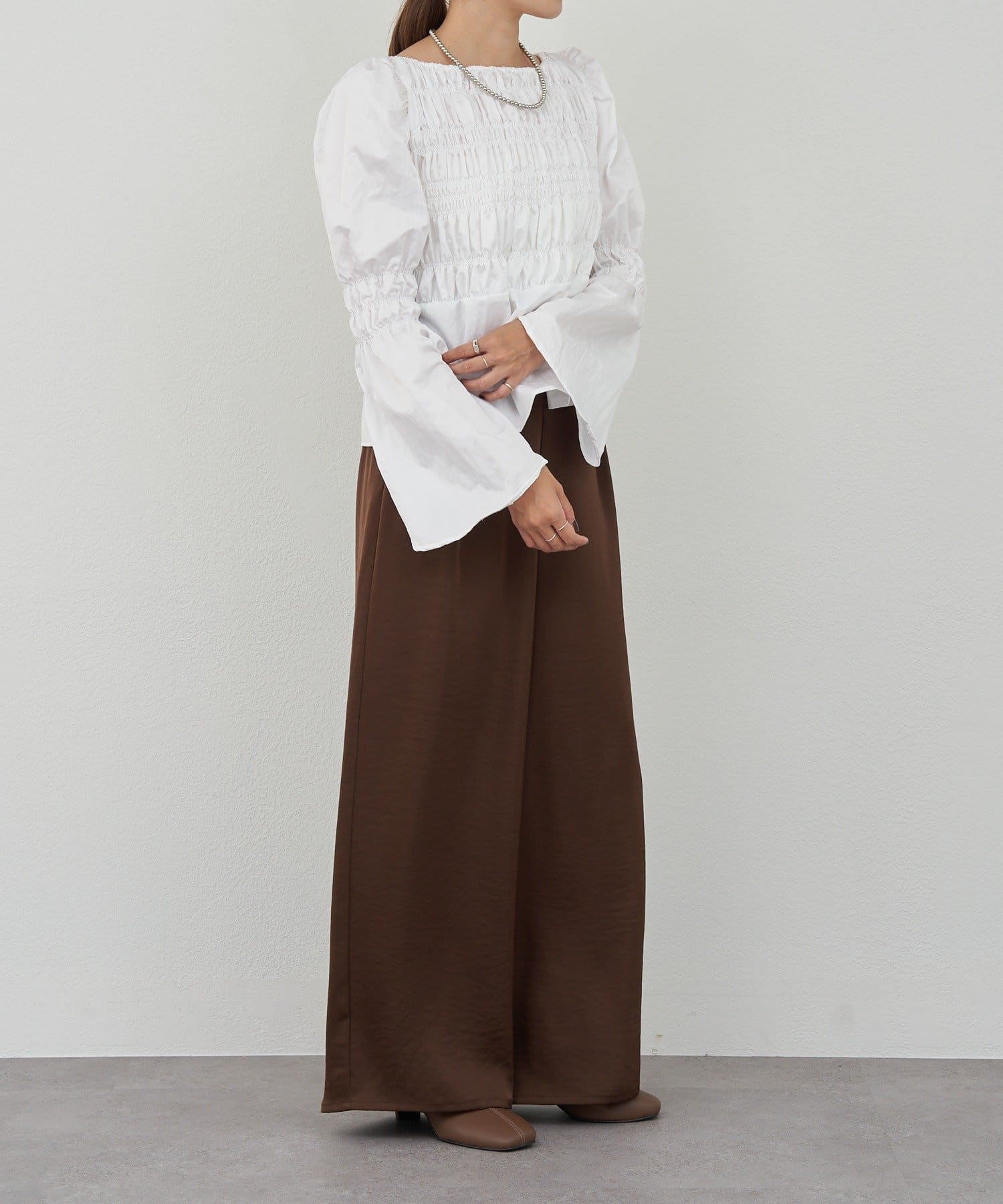 ・1枚でコーデが決まり、胸元に施されたシャーリングがトレンド感のあるデザインのアイテム。