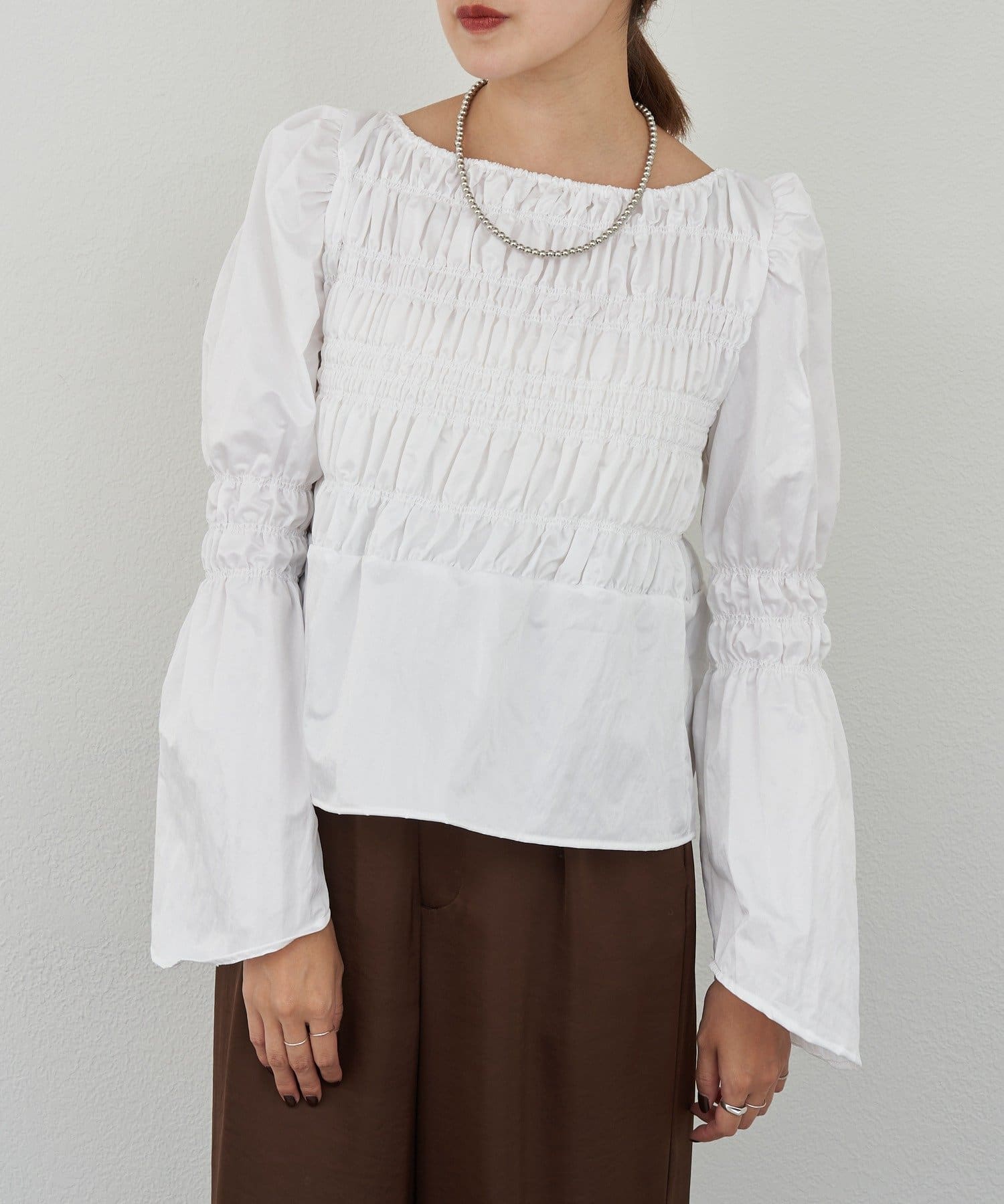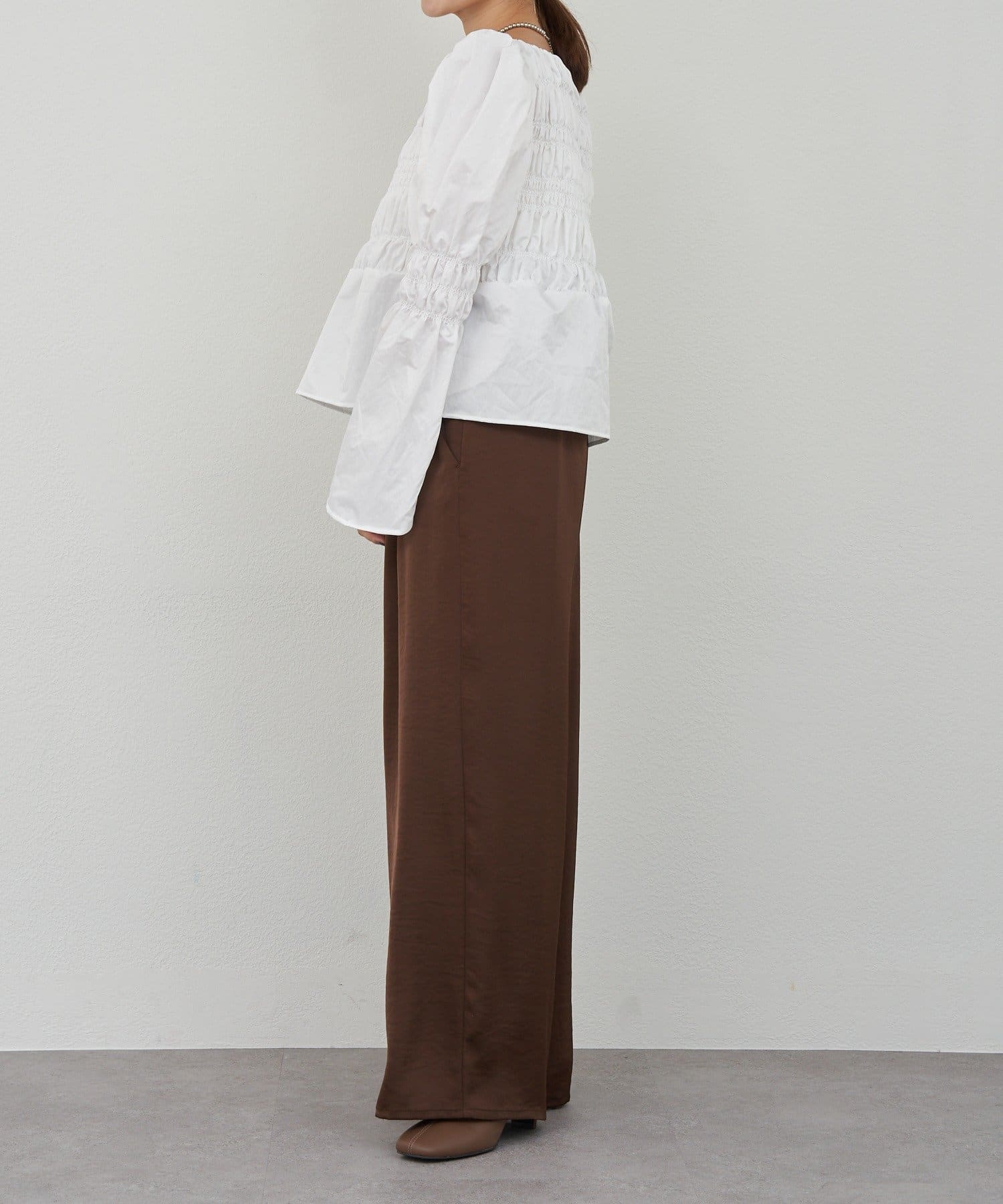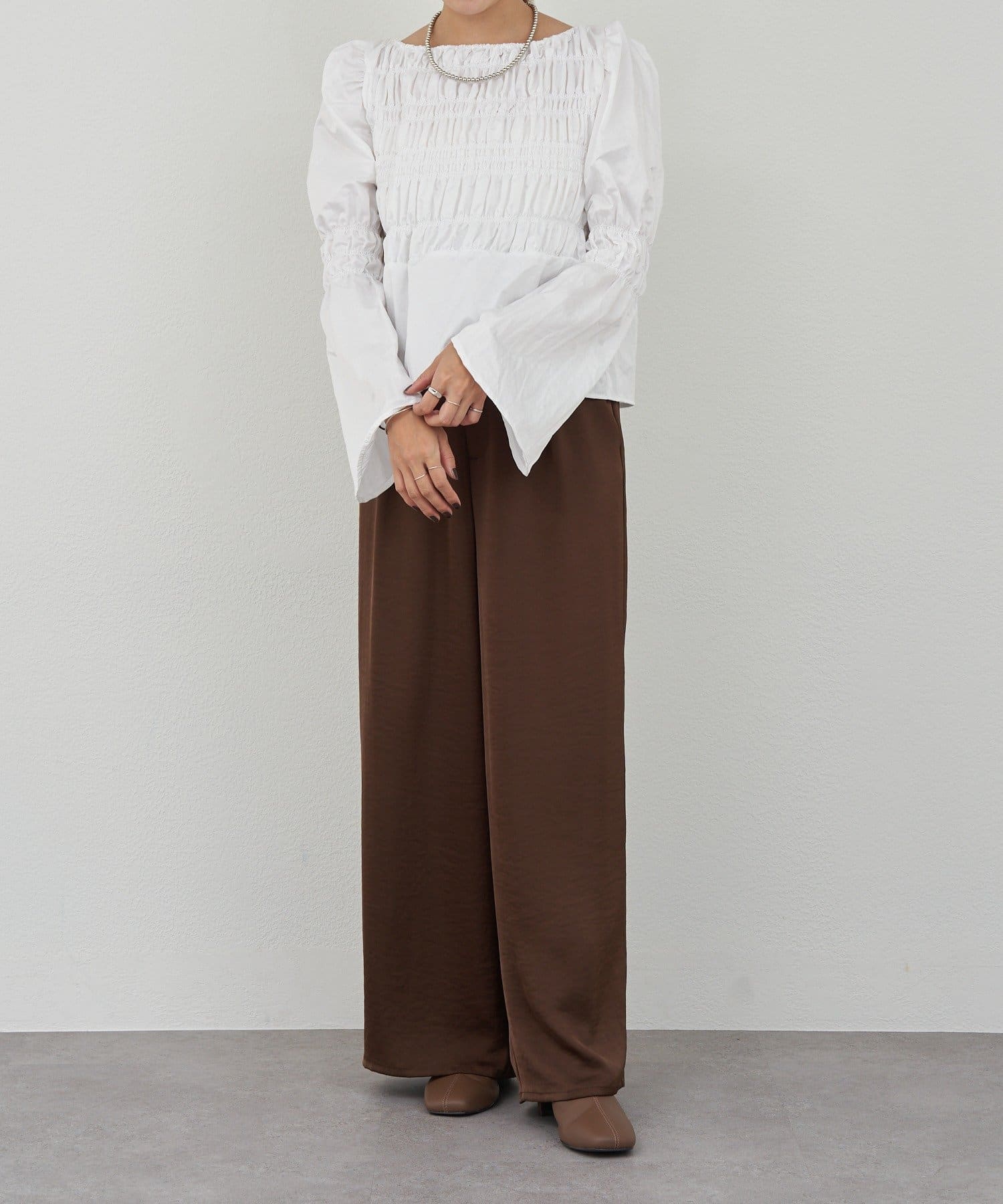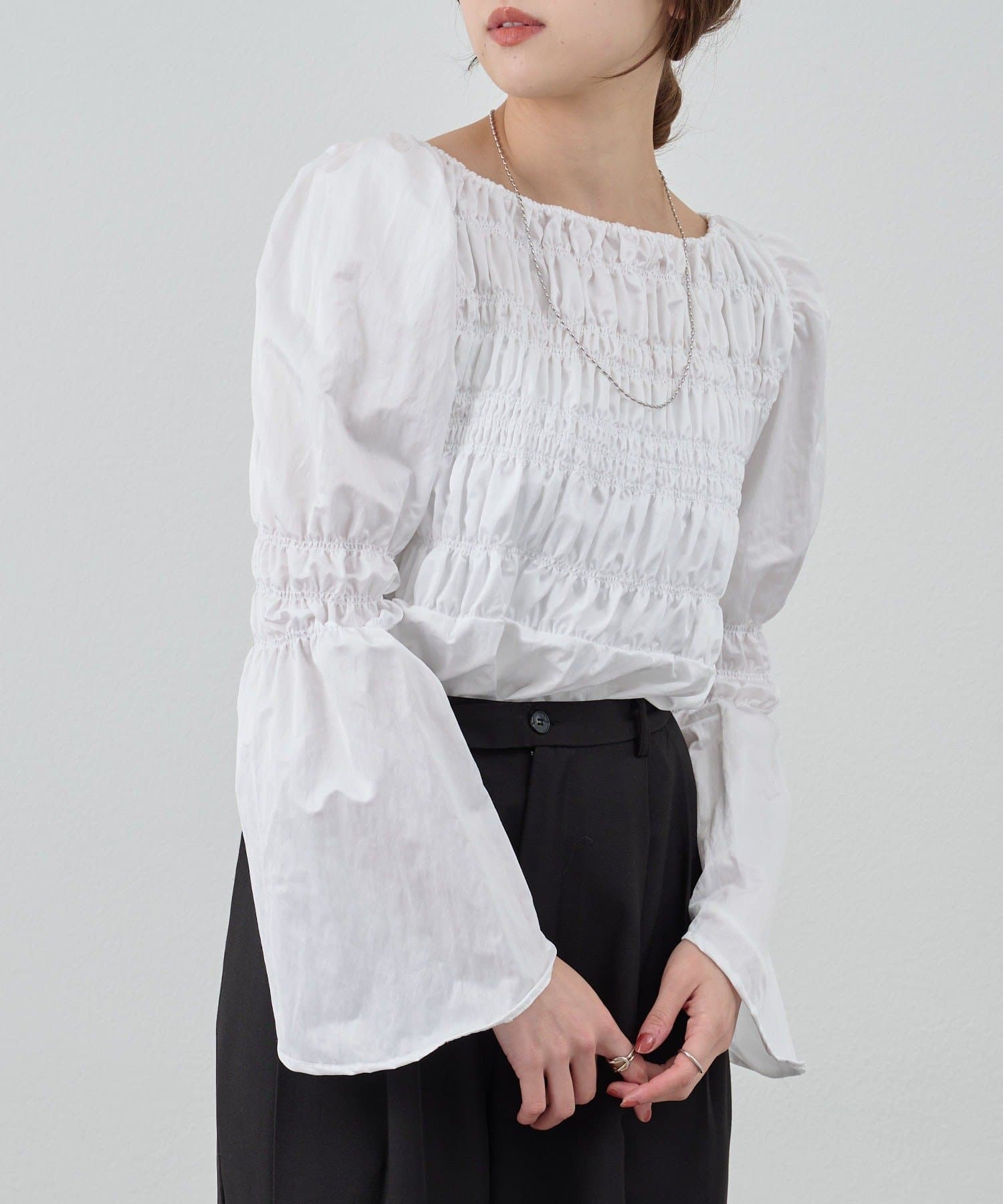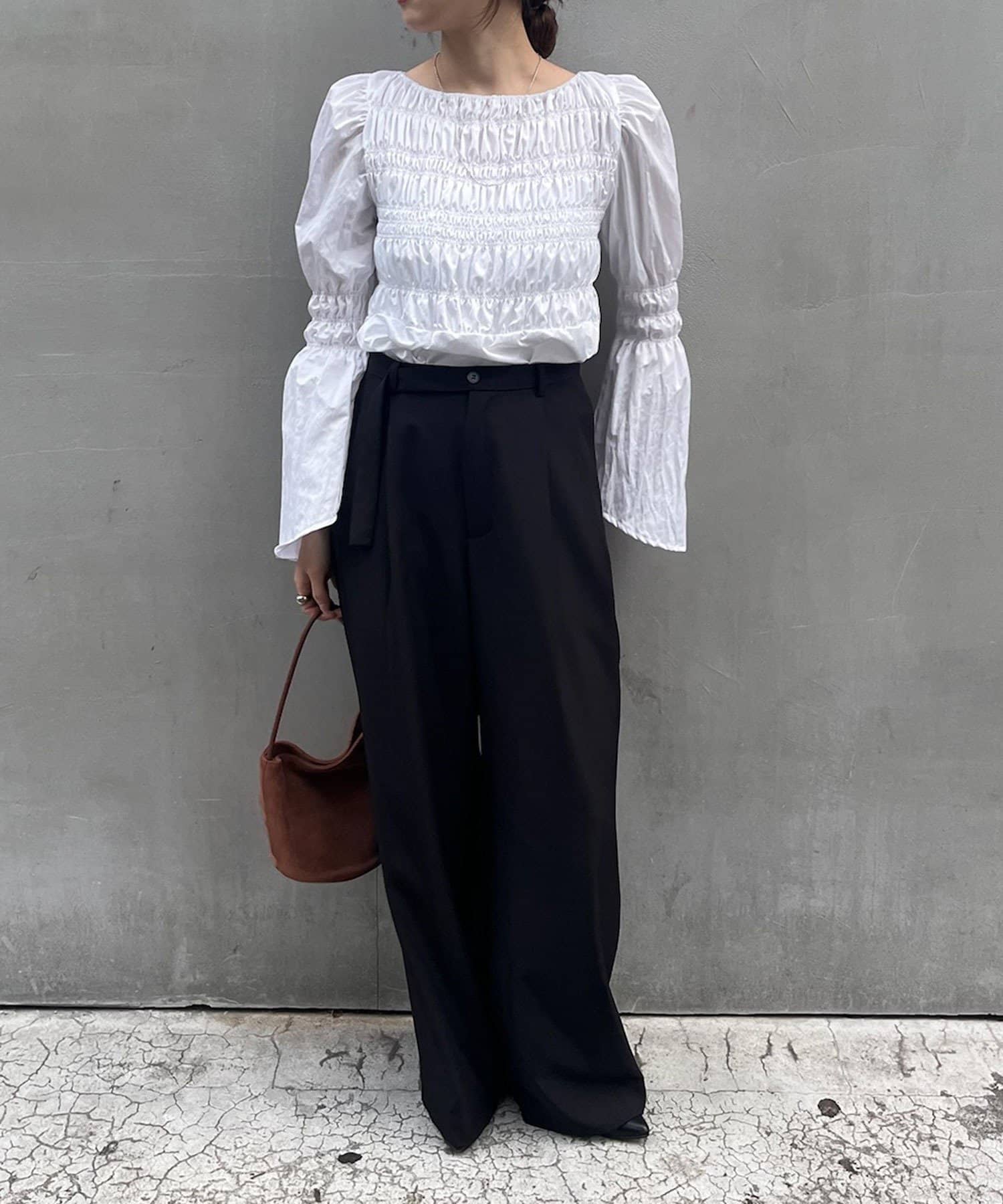 ・1枚でコーデが決まり、胸元に施されたシャーリングがトレンド感のあるデザインのアイテム。