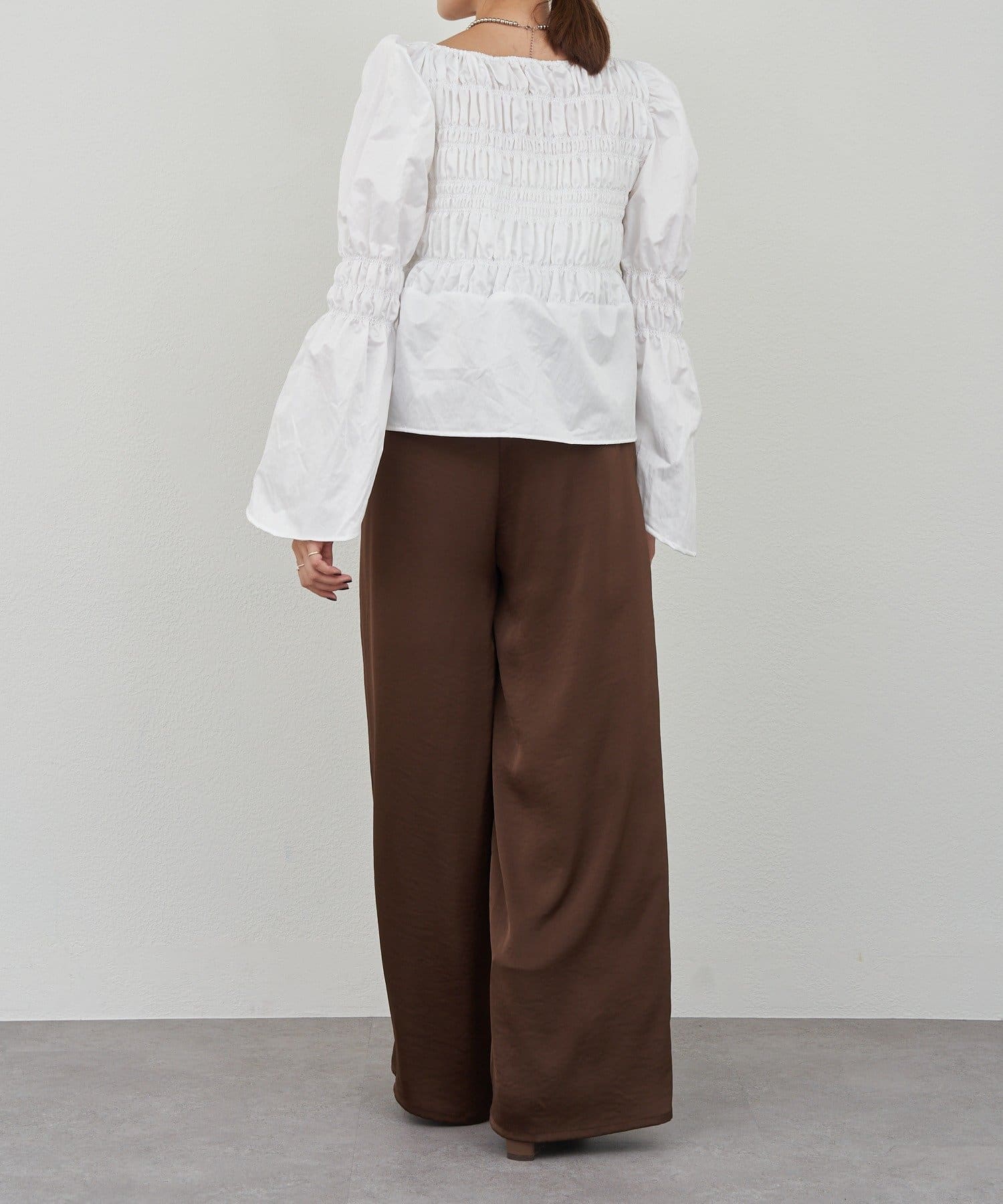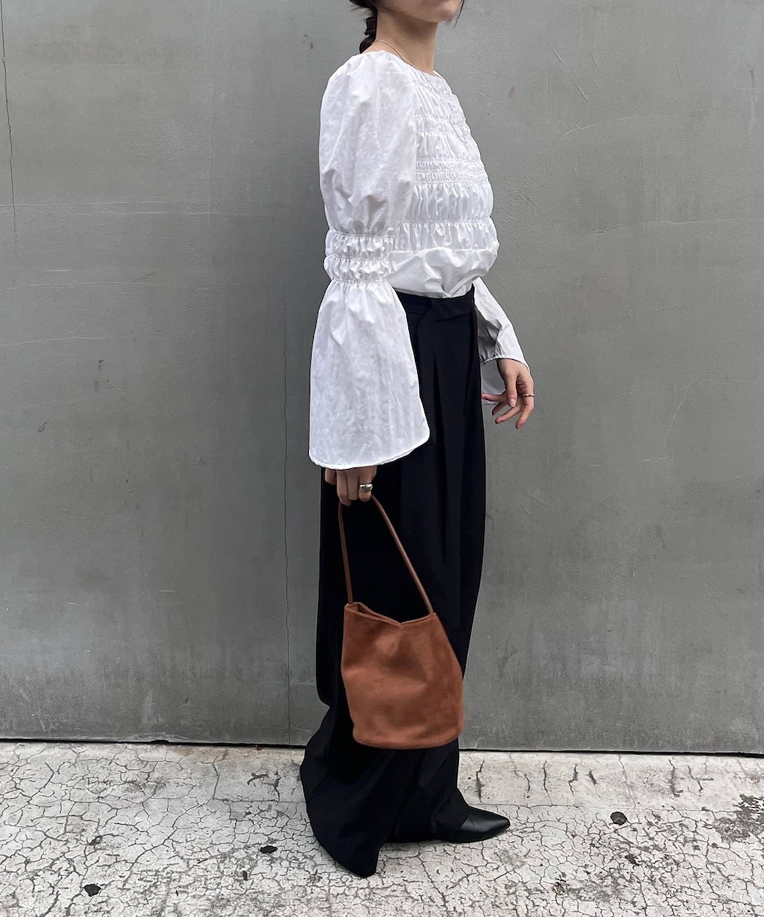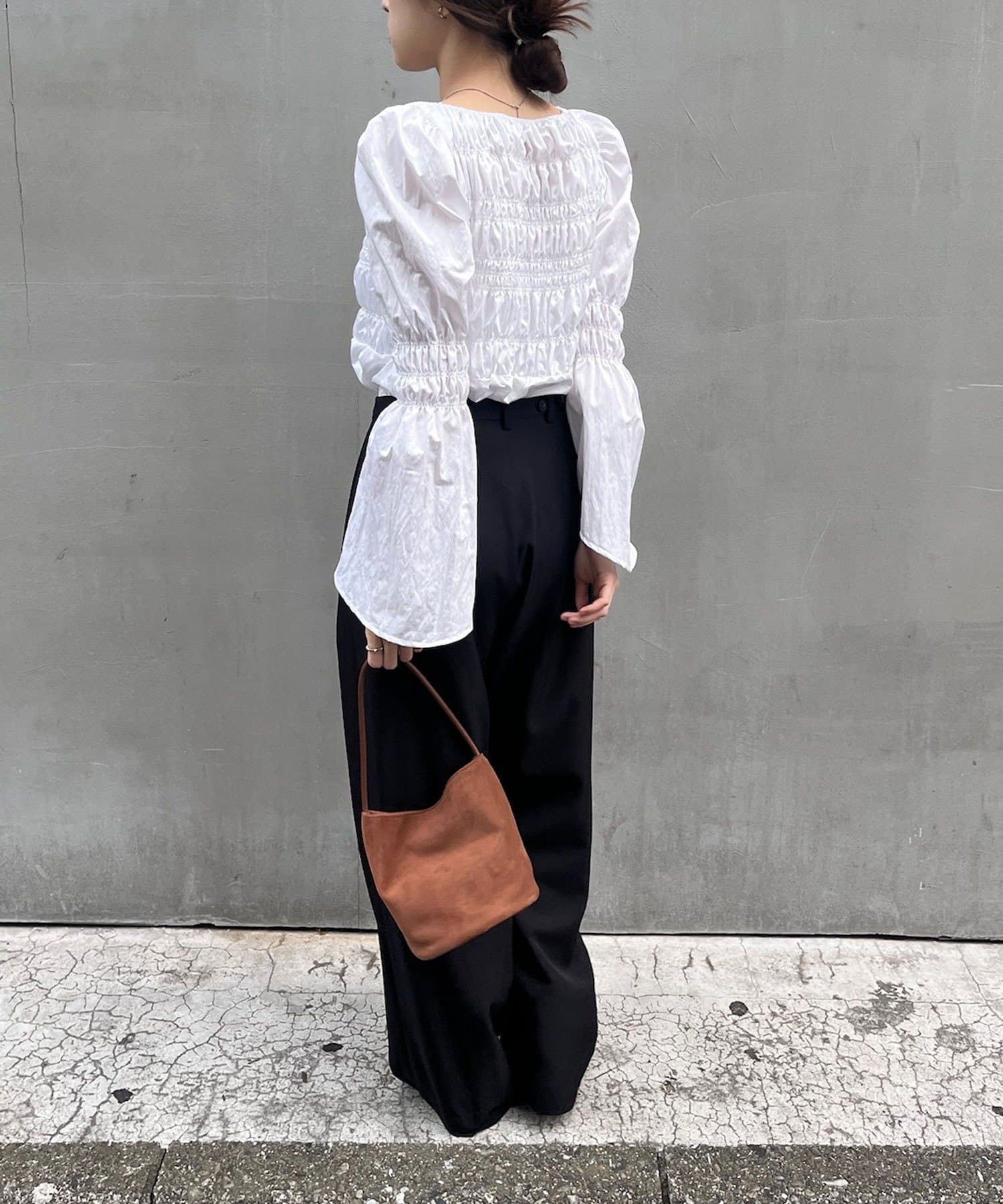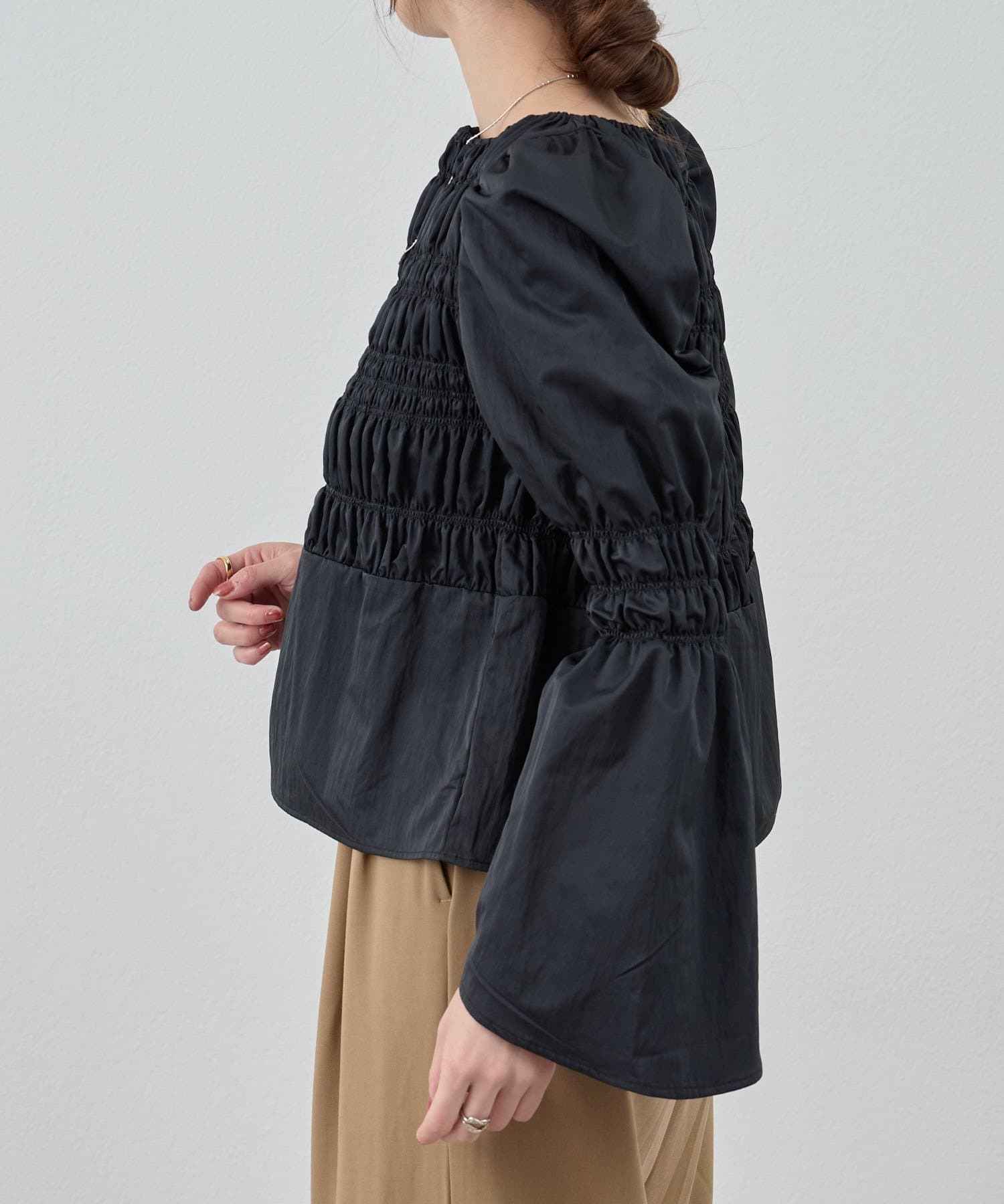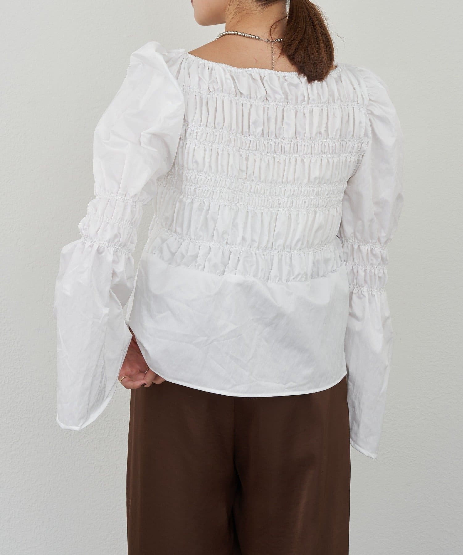 ・1枚でコーデが決まり、胸元に施されたシャーリングがトレンド感のあるデザインのアイテム。