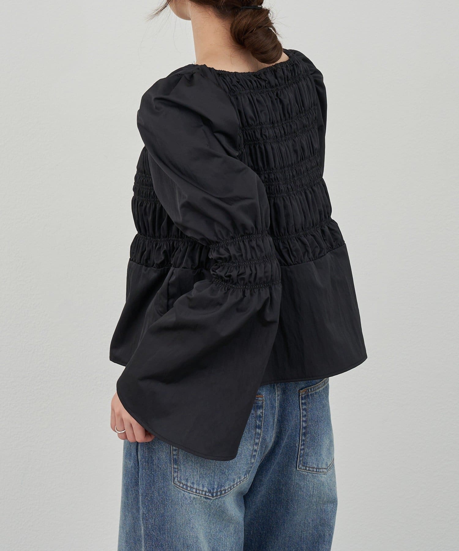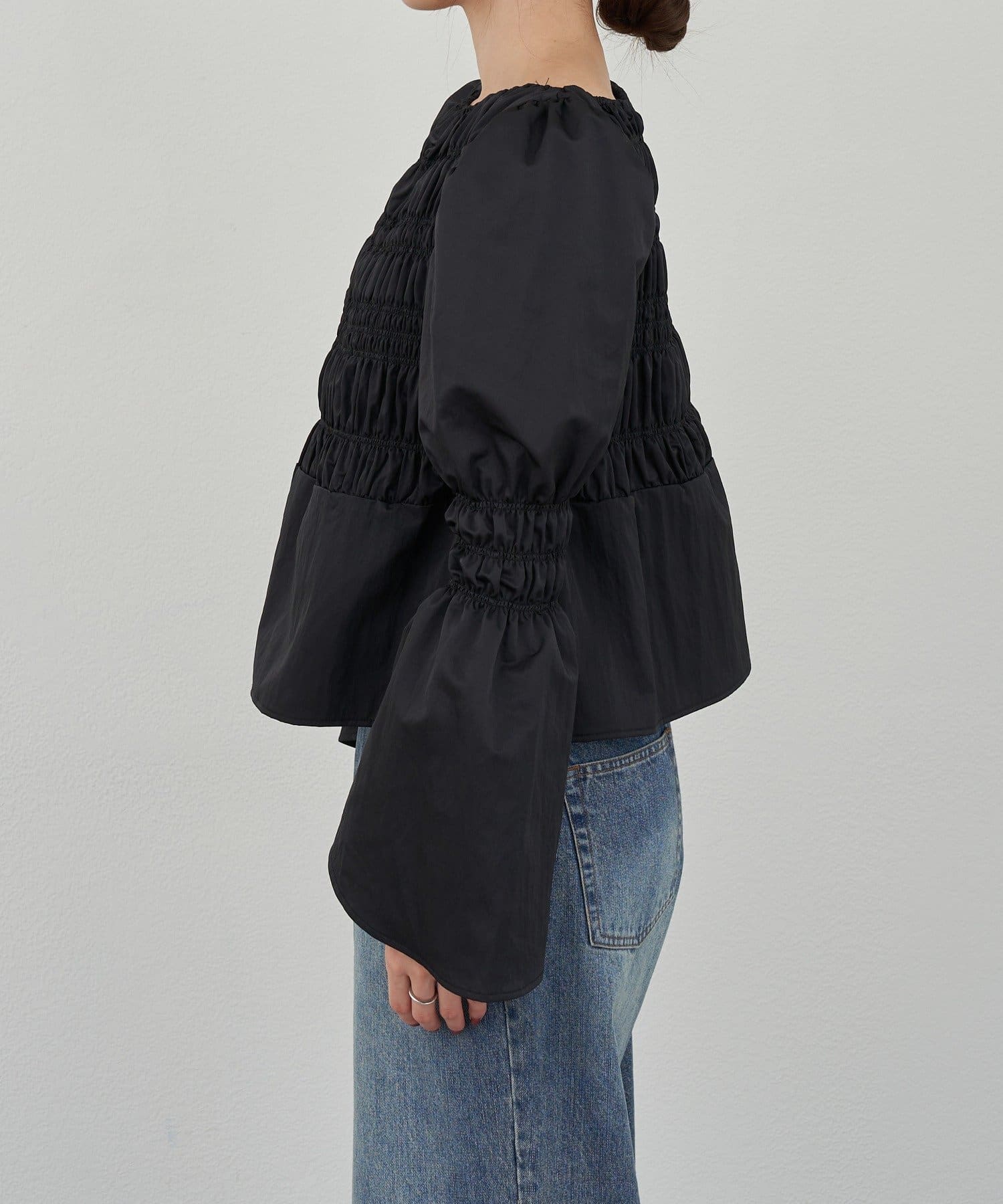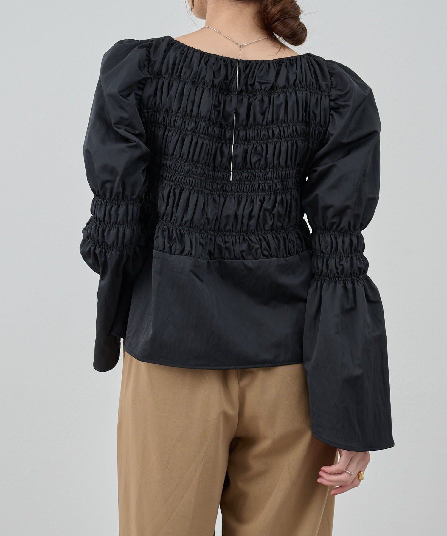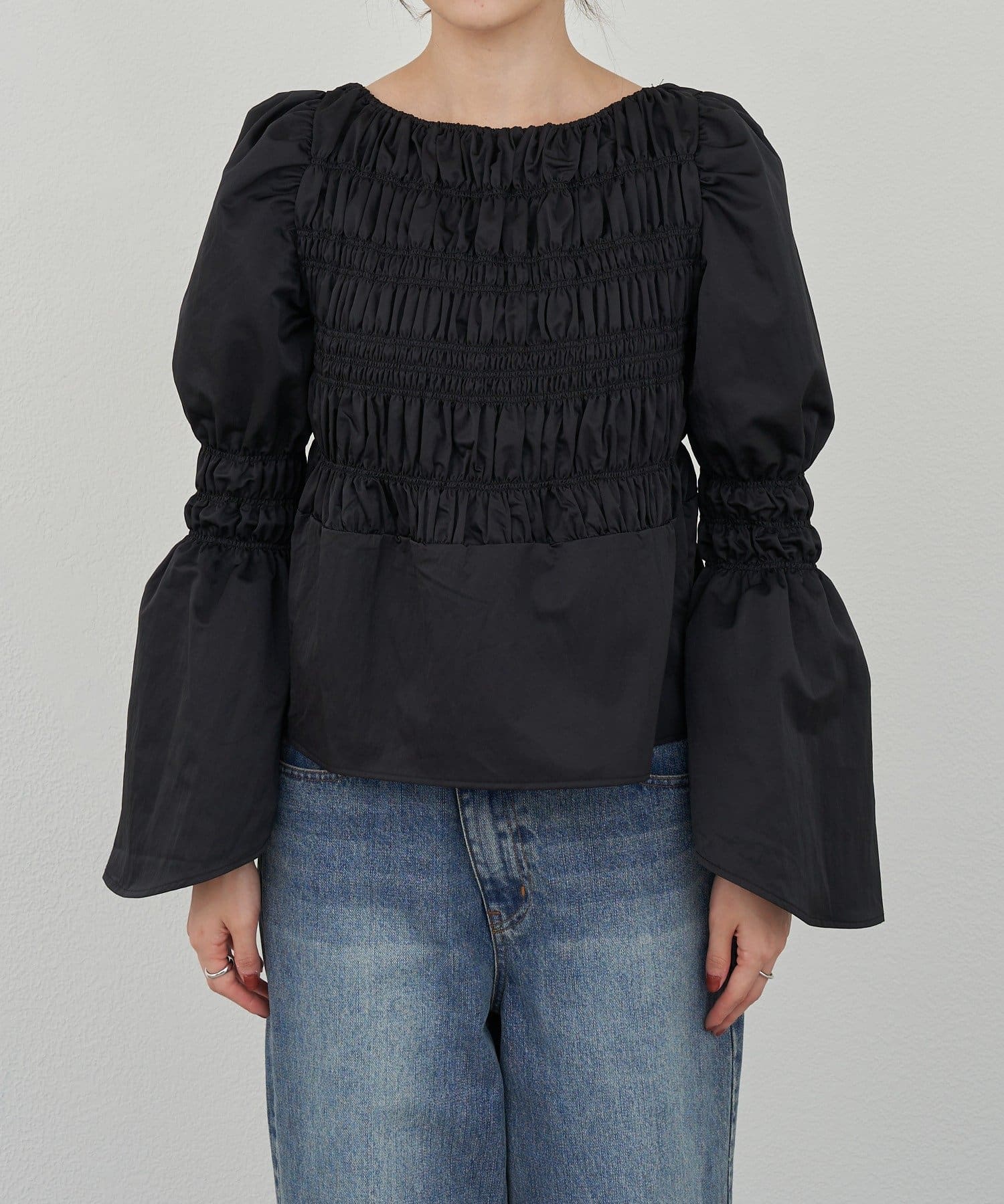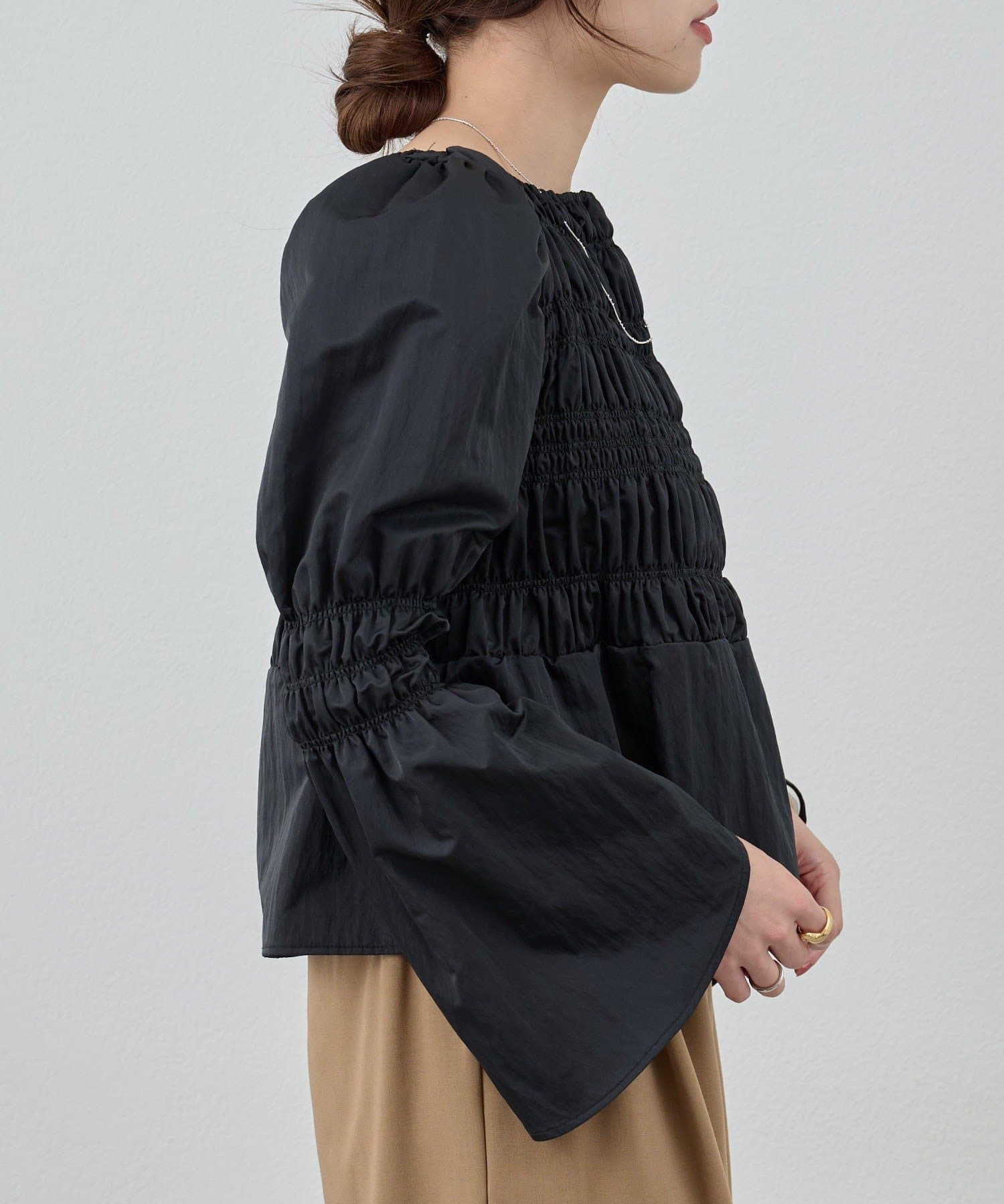 ・1枚でコーデが決まり、胸元に施されたシャーリングがトレンド感のあるデザインのアイテム。