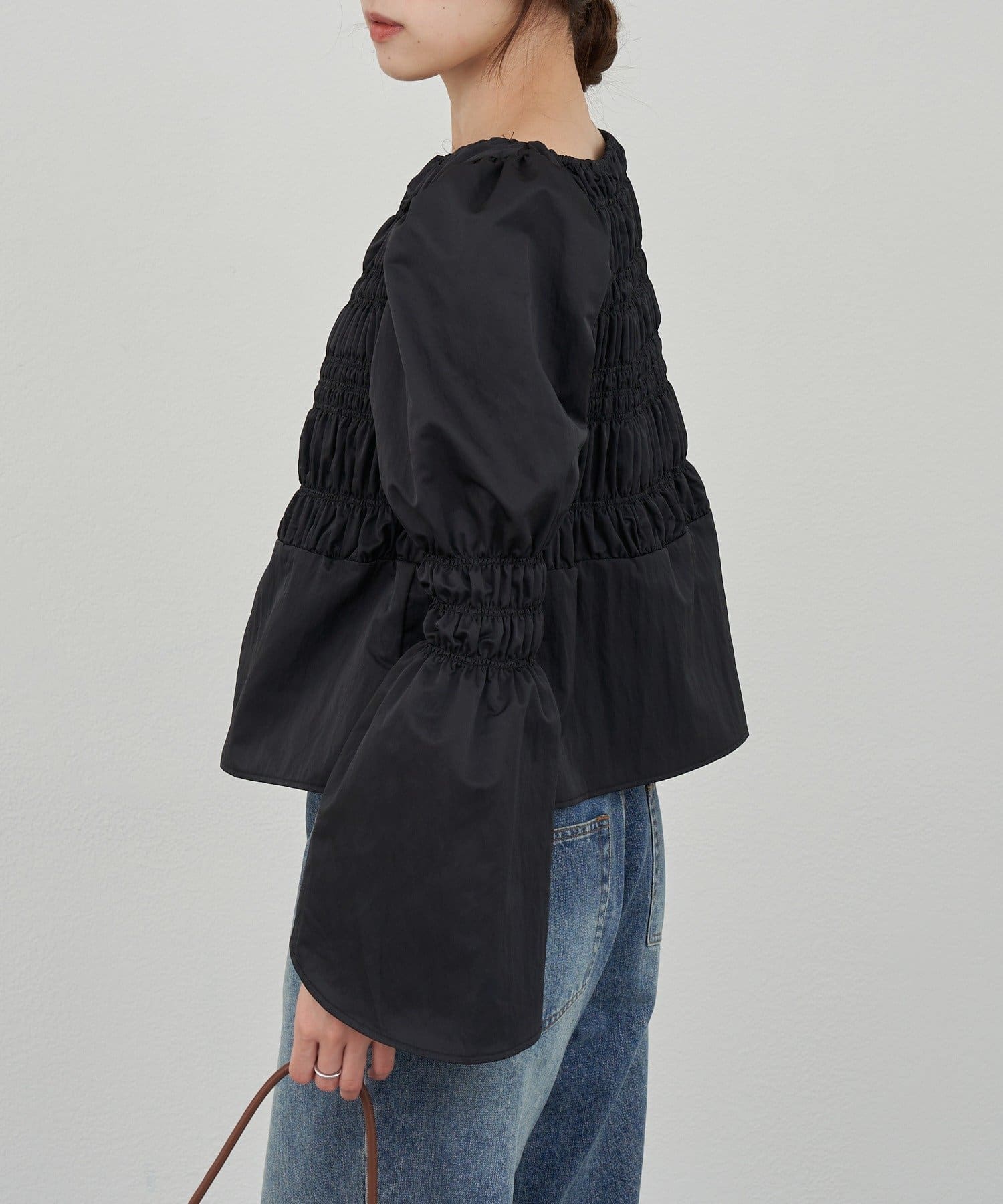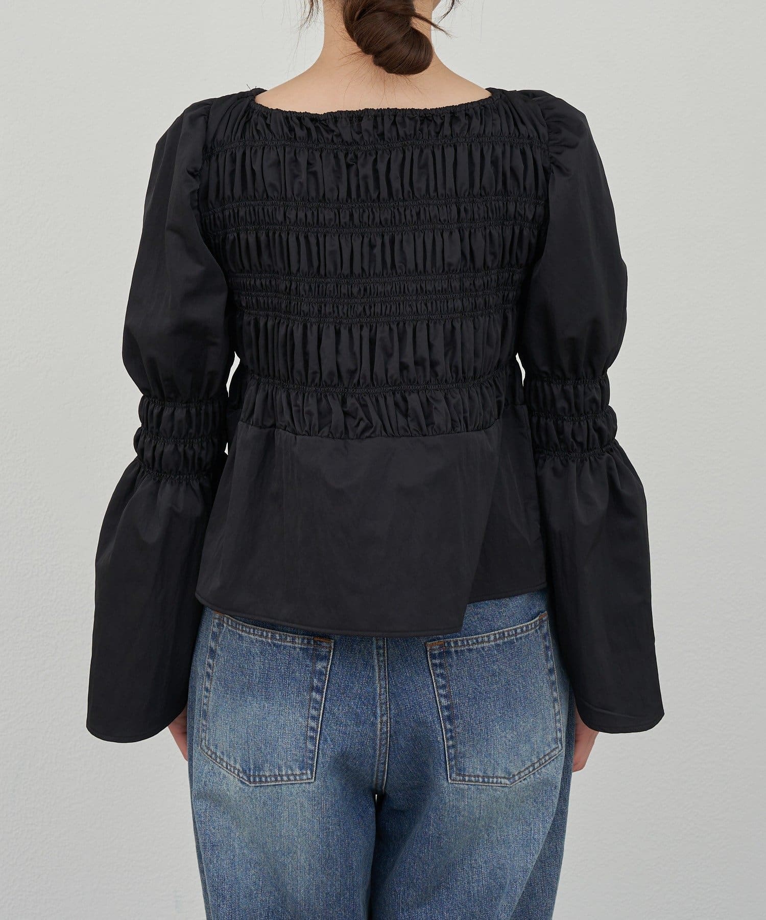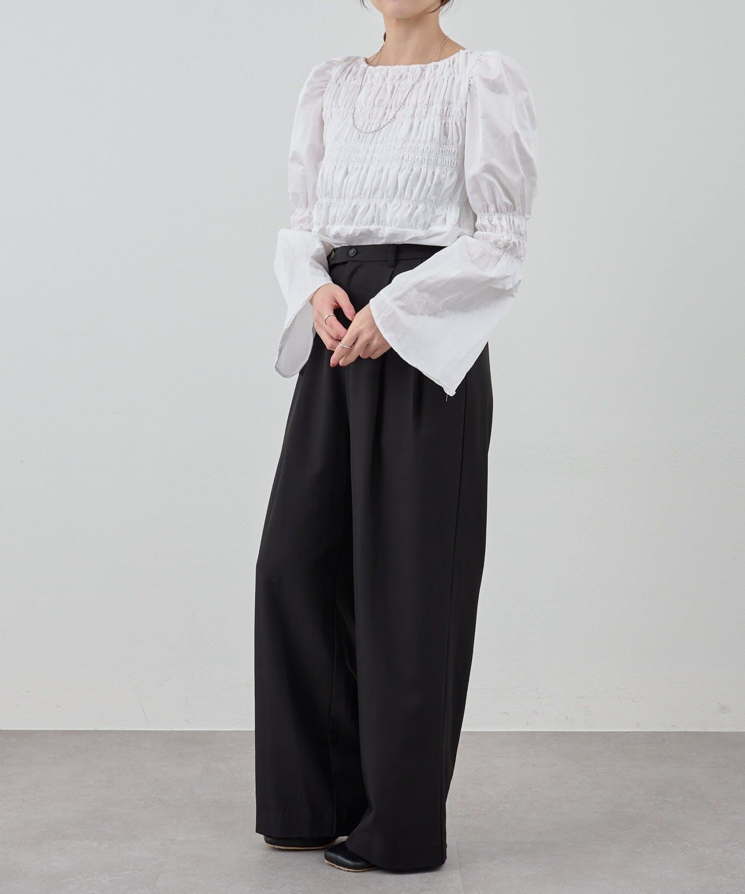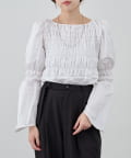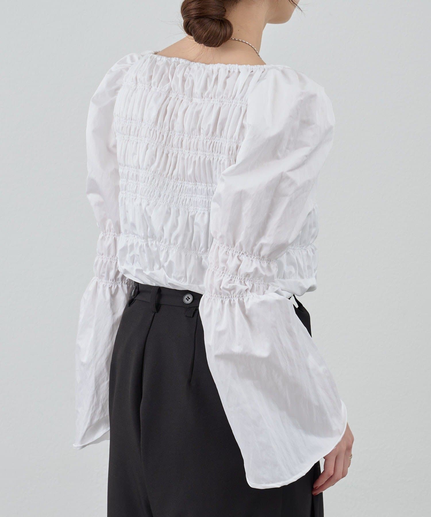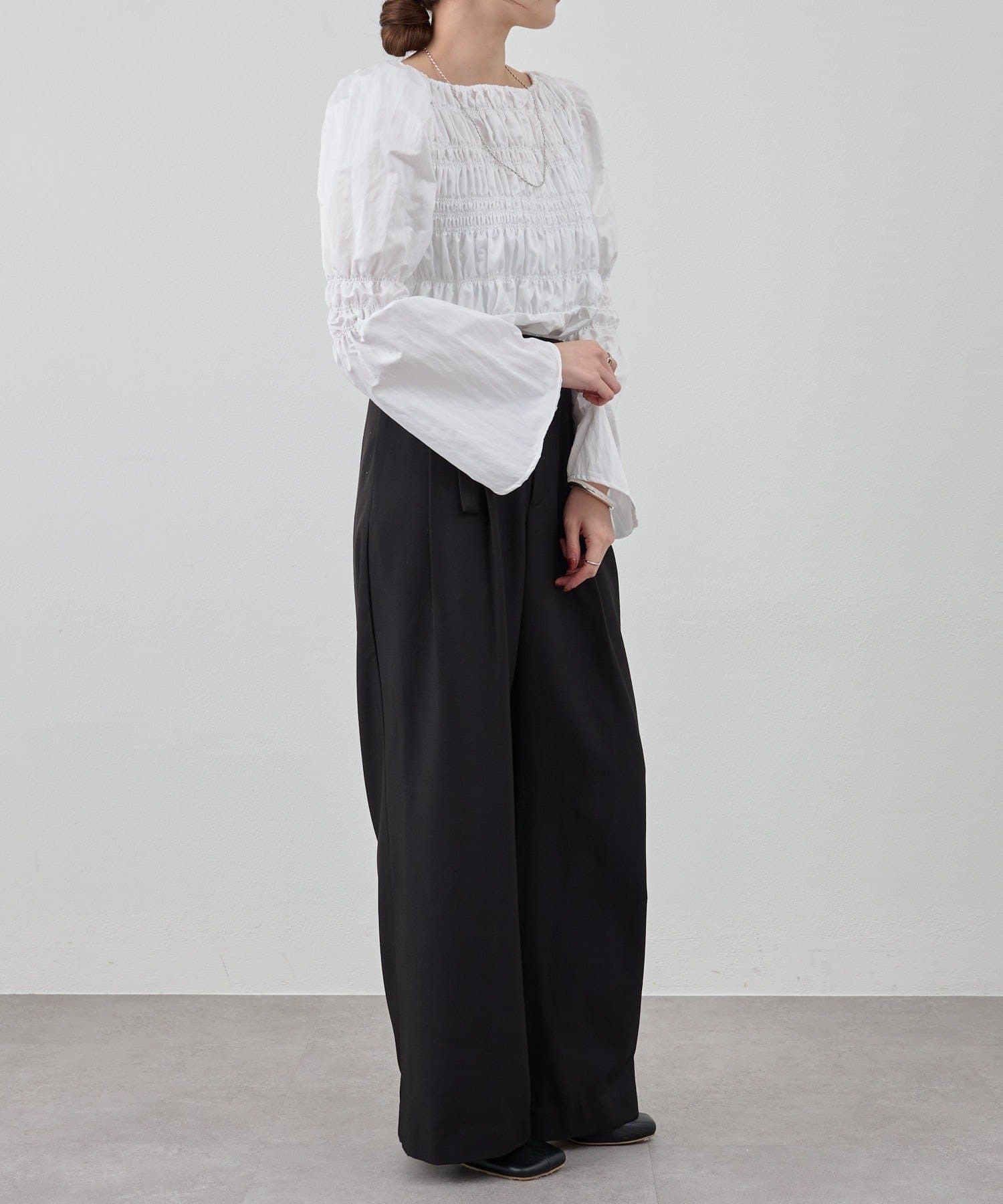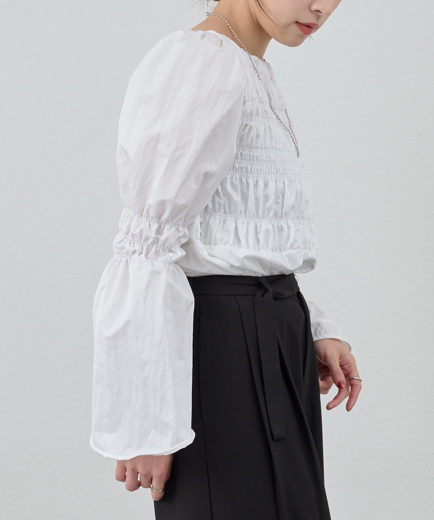 ・1枚でコーデが決まり、胸元に施されたシャーリングがトレンド感のあるデザインのアイテム。