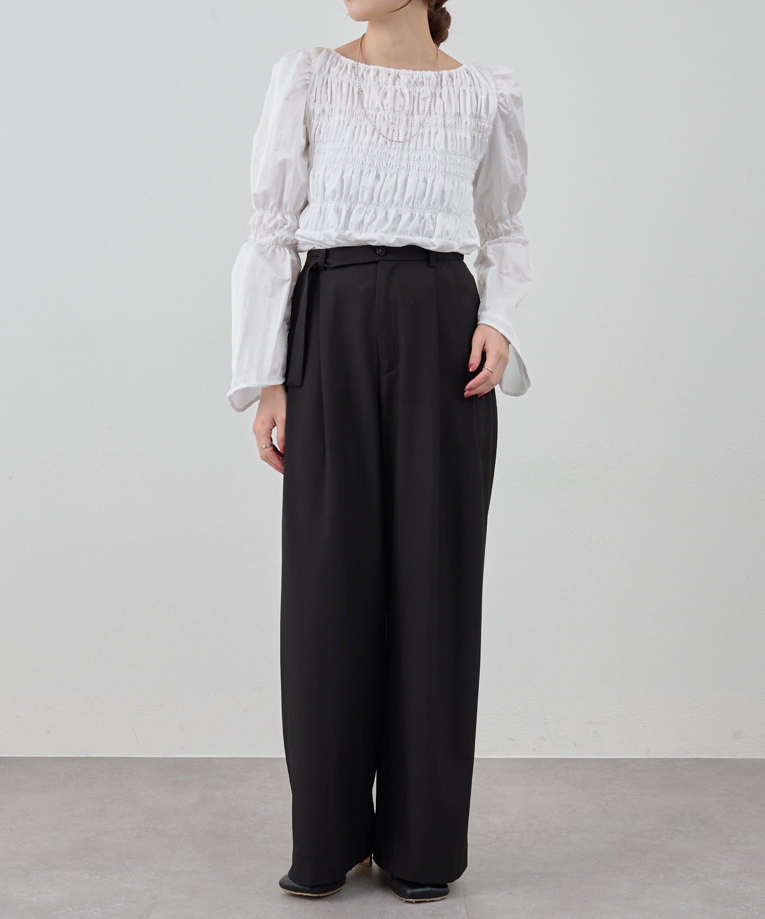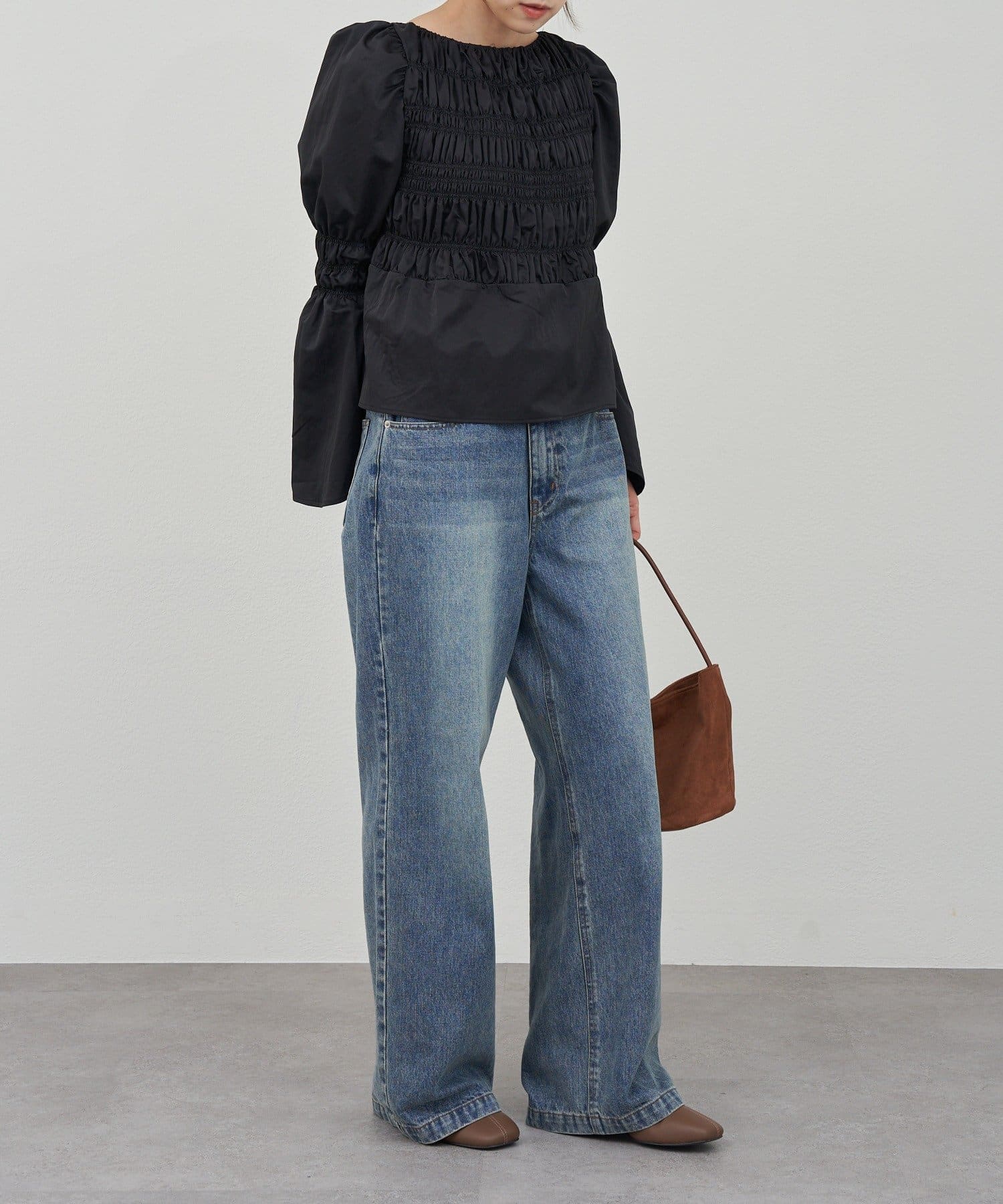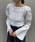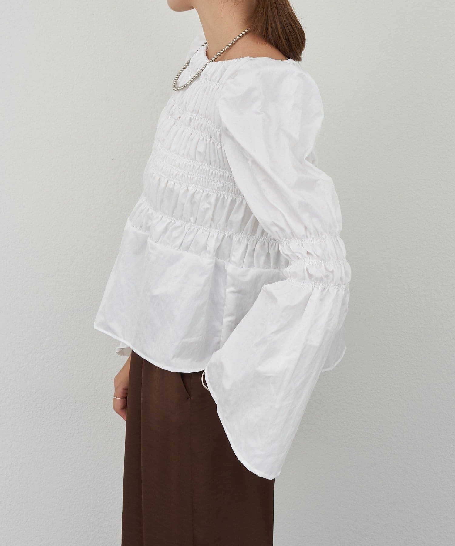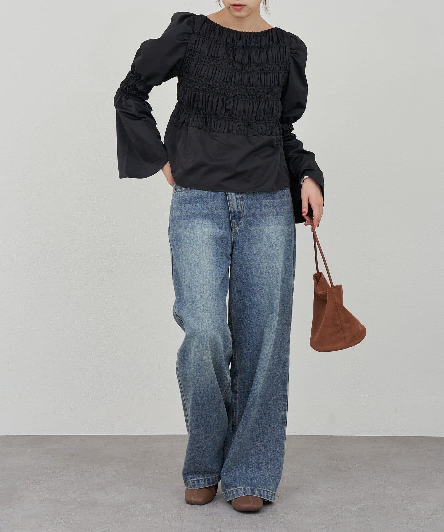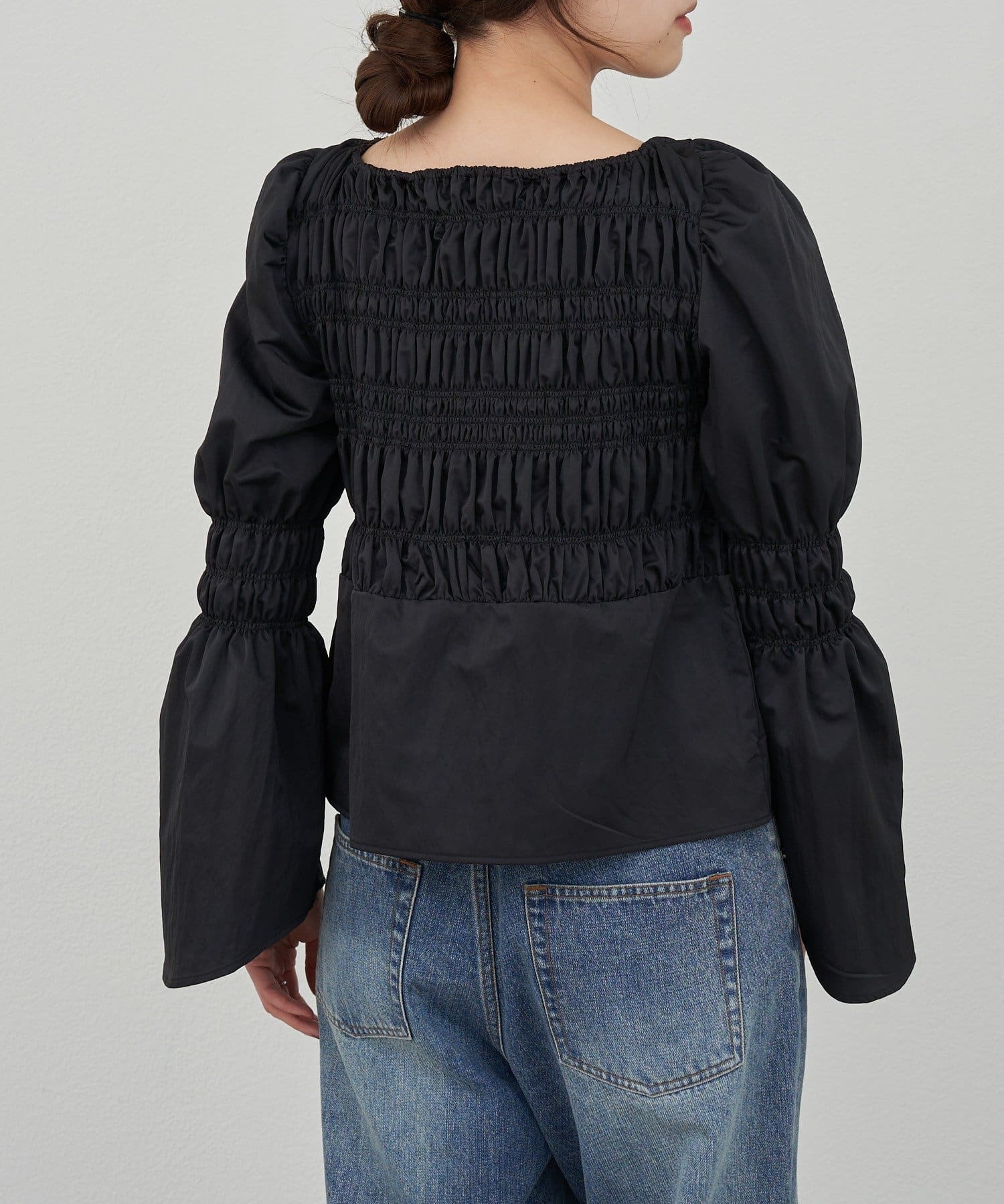 ・1枚でコーデが決まり、胸元に施されたシャーリングがトレンド感のあるデザインのアイテム。