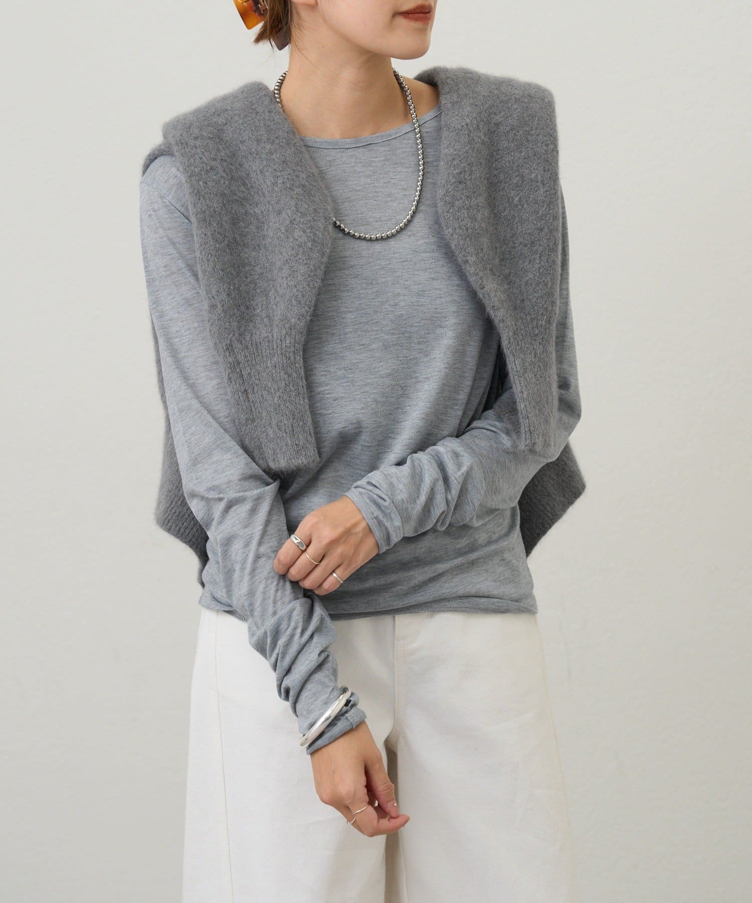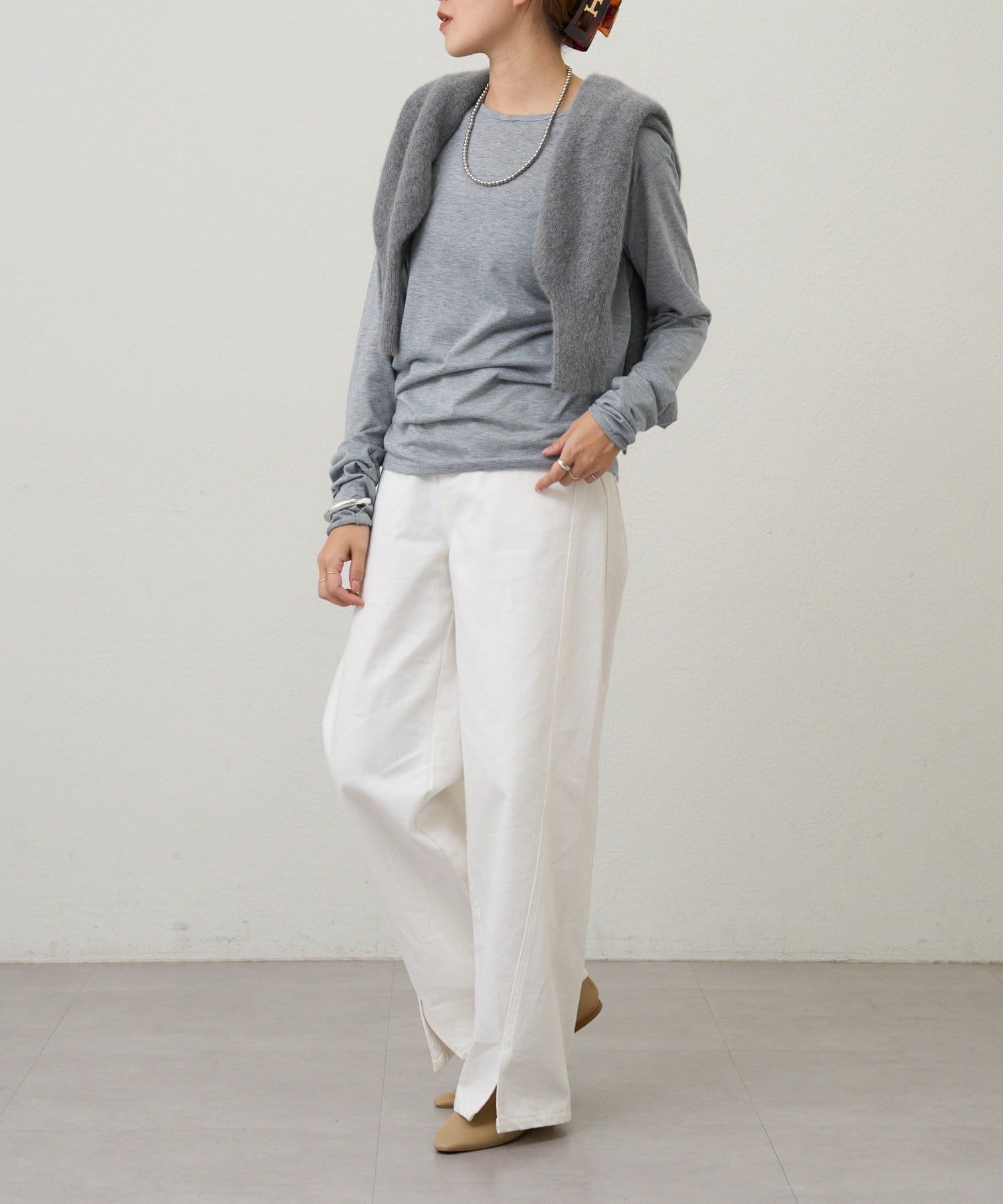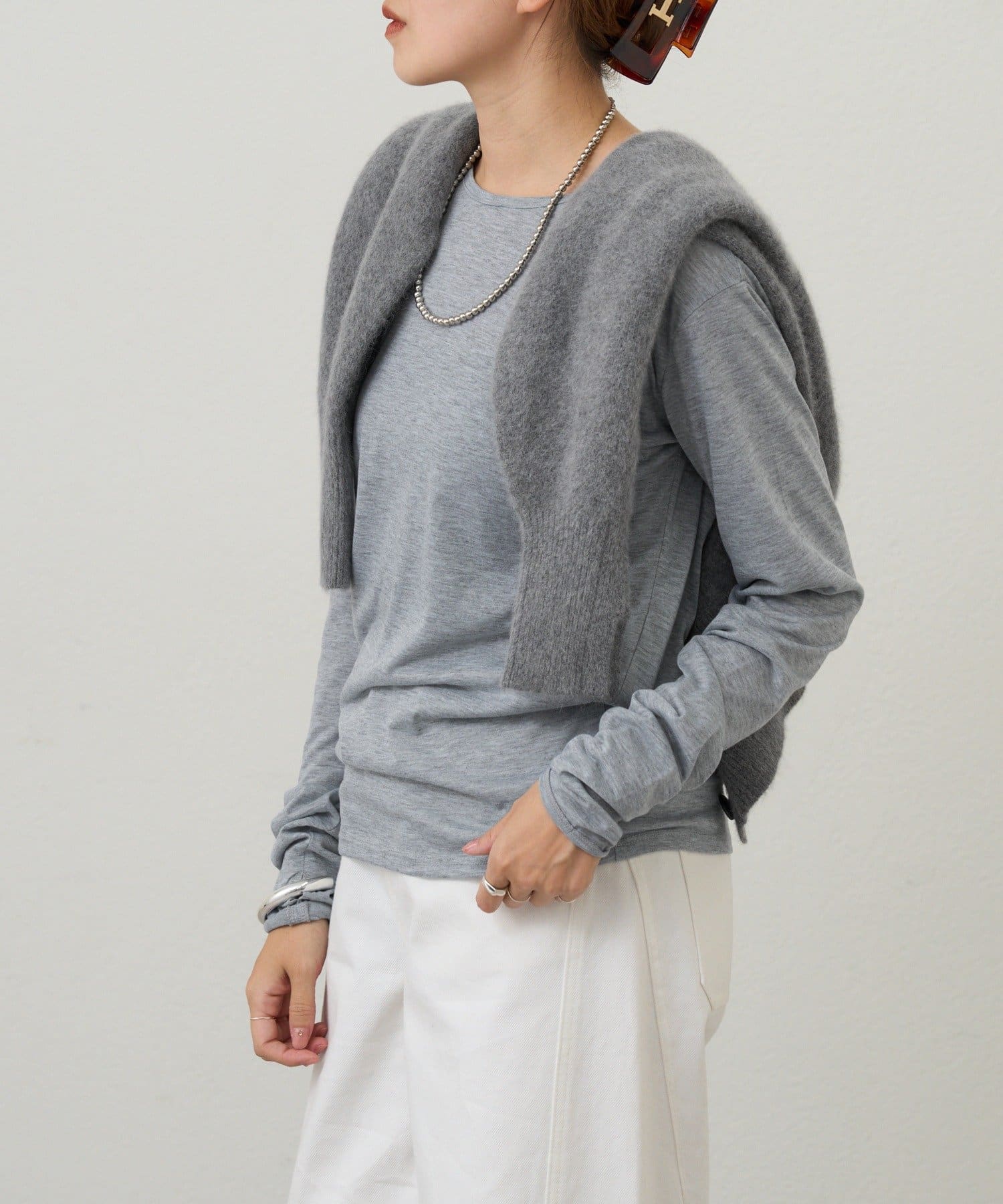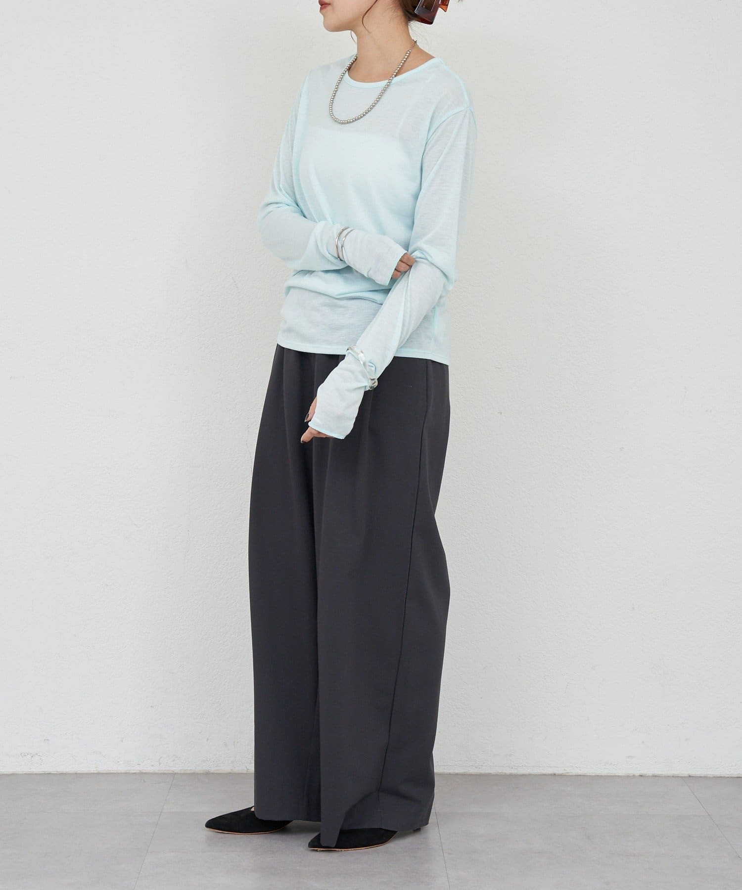 少し長めの袖は、たゆませたりアウターの袖から覗かせたりすることもできてスタイリングの幅が広がります。