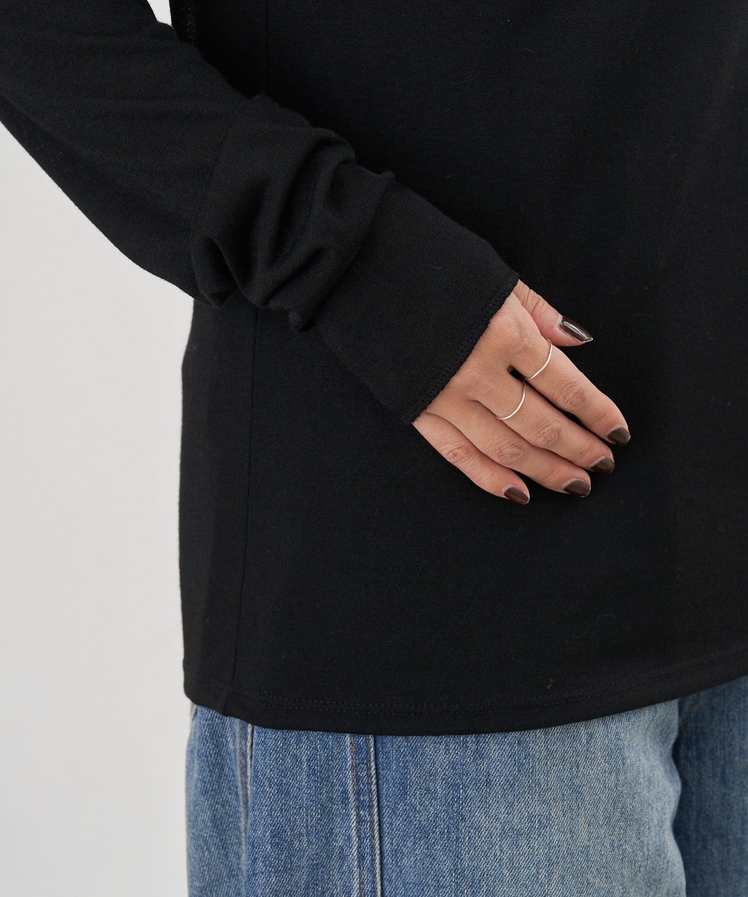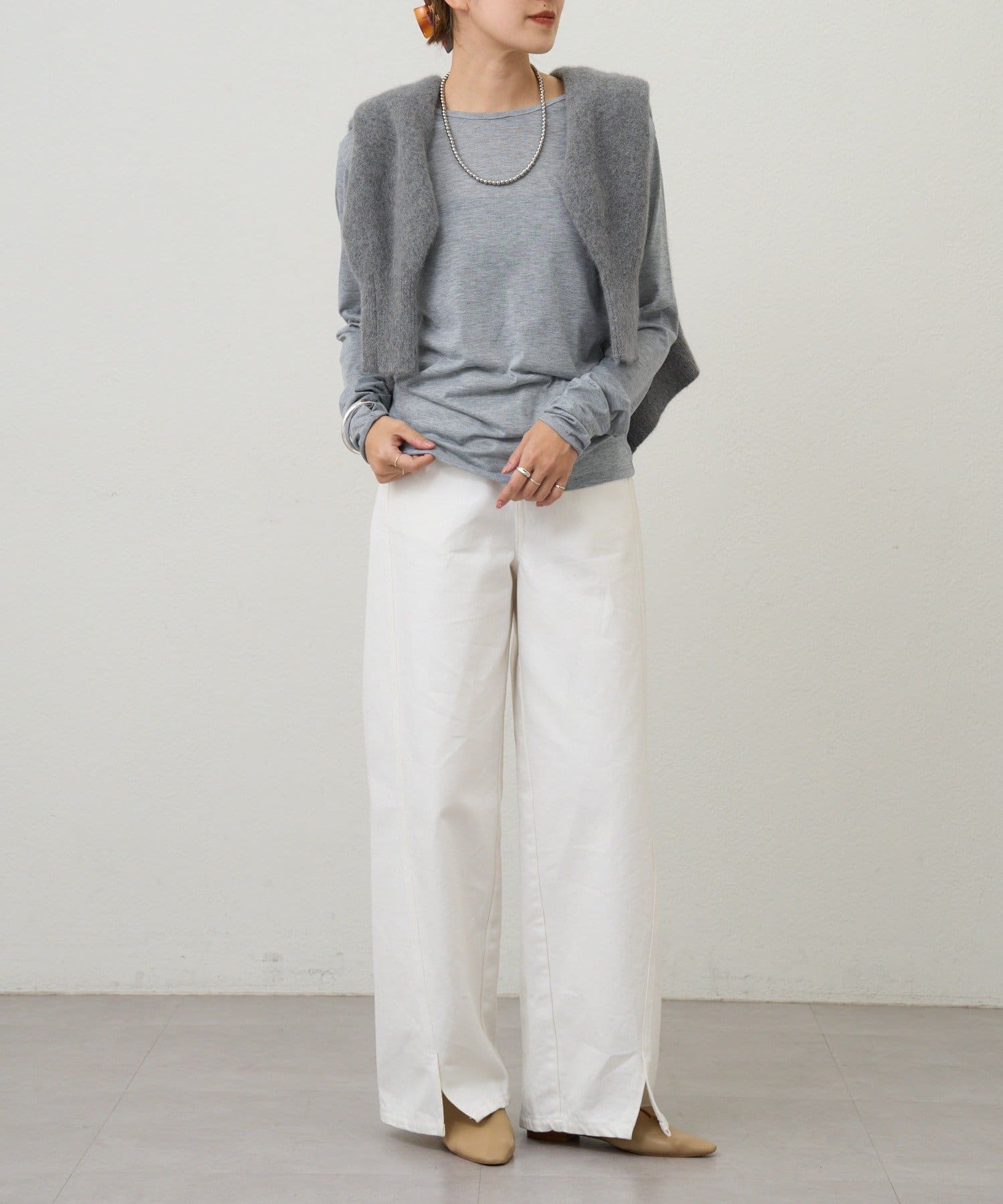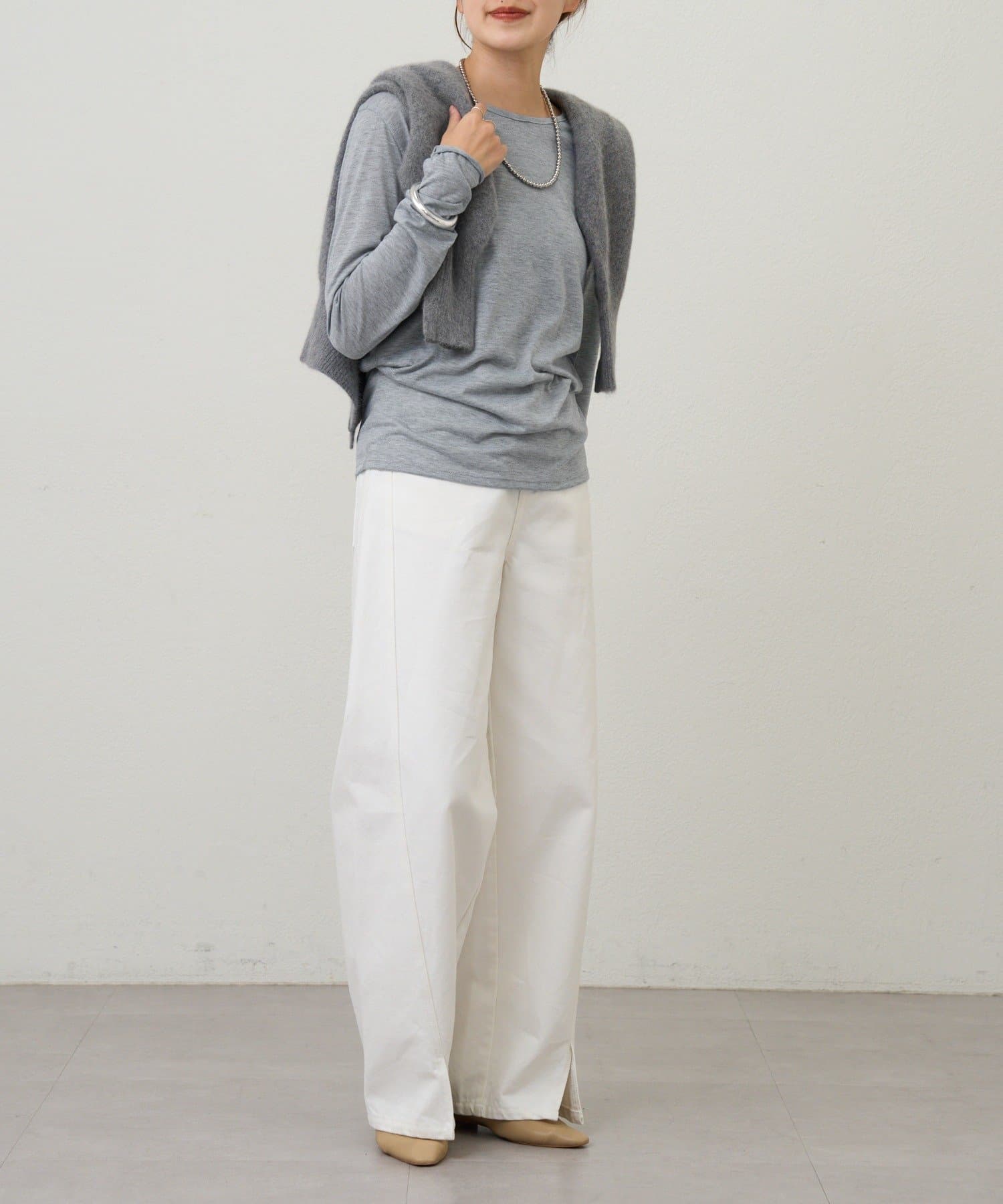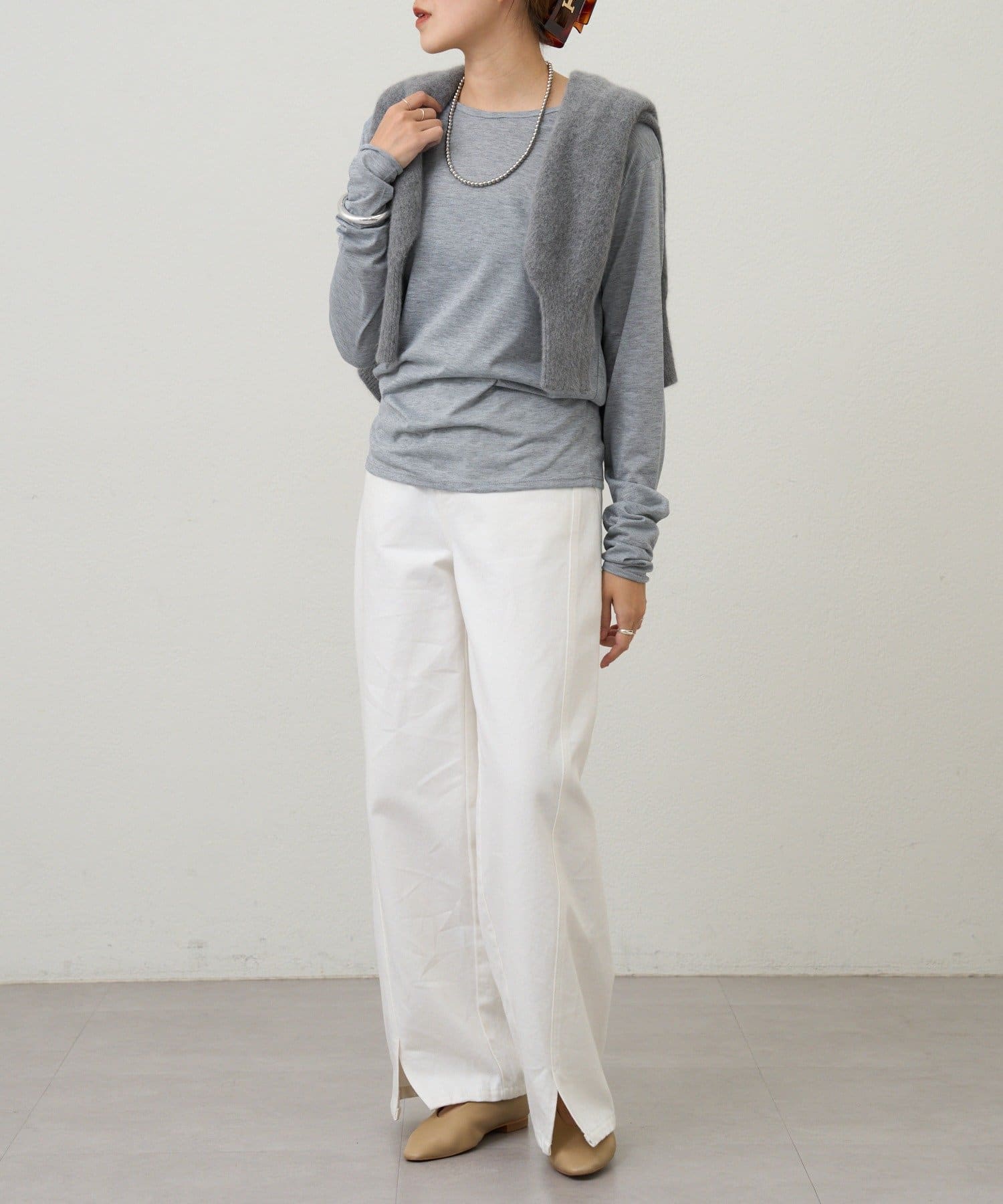 少し長めの袖は、たゆませたりアウターの袖から覗かせたりすることもできてスタイリングの幅が広がります。