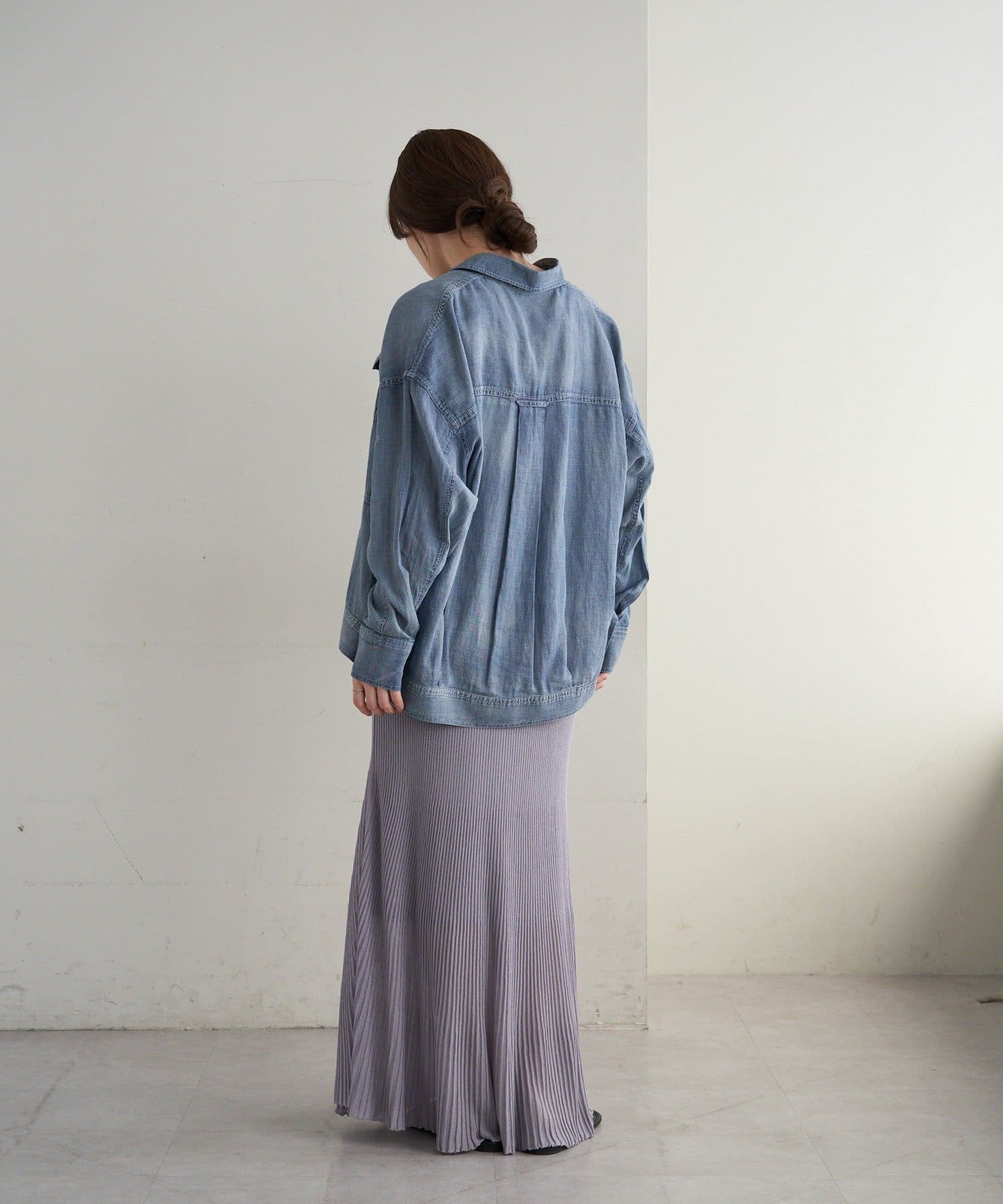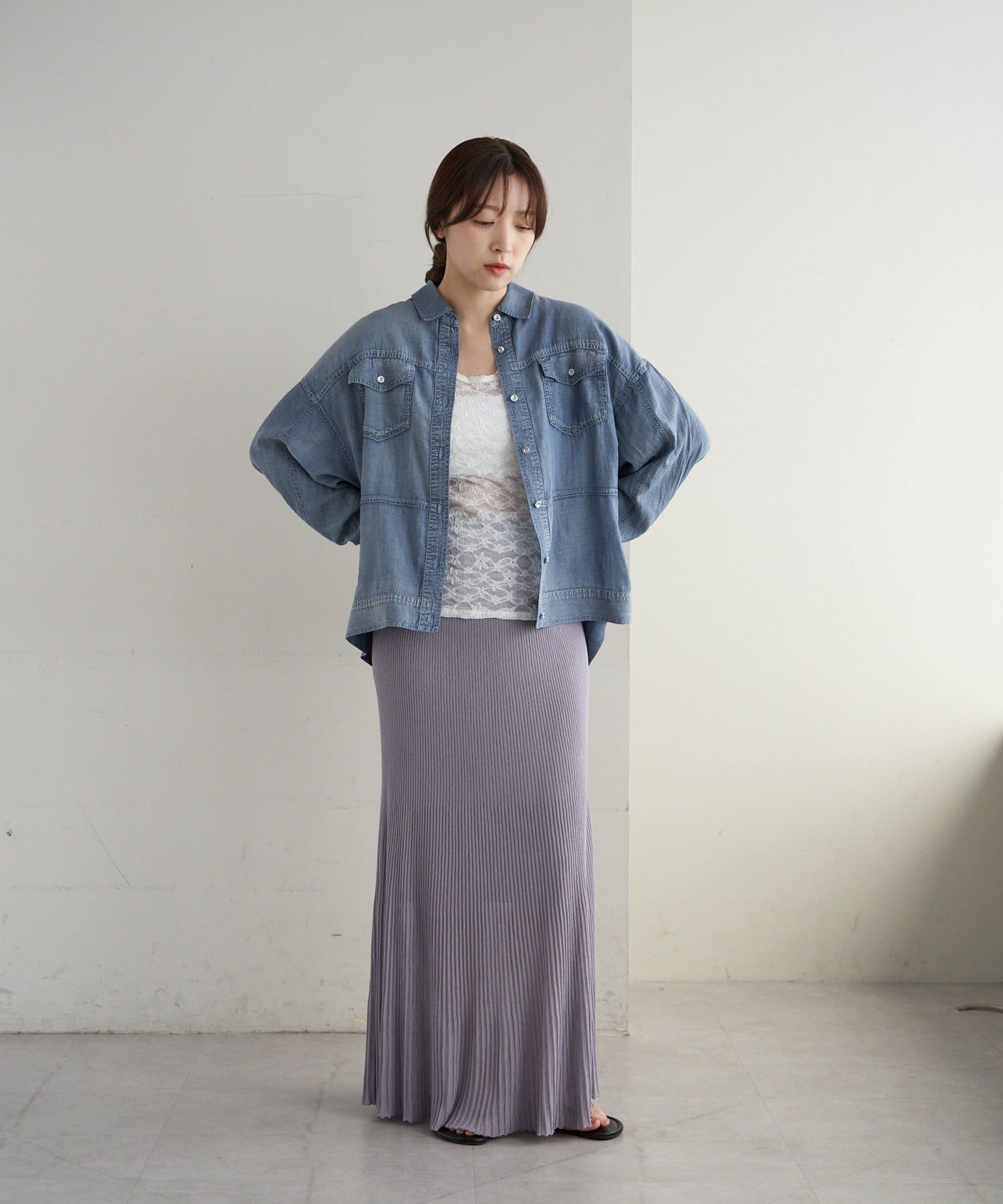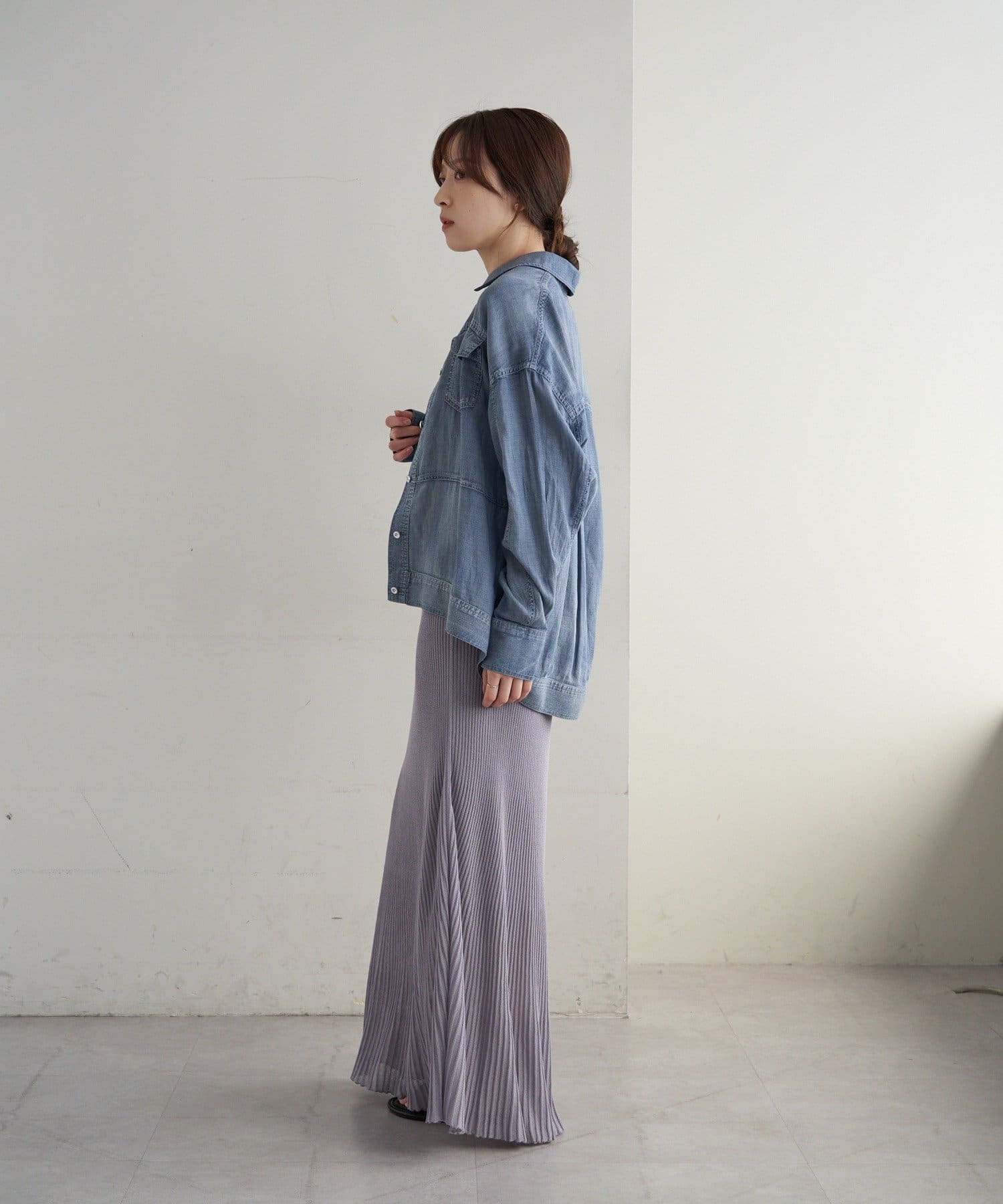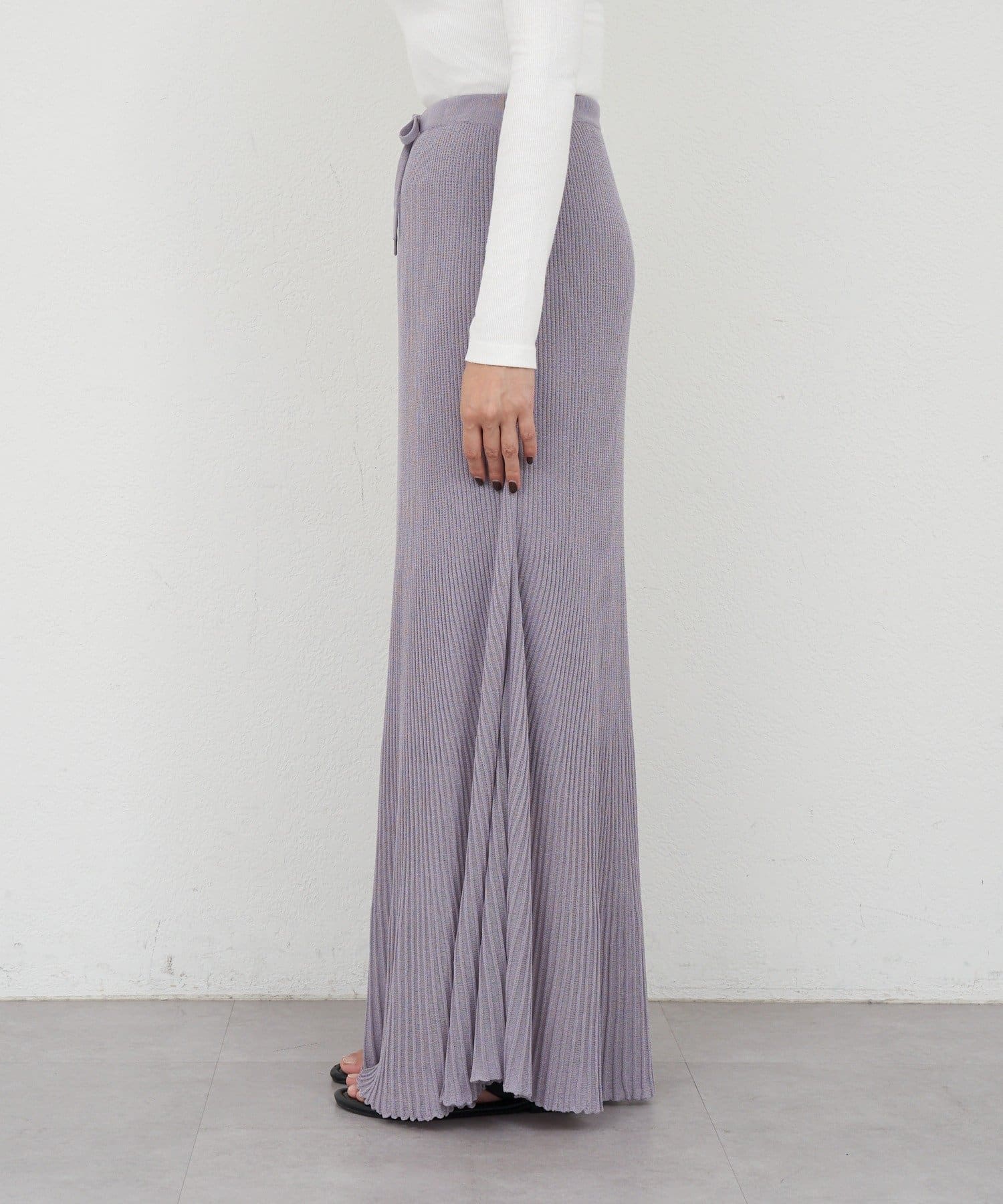 夏のTシャツスタイルやカジュアルなトップスと合わせて着たい、夏用のプリーツシアーニットスカート。軽やかな透け感のあるシアー編地にプリーツ加工をかけており、動くたびにゆらゆらと裾回りが広がる、気分の上がる1着です。中には共糸の編地で膝上丈の裏地を付けているので、腰回りは透けずに安心感のあるデザインです。