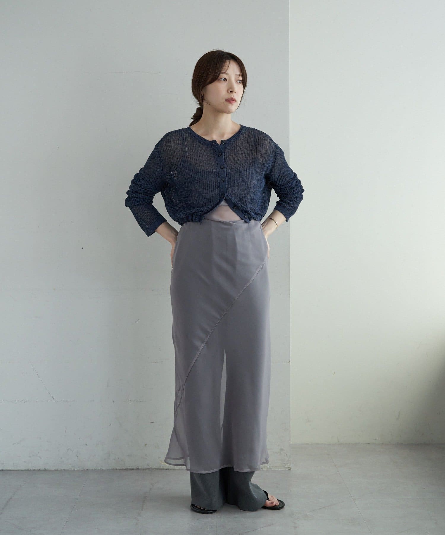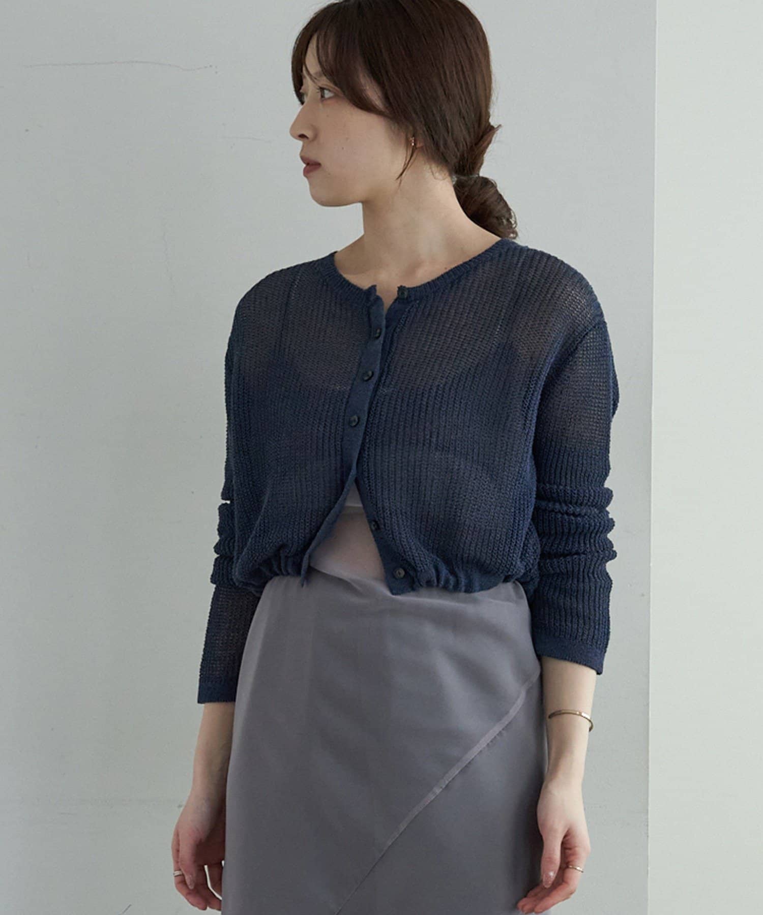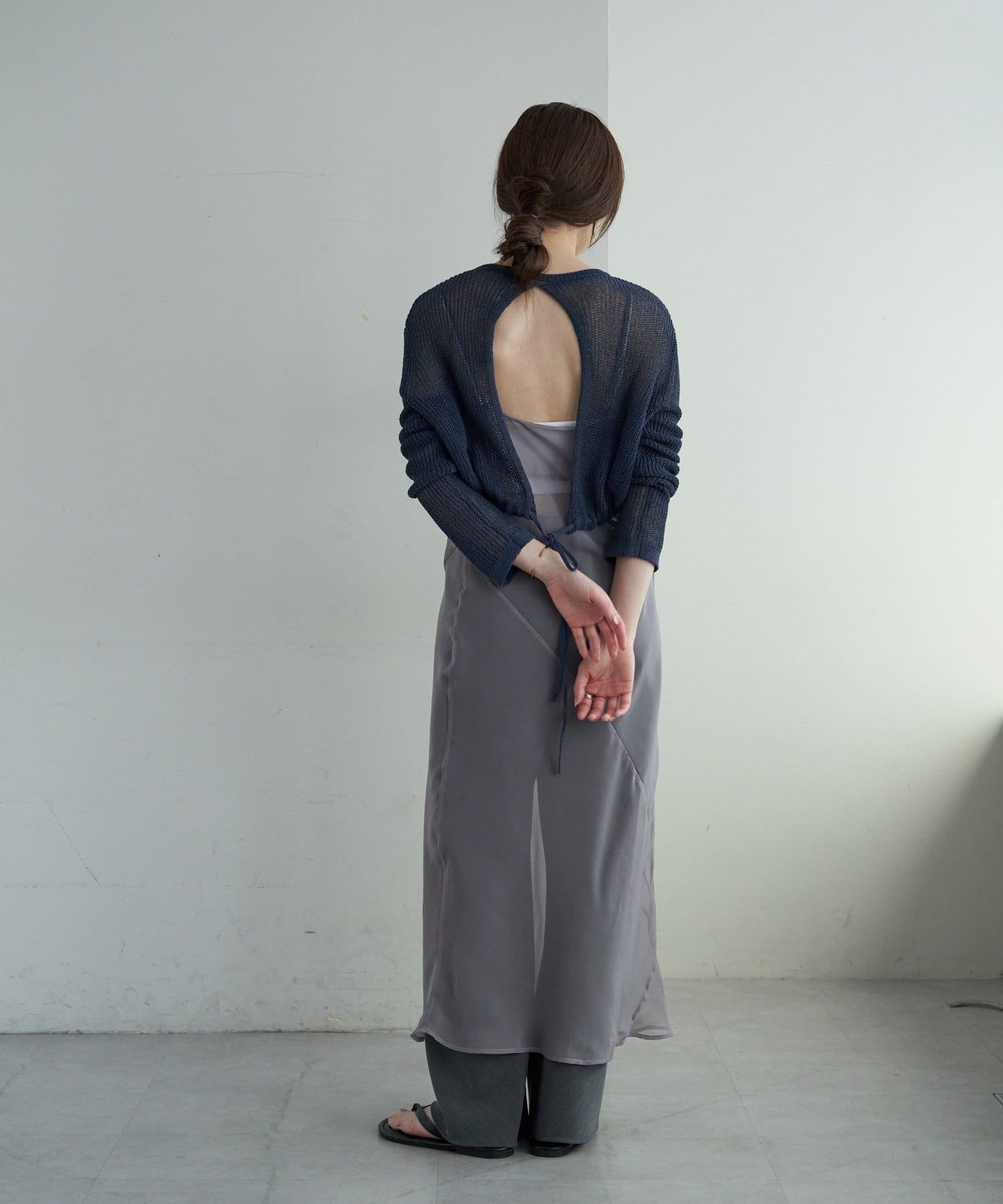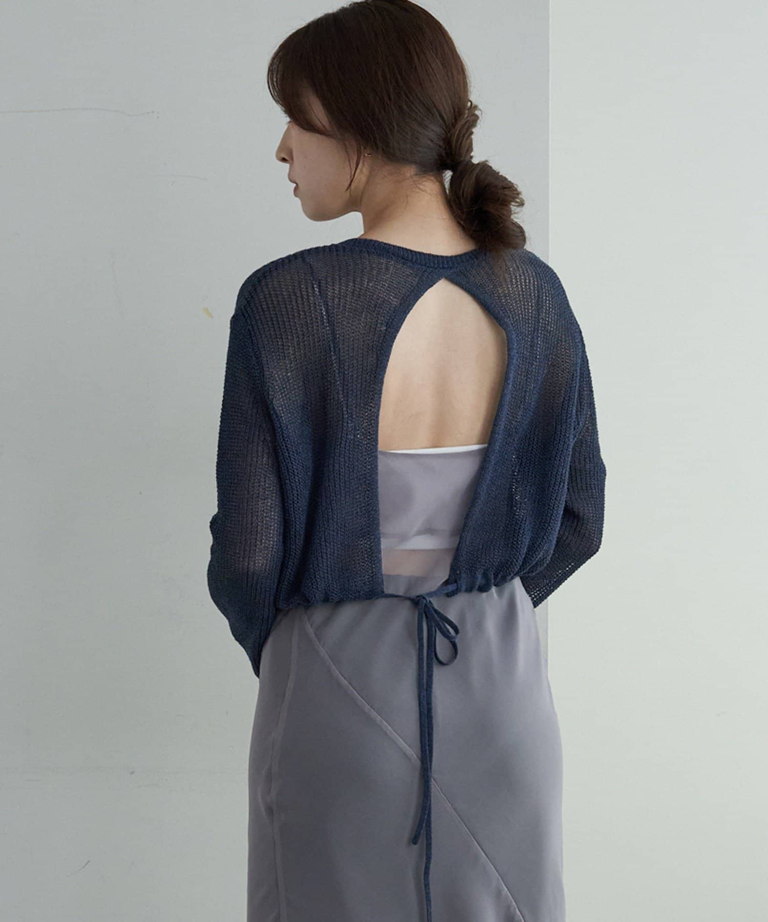 背中が大きく開いたデザインが目を引く、シアーのサマーニットカーディガン。シャリ感があるペーパーヤーンを使用しており、夏も肌離れが良く、涼しく着用いただけます。裾にぐるりと紐が内蔵されており、後ろで紐を絞って裾にギャザーを寄せられる仕様です。