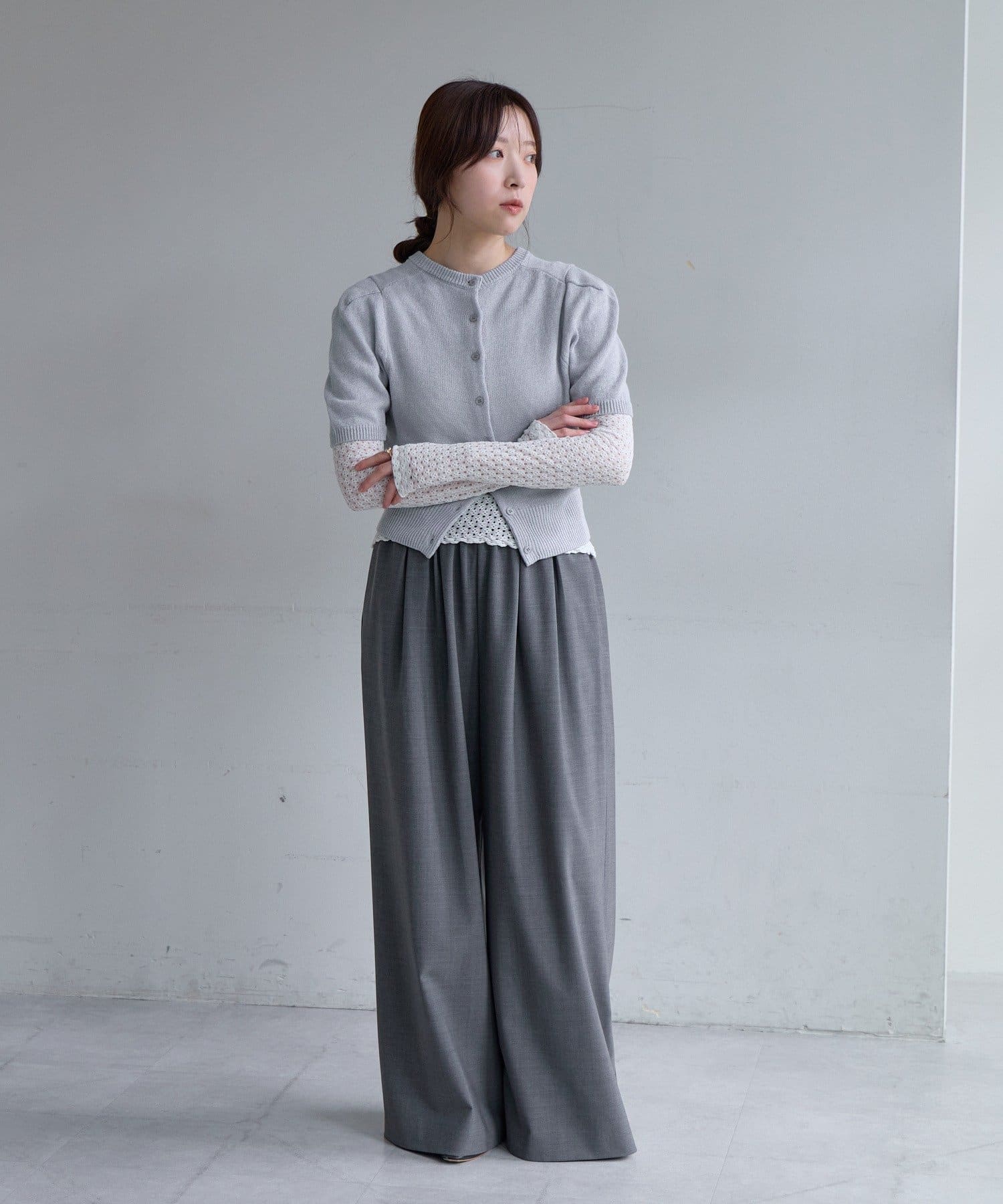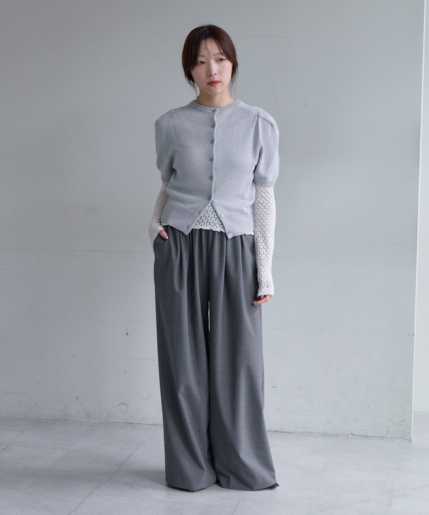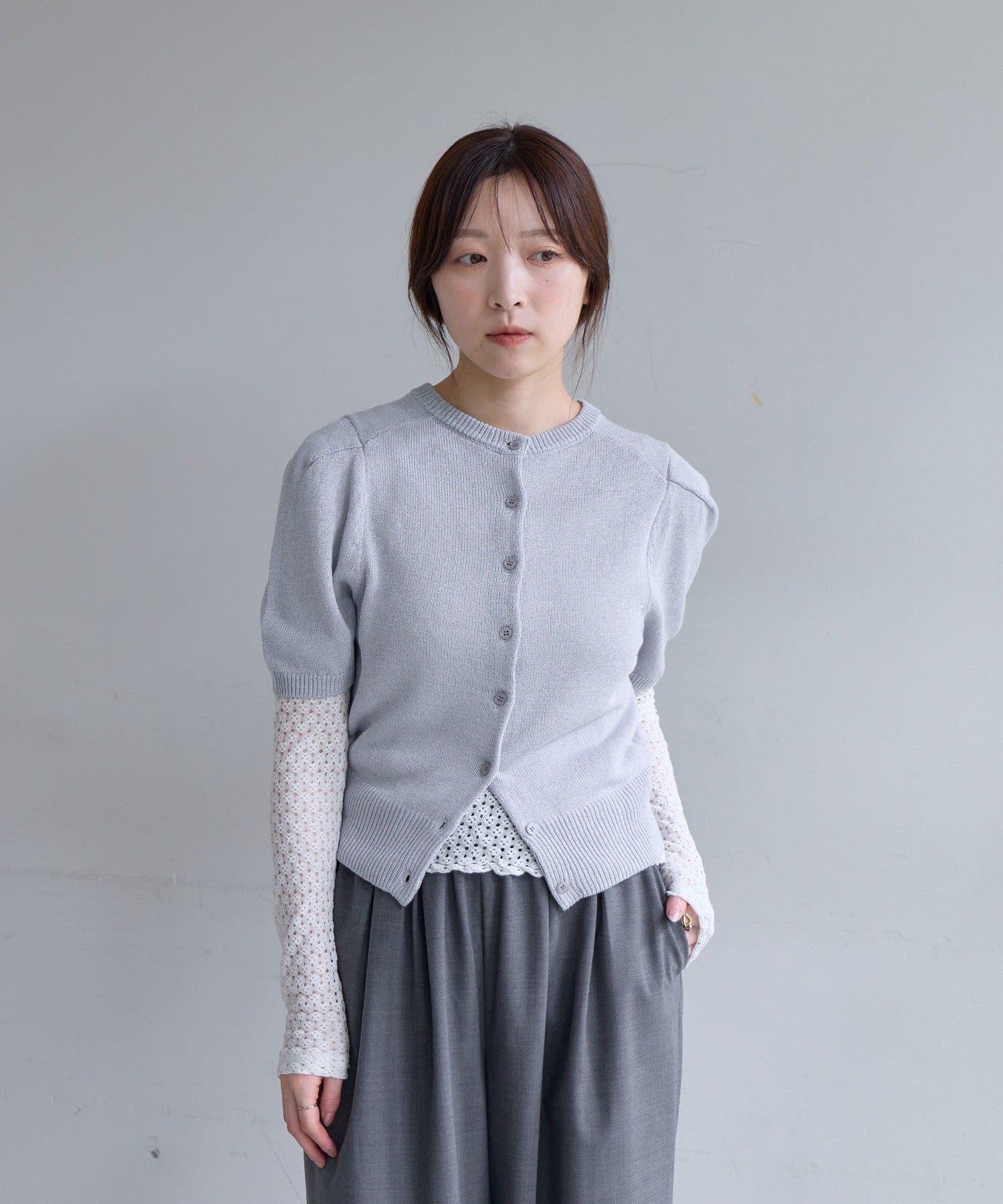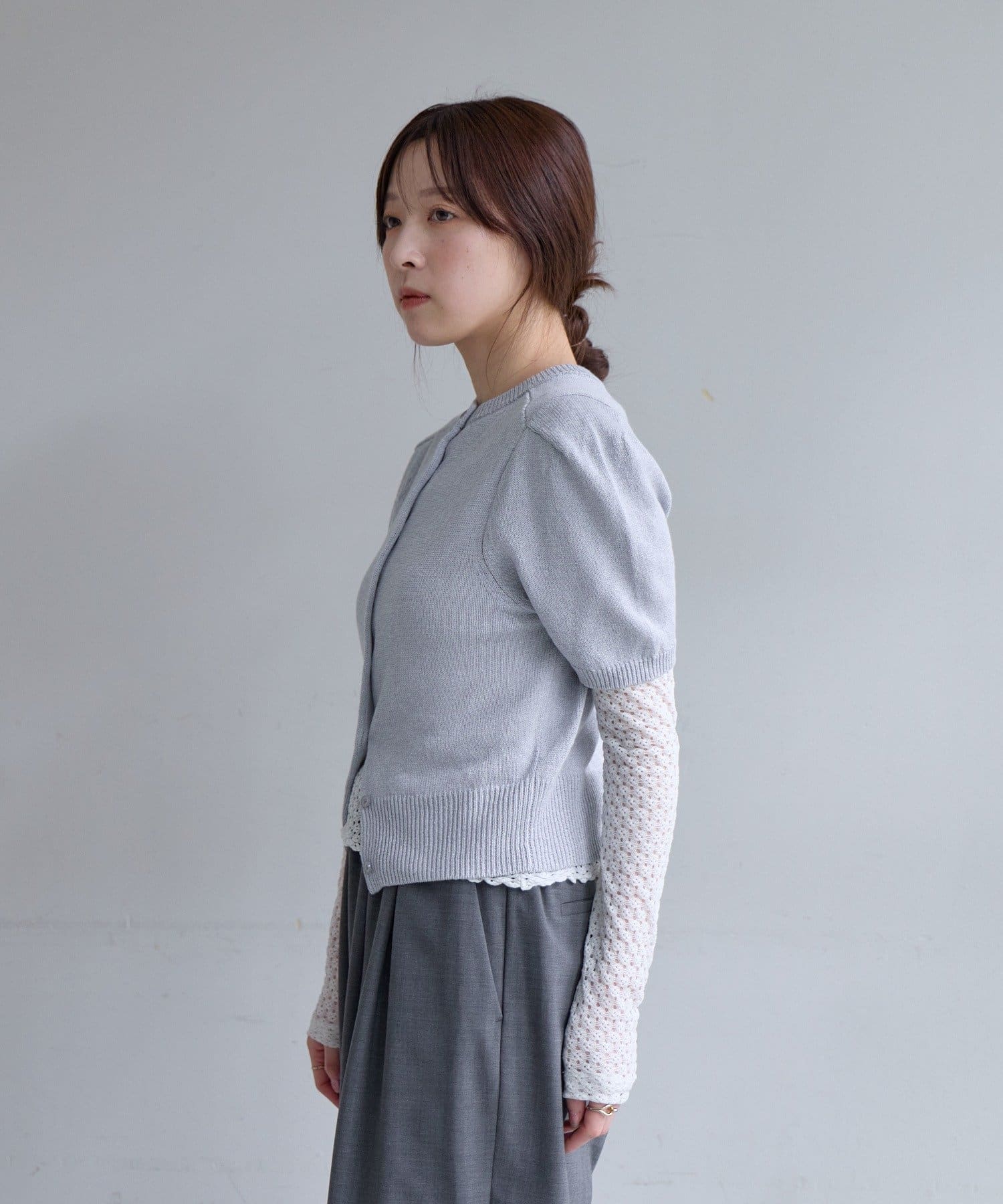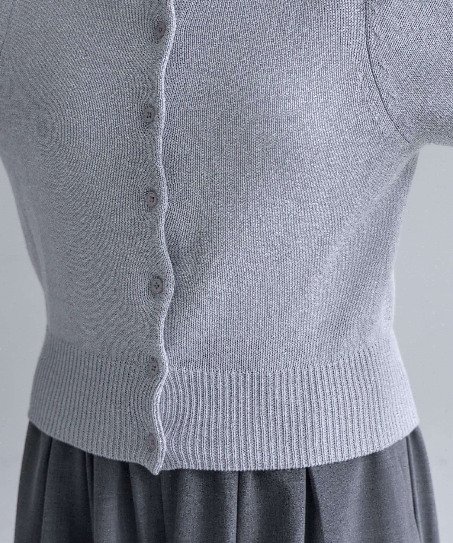 ボタン開きとプルオーバーの前後2WAY仕様。まだ肌寒い時期には、シャツや透け感のあるシアーインナーと重ねて着用するのがおすすめです。