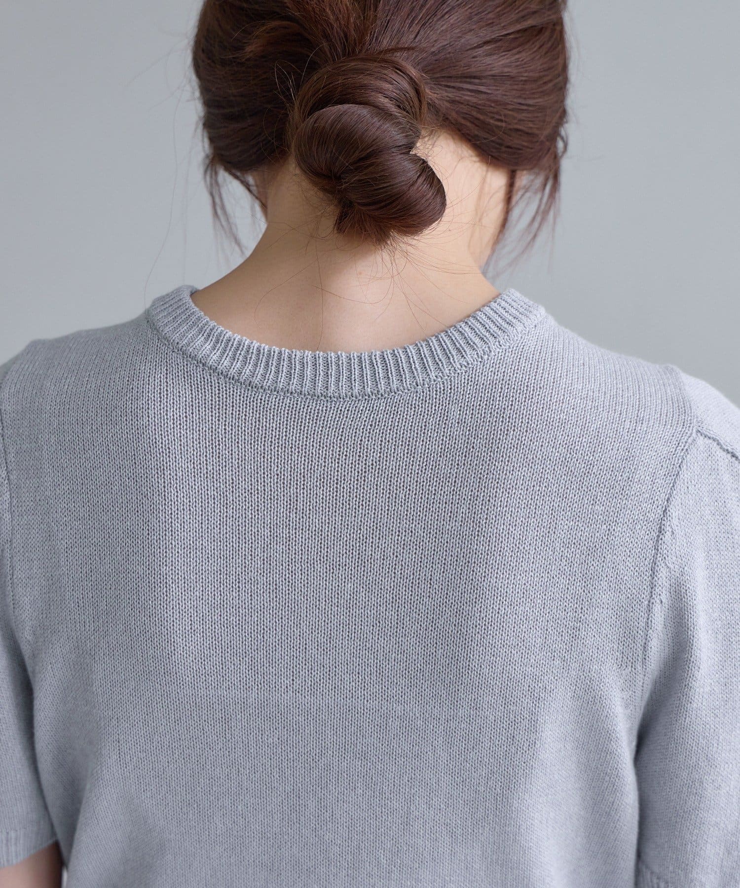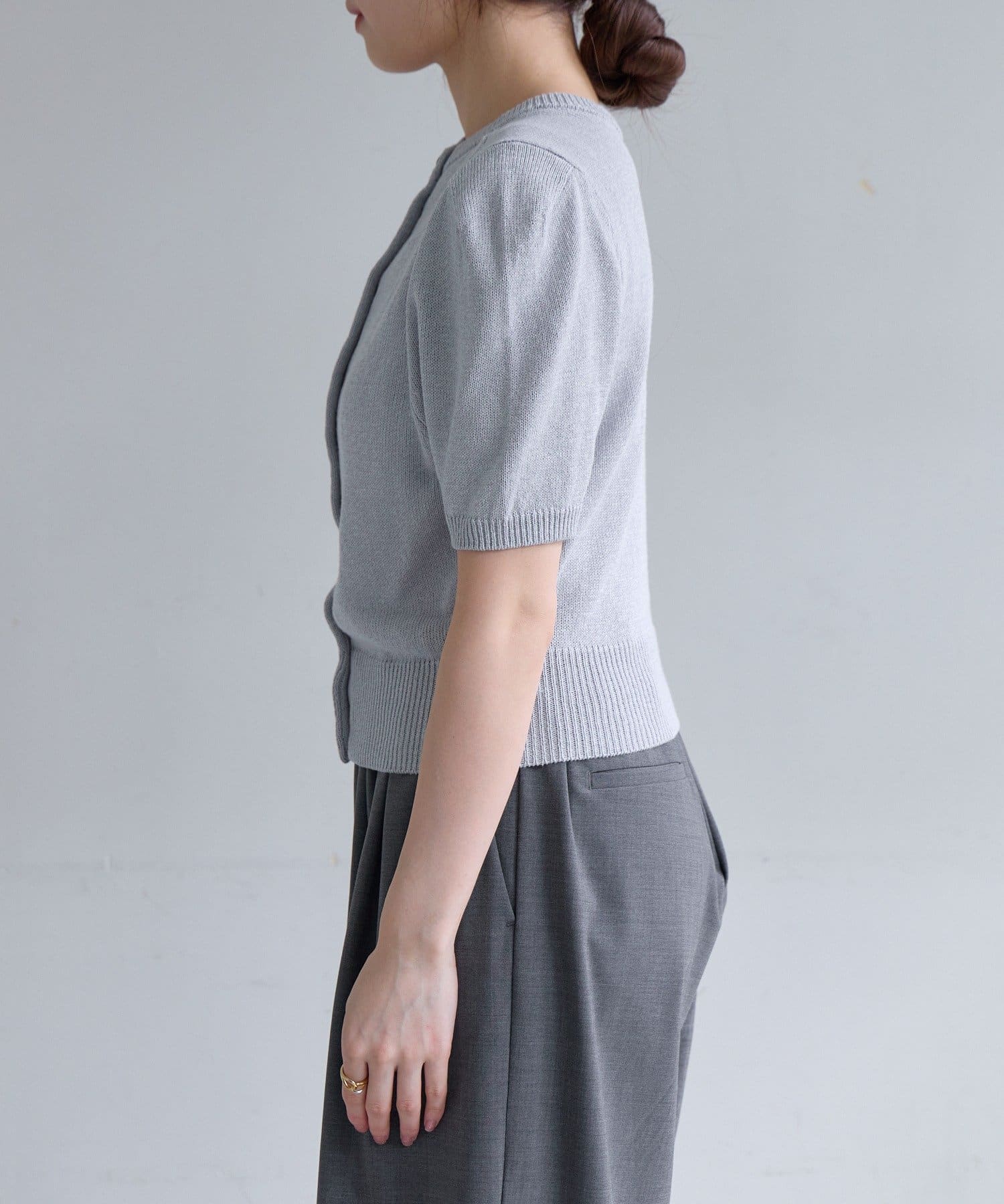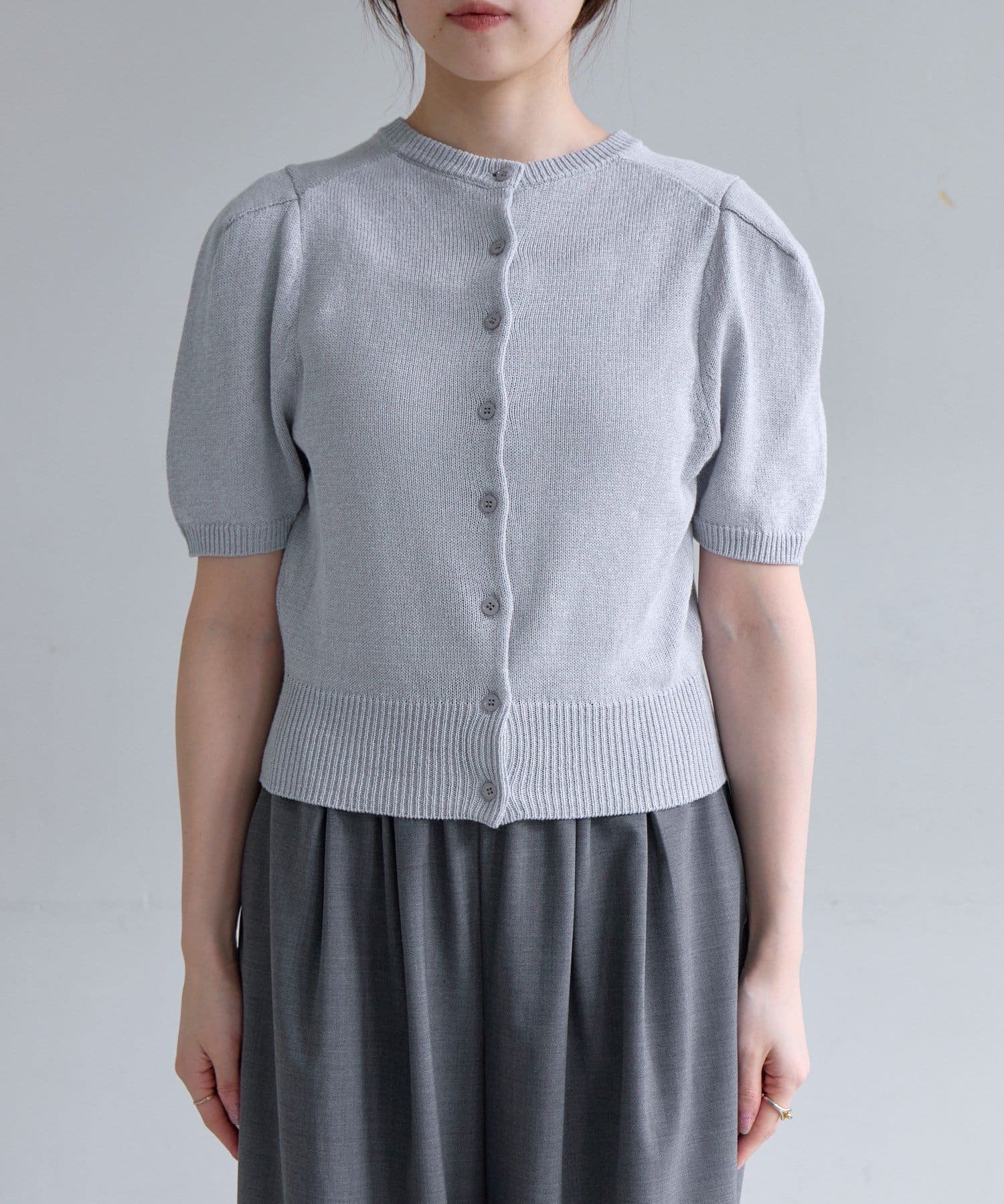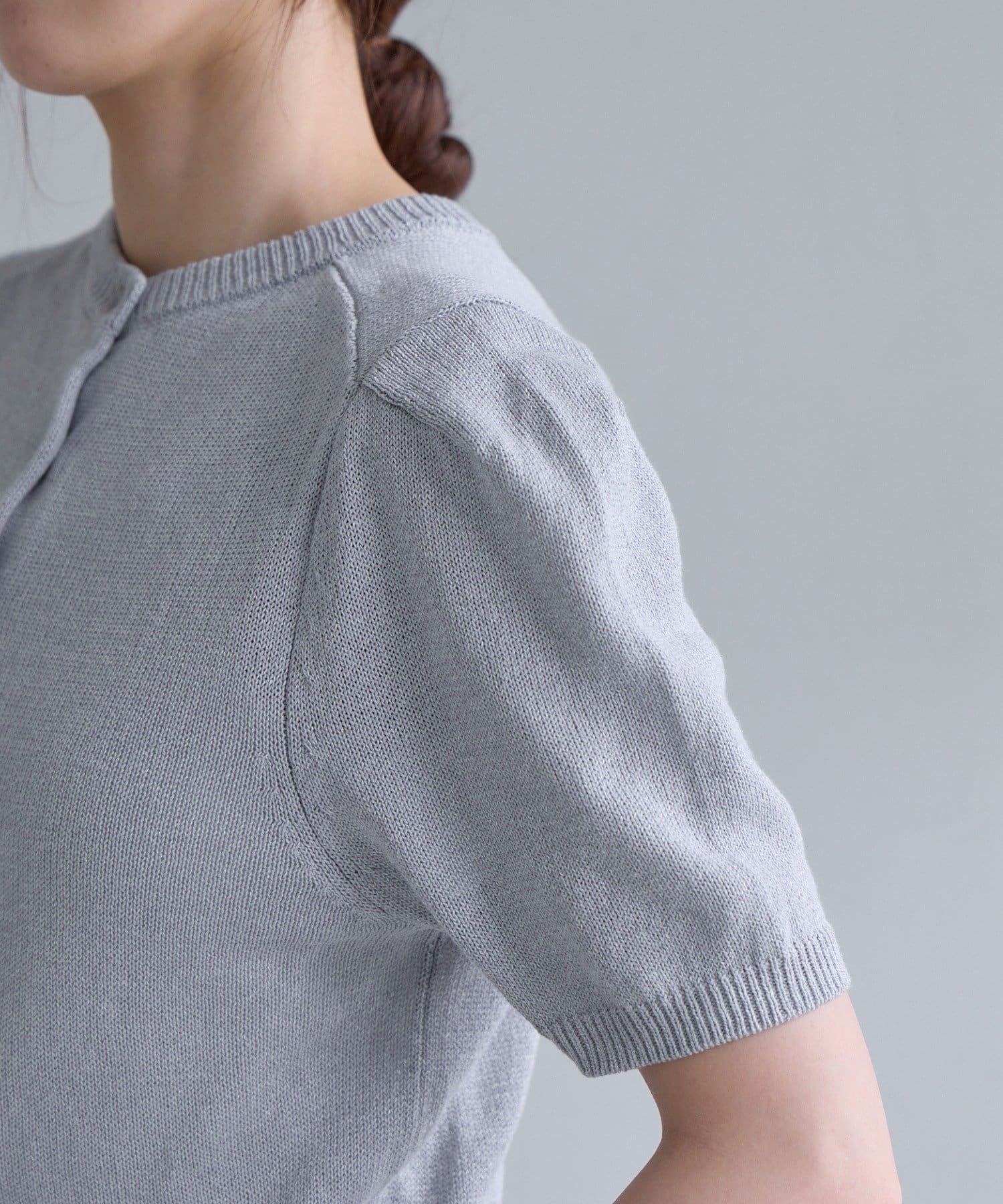 肩回りのデザインが綺麗に見えることに拘った、シルエット自慢の半袖のパフニットが登場。袖の前後に入れたタックによって肩の丸みが軽減されて、華奢な上半身の印象を作ります。糸は、シャリ感のある肌離れの良いペーパーヤーンを使用しており、夏でも快適に着用いただけます。