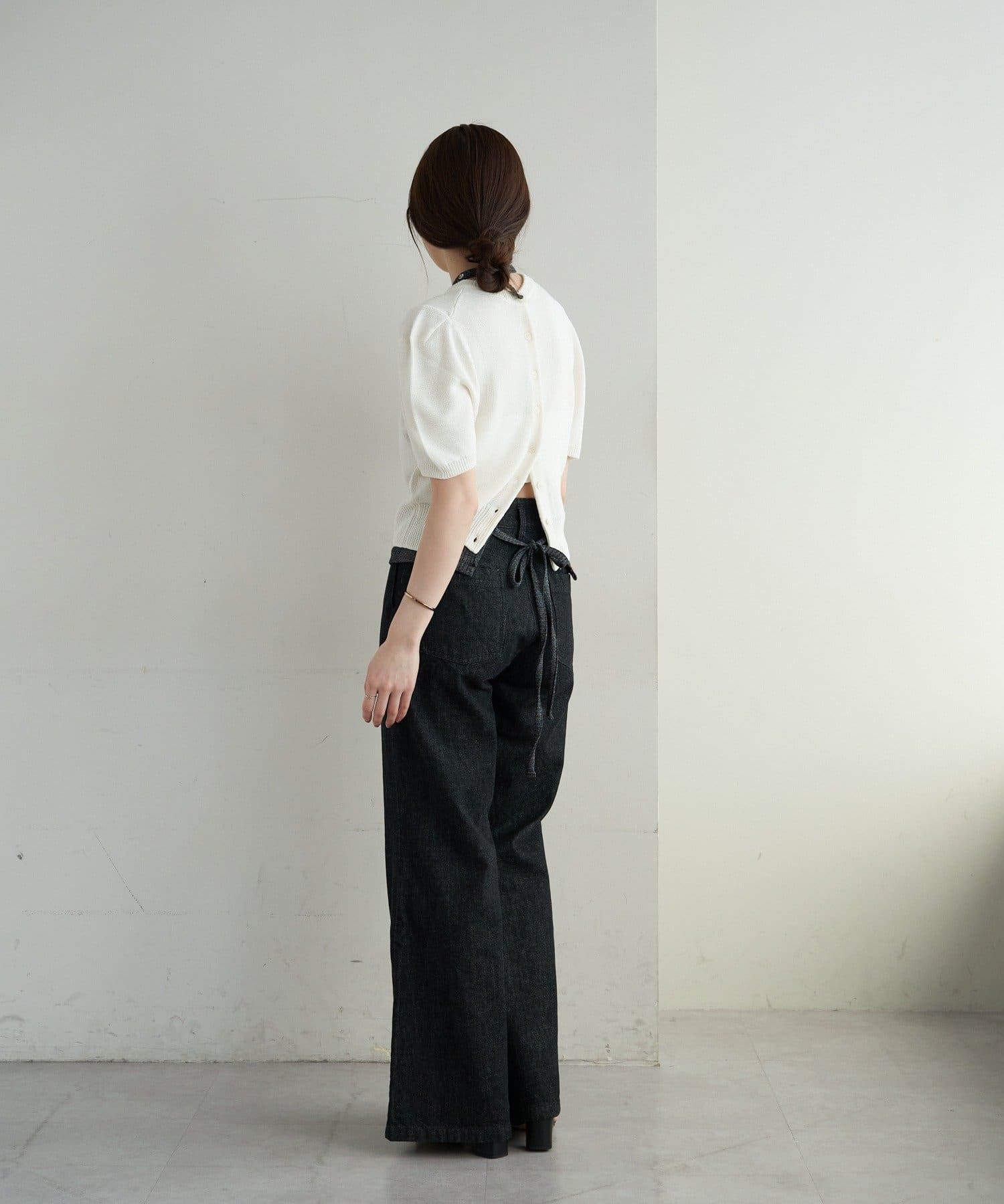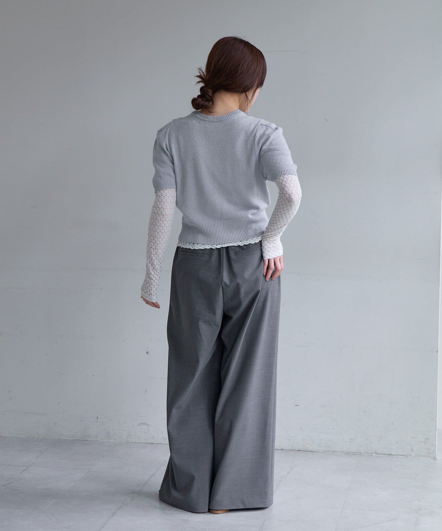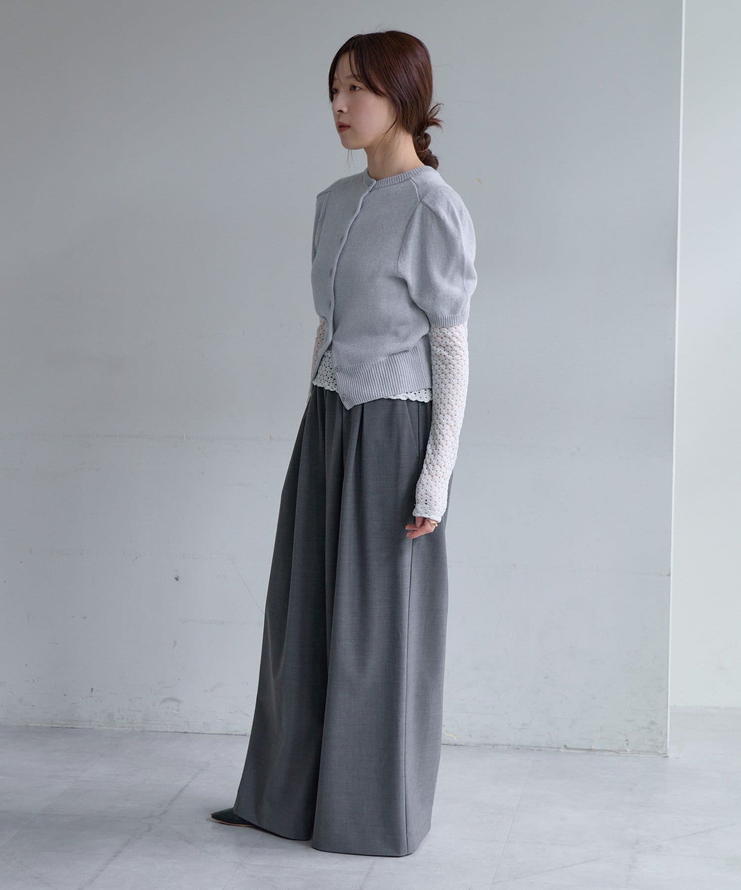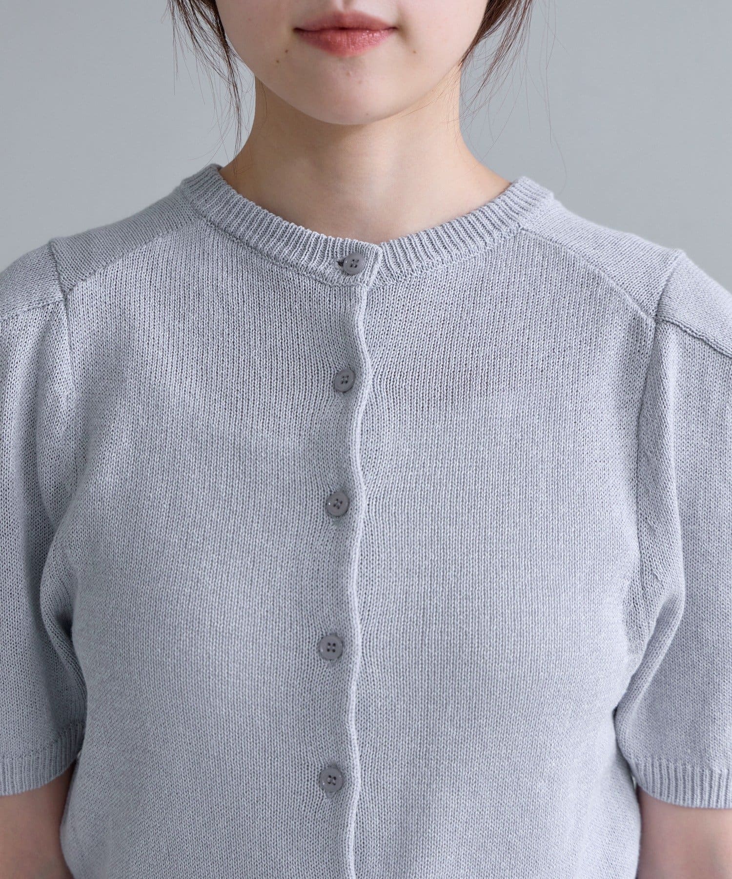 肩回りのデザインが綺麗に見えることに拘った、シルエット自慢の半袖のパフニットが登場。袖の前後に入れたタックによって肩の丸みが軽減されて、華奢な上半身の印象を作ります。糸は、シャリ感のある肌離れの良いペーパーヤーンを使用しており、夏でも快適に着用いただけます。