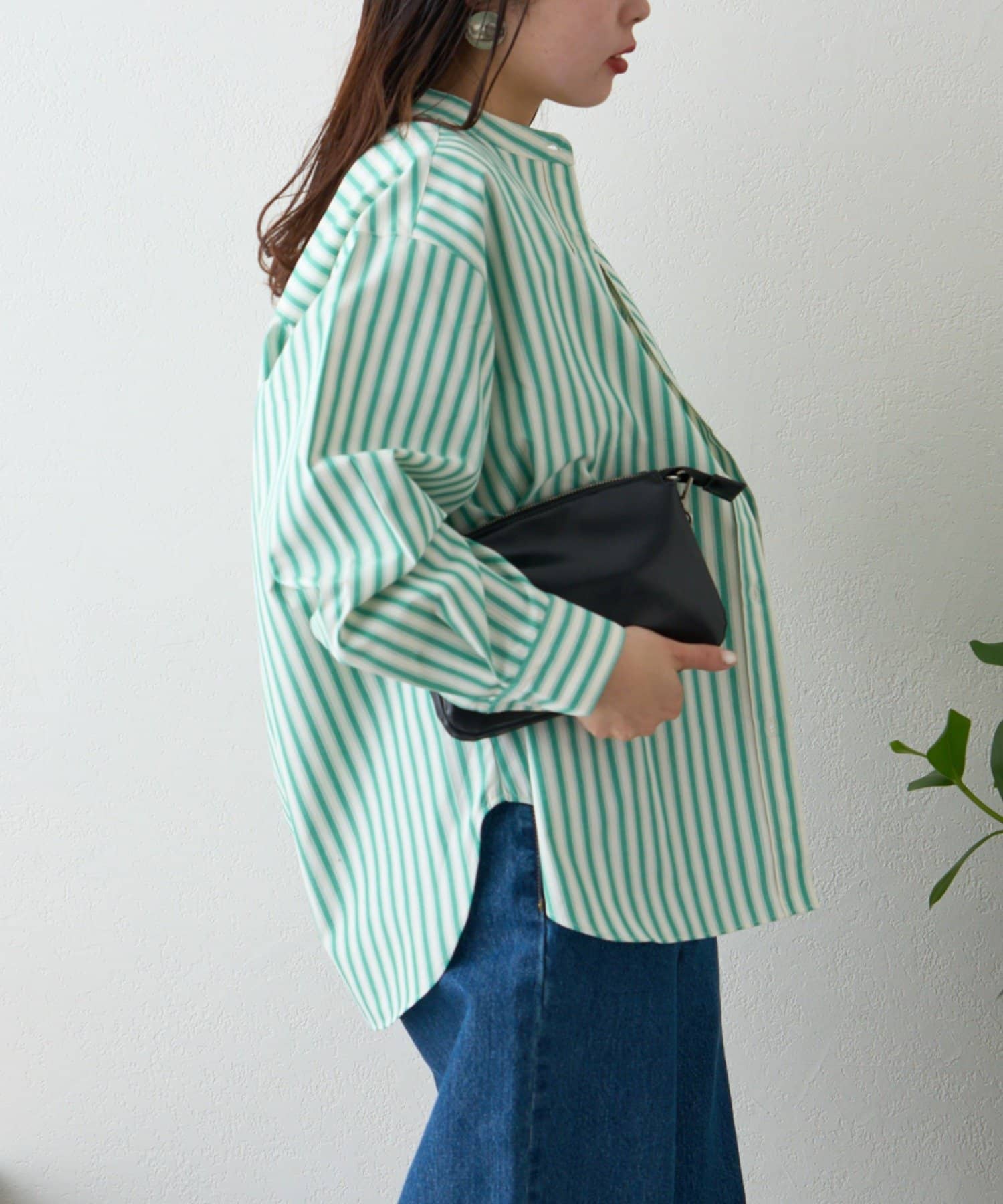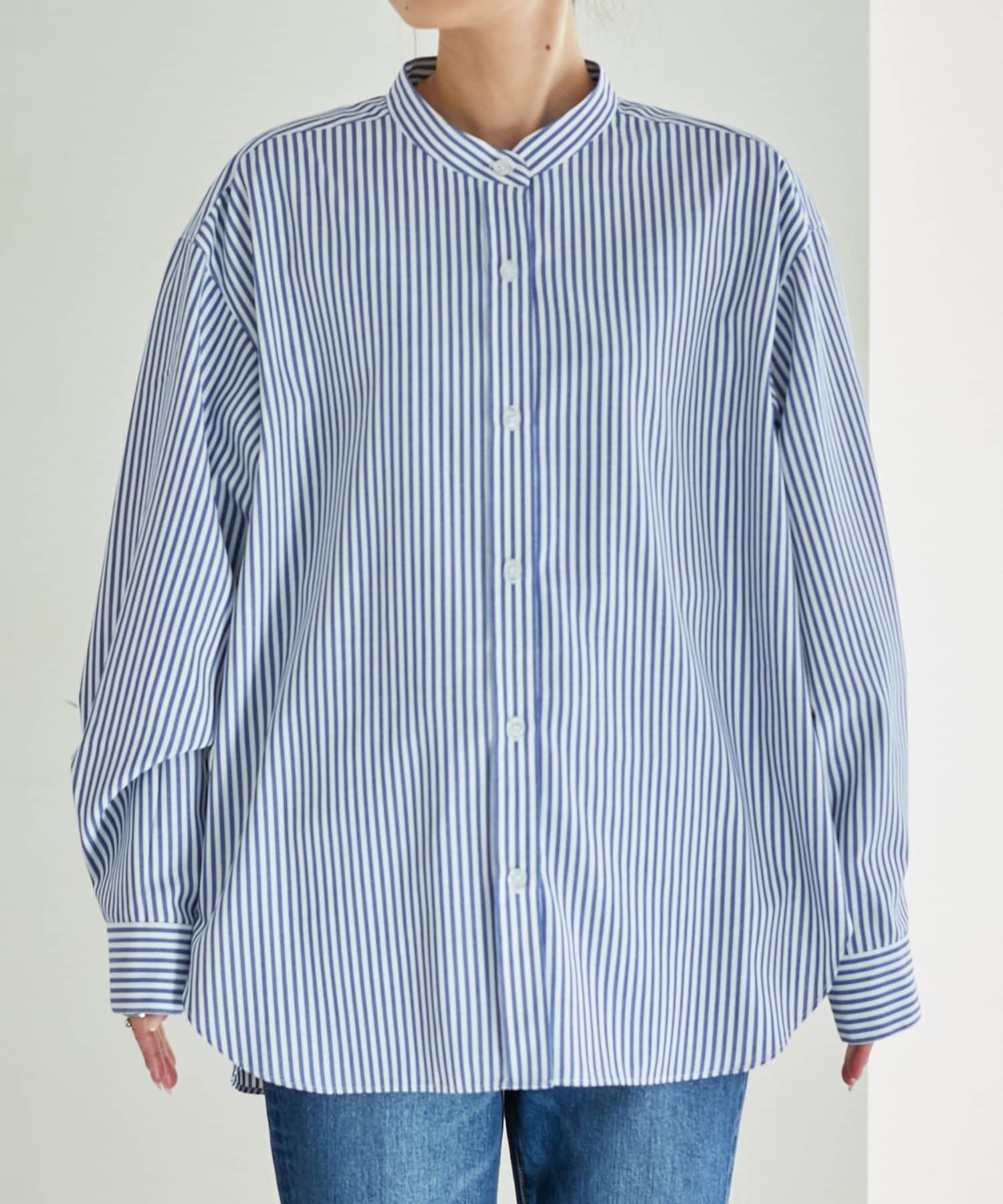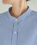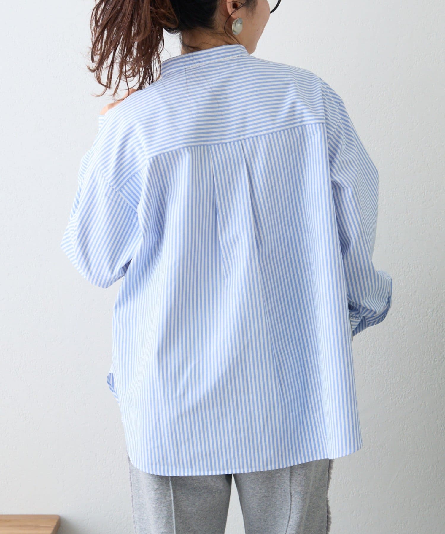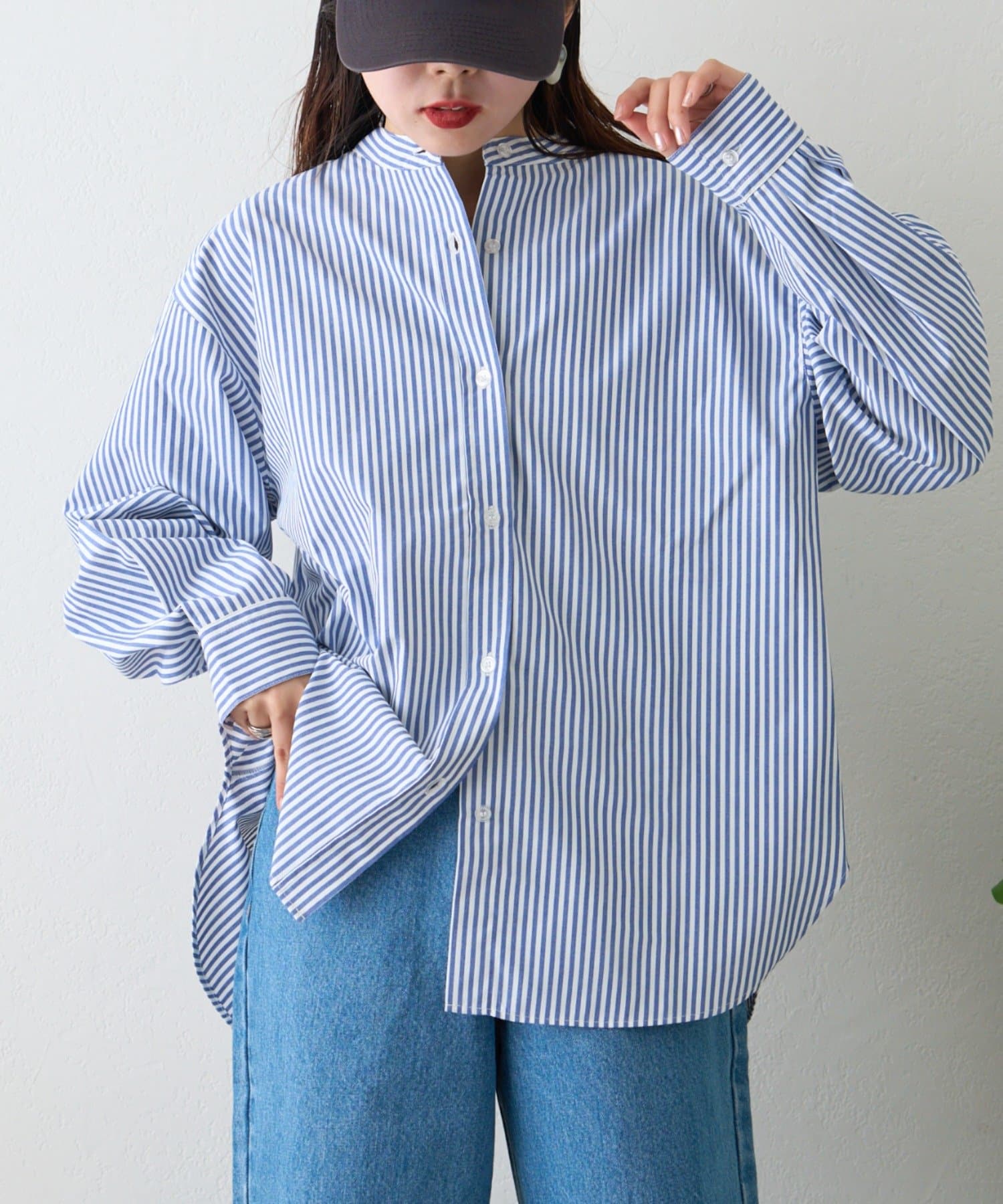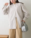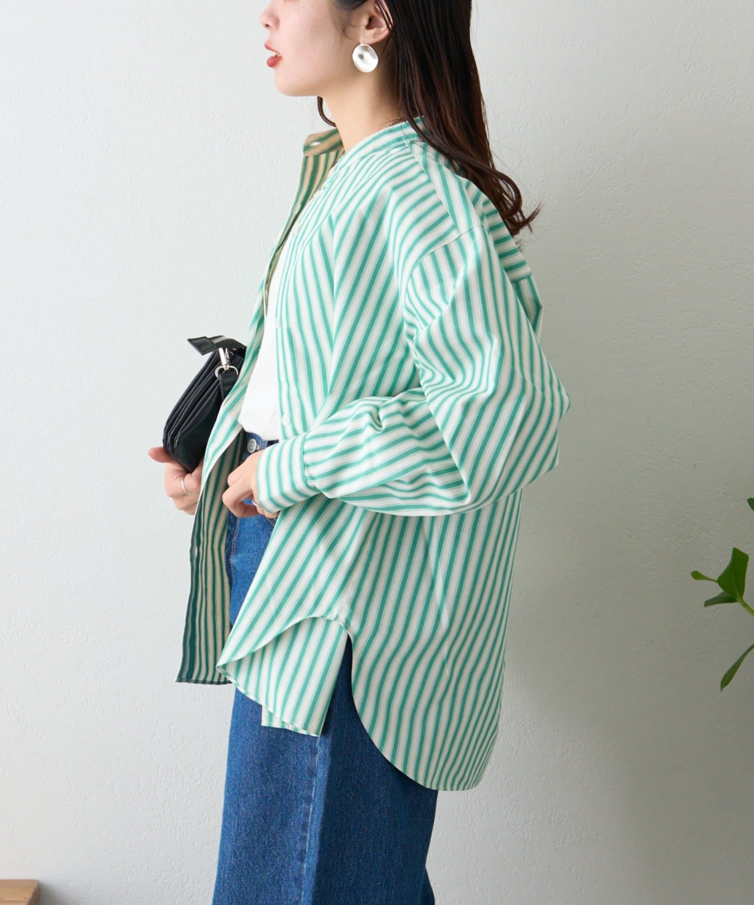 【日焼け対策・お手入れ簡単】ボリュームスリーブストライプバンドカラーシャツ