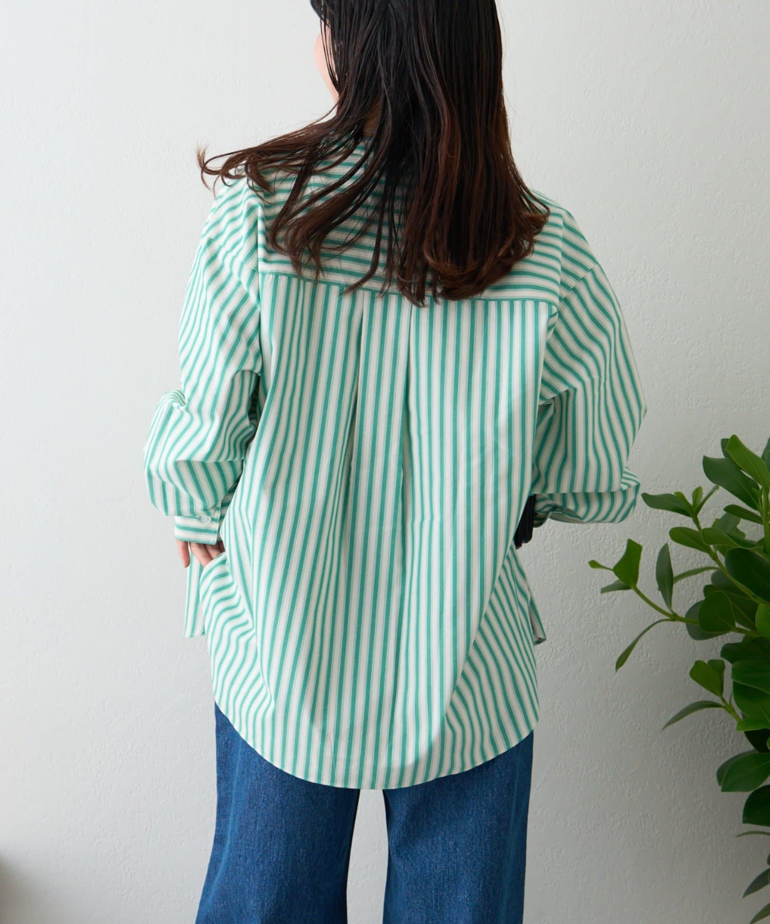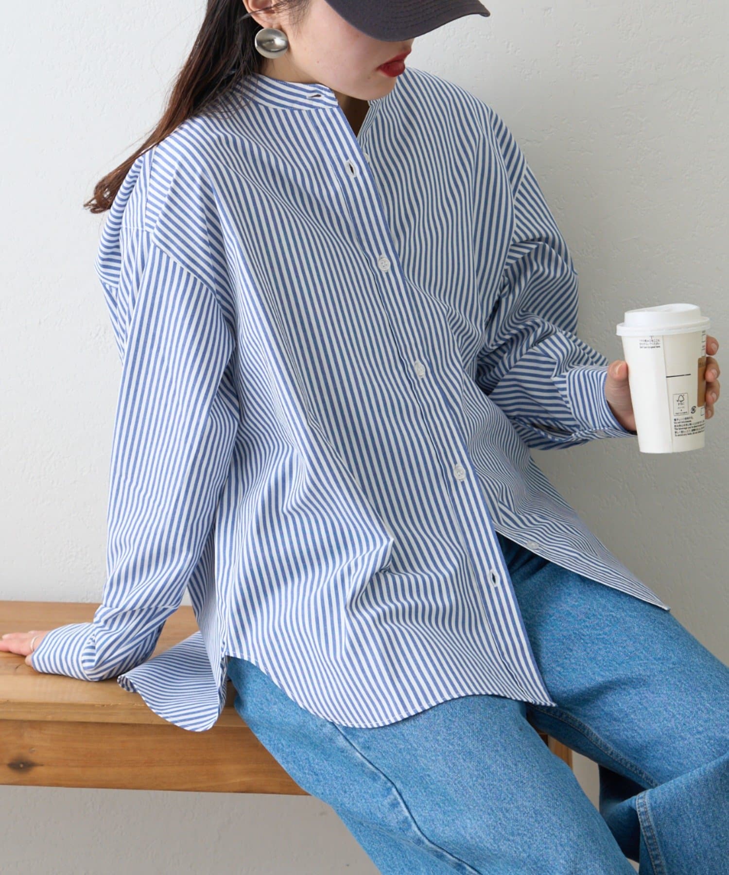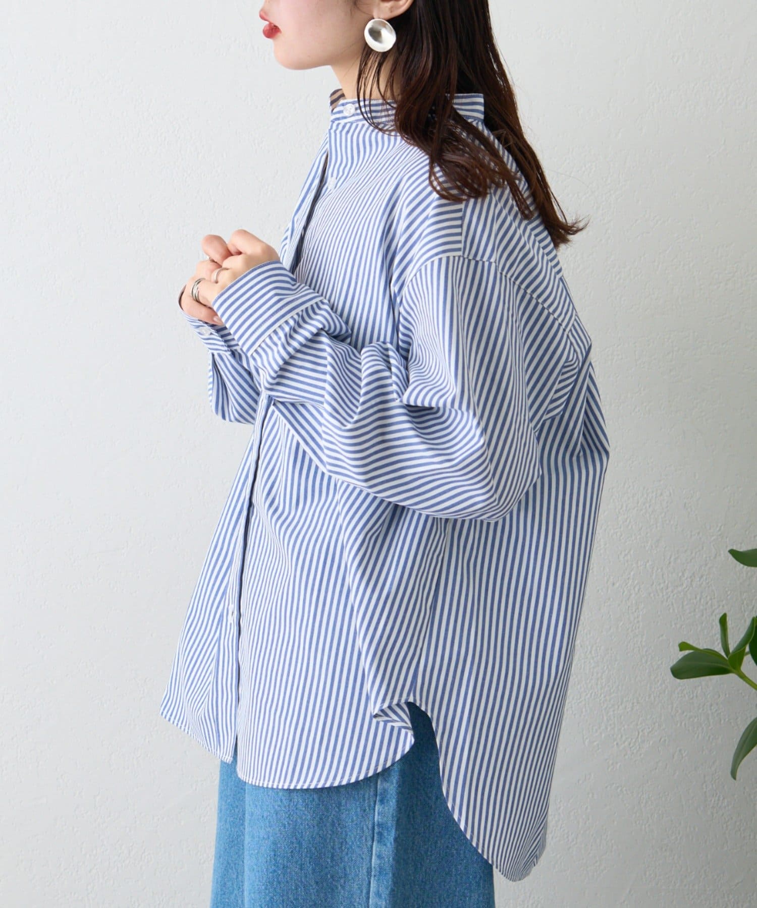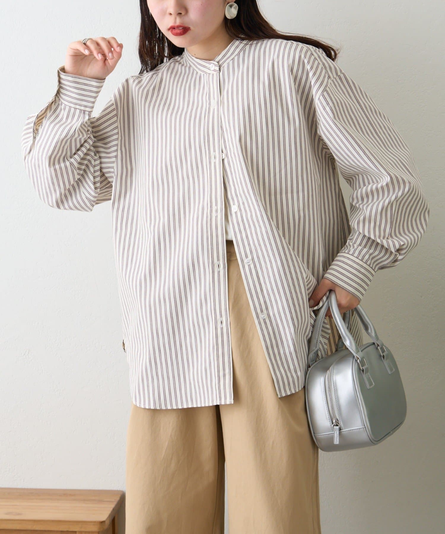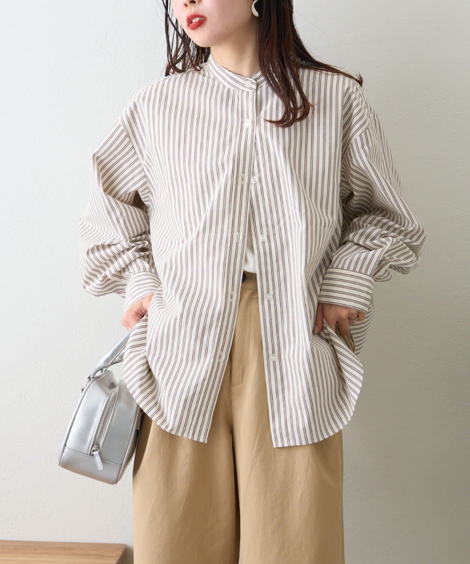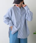 【日焼け対策・お手入れ簡単】ボリュームスリーブストライプバンドカラーシャツ