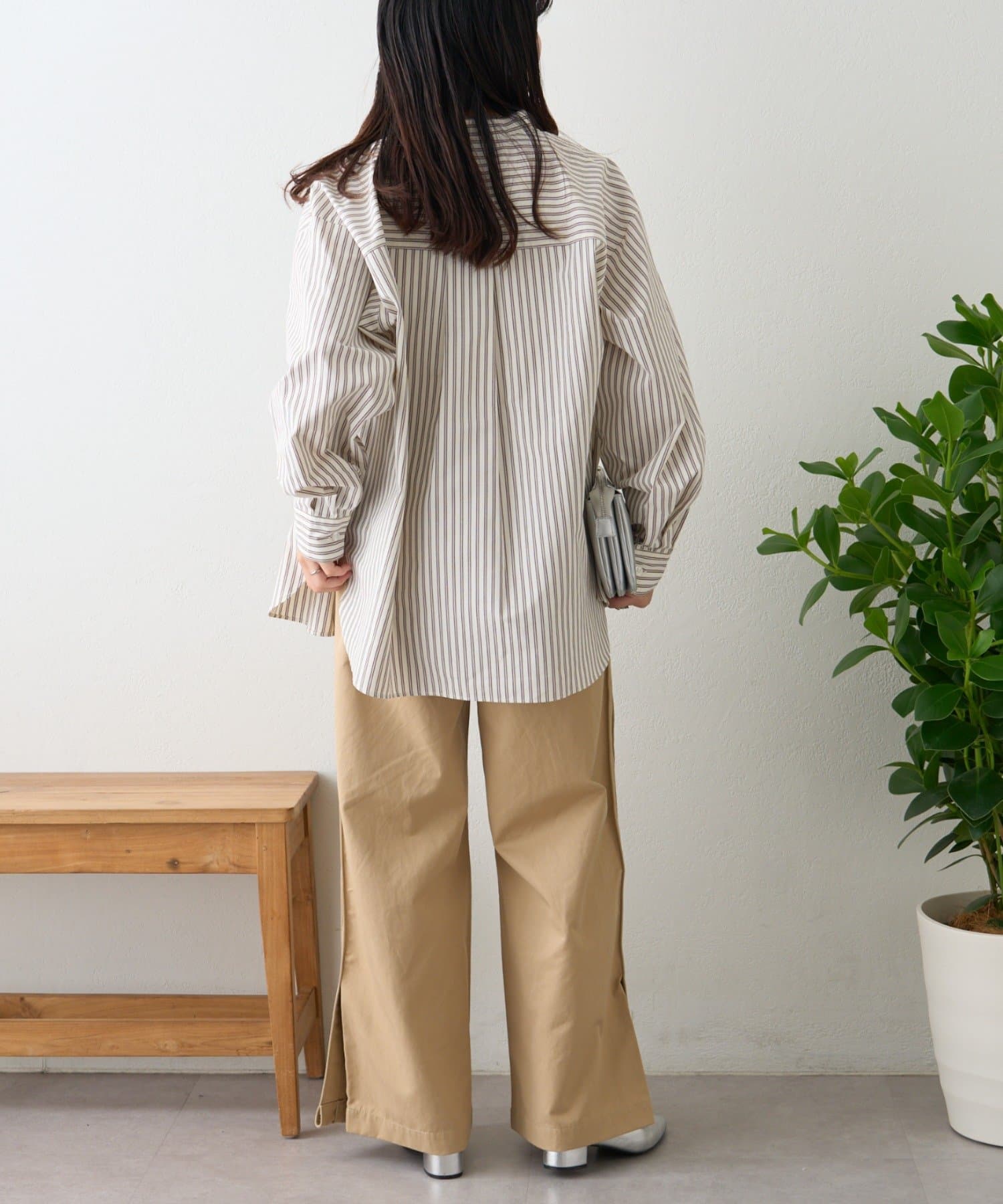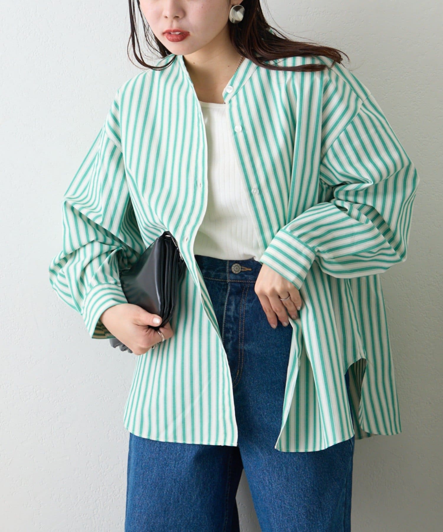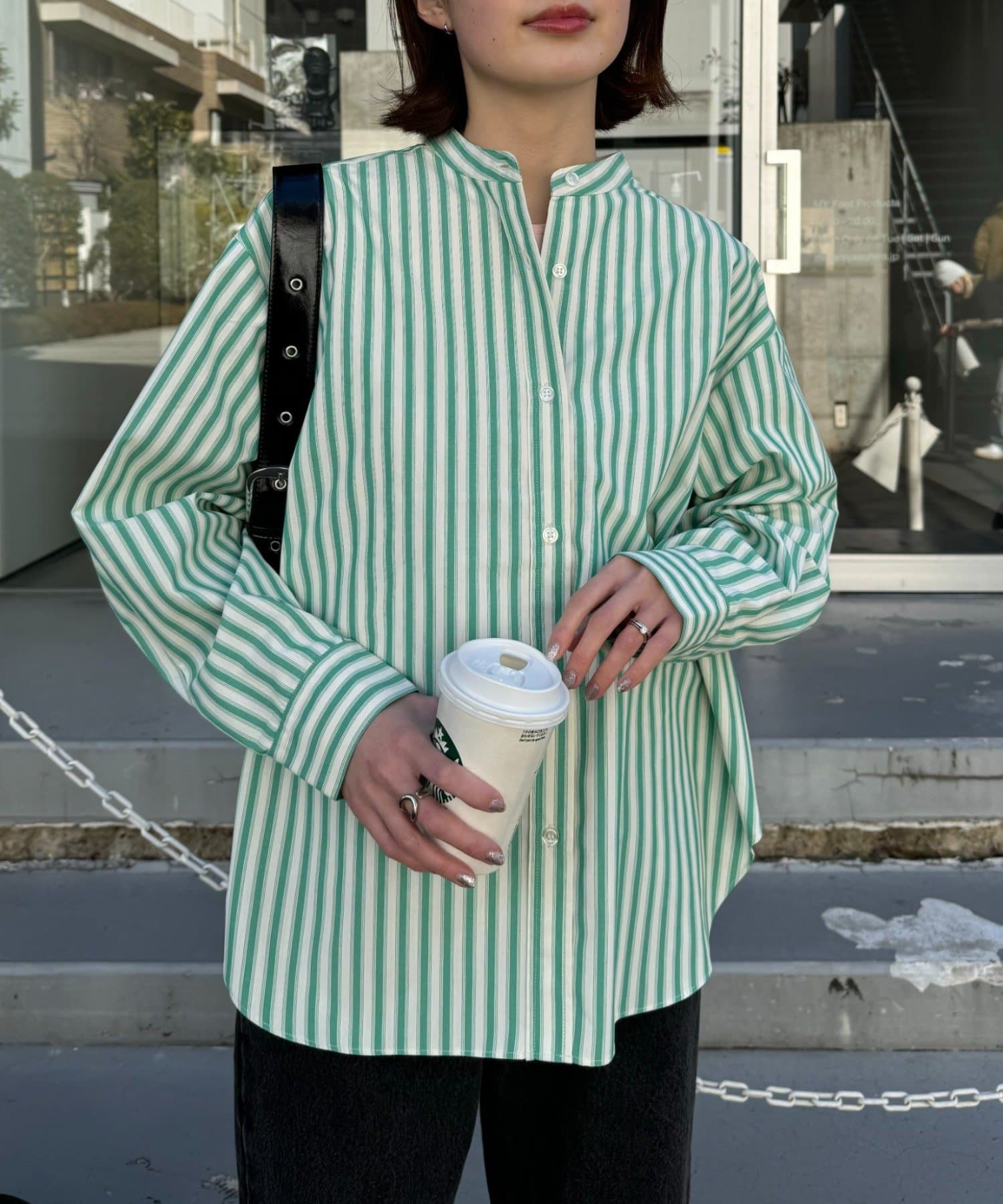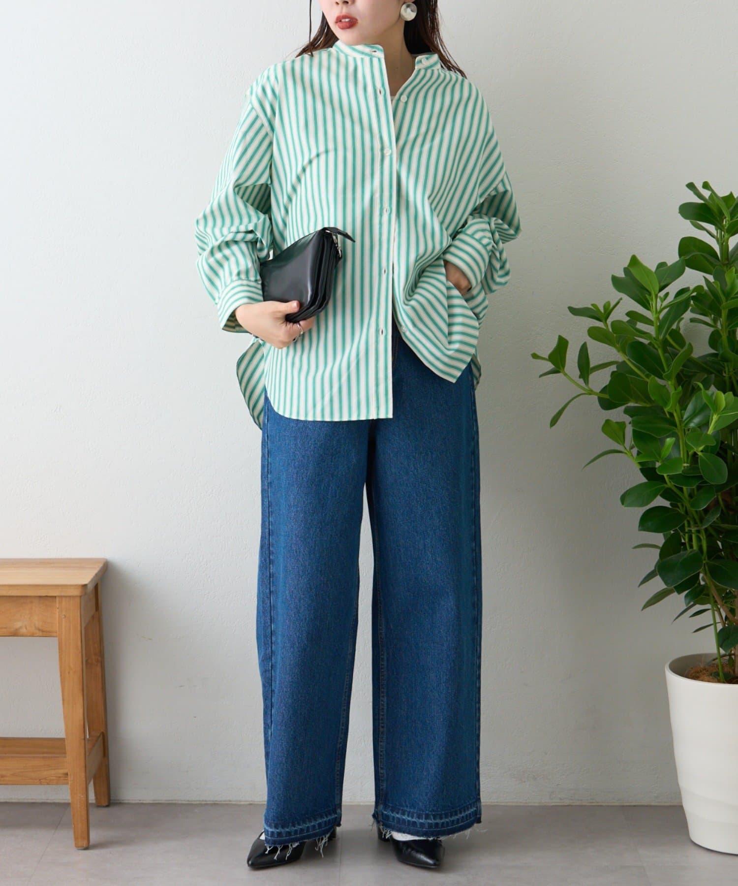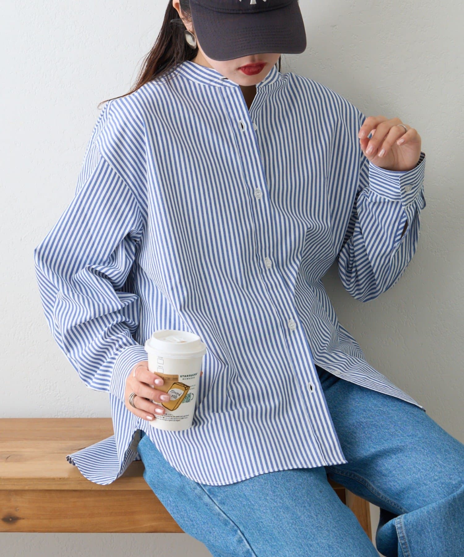 【日焼け対策・お手入れ簡単】ボリュームスリーブストライプバンドカラーシャツ