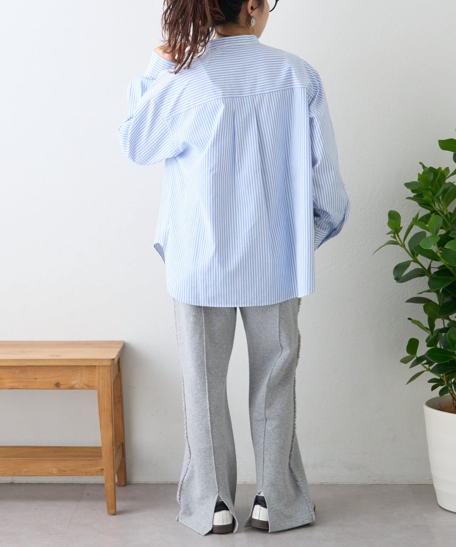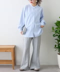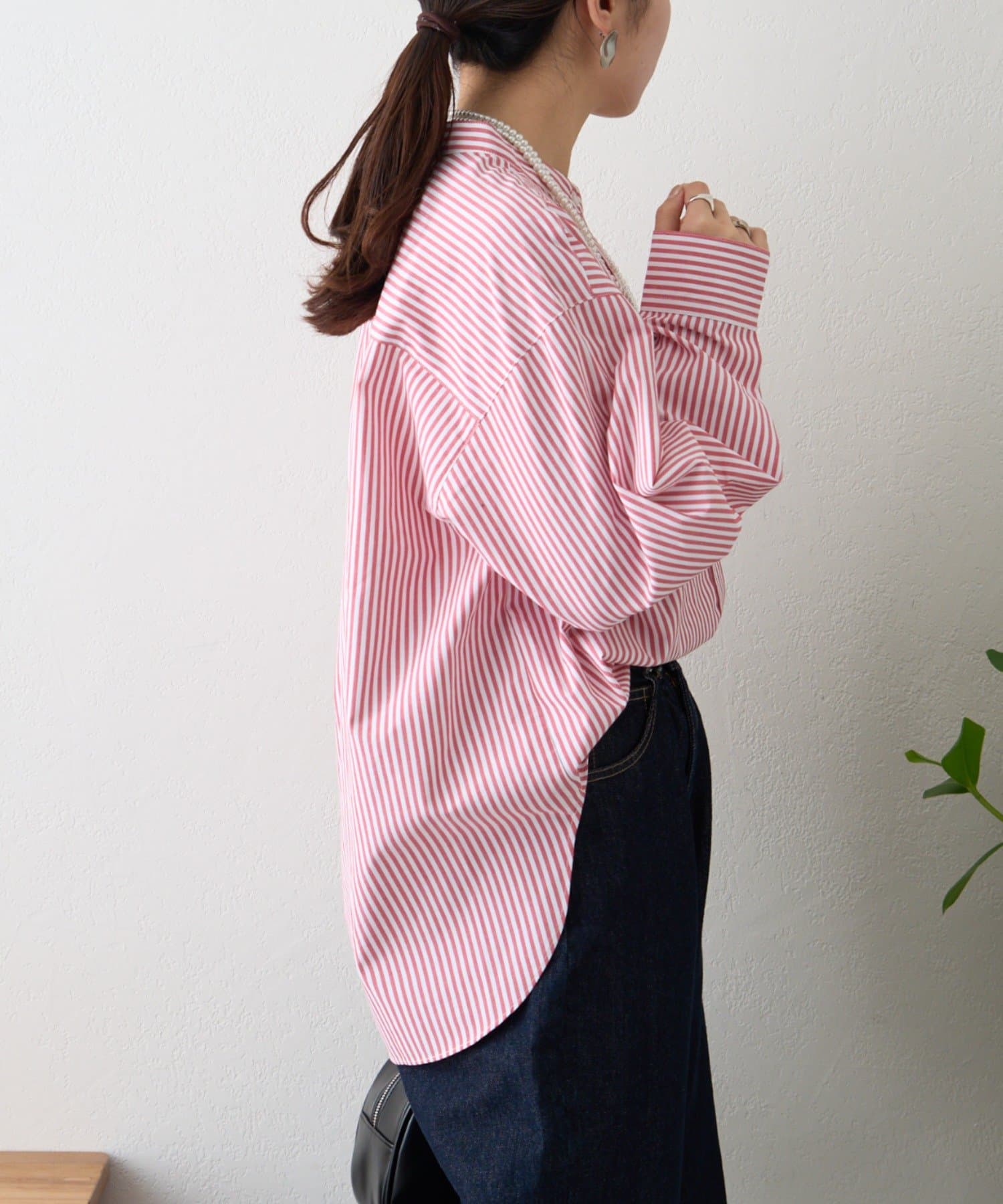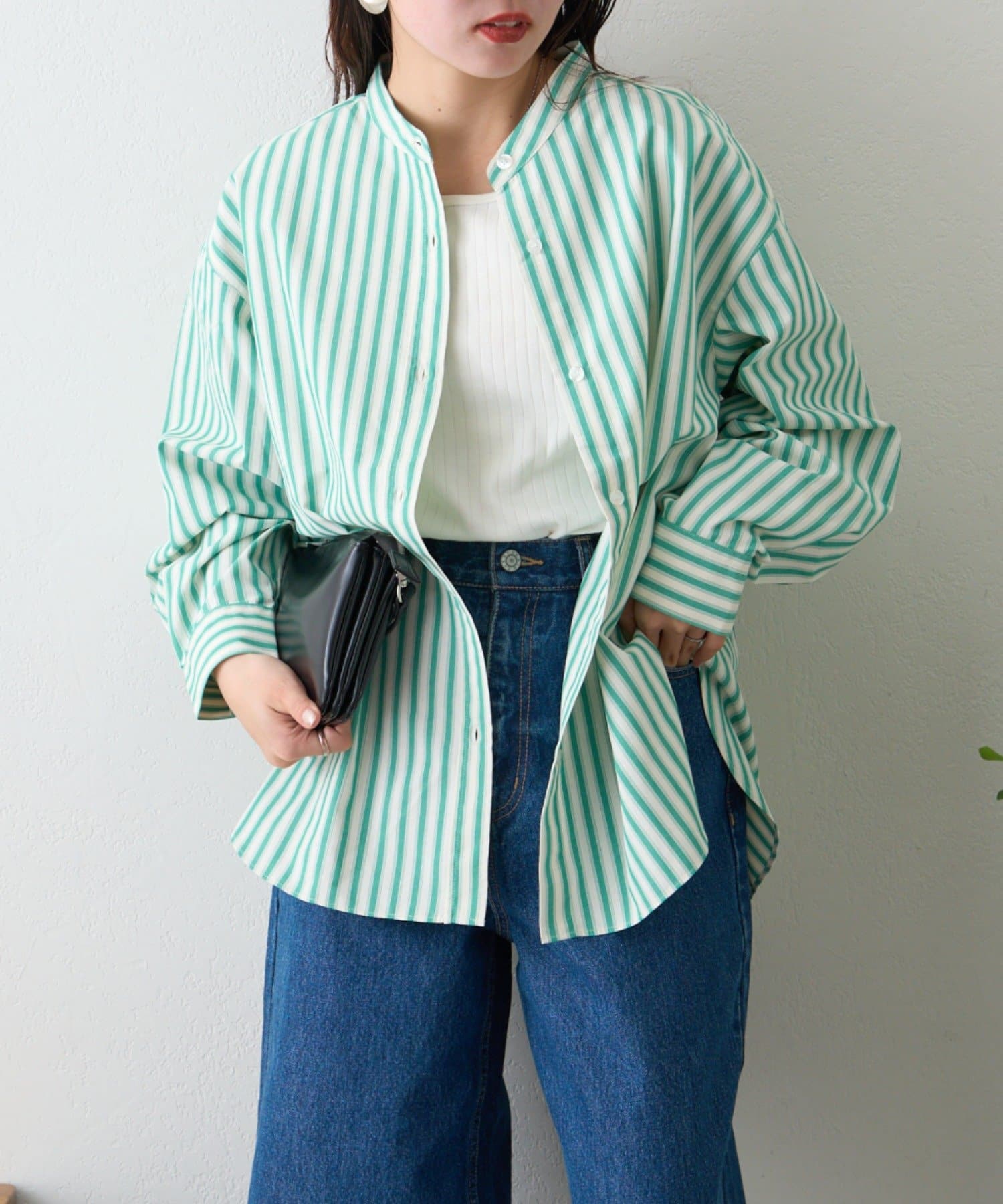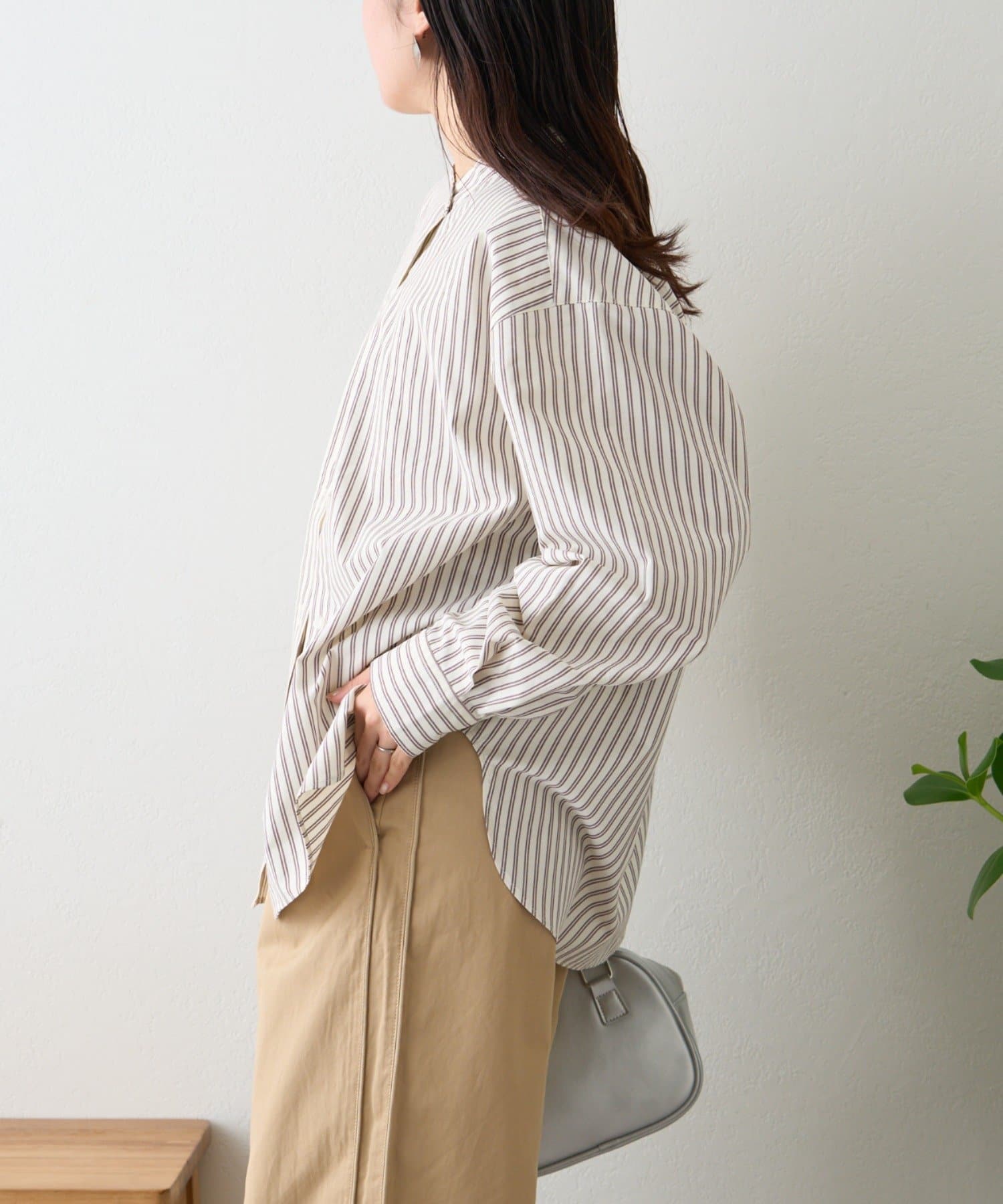 【日焼け対策・お手入れ簡単】ボリュームスリーブストライプバンドカラーシャツ