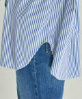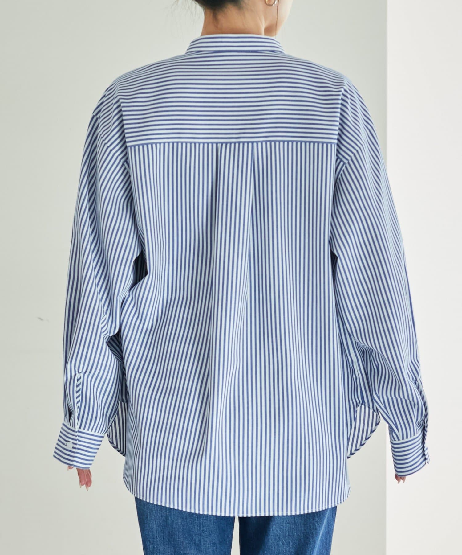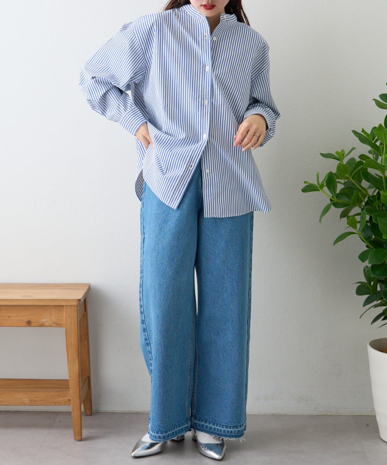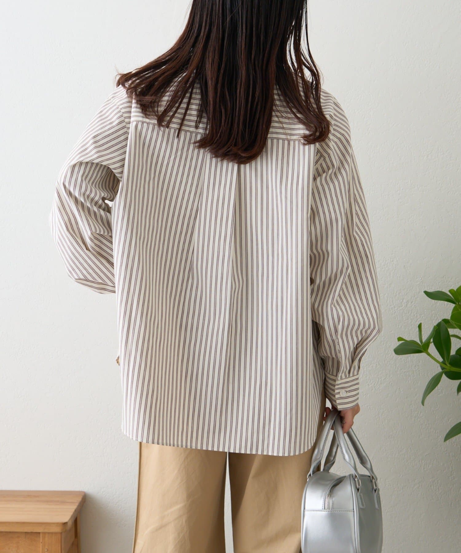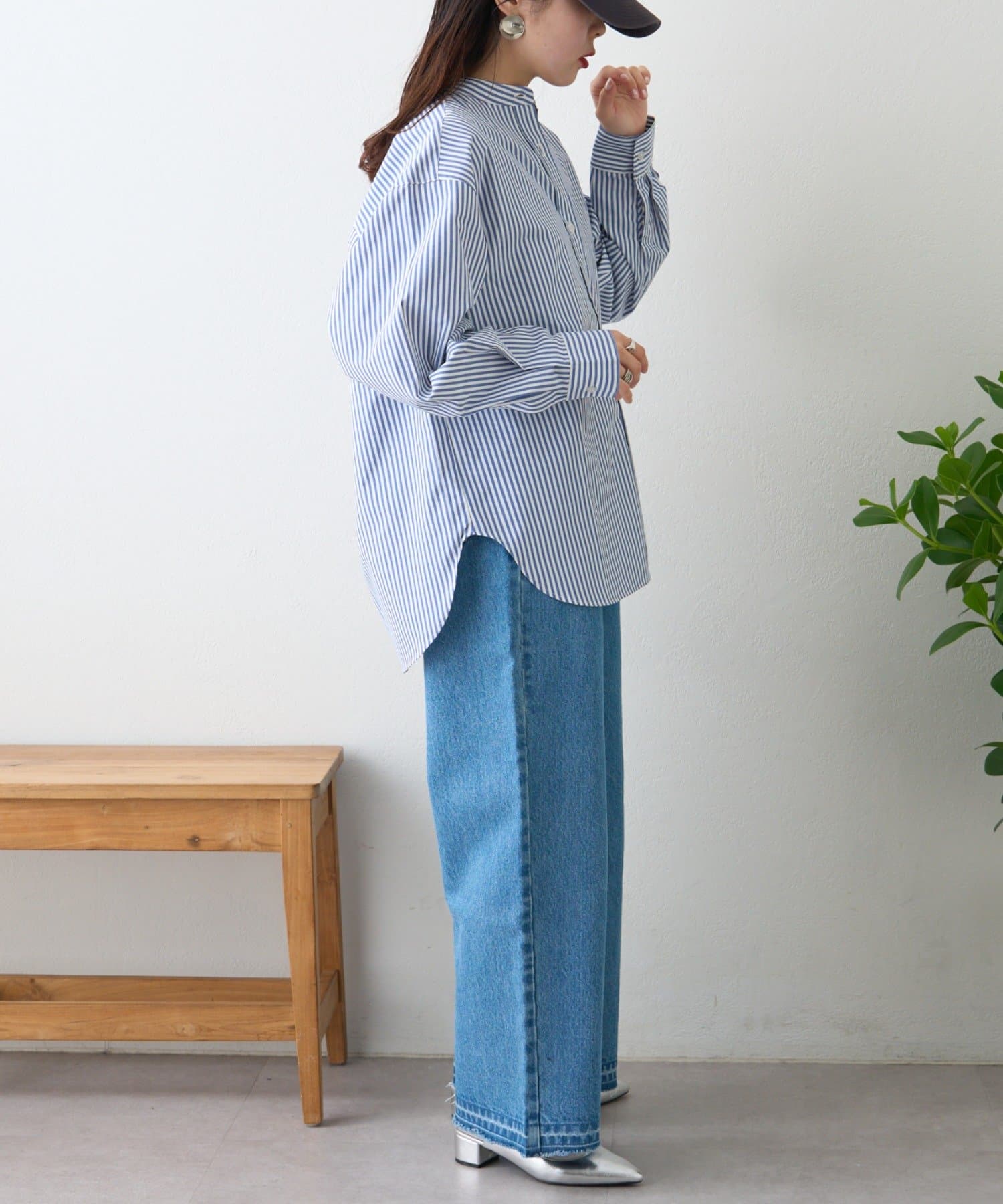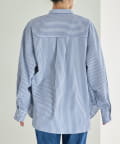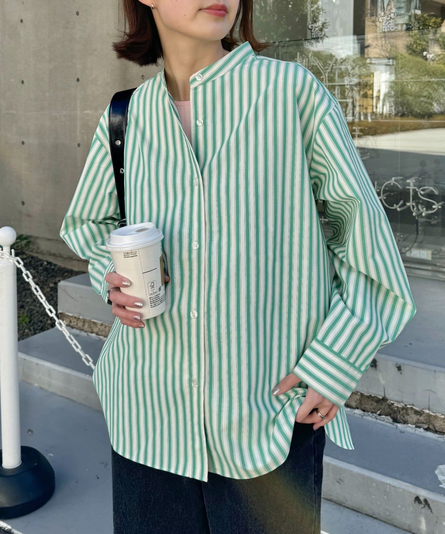 【日焼け対策・お手入れ簡単】ボリュームスリーブストライプバンドカラーシャツ
