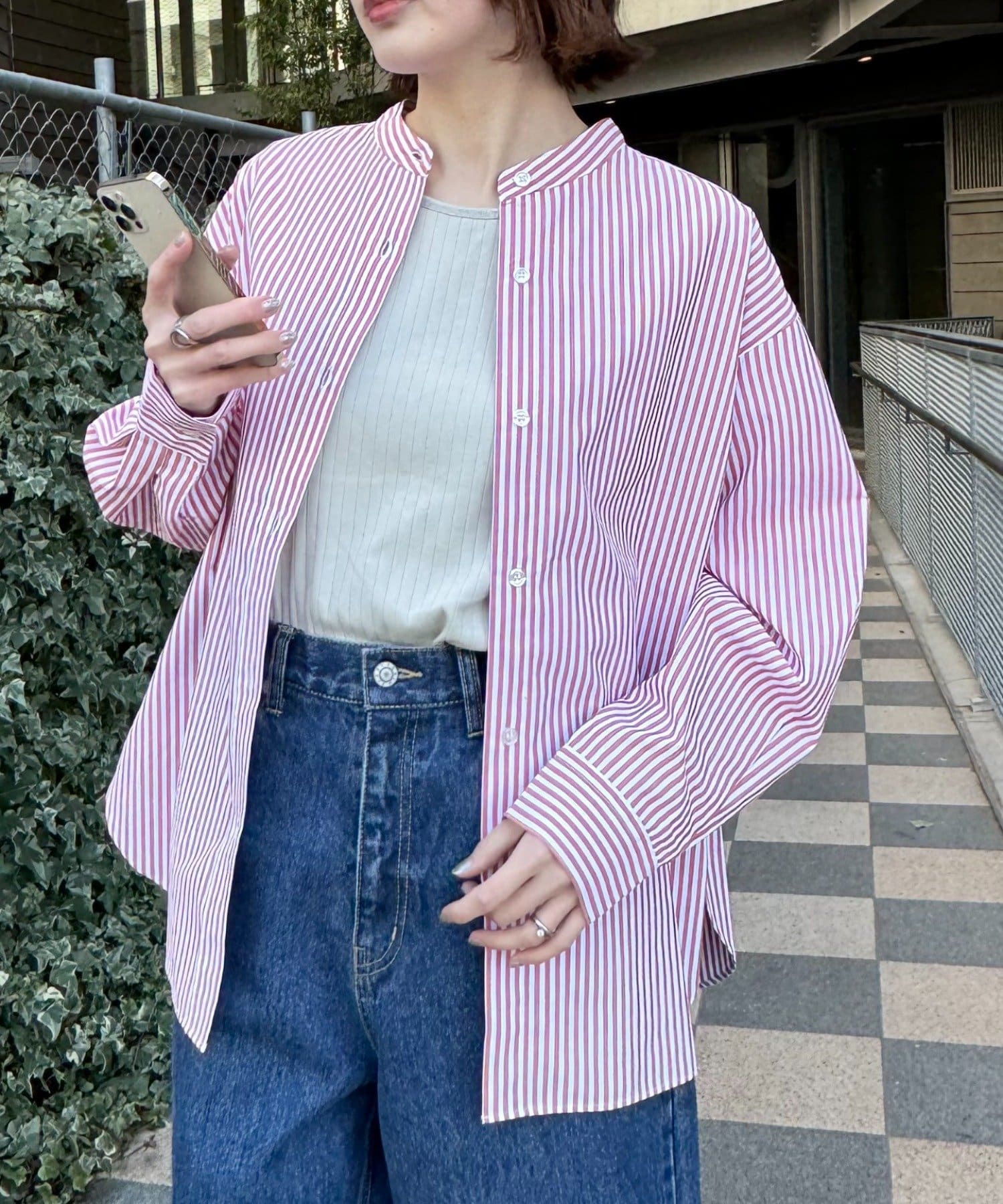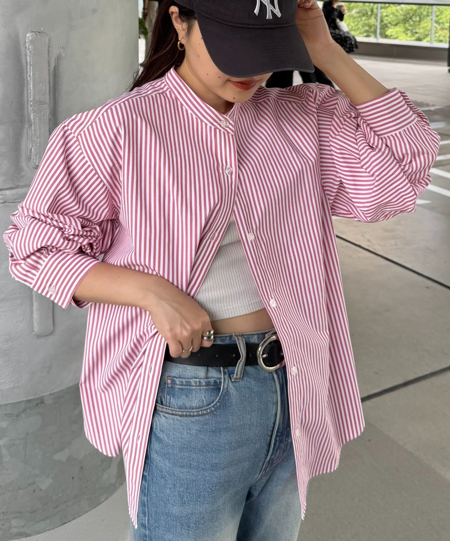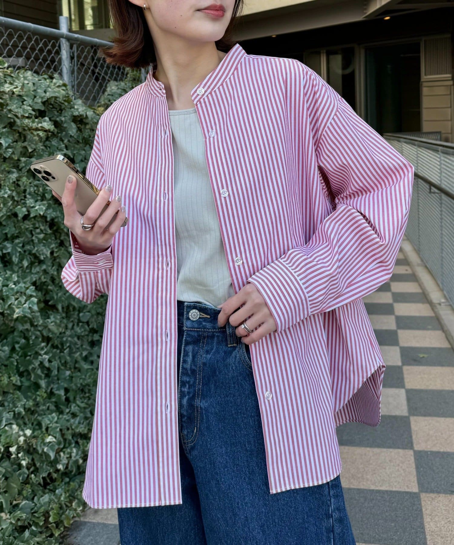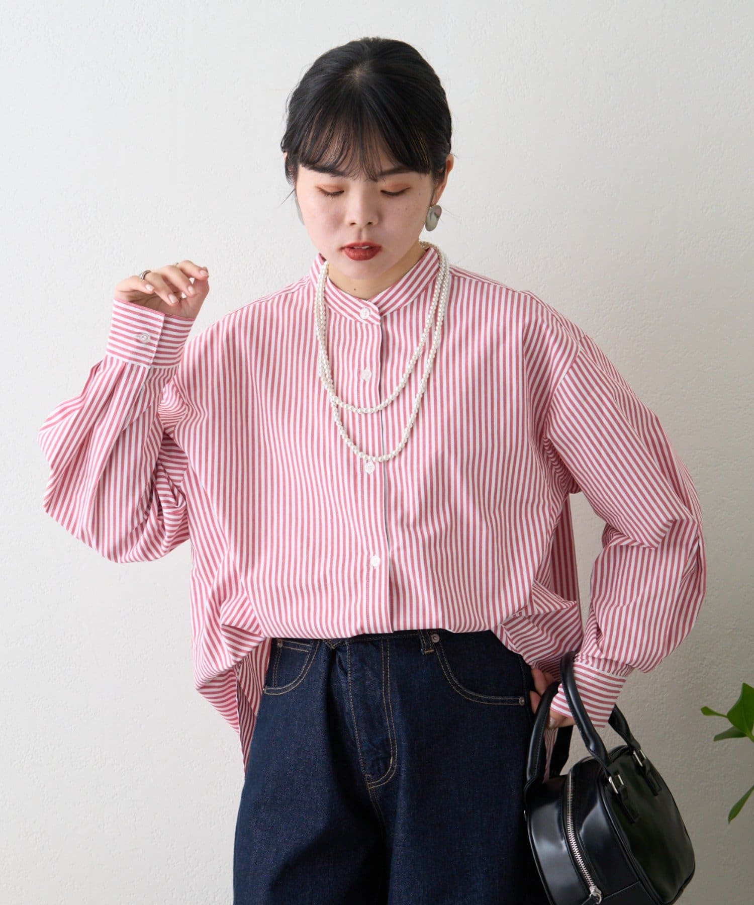 購入場所:パルクローゼット赤のストライプシャツが欲しくて、しかもスタンドカラーに惹かれてオンラインで購入。