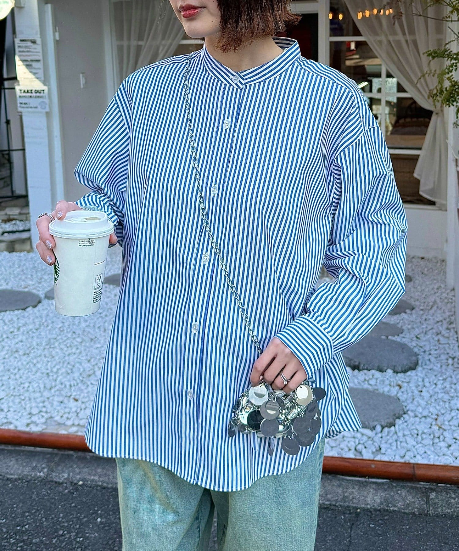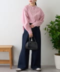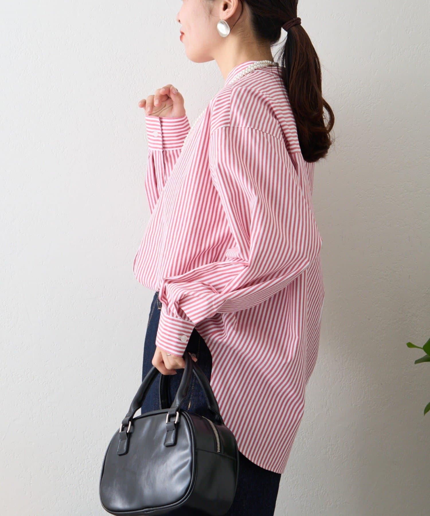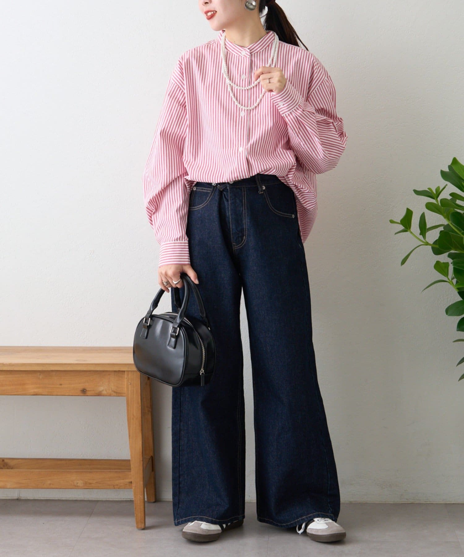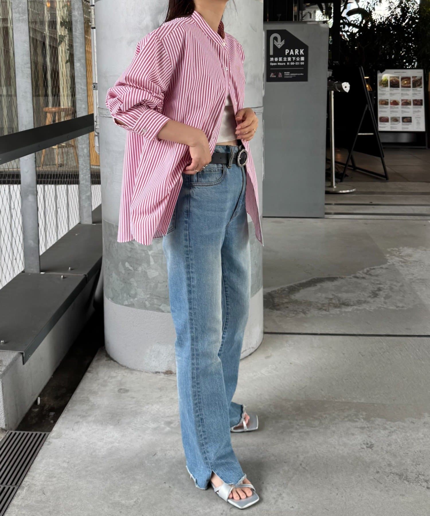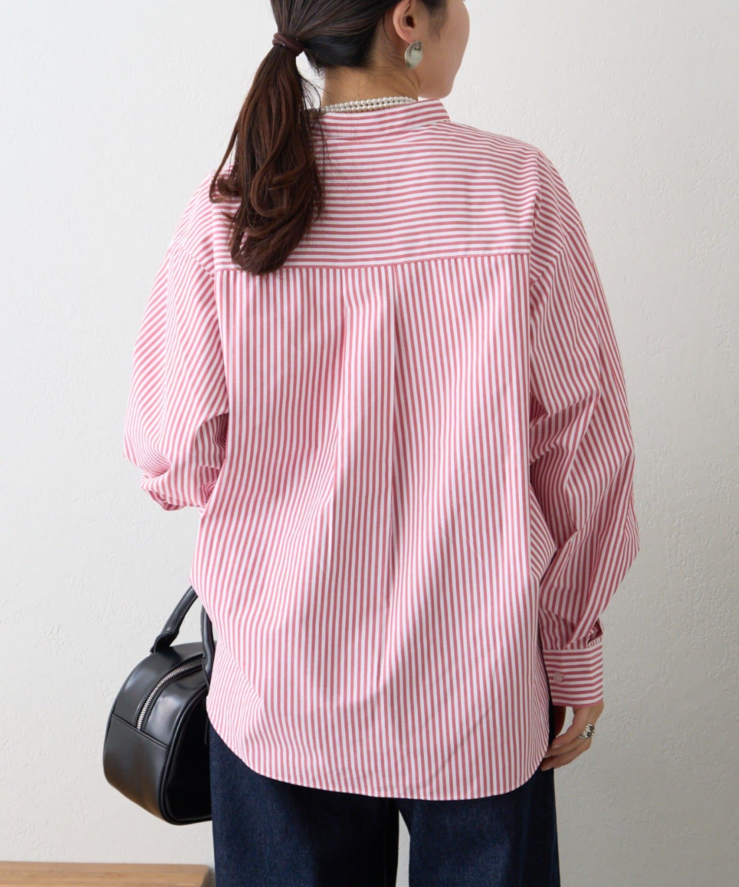 購入場所:パルクローゼット赤のストライプシャツが欲しくて、しかもスタンドカラーに惹かれてオンラインで購入。